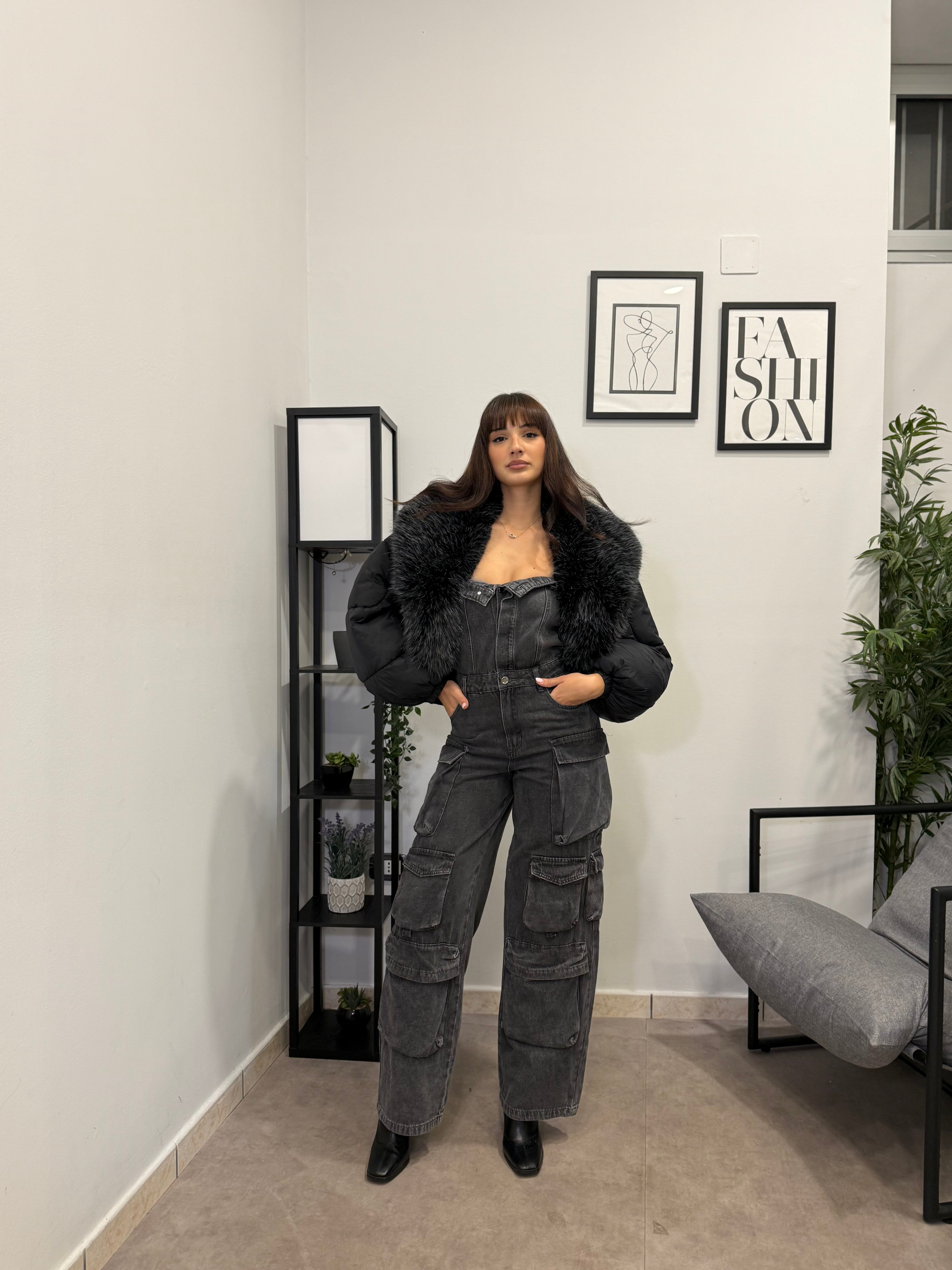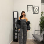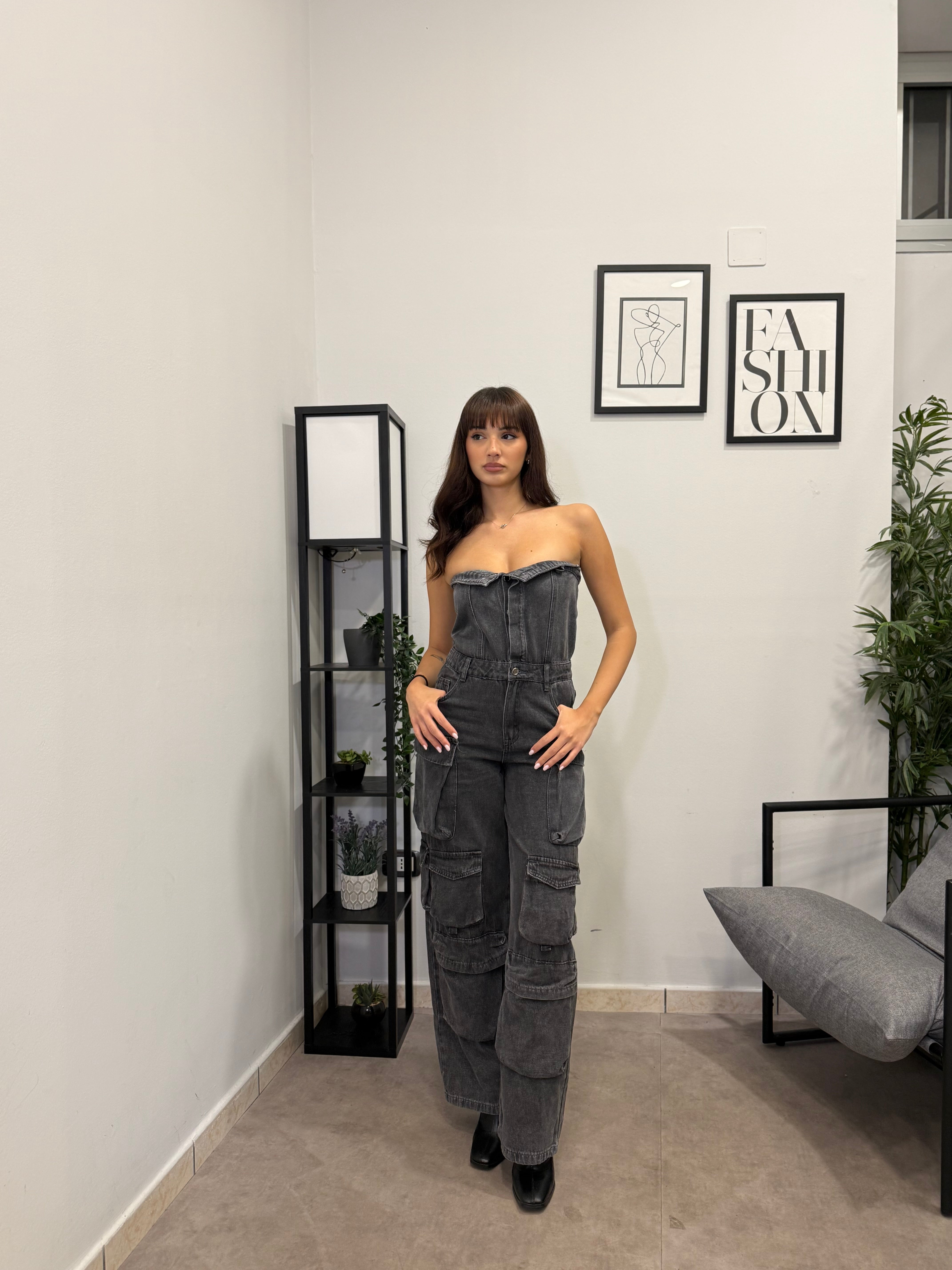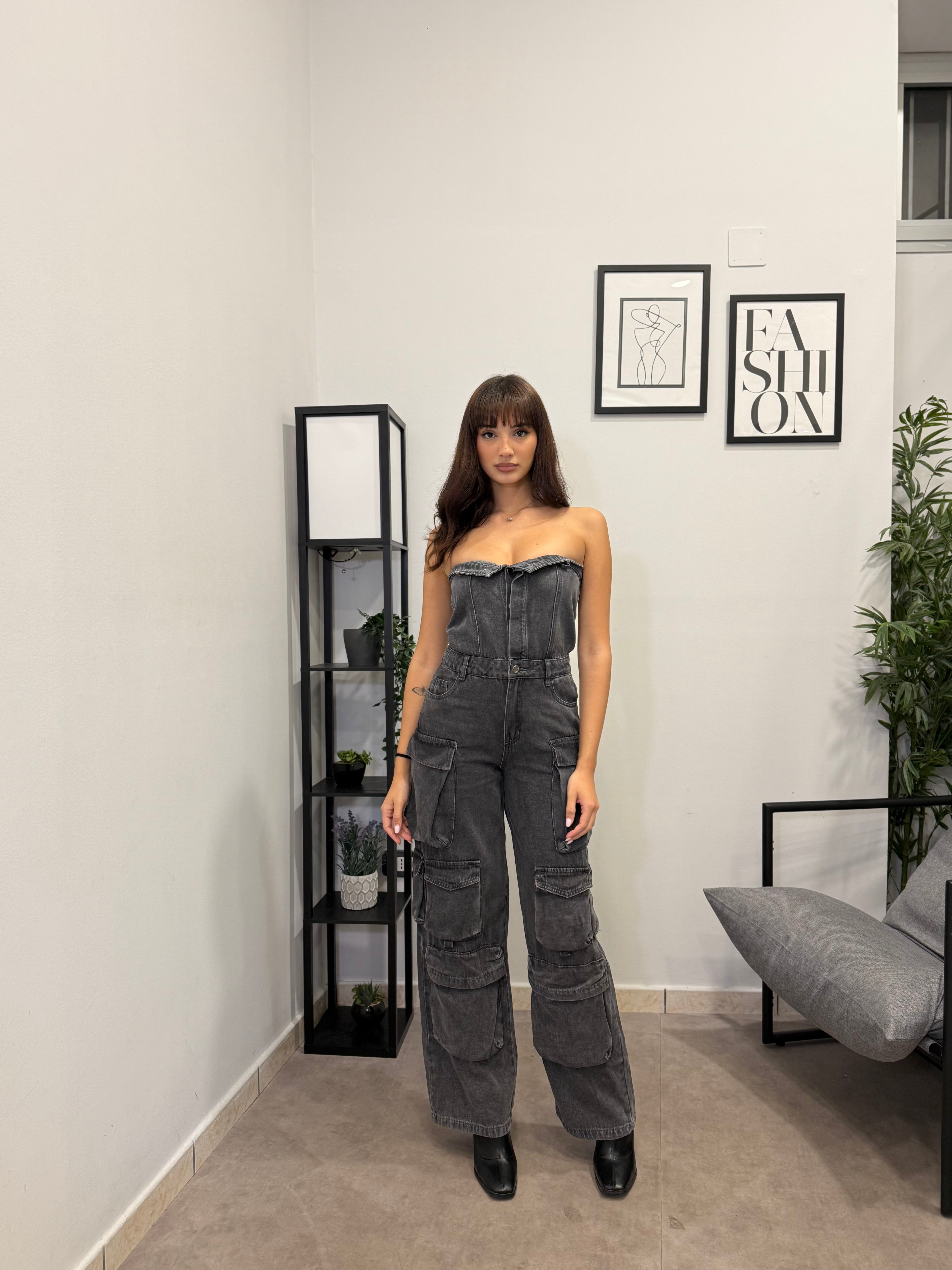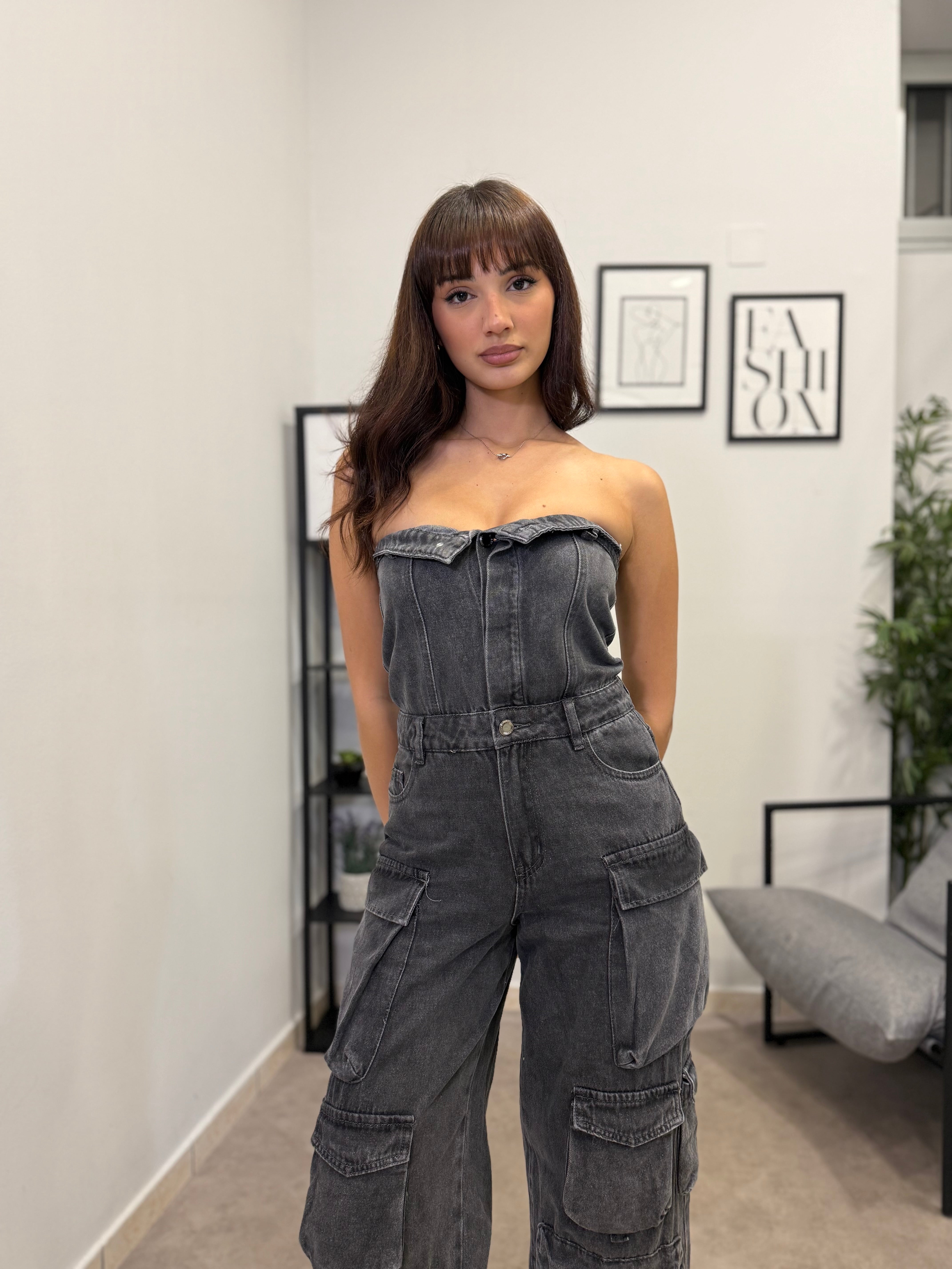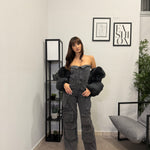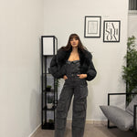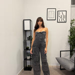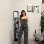 Tuta in jeans lavaggio grigio. Ha la molla sul retro ma il tessuto non è elastico. Marta indosa tg S