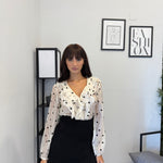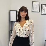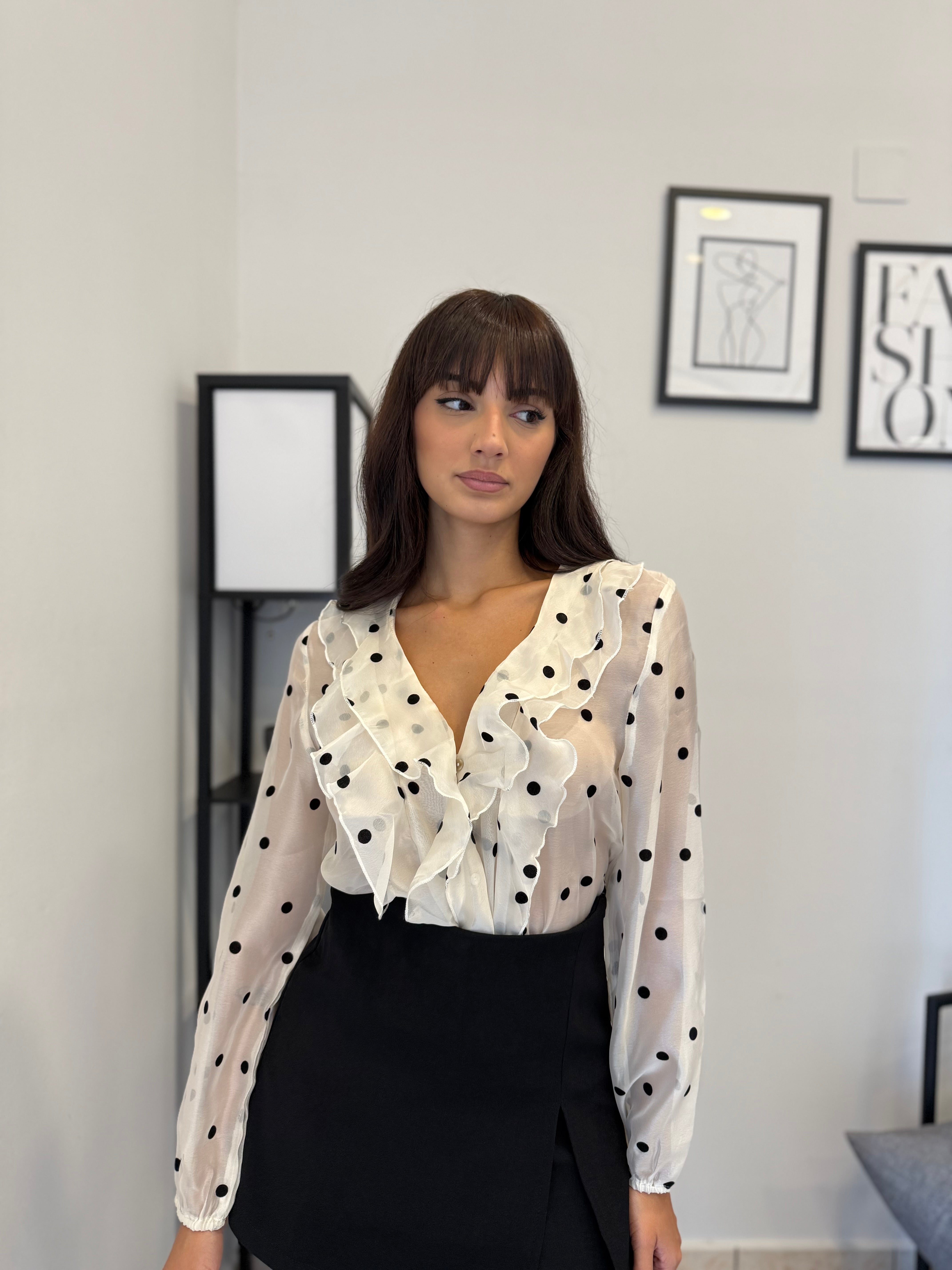 Camicia effetto velato con pois, ha la rouche frontale. Non è elasticizzata