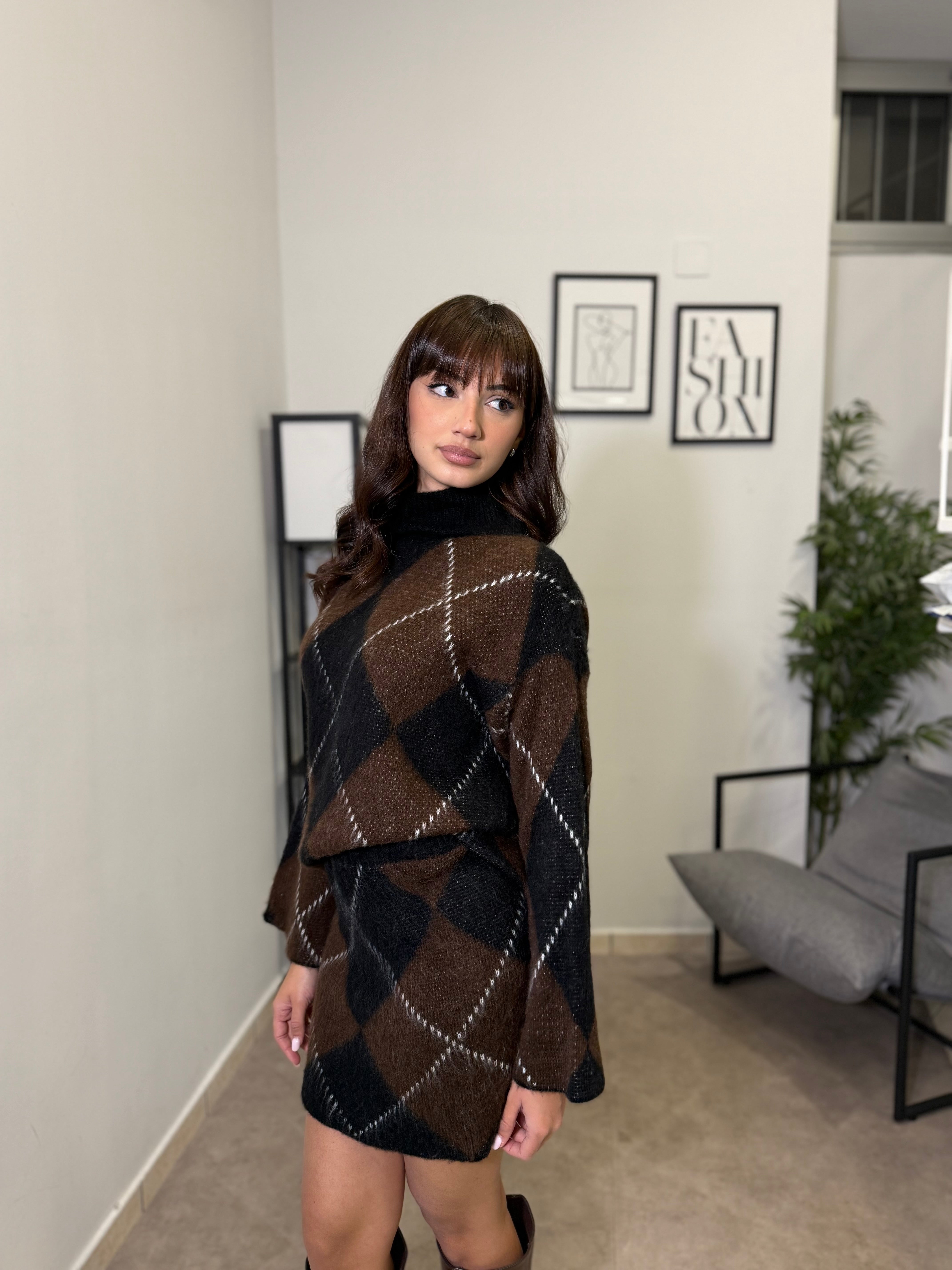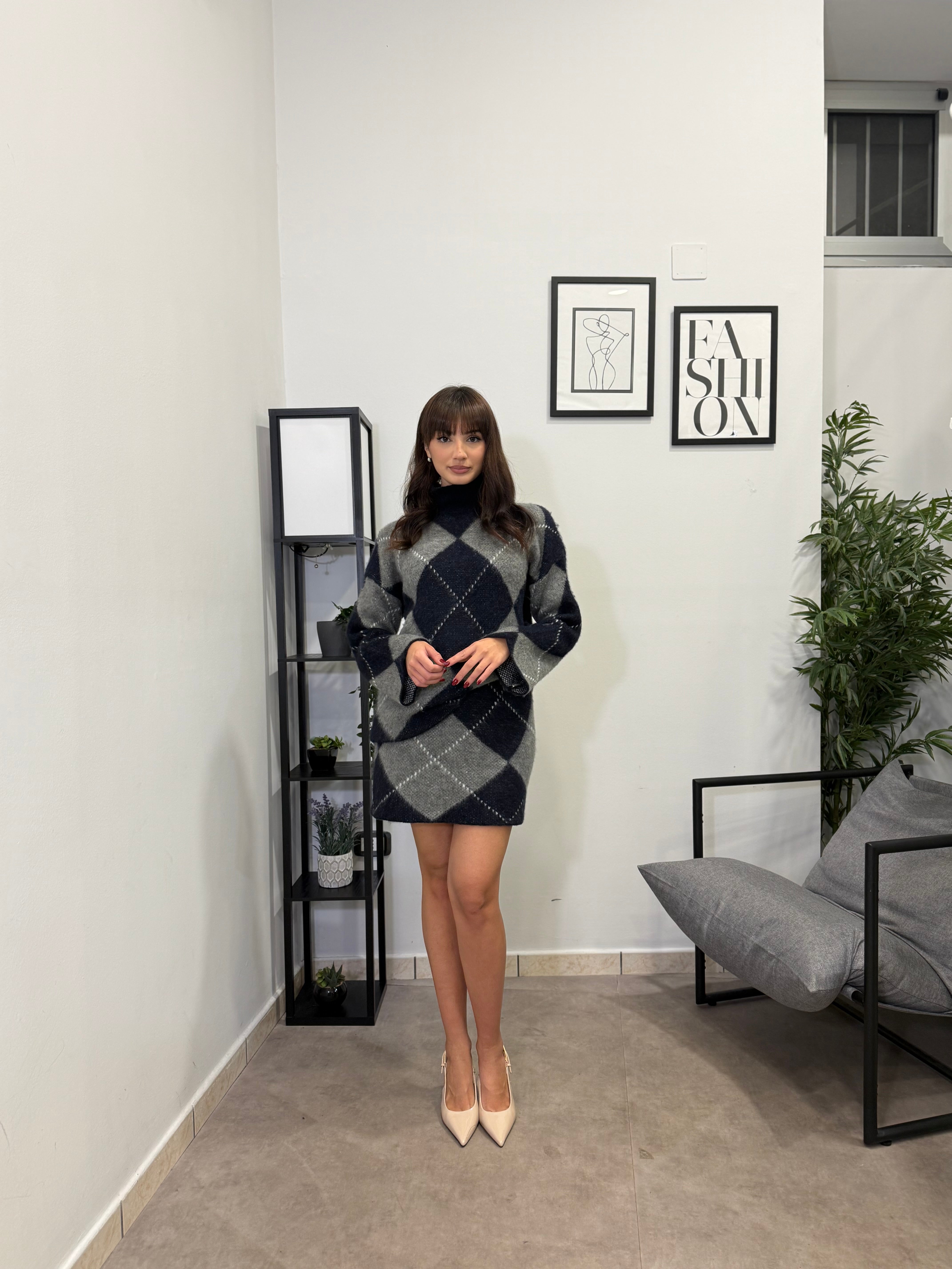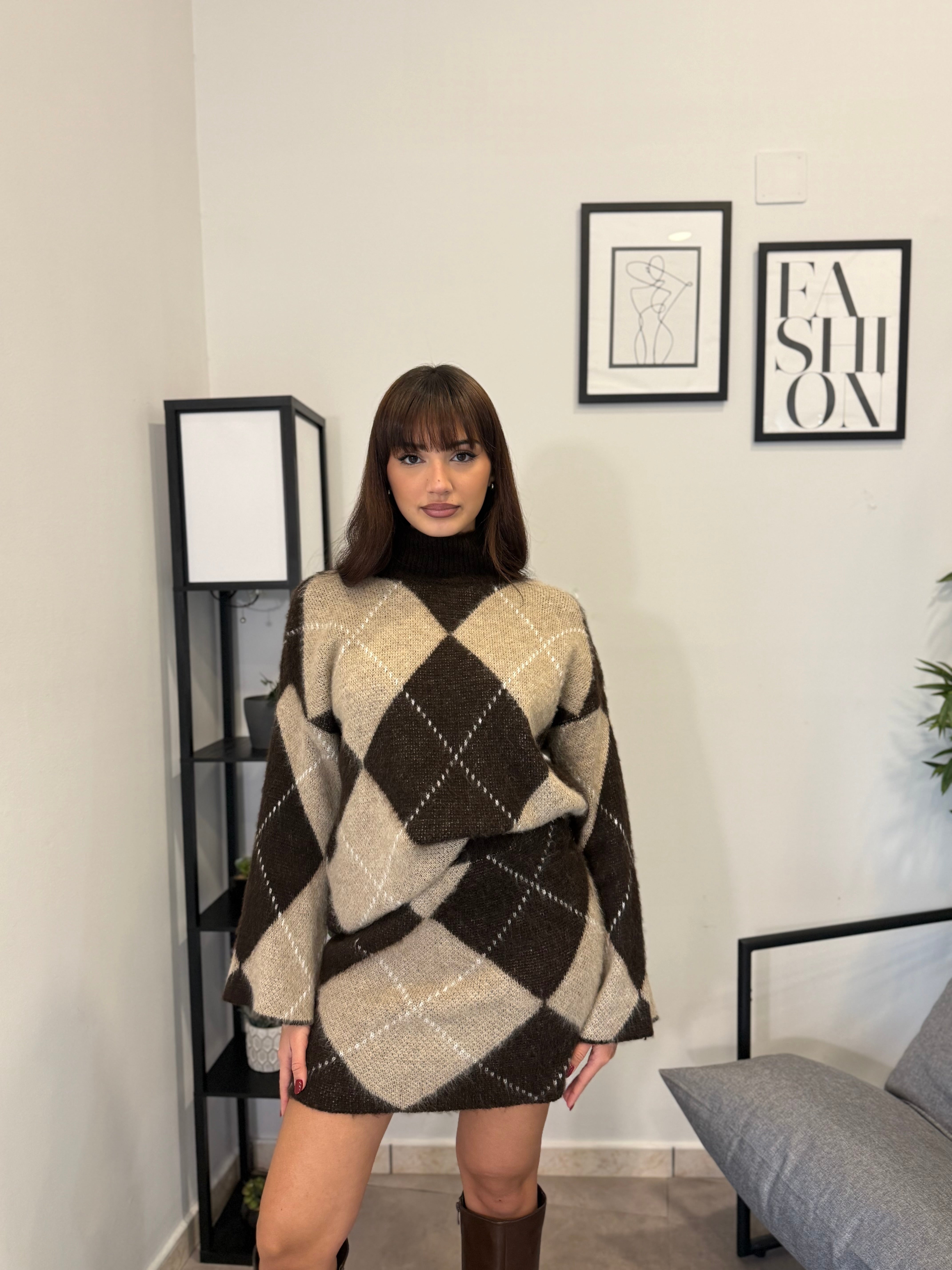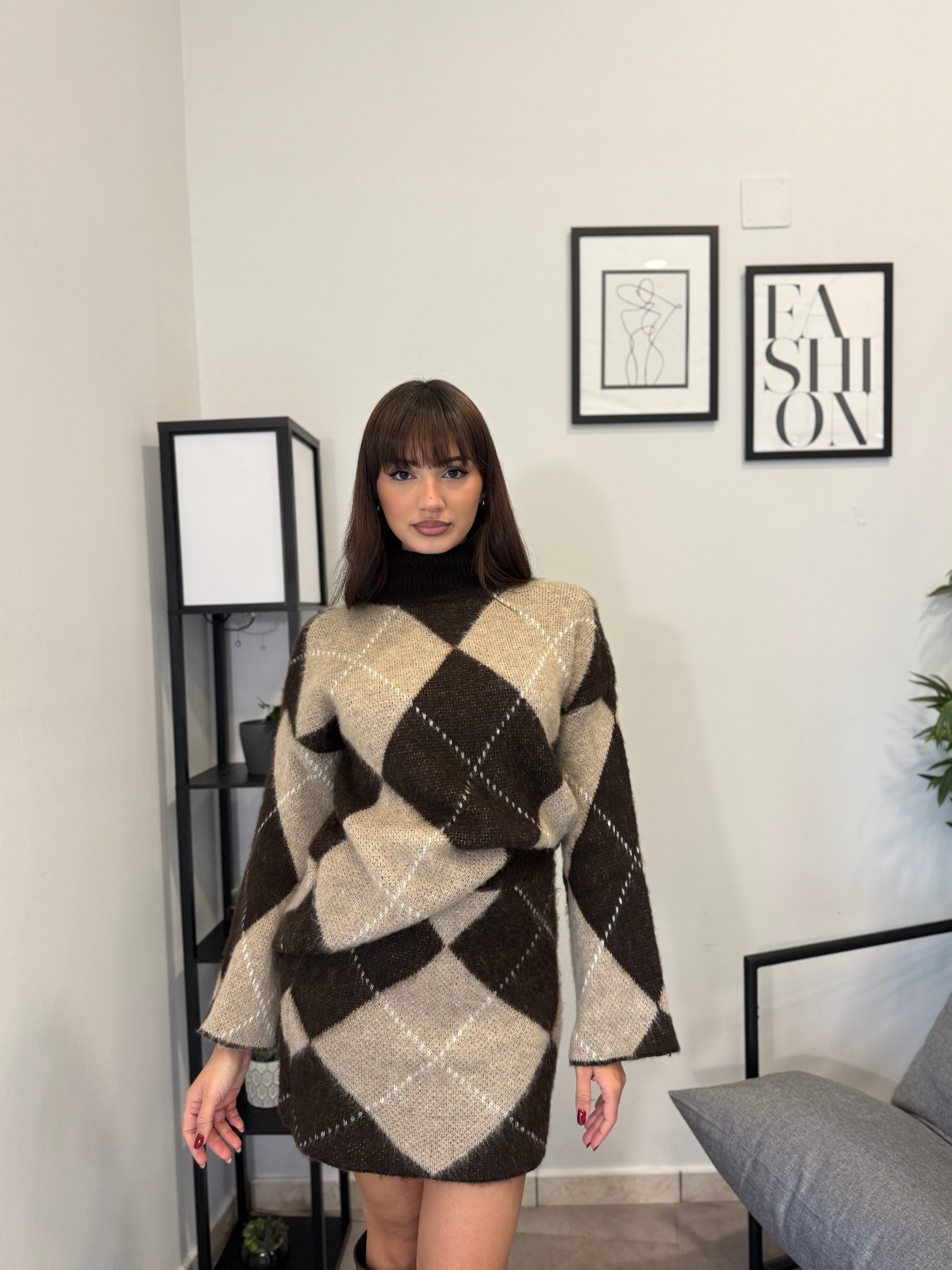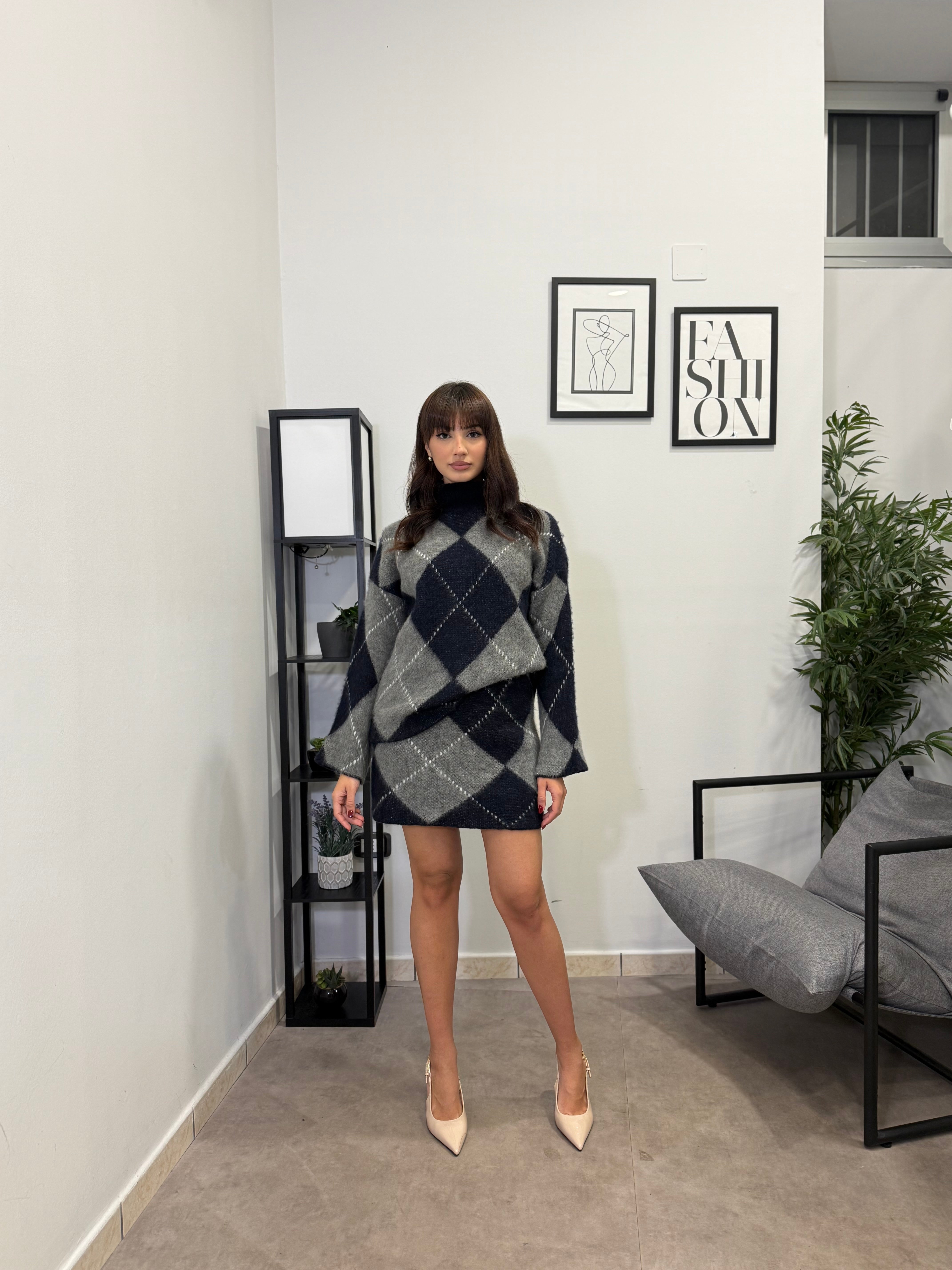 Completo con gonna e maglione a rombi. Tessuto elastico, veste bene dalla S alla L
