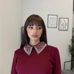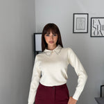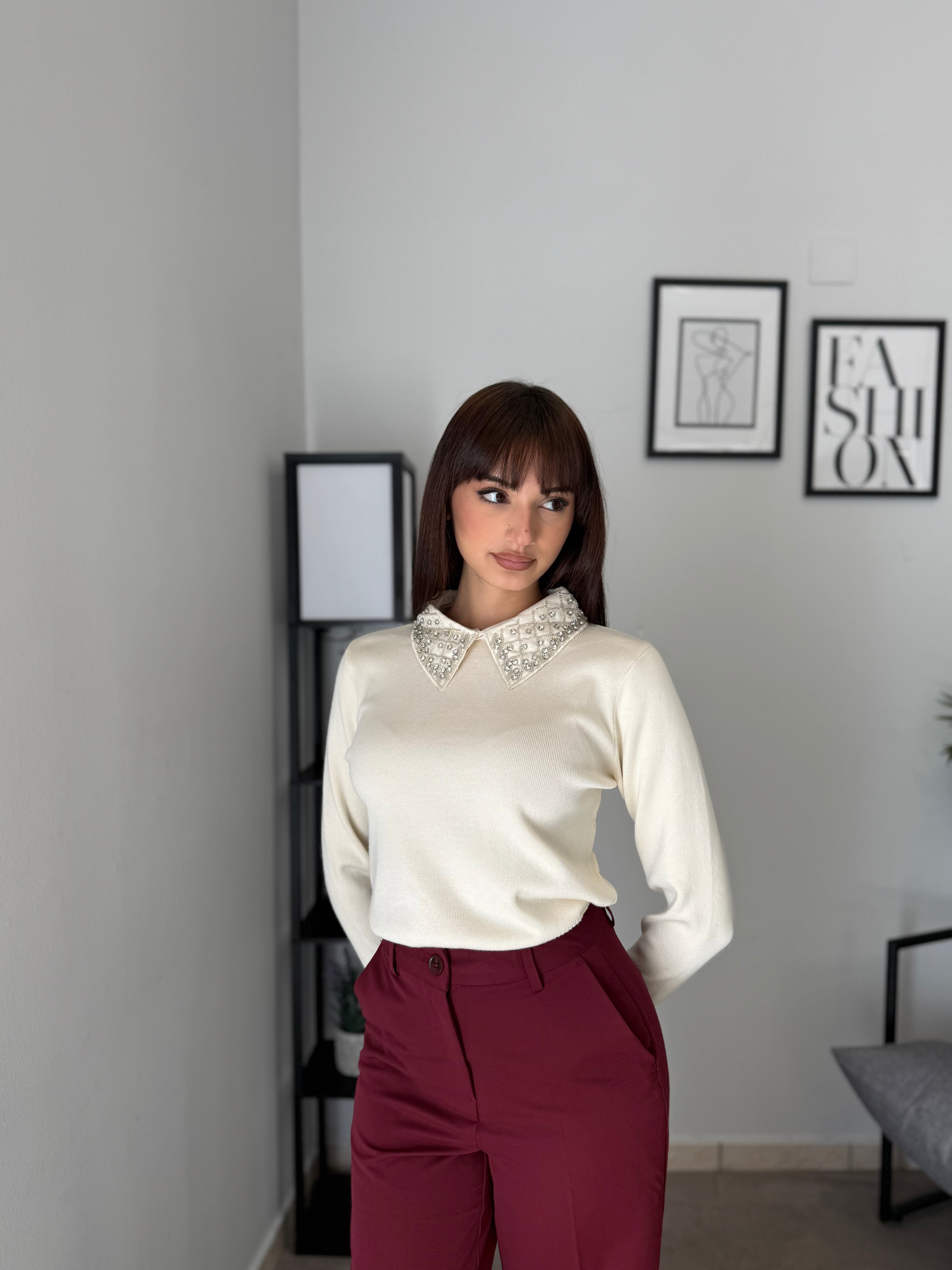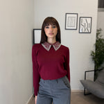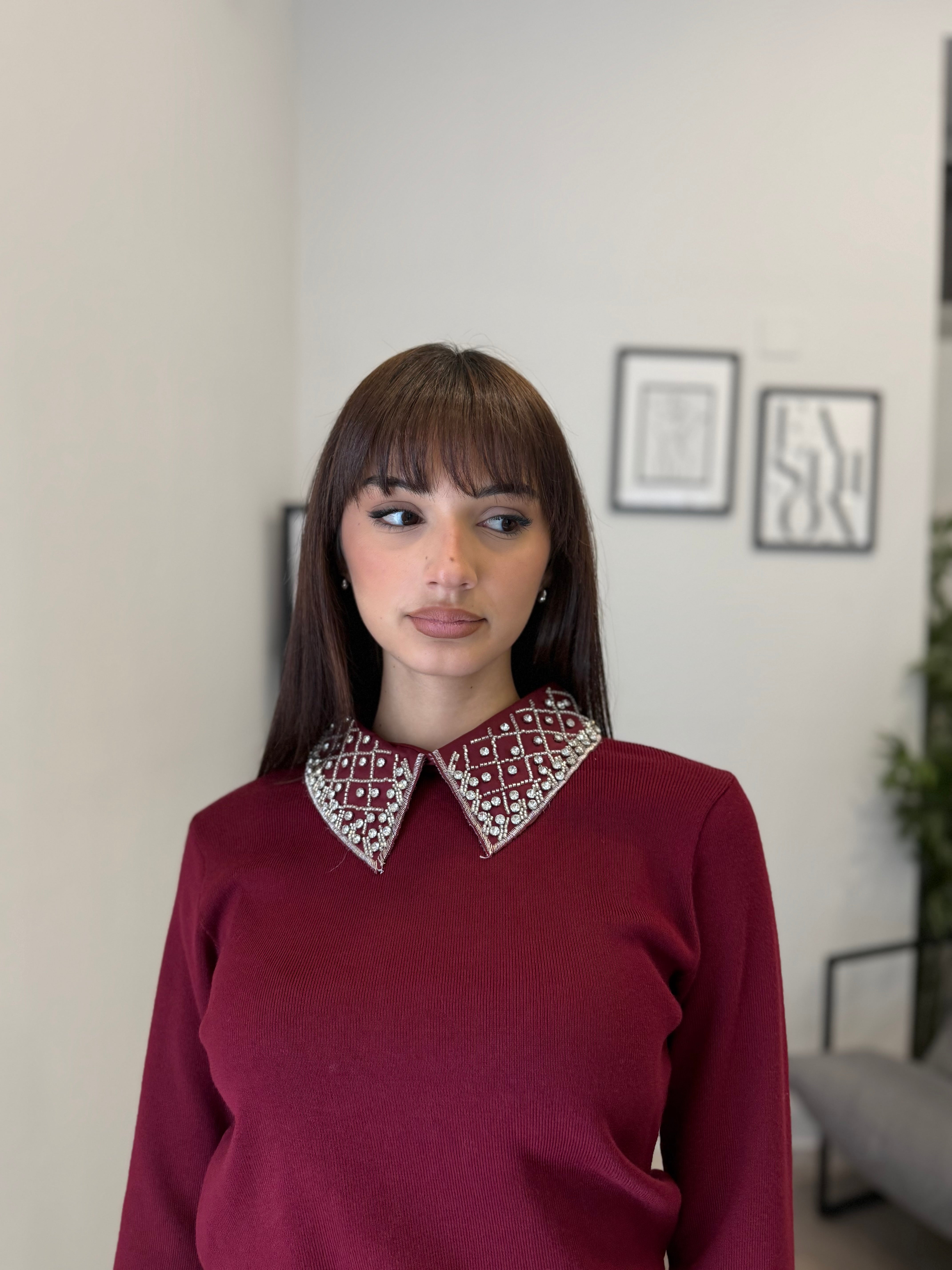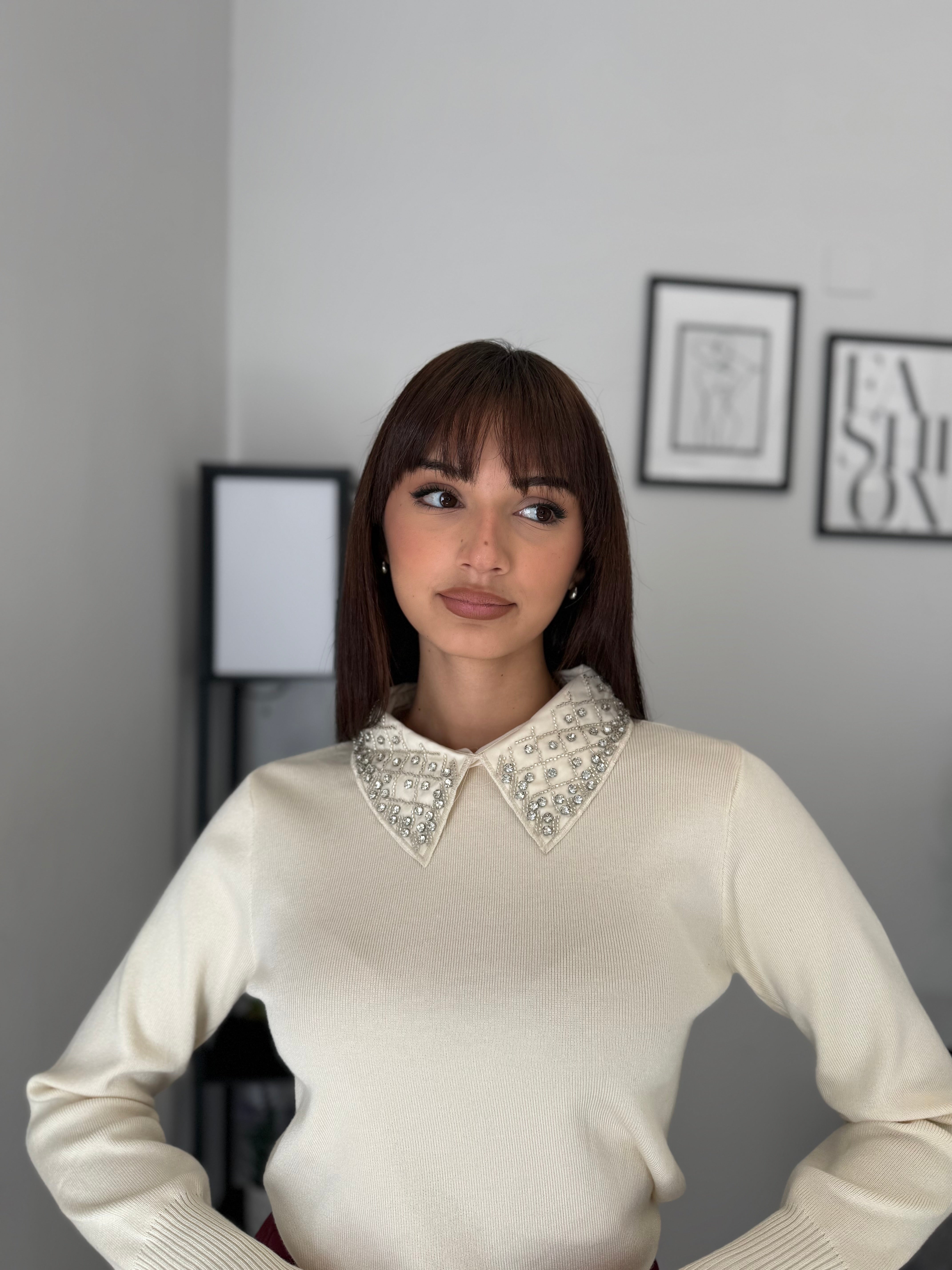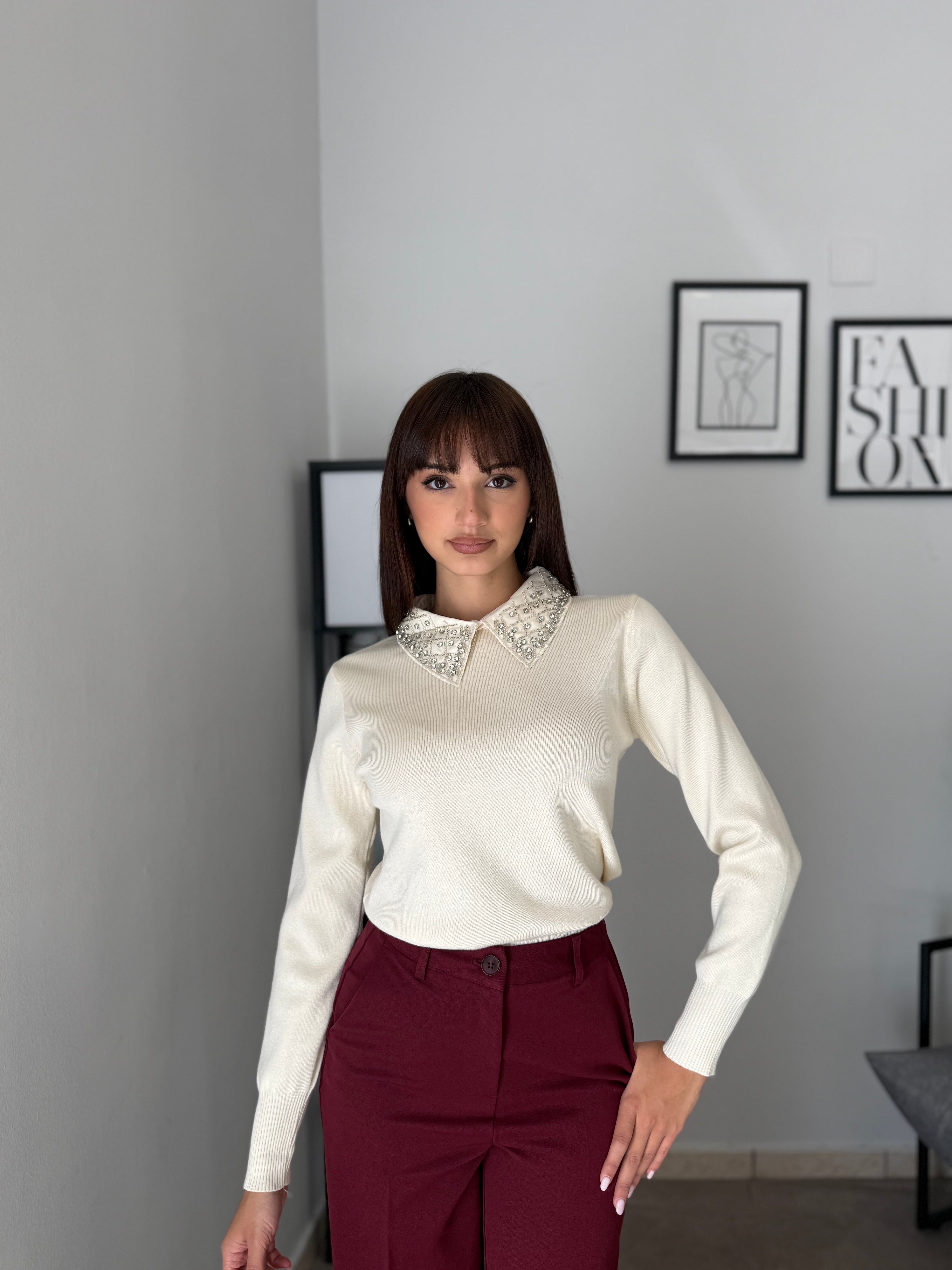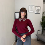 Pull in misto viscosa con collo in raso ed applicazioni strass. Tessuto elastico, veste bene dalla S alla L