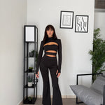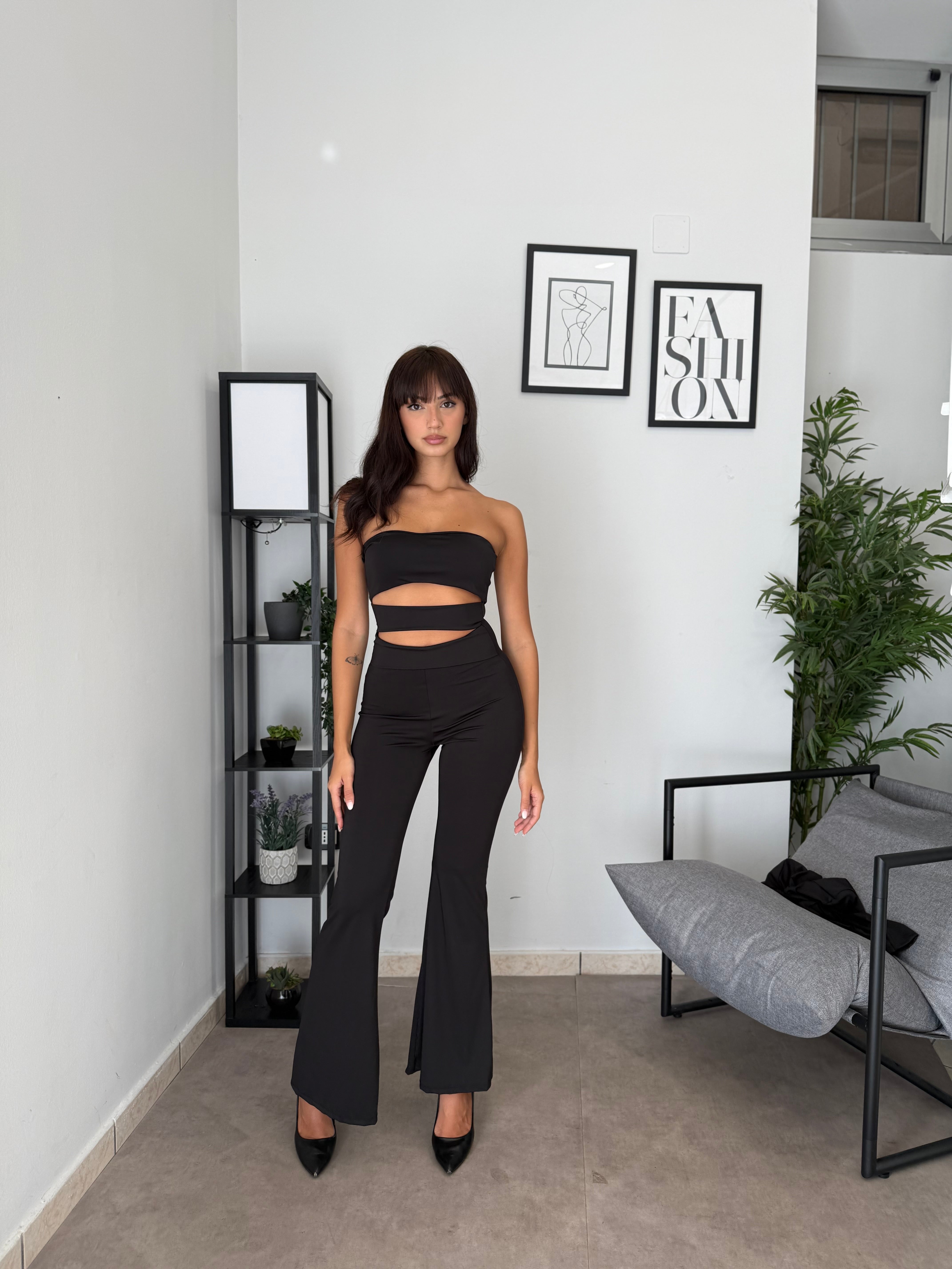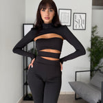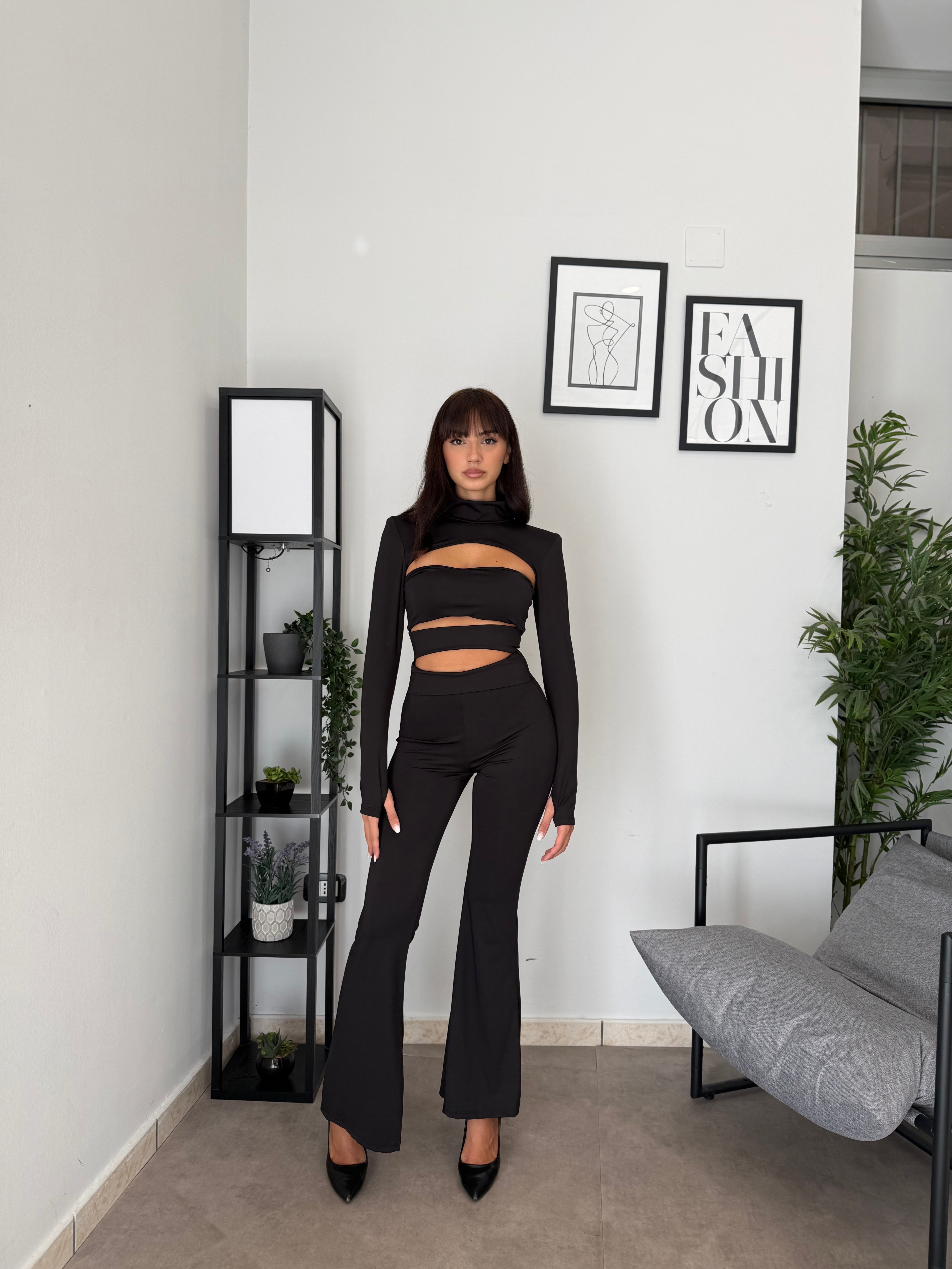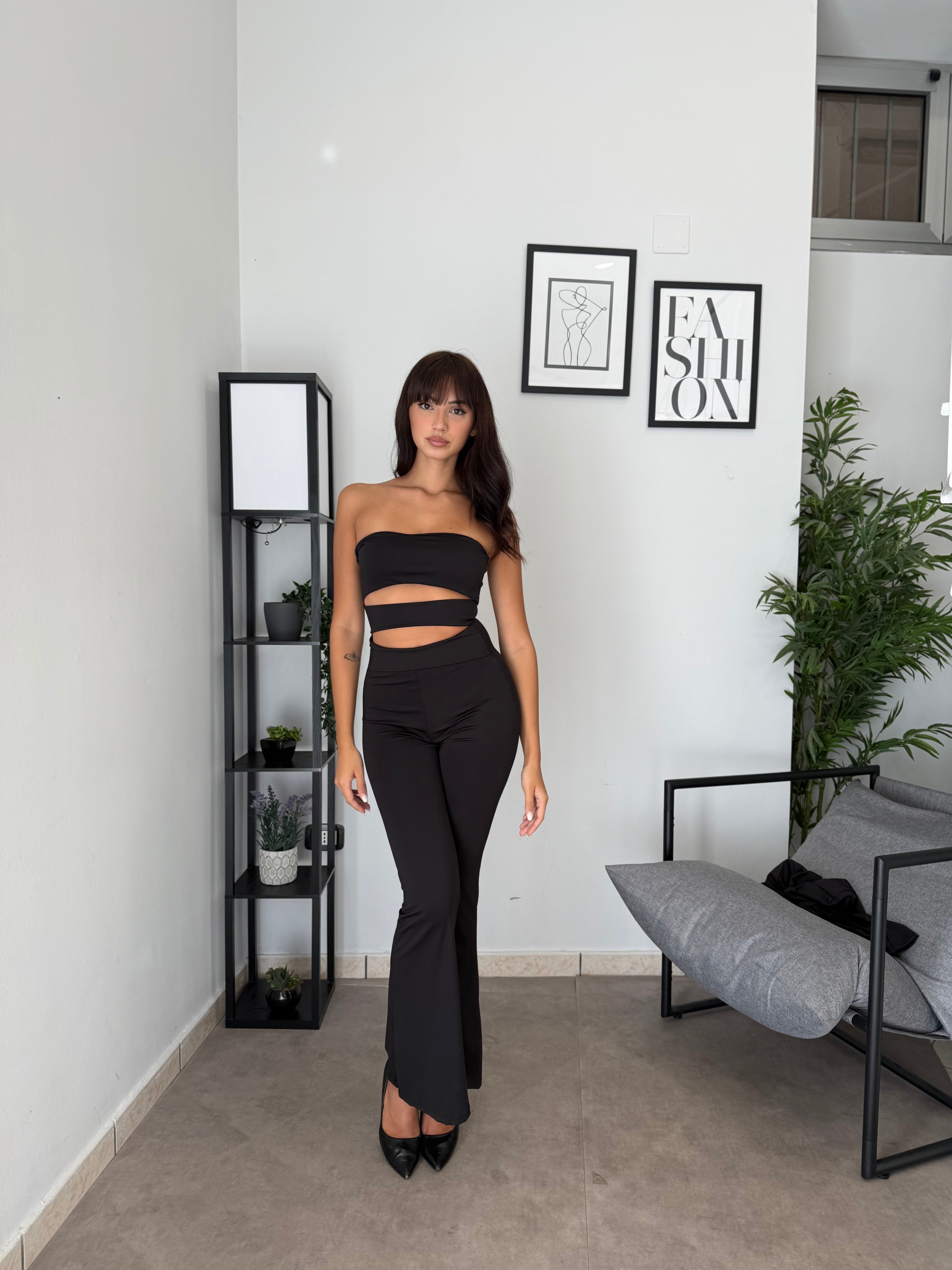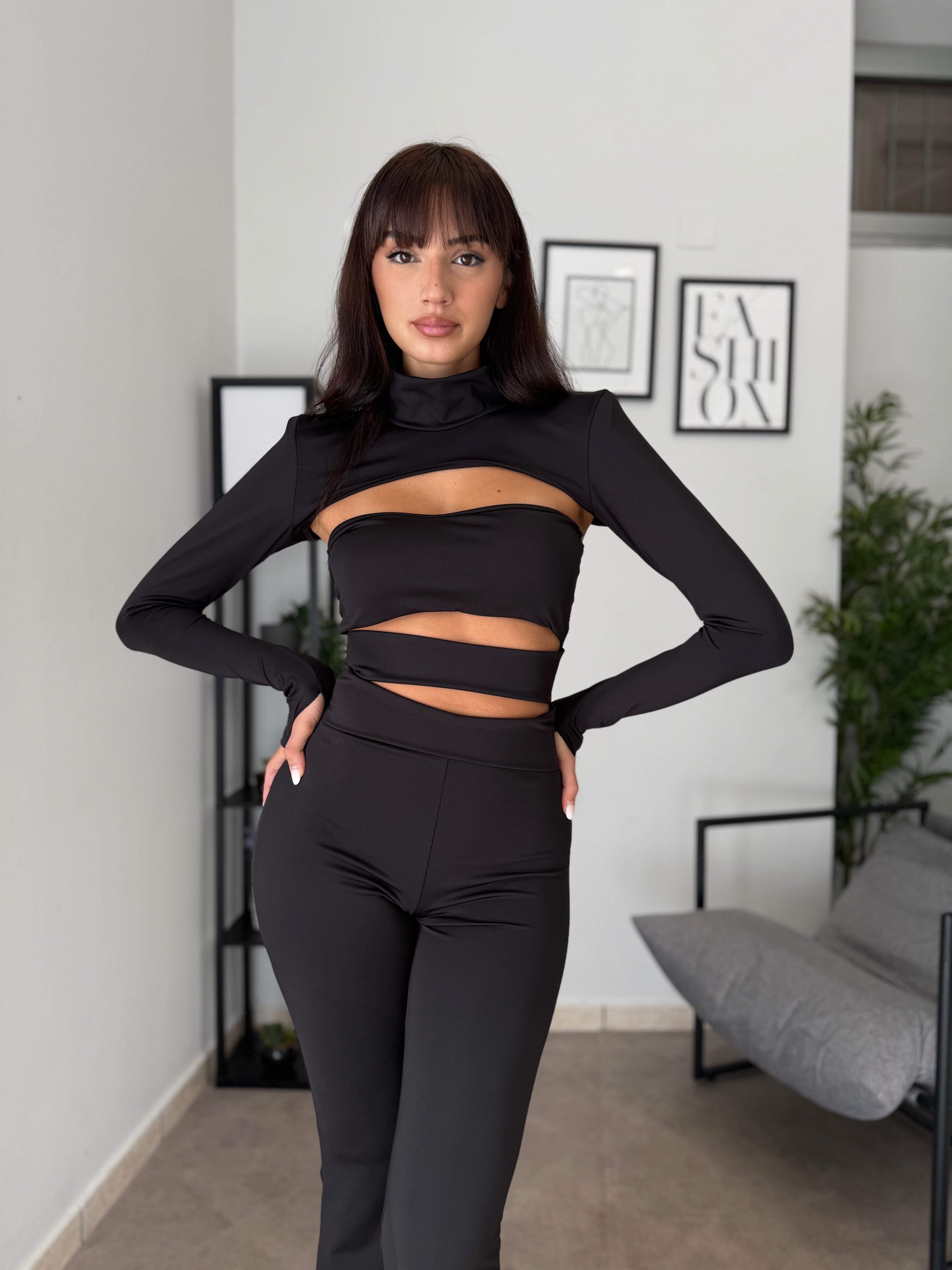 Tuta in licra con aperture frontali e coprispalle abbinato. Tessuto elastico, il pantalone scende a zampetta! Veste bene dalla XS alla M