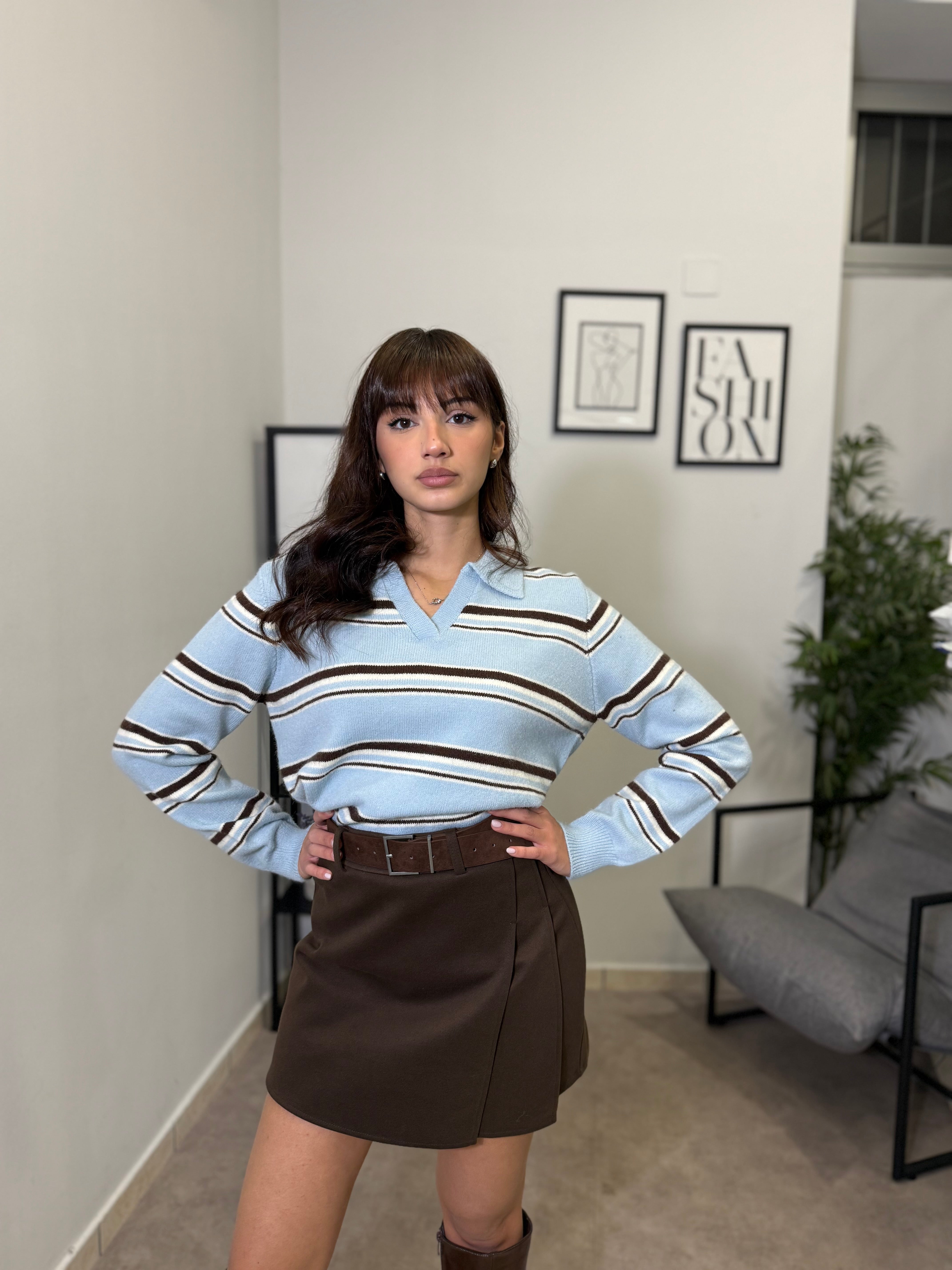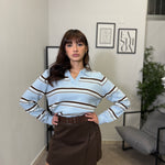 Polo a righe con fondo azzurro, vestibilità comoda. Veste bene dalla S alla L