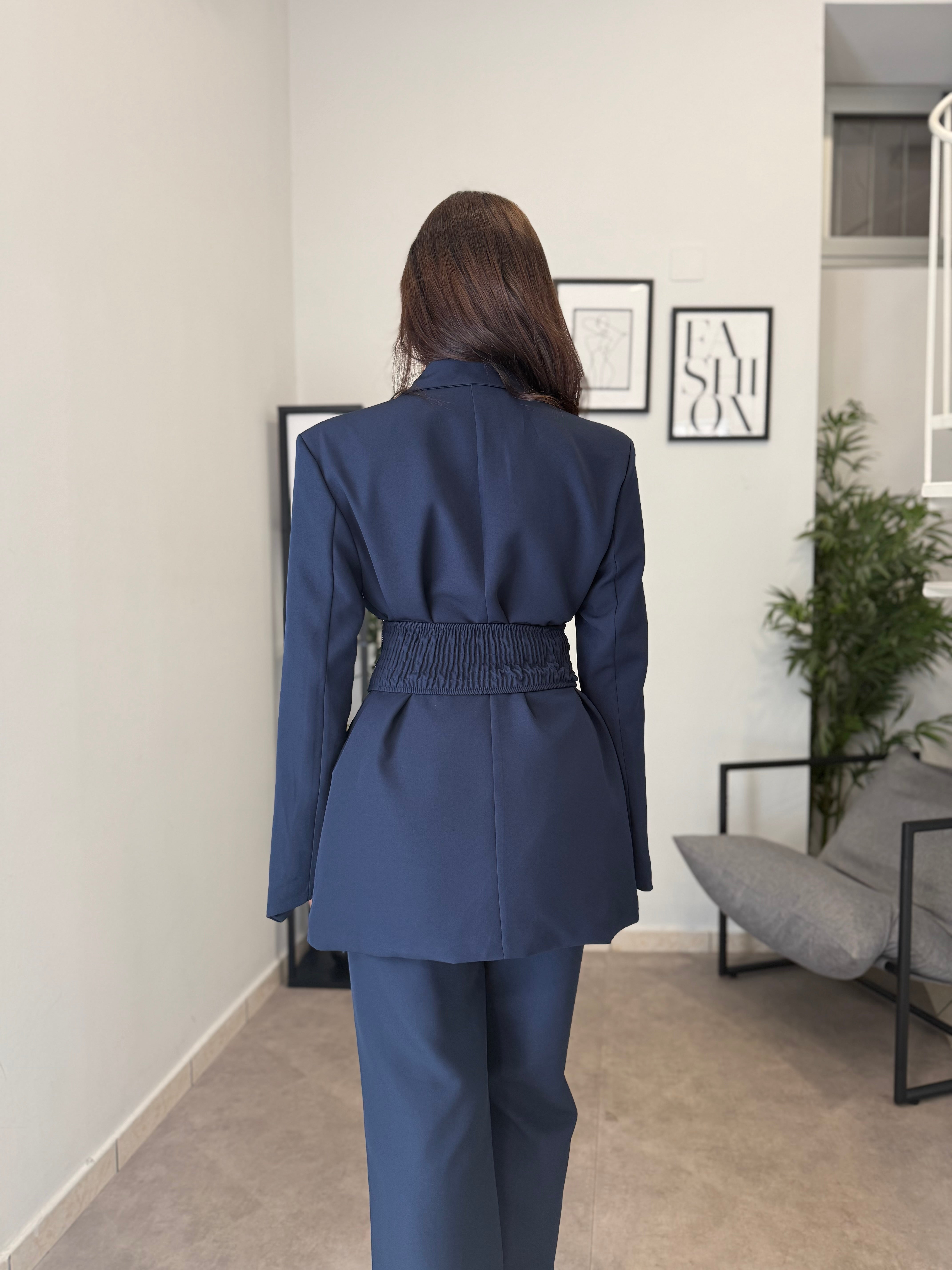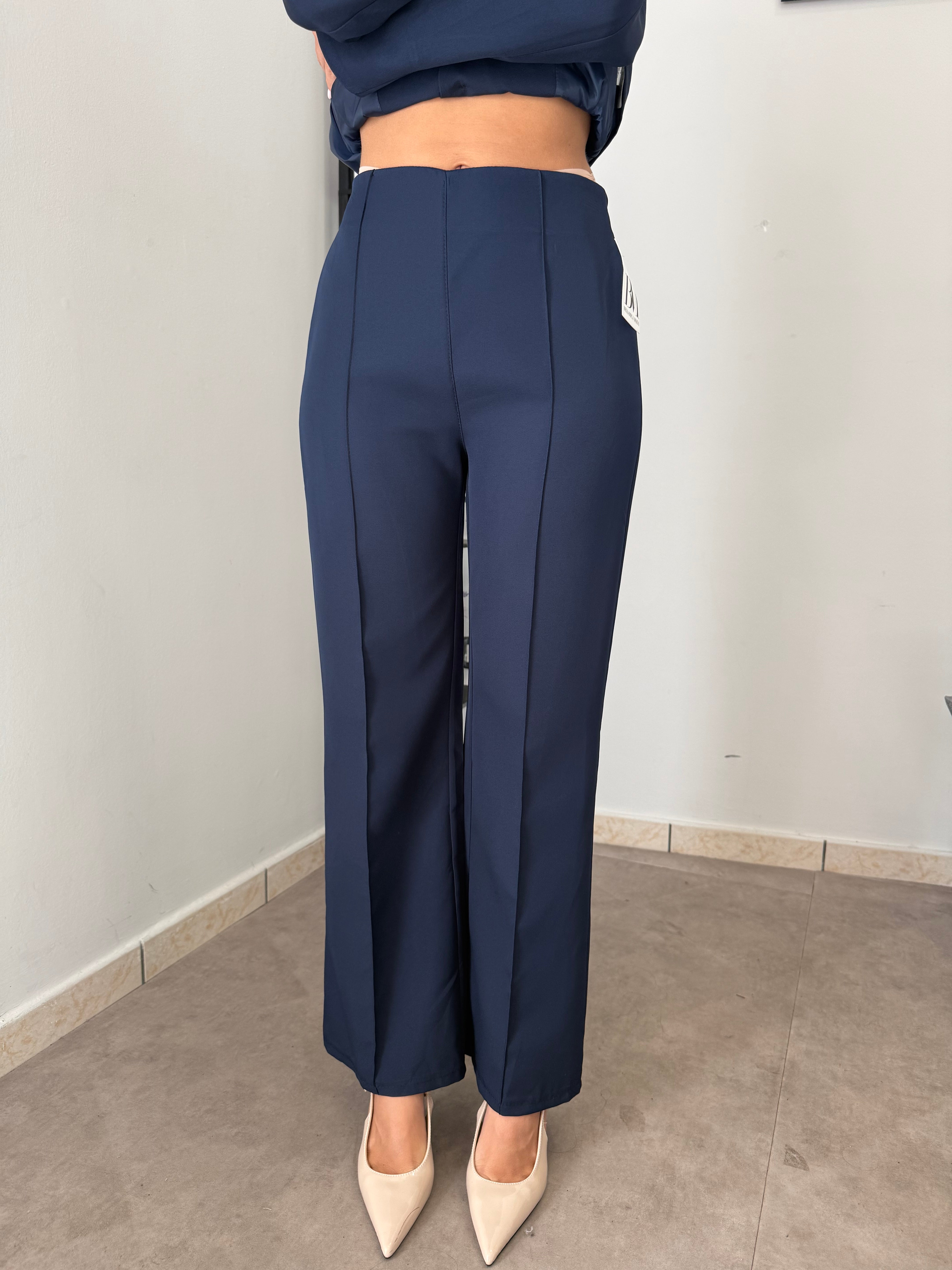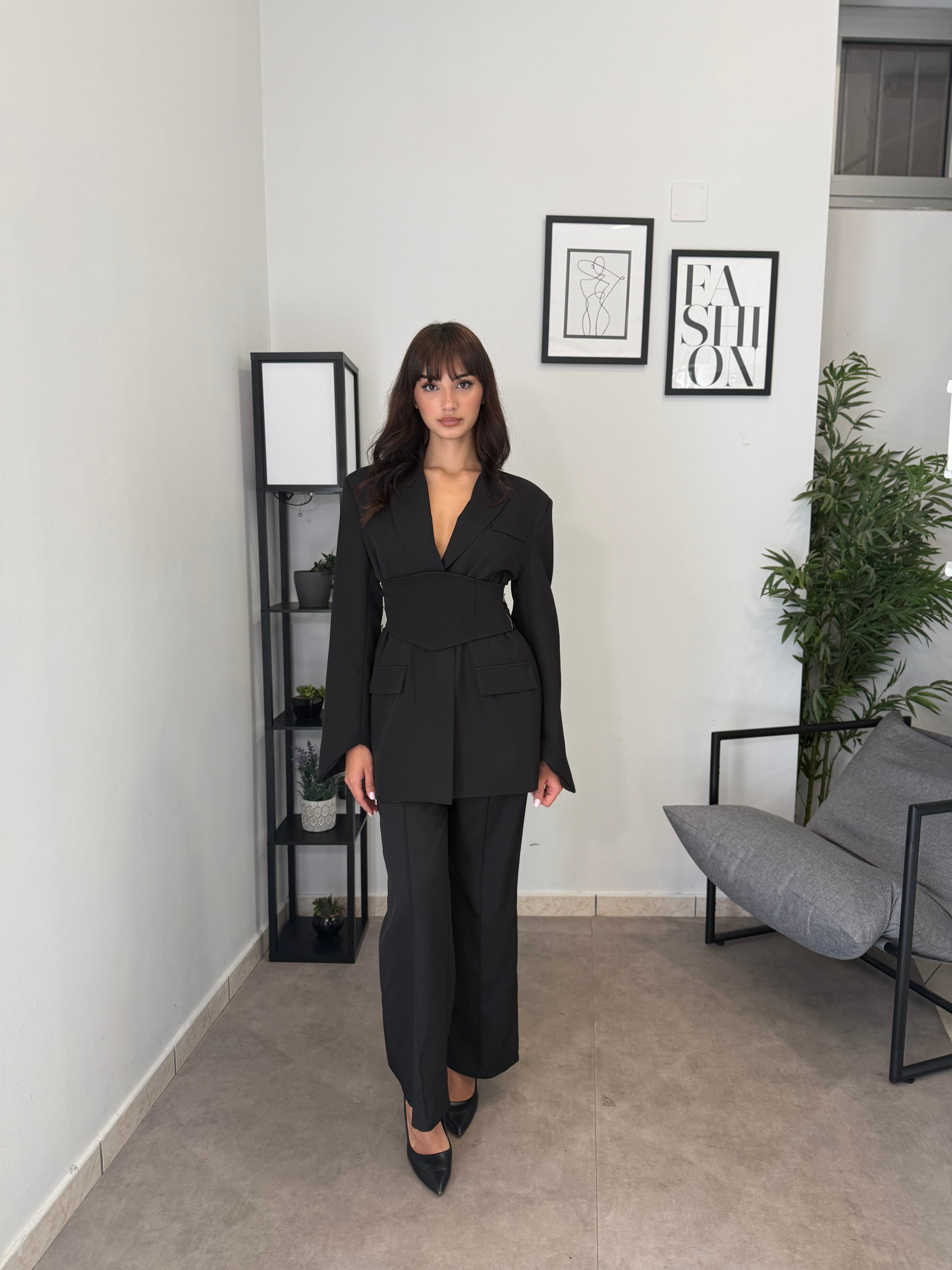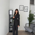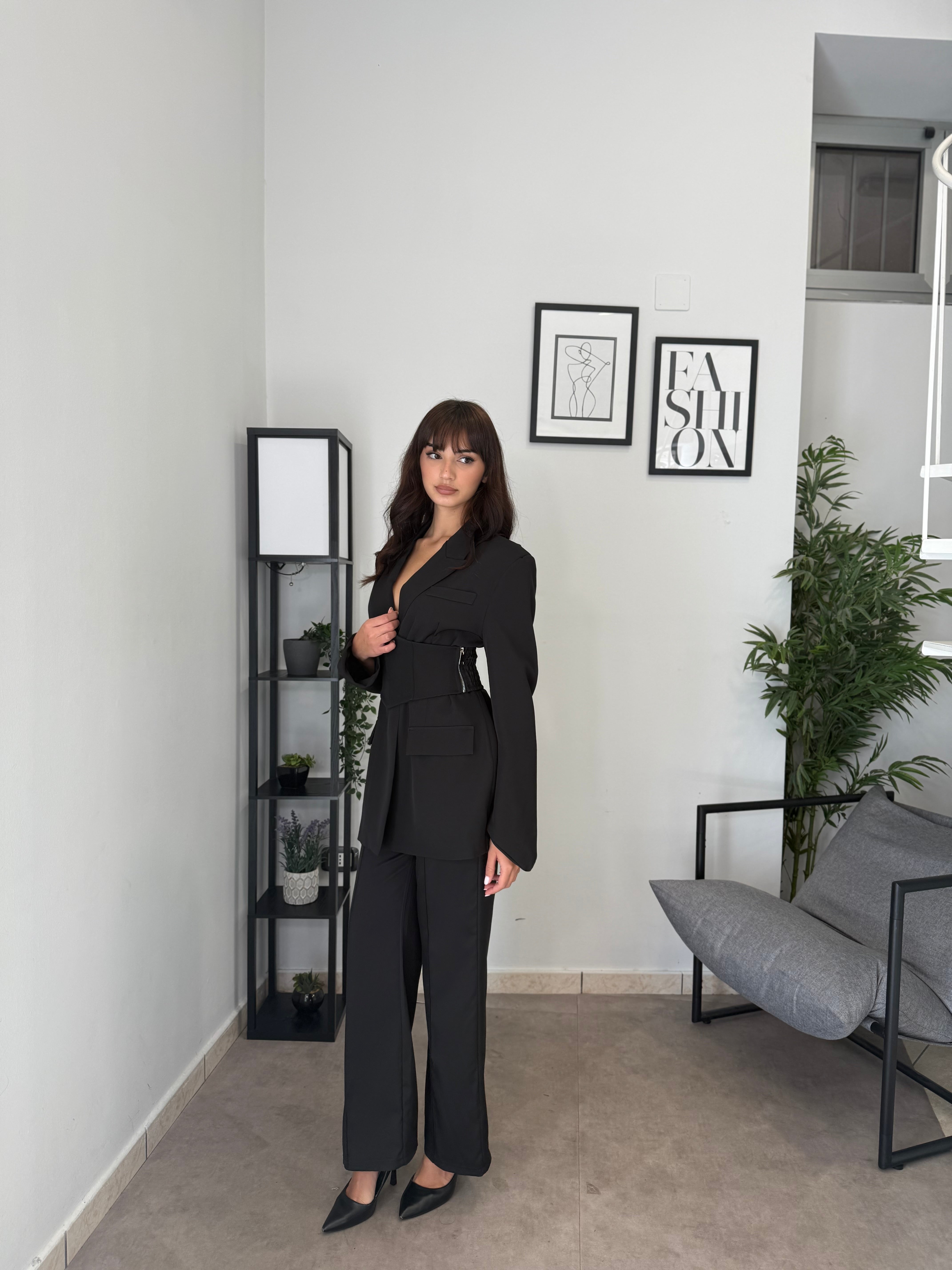 Tailleur con giacca lunga monobottone e pantalone vita alta a zampetta. La fascia va in vita ed il pantalone ha mezza molla sul retro. Veste bene dalla S alla M/L