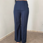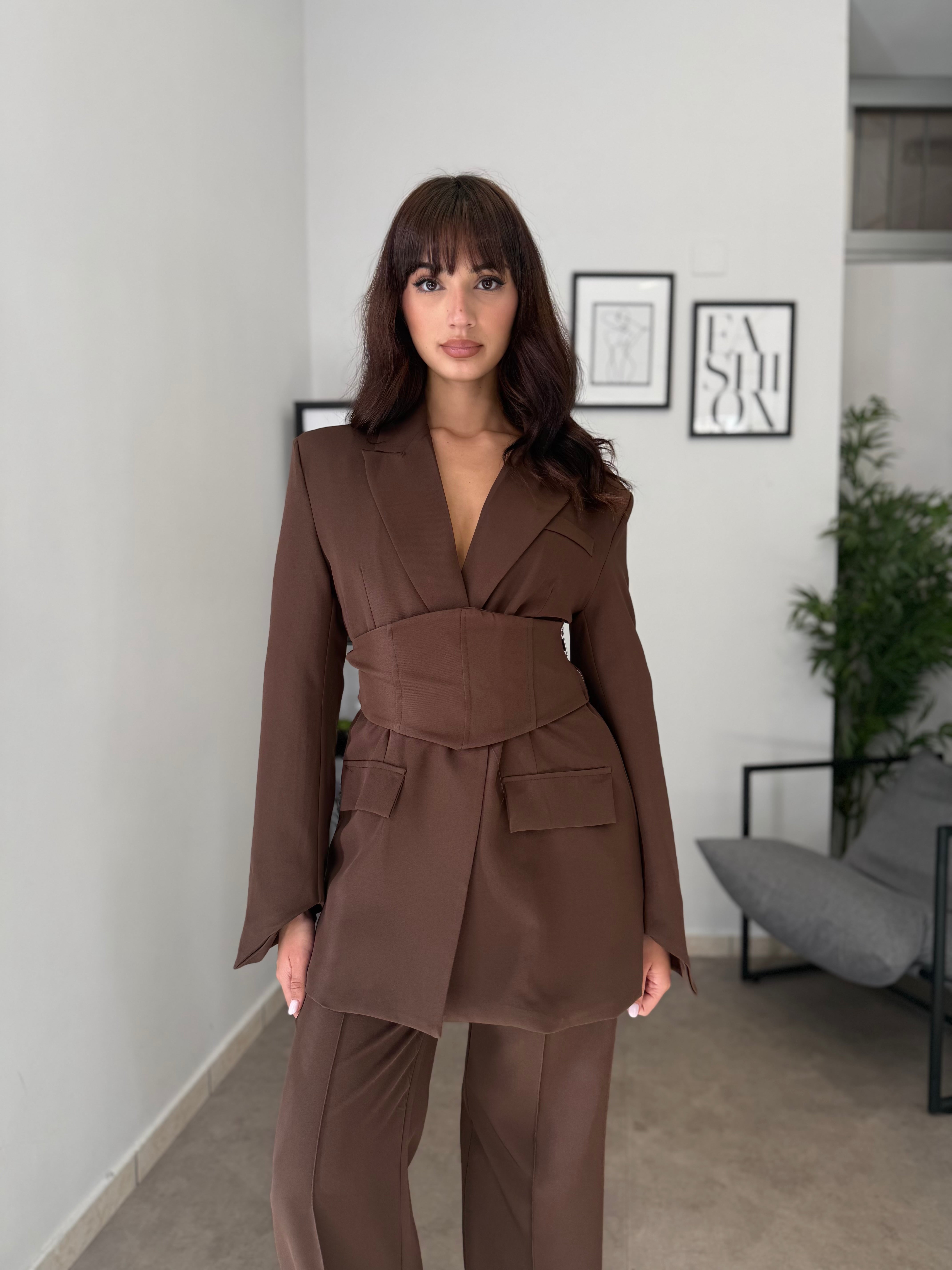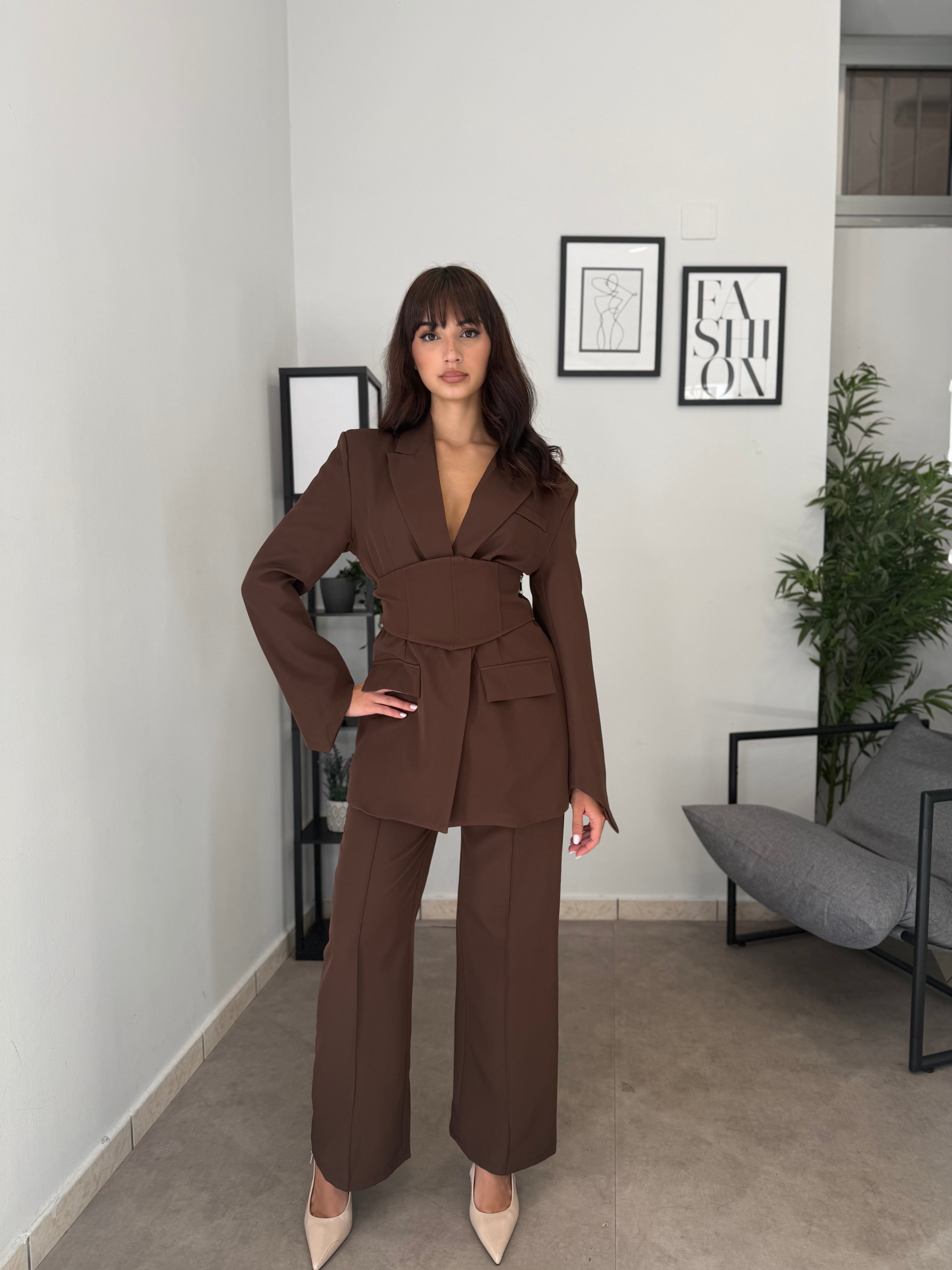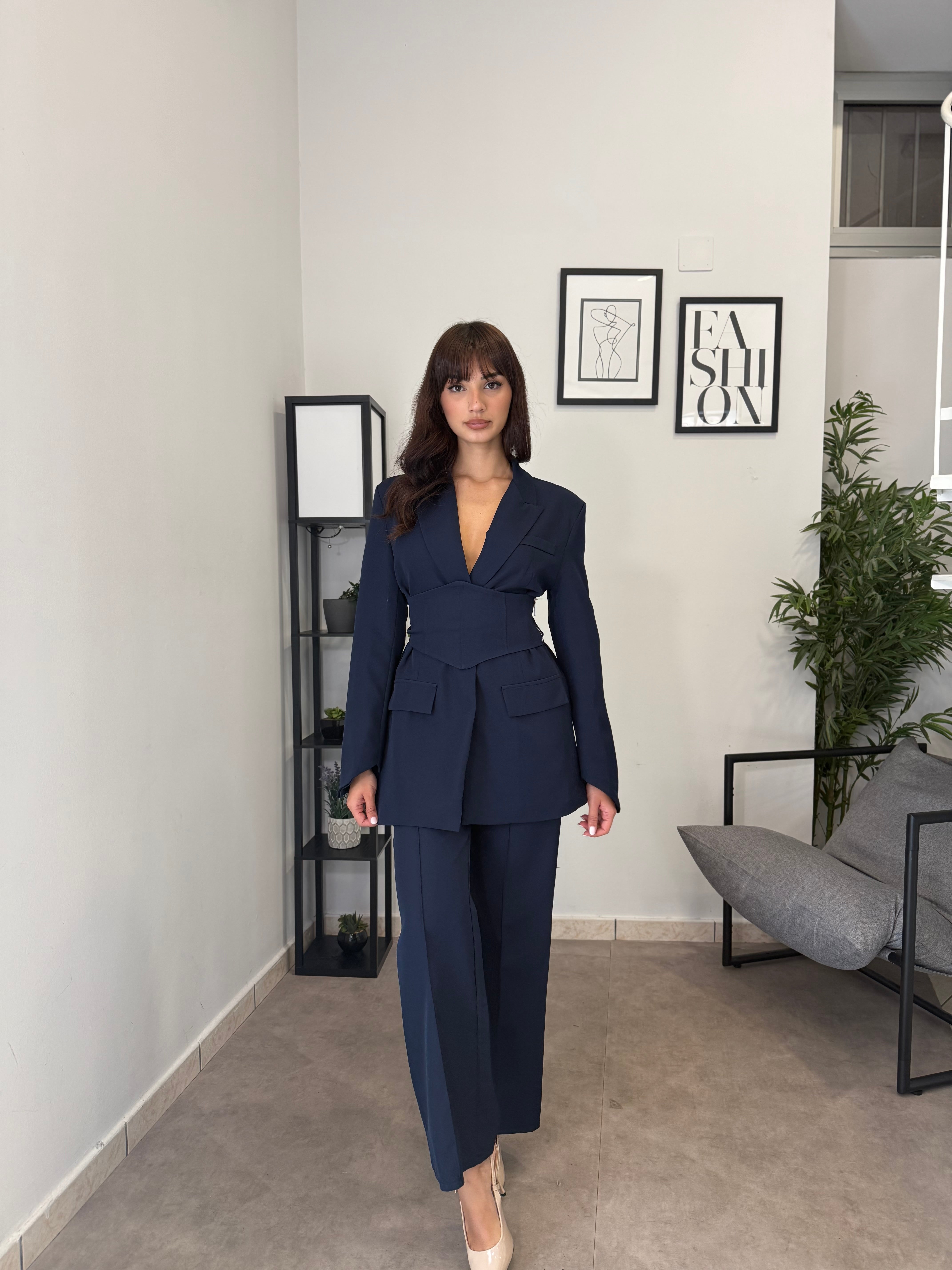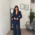 Tailleur con giacca lunga monobottone e pantalone vita alta a zampetta. La fascia va in vita ed il pantalone ha mezza molla sul retro. Veste bene dalla S alla M/L