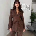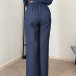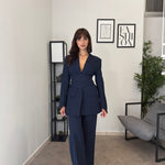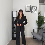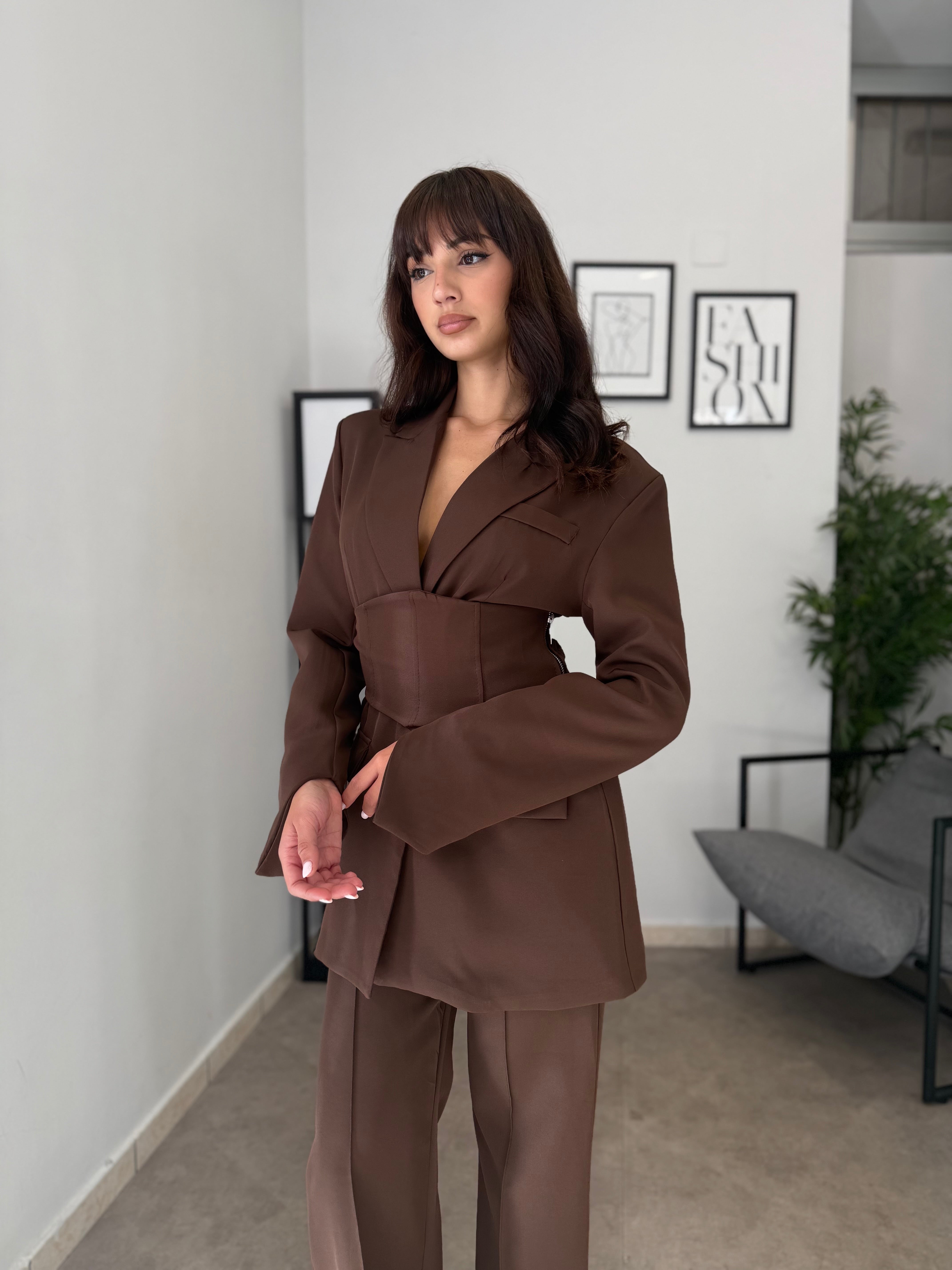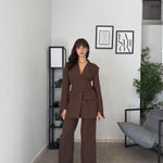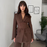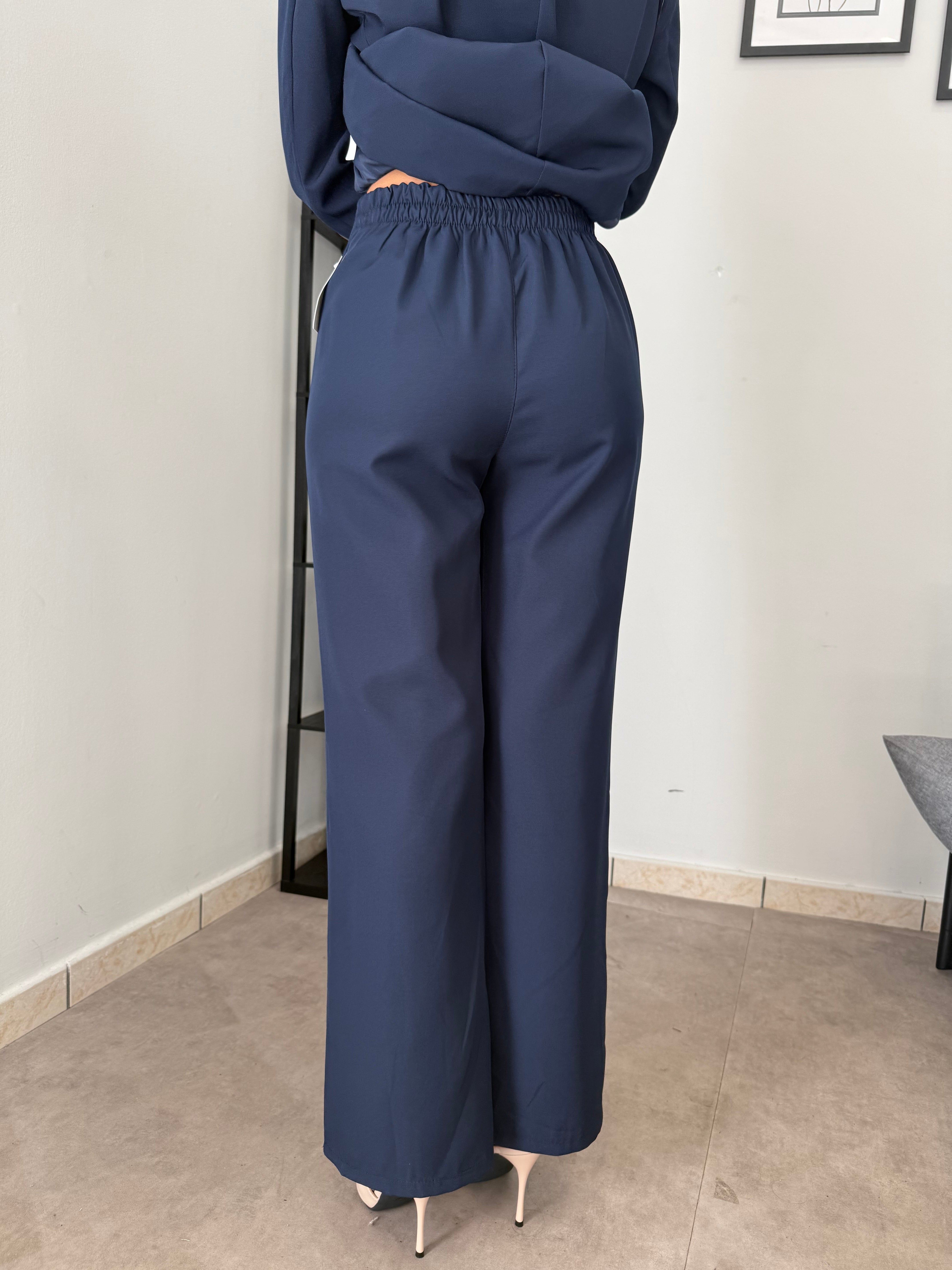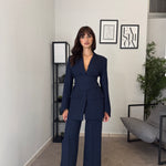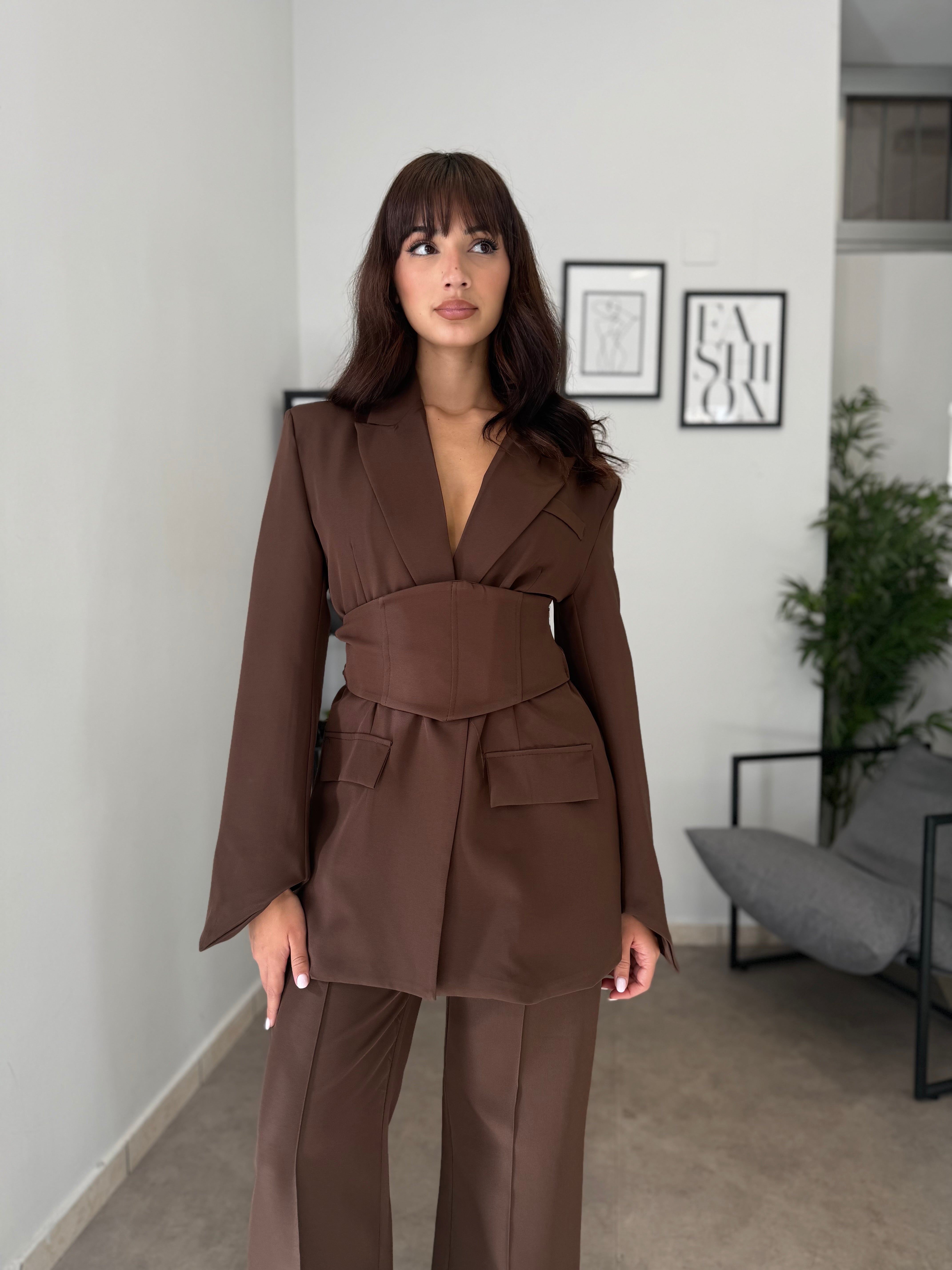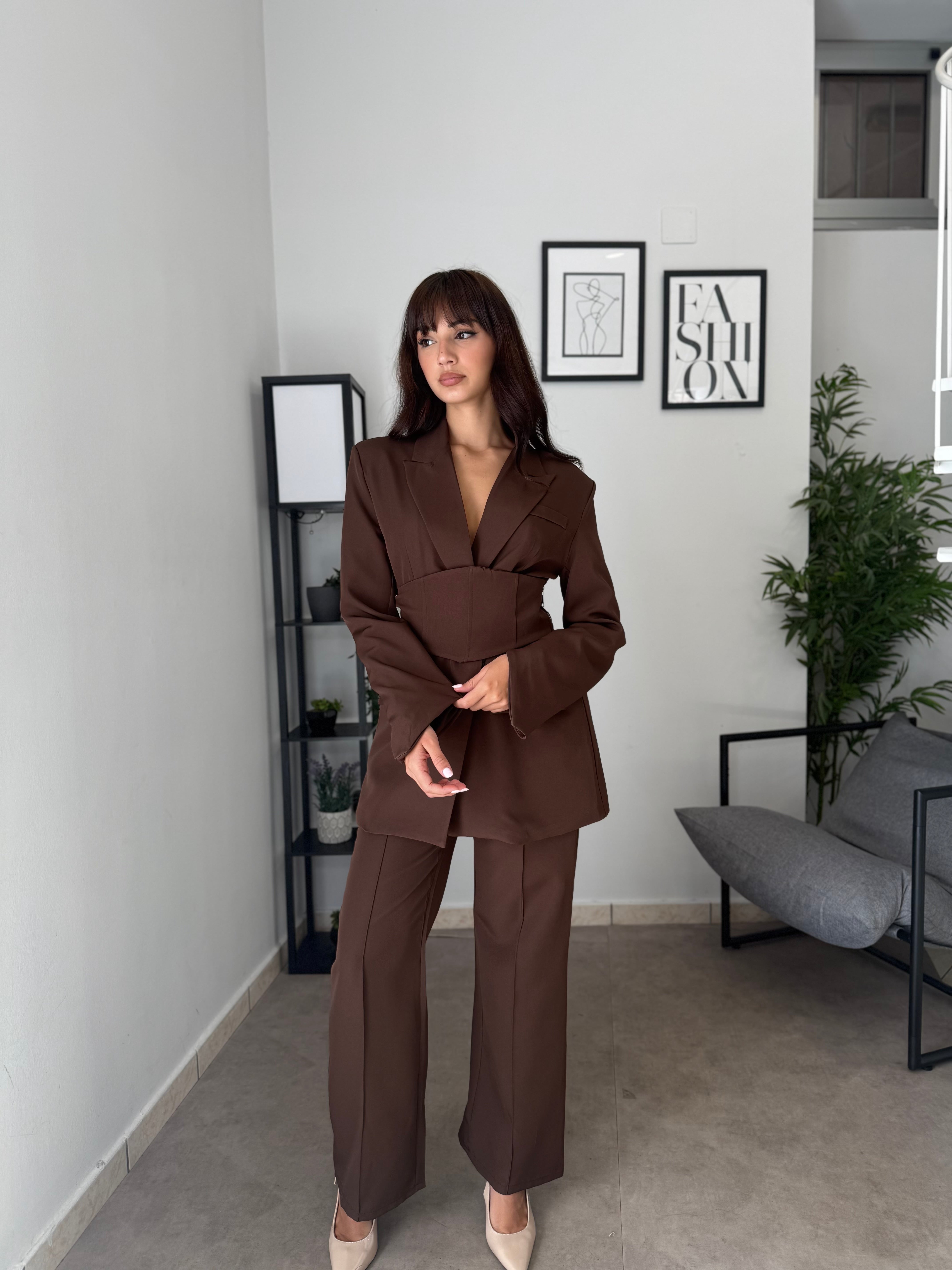 Tailleur con giacca lunga monobottone e pantalone vita alta a zampetta. La fascia va in vita ed il pantalone ha mezza molla sul retro. Veste bene dalla S alla M/L