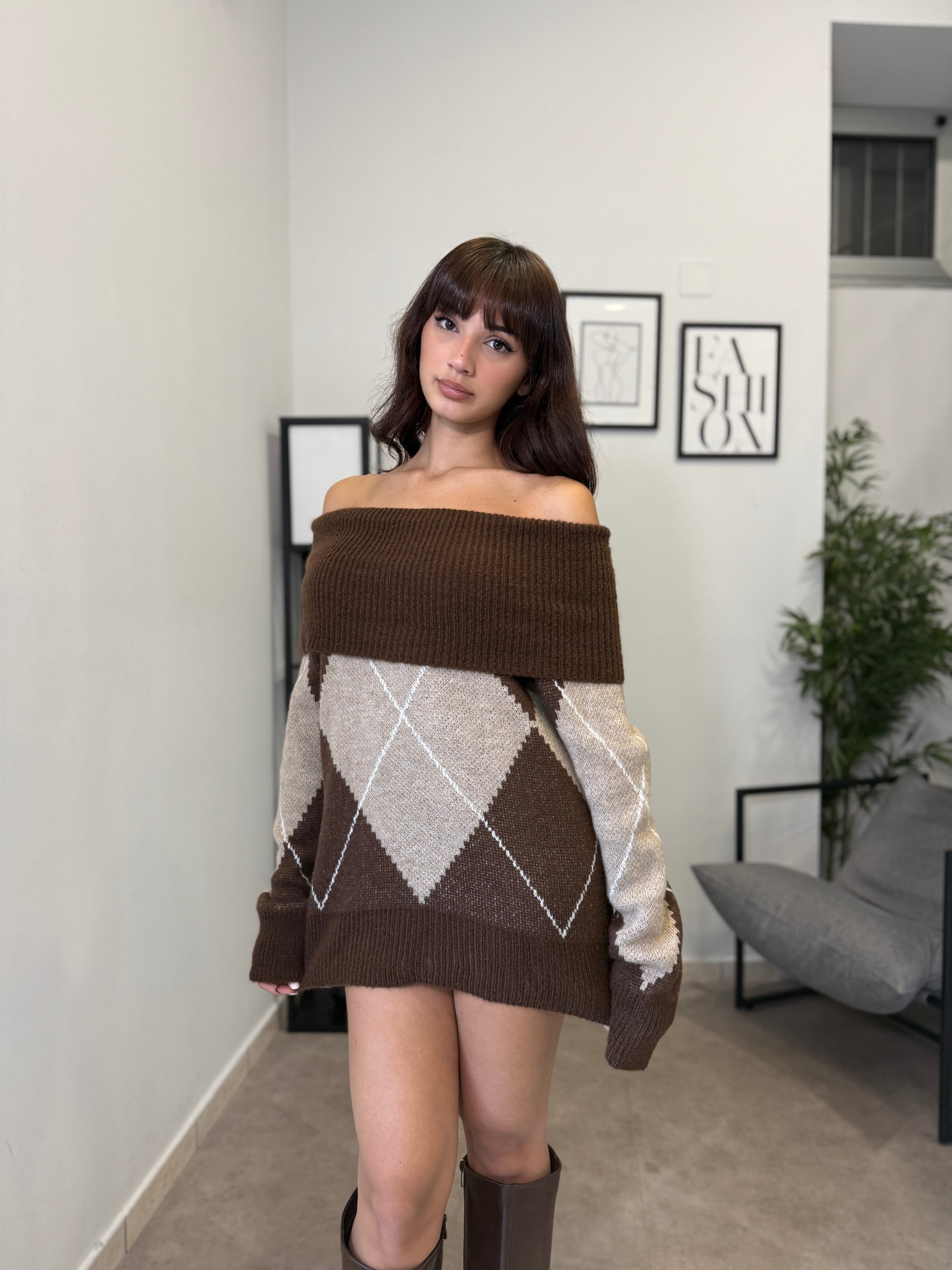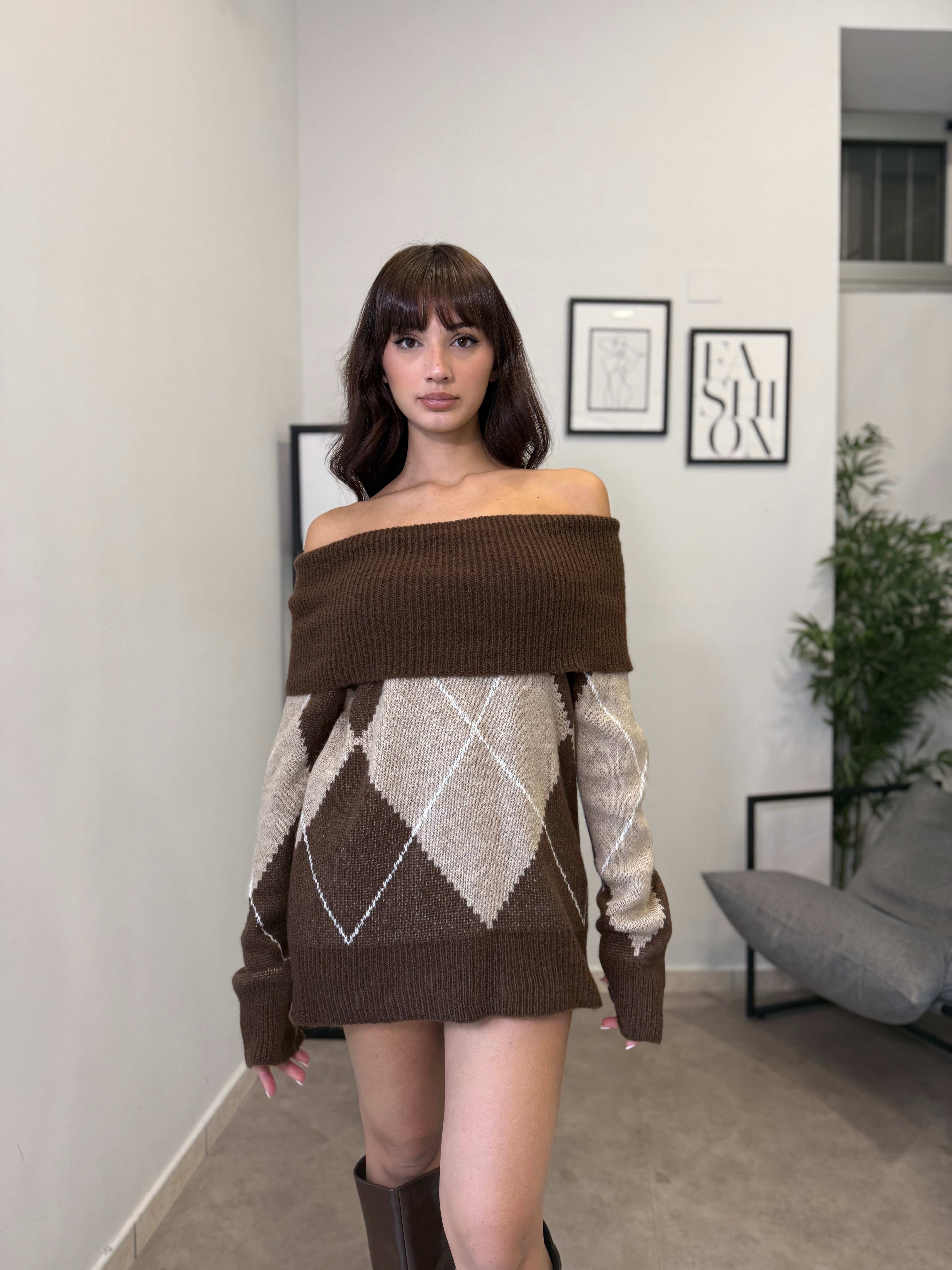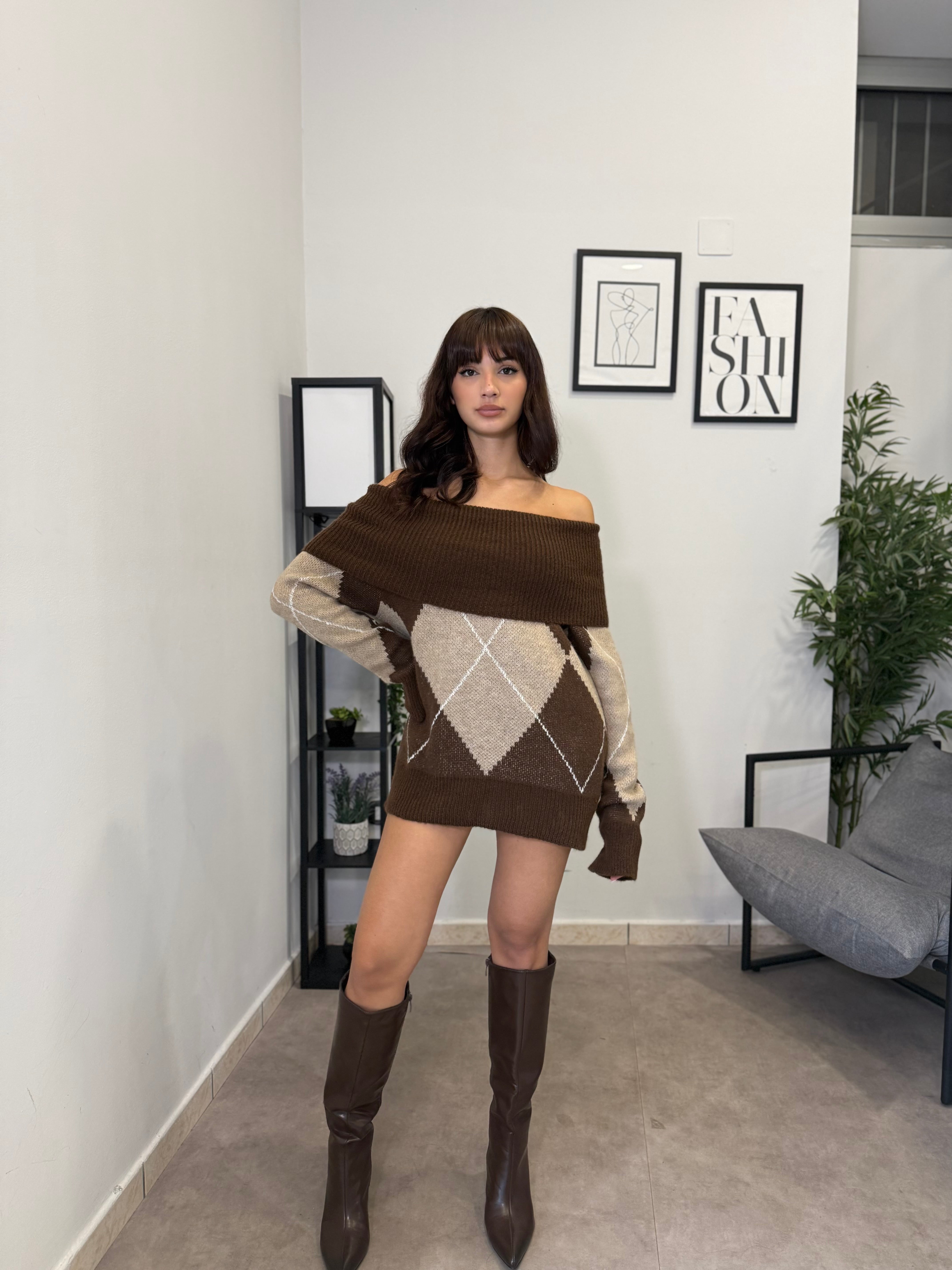 Maglione lungo con rombi e scollo a barca. Veste bene dalla S alla L