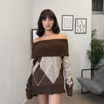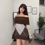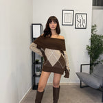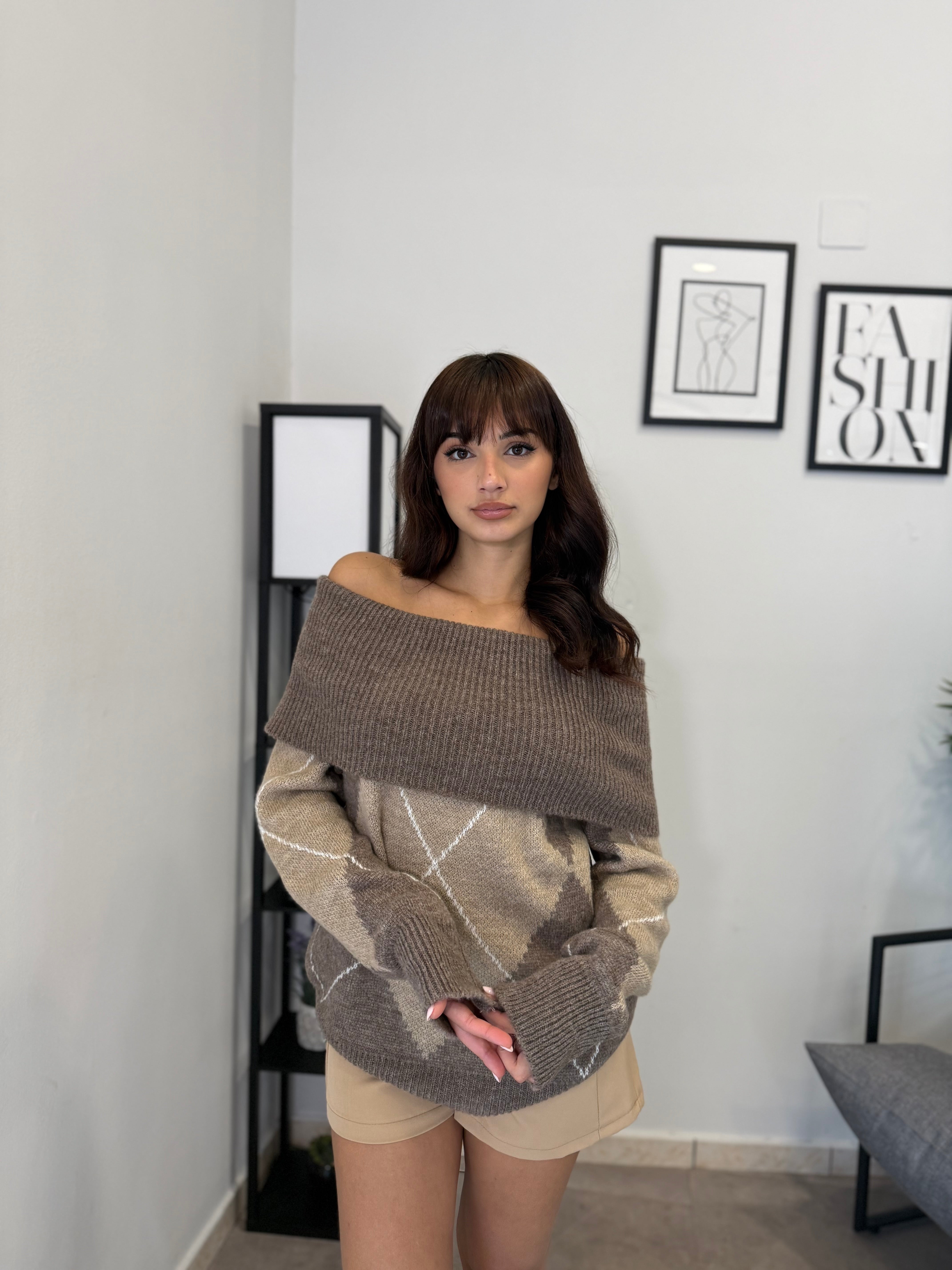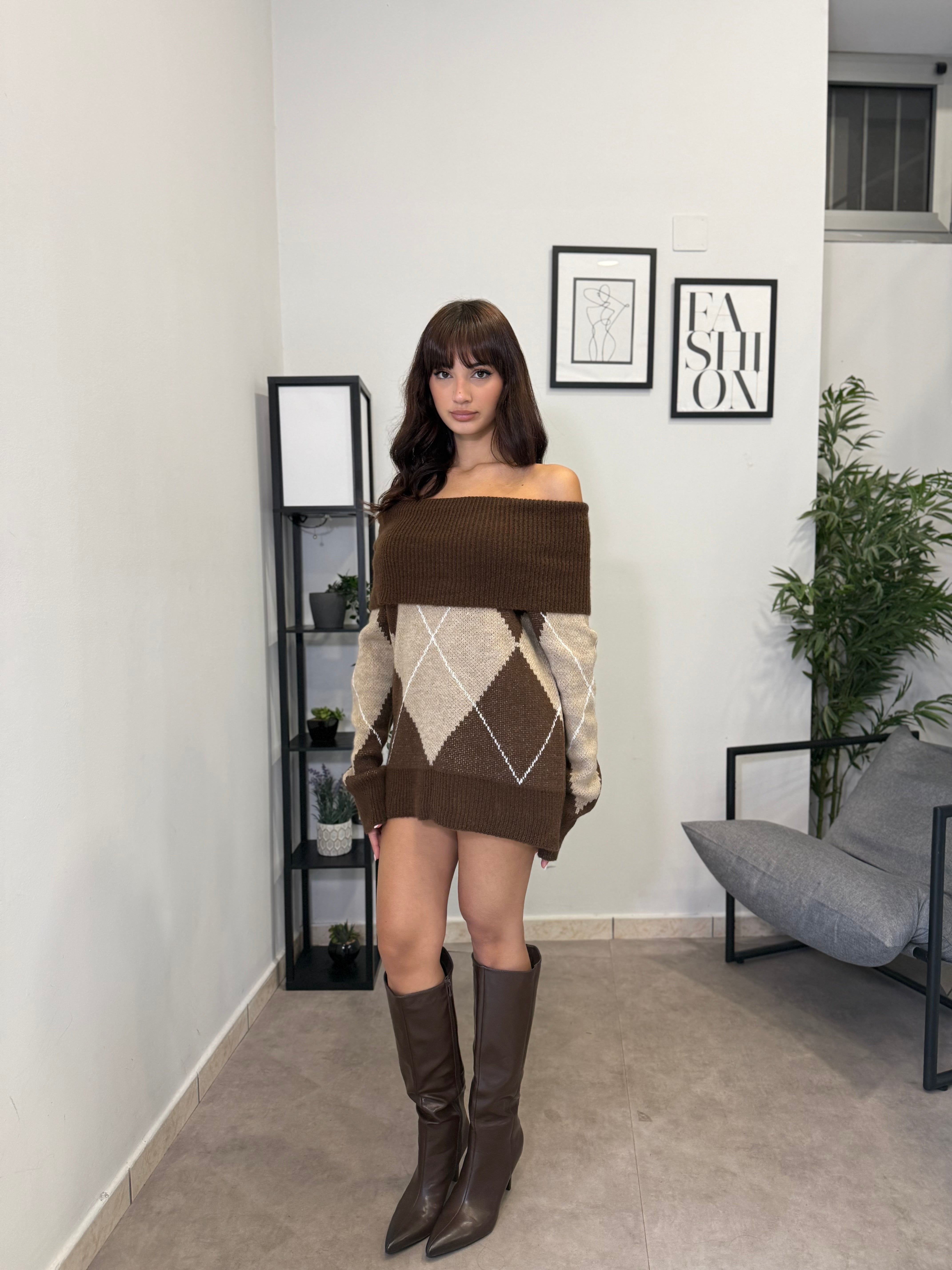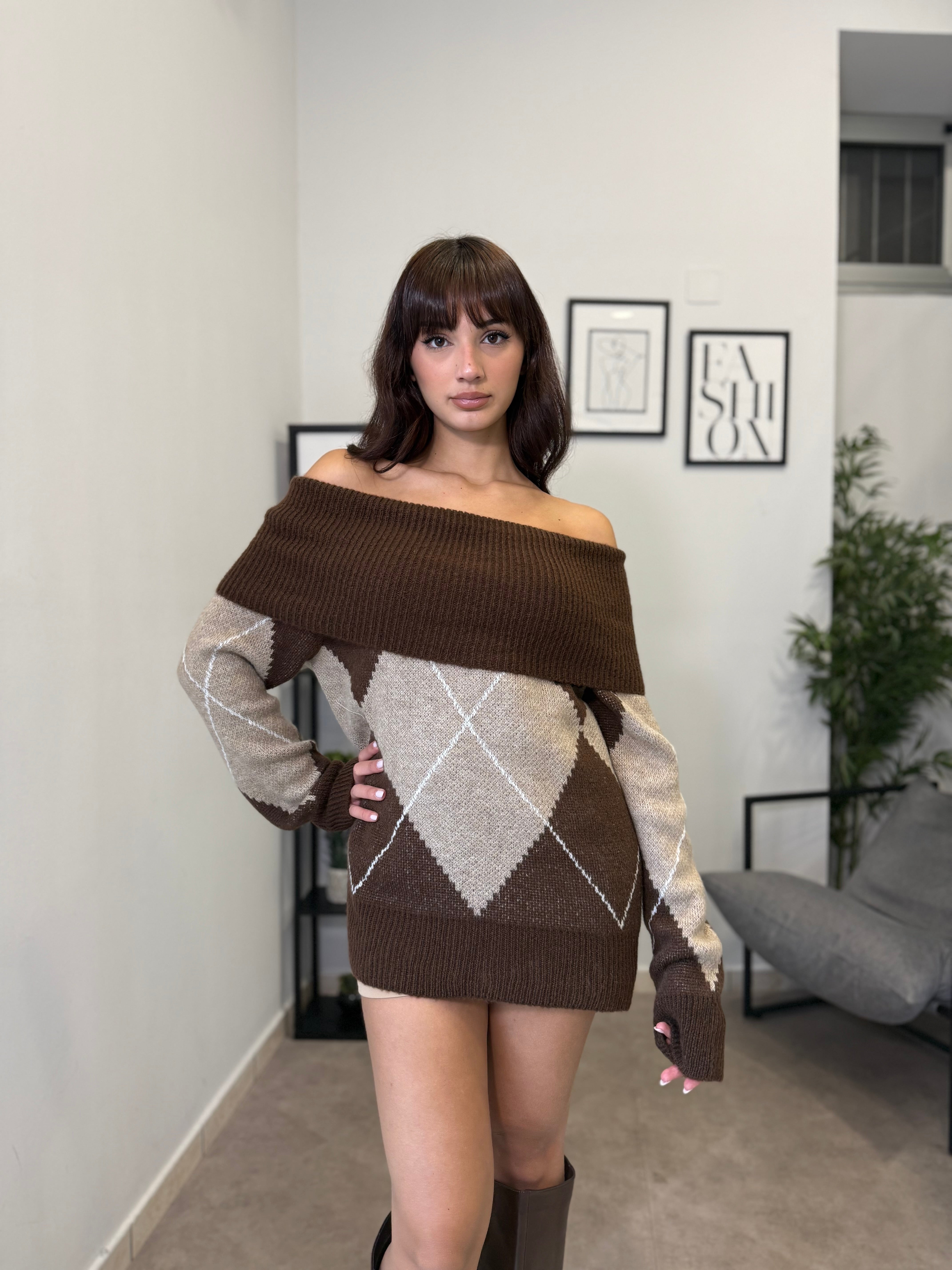 Maglione lungo con rombi e scollo a barca. Veste bene dalla S alla L