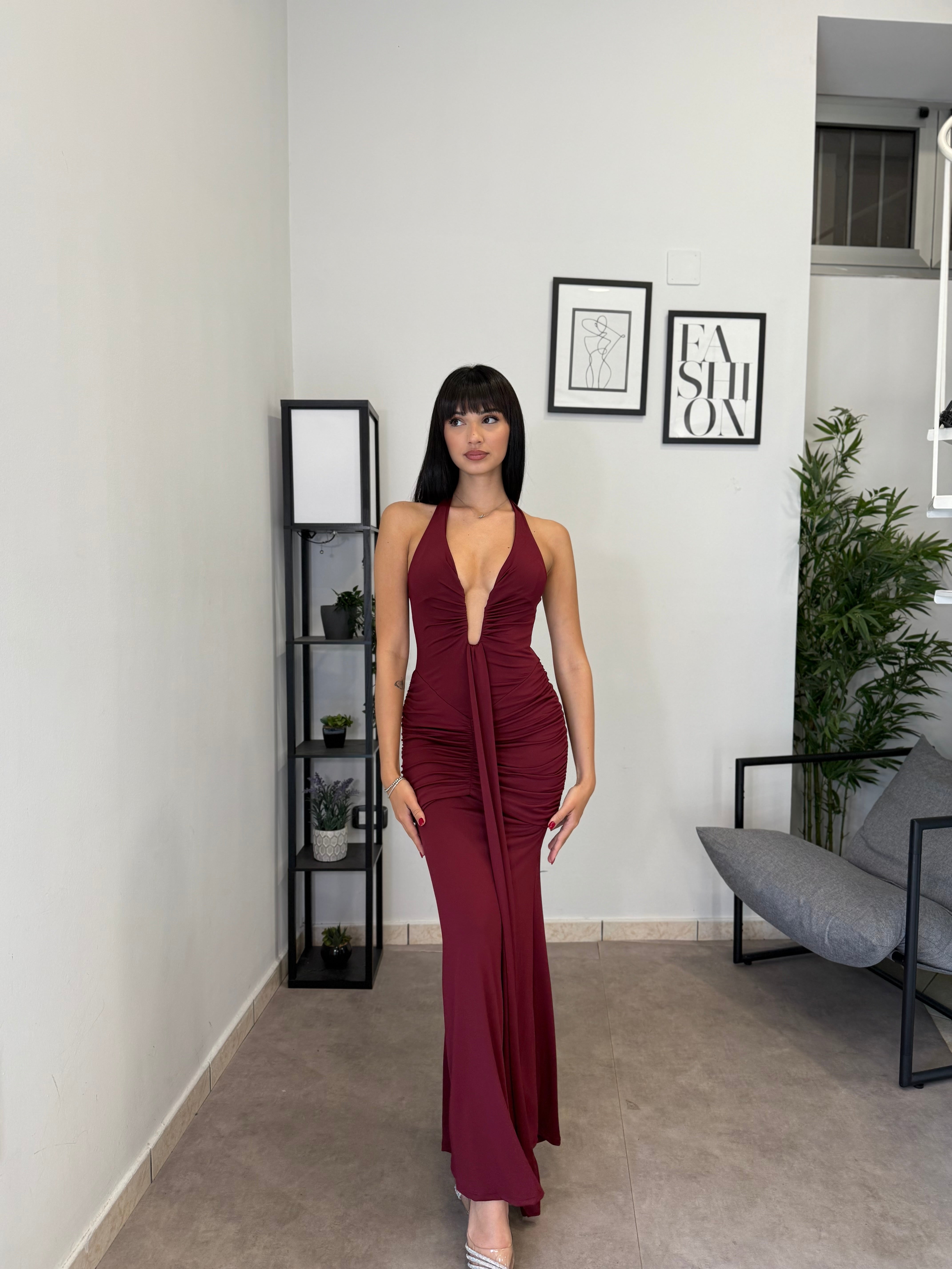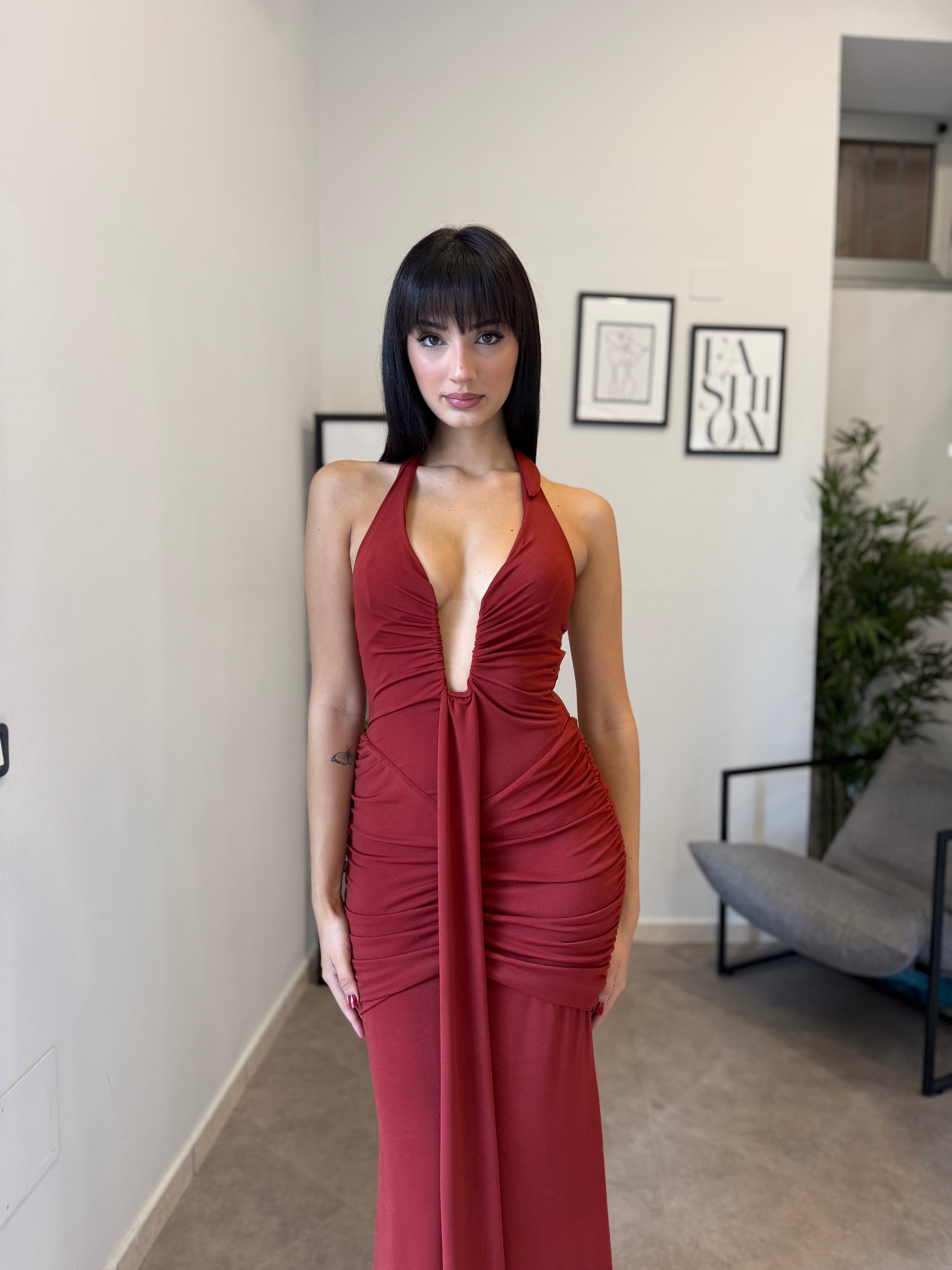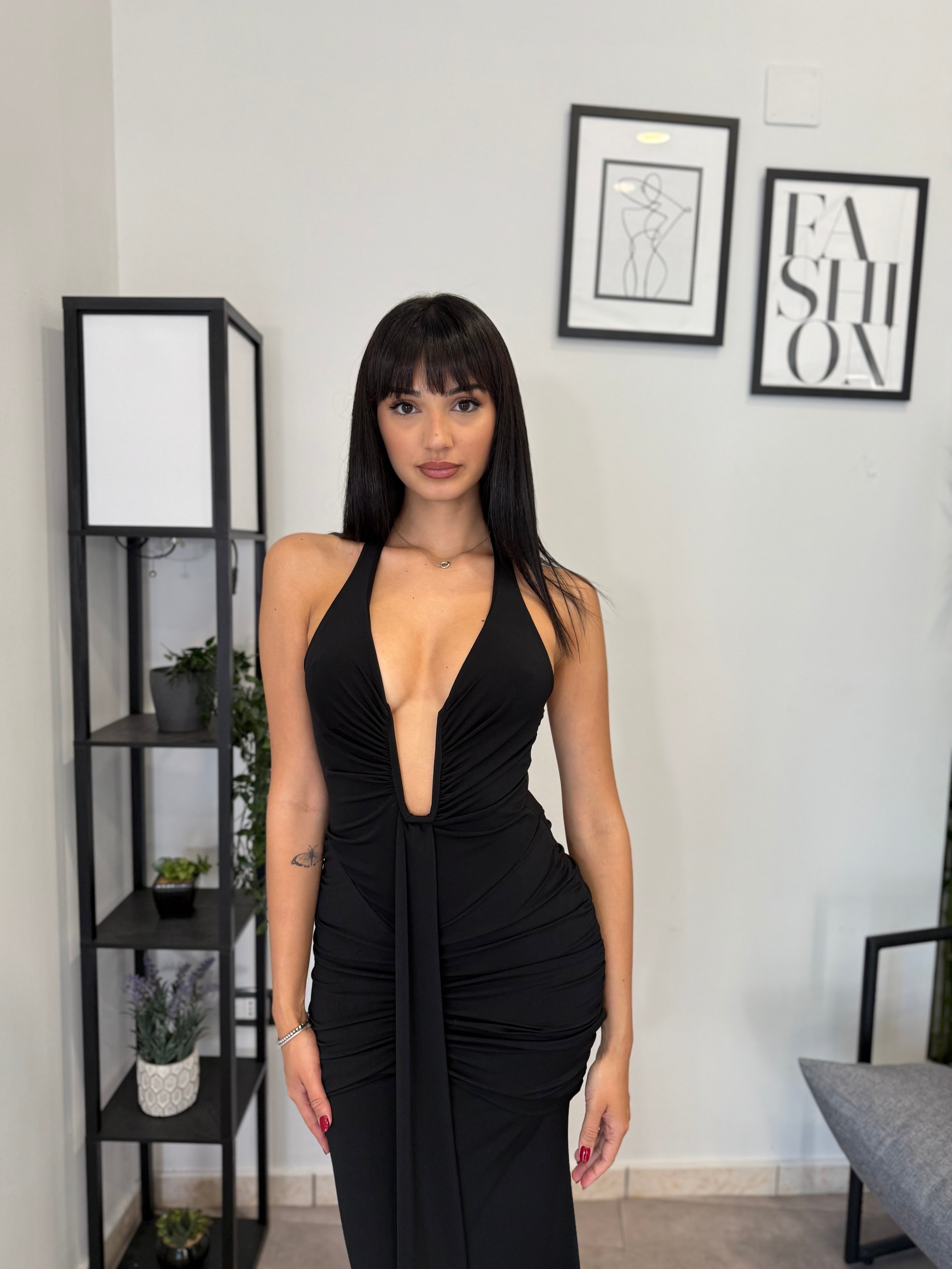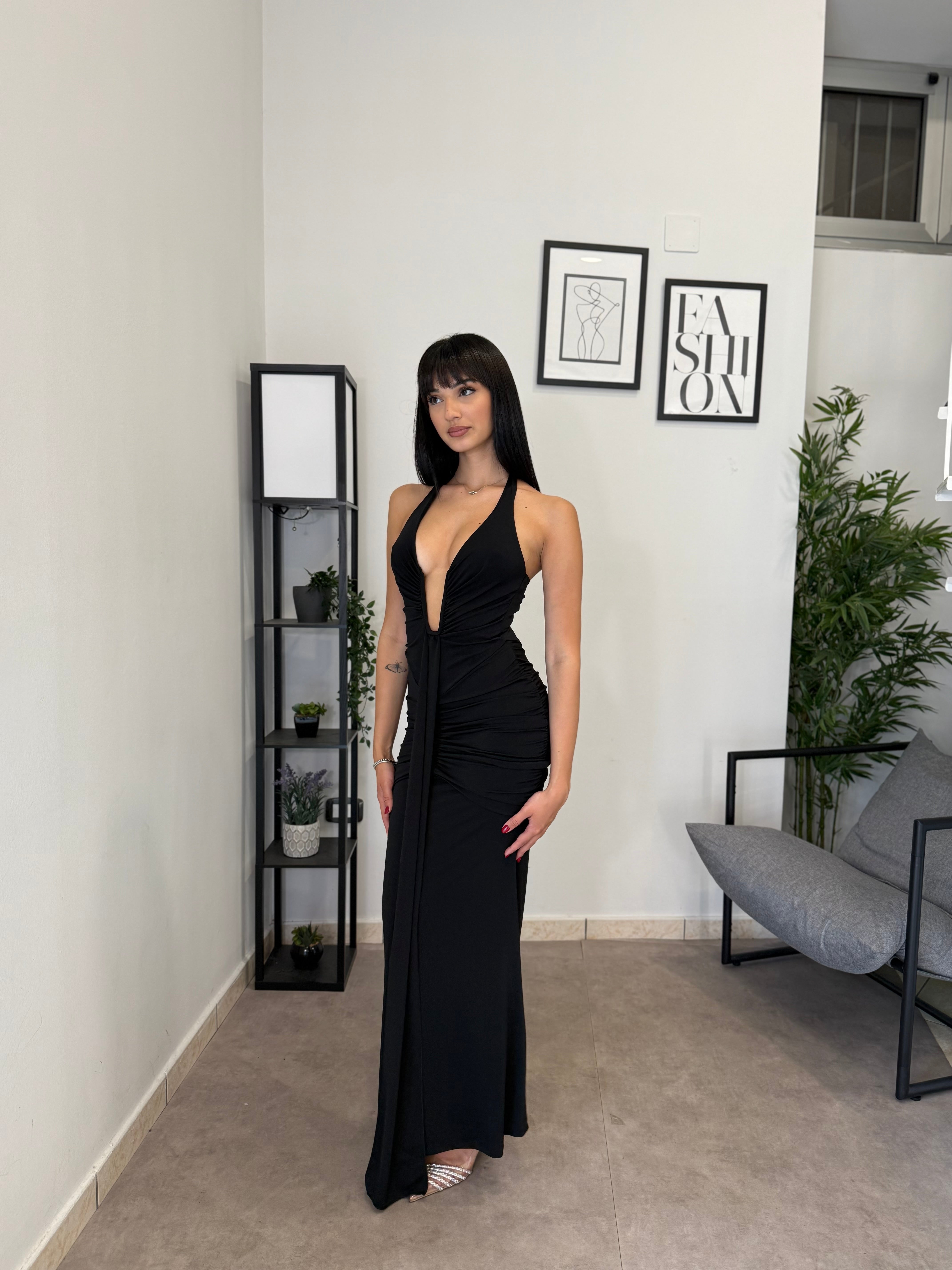 Abito lungo in licra con scollo frontale profondo (ha un ferretto ad U). Tessuto elastico, consiglio dalla XS alla M. A causa di una nuova produzione non riusciamo a garantire il prezzo in saldo!