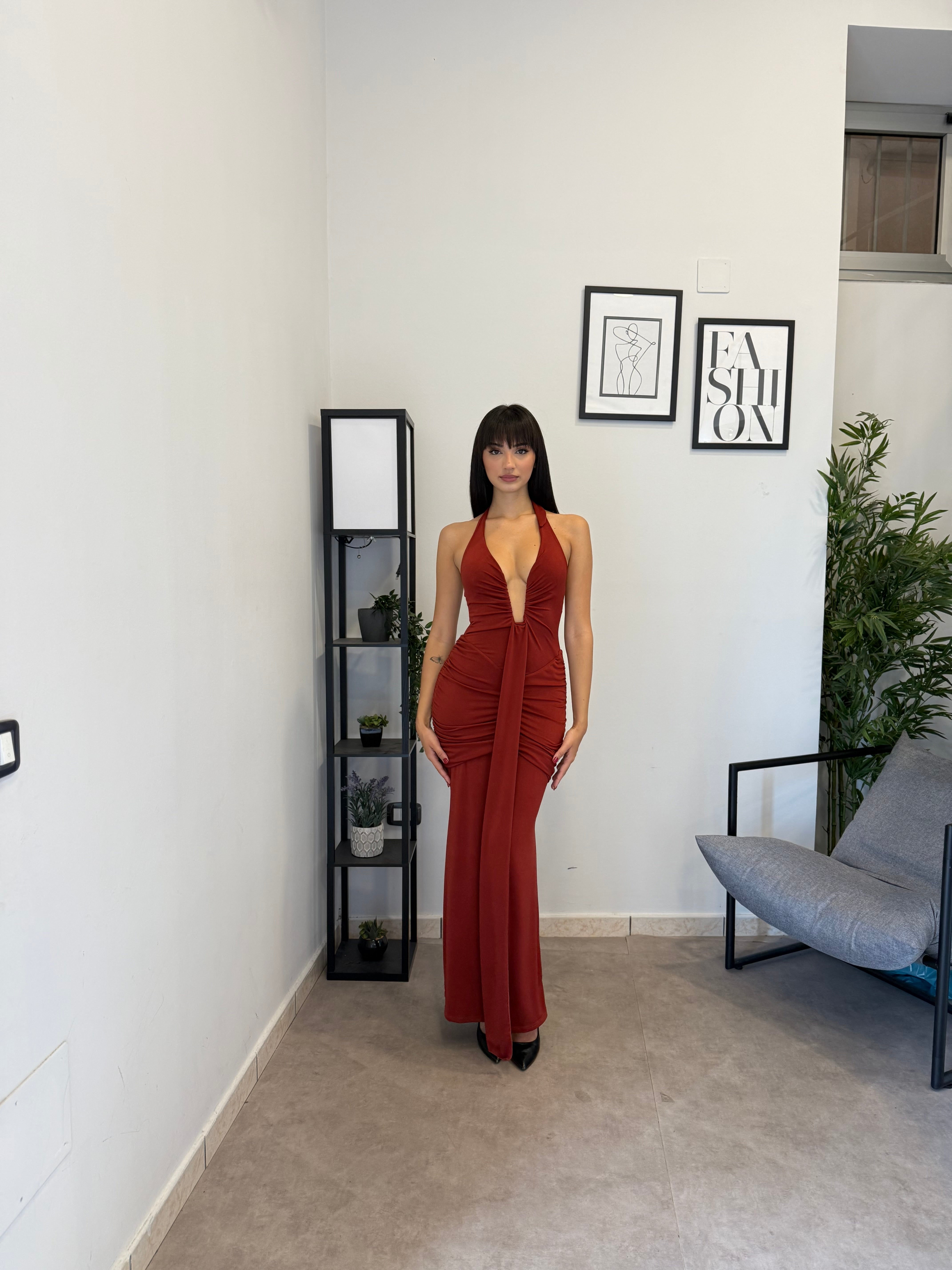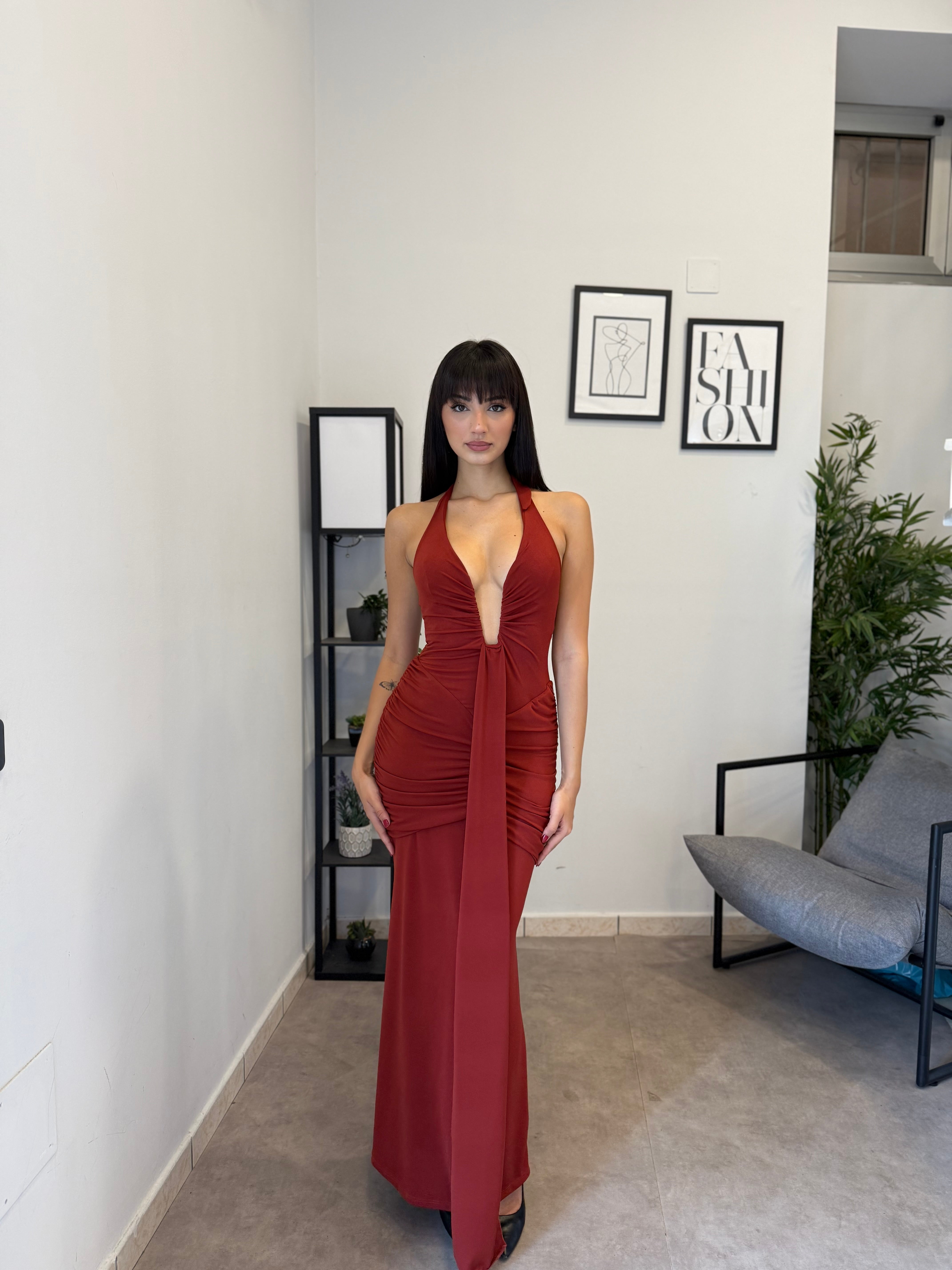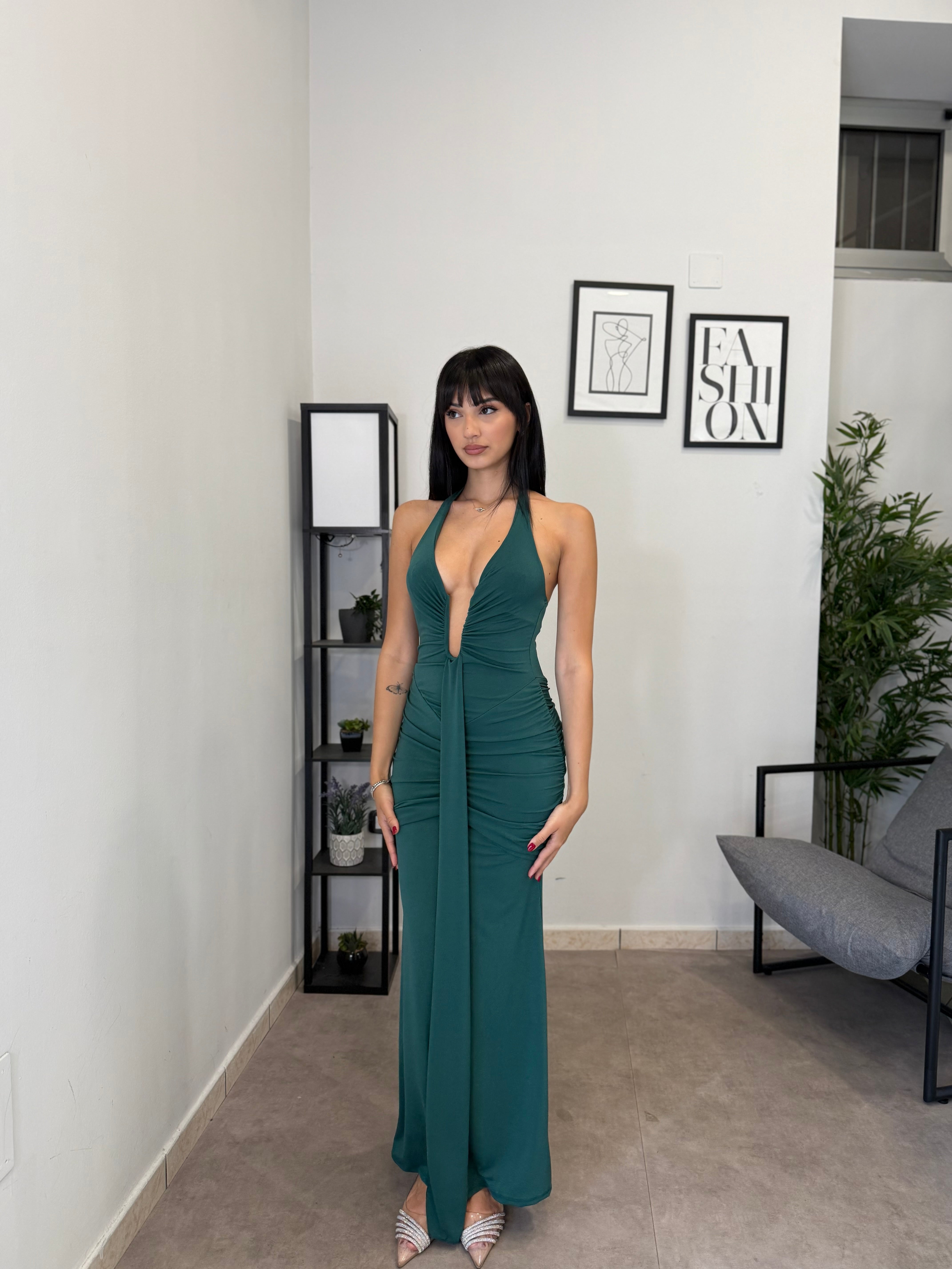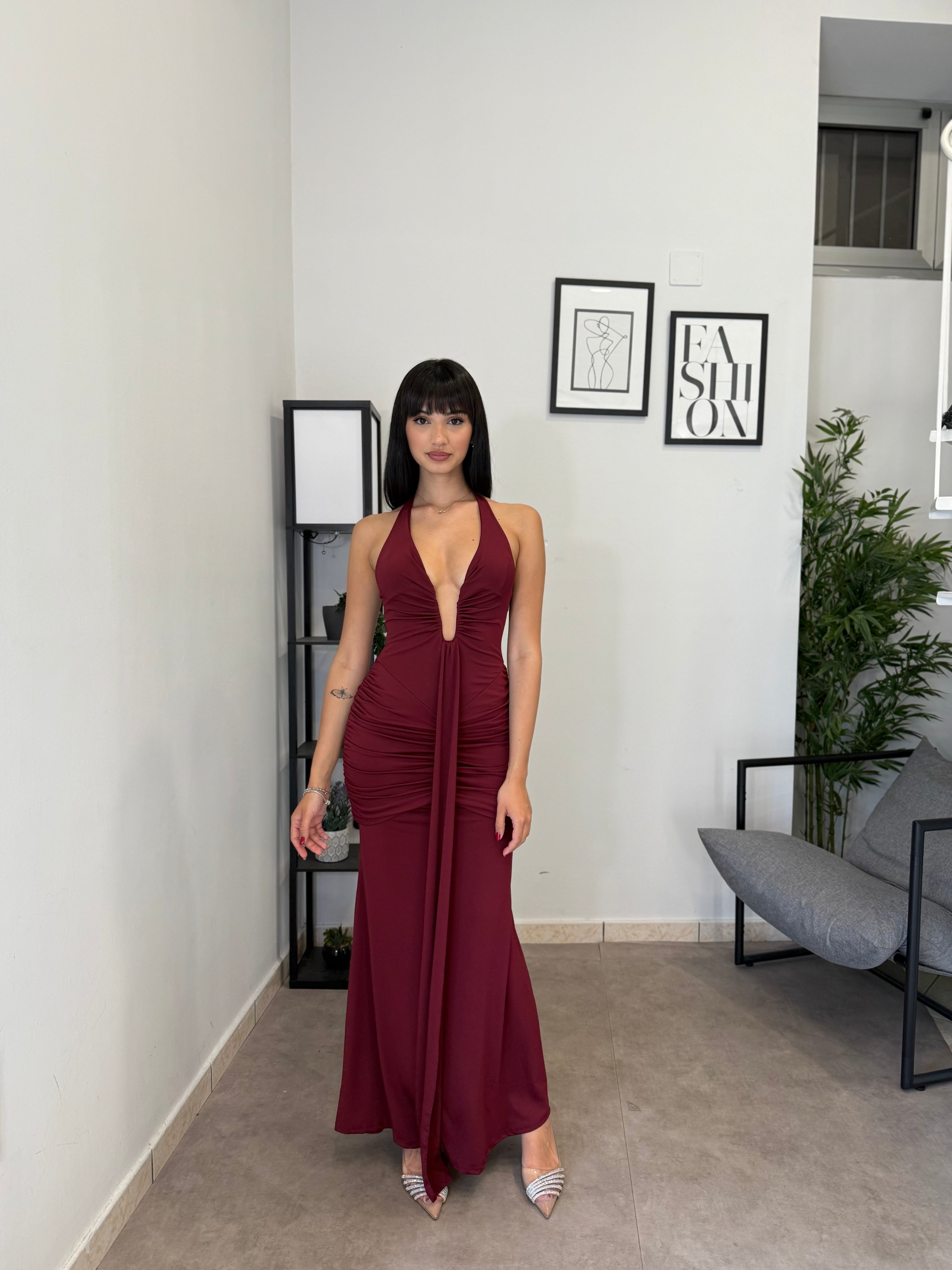 Abito lungo in licra con scollo frontale profondo (ha un ferretto ad U). Tessuto elastico, consiglio dalla XS alla M. A causa di una nuova produzione non riusciamo a garantire il prezzo in saldo!
