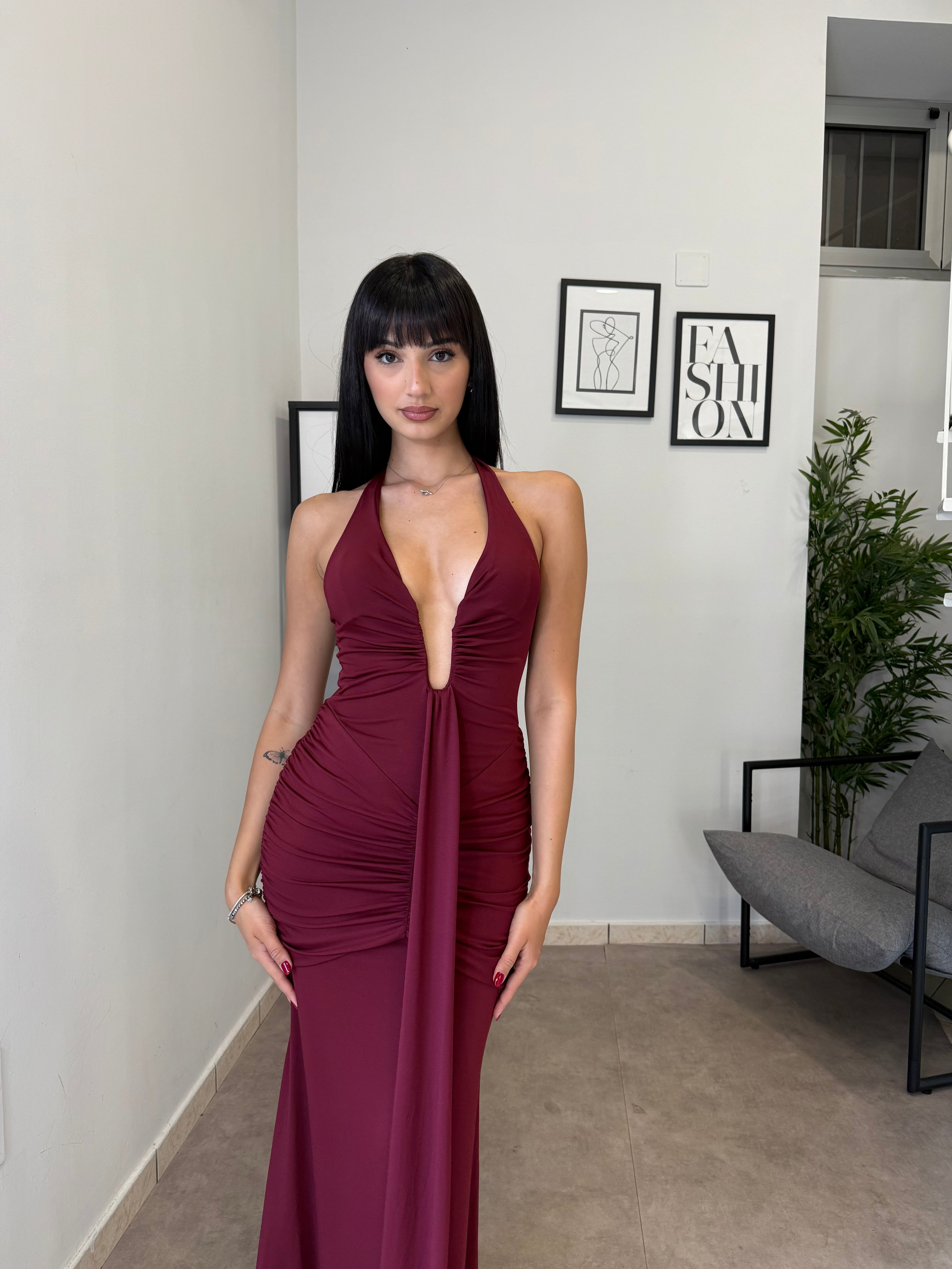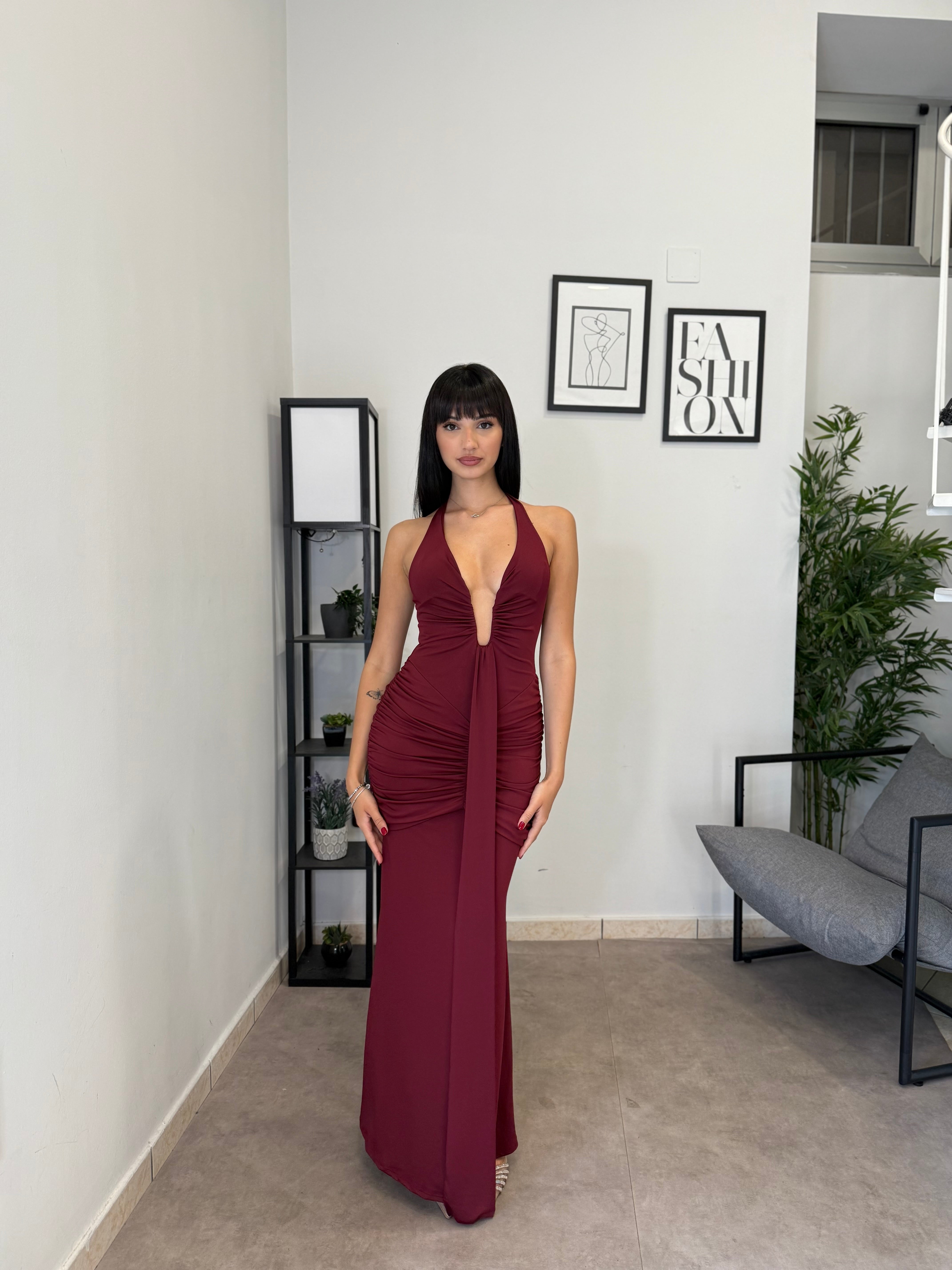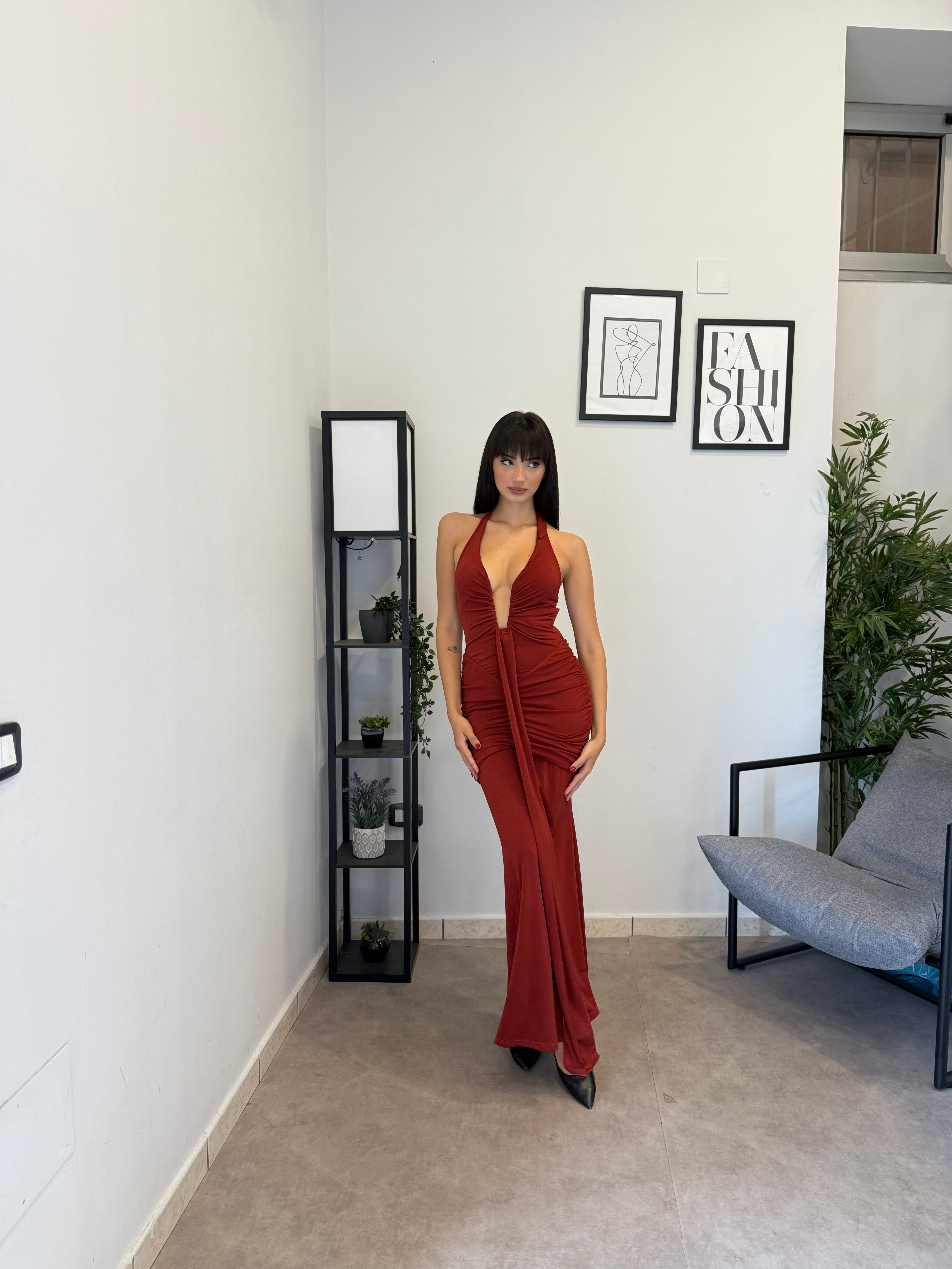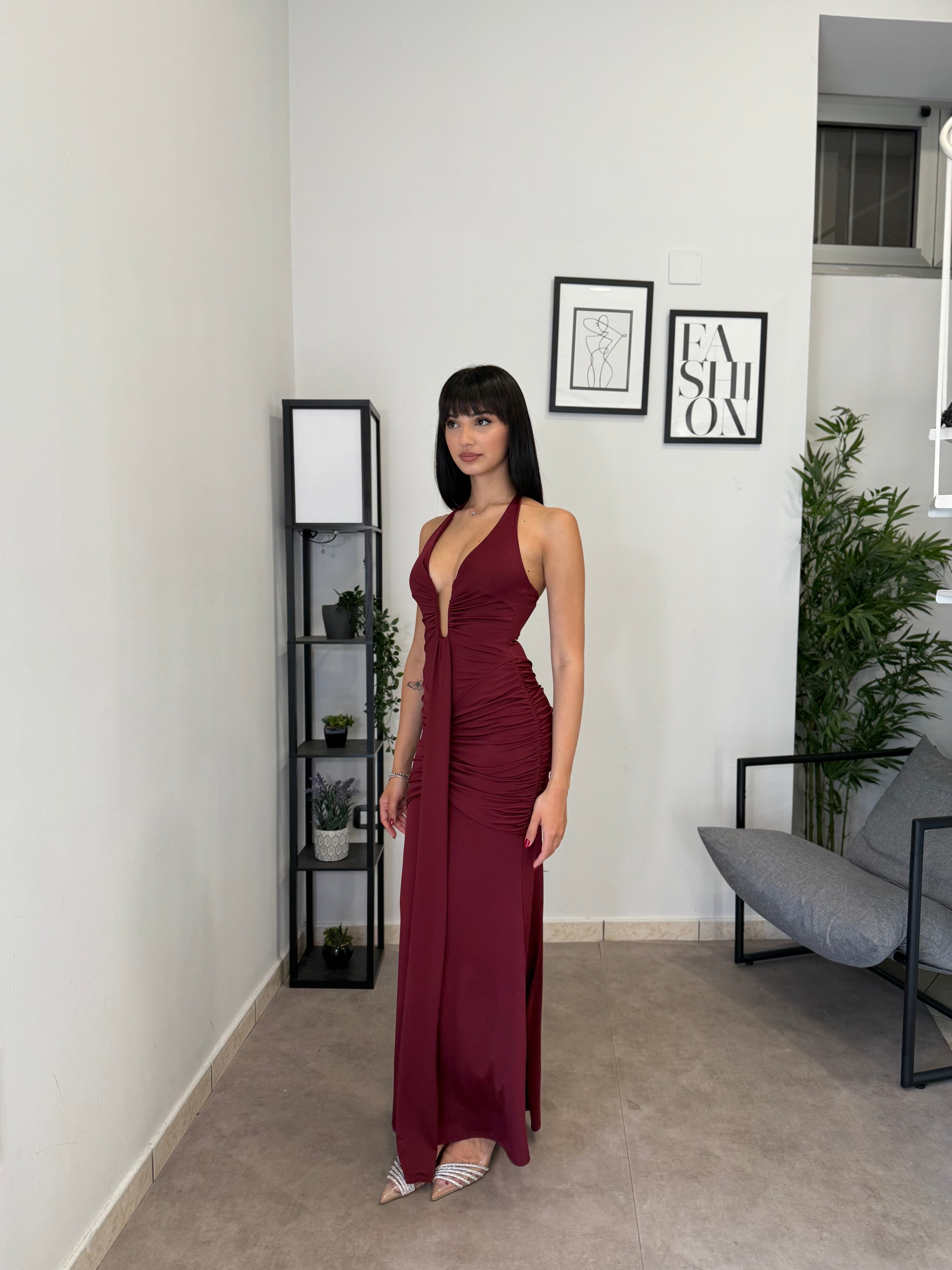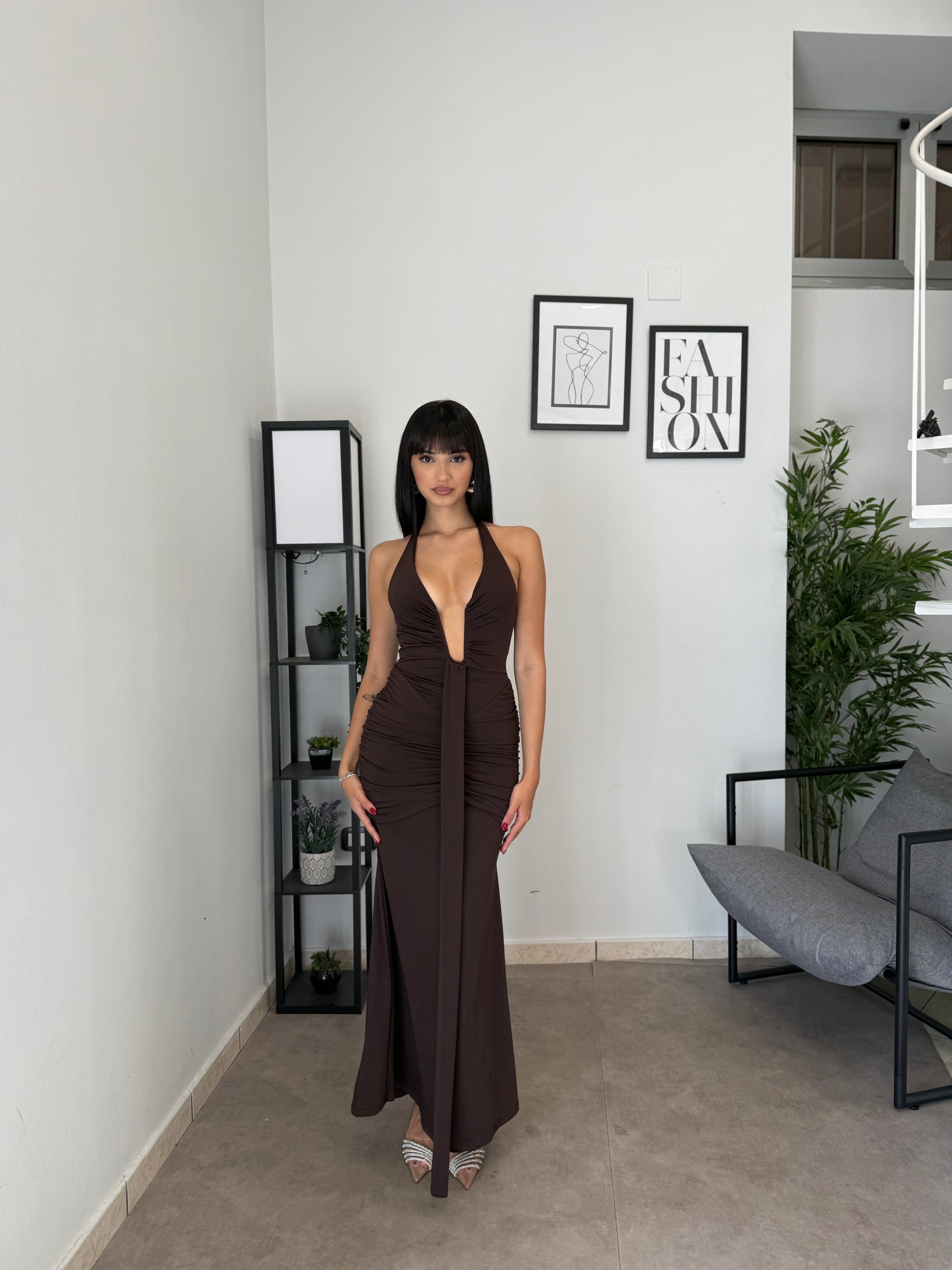 Abito lungo in licra con scollo frontale profondo (ha un ferretto ad U). Tessuto elastico, consiglio dalla XS alla M. A causa di una nuova produzione non riusciamo a garantire il prezzo in saldo!