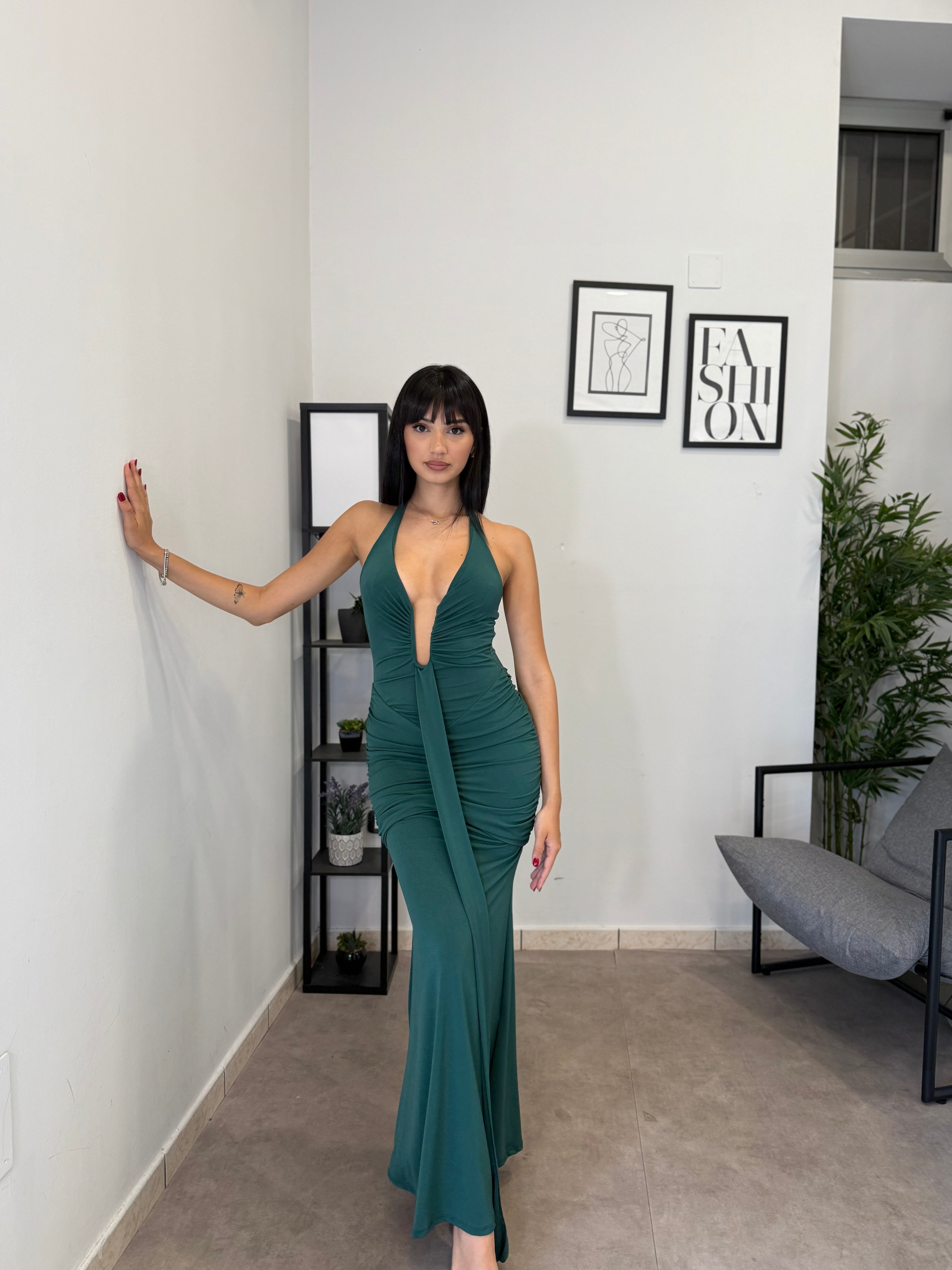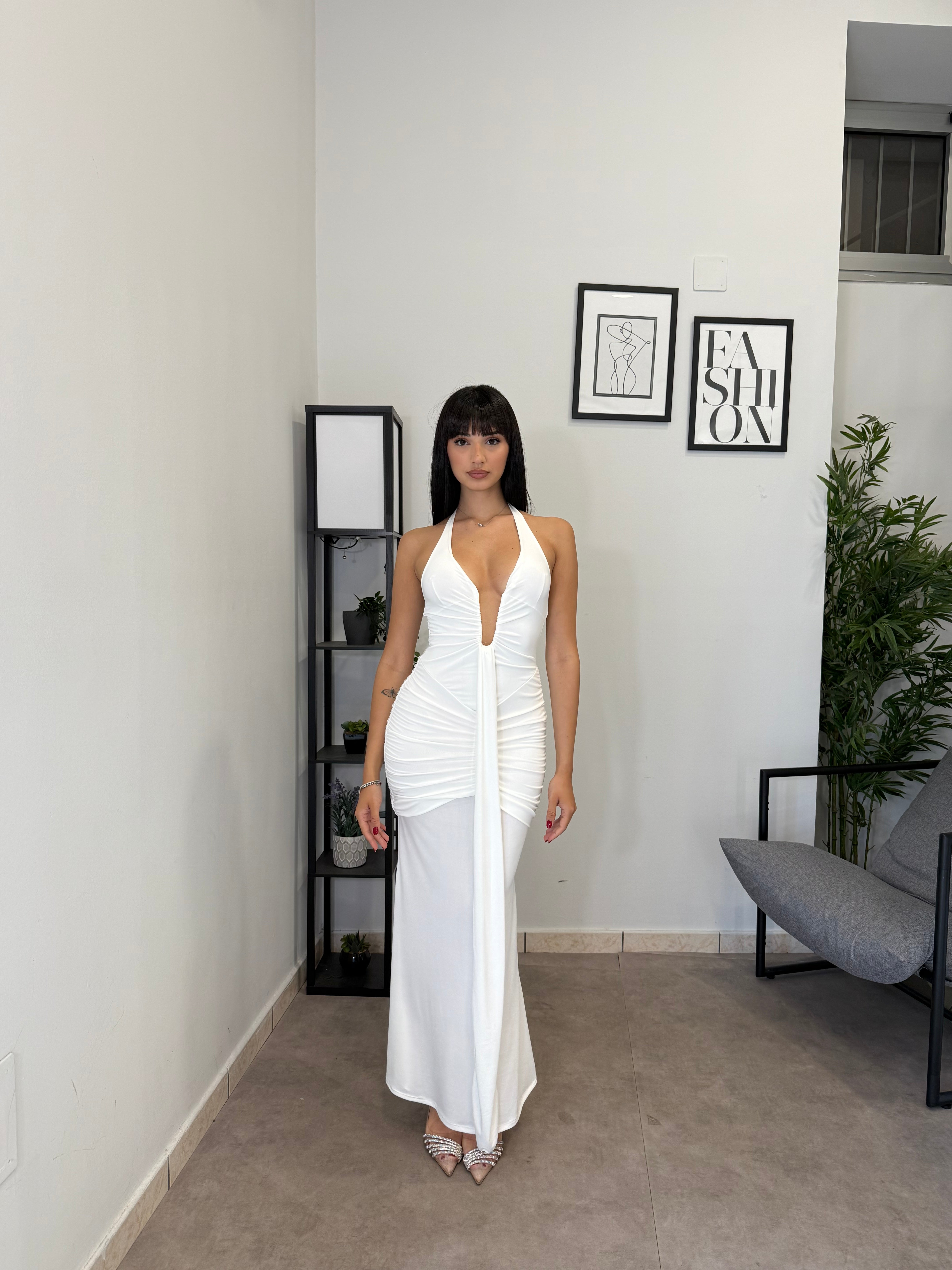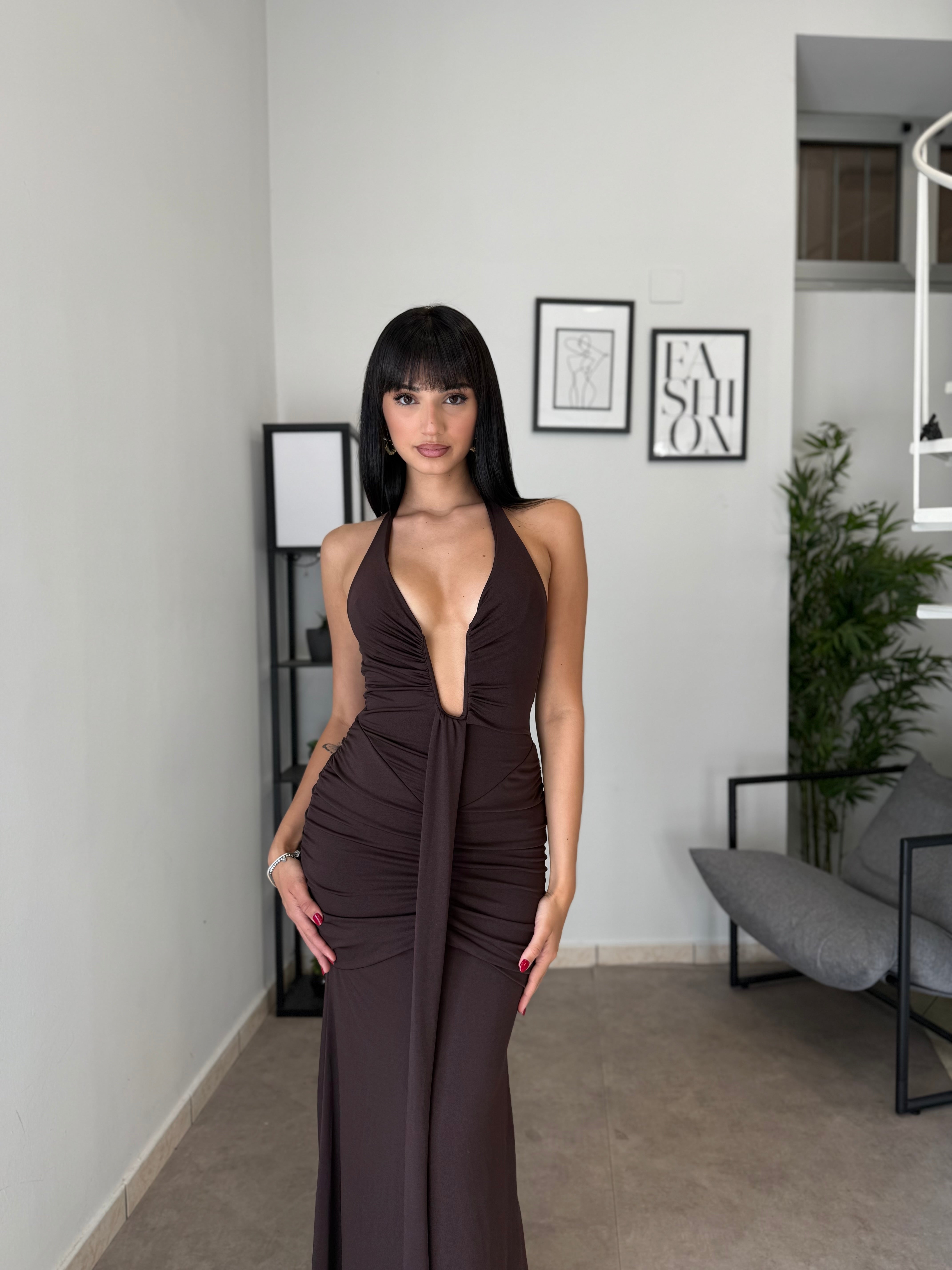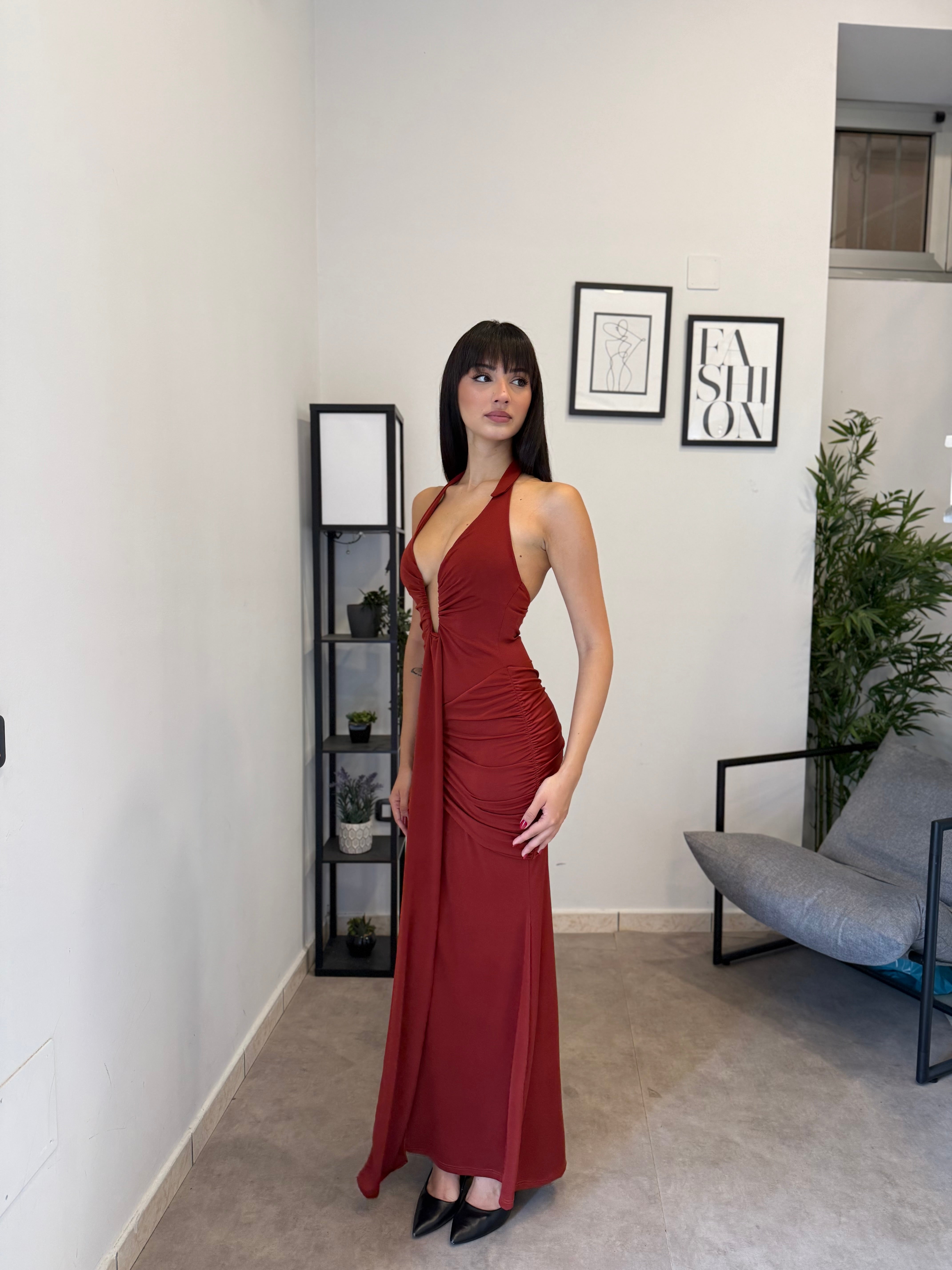 Abito lungo in licra con scollo frontale profondo (ha un ferretto ad U). Tessuto elastico, consiglio dalla XS alla M. A causa di una nuova produzione non riusciamo a garantire il prezzo in saldo!