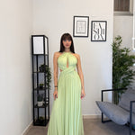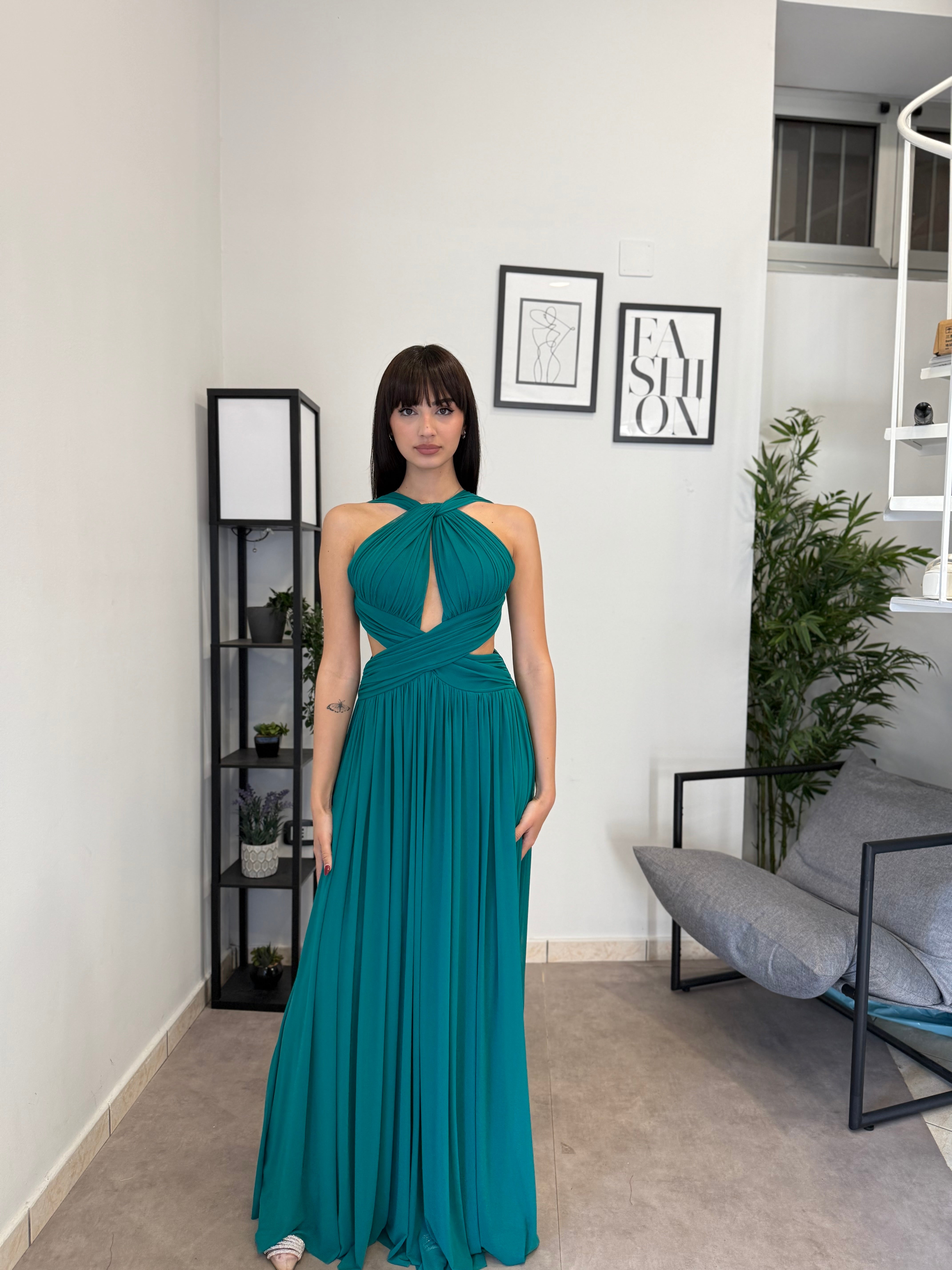 Abito elegante adatto per ogni evento. Ricoperto di tulle con fodera in poliestere, è scollato nella parte frontale ed aperto sui lati. Tg M/L veste una 44/46 ita.