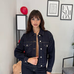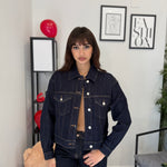 Giubbotto in denim scuro, modello crop. Marta indossa tg S. Si abbina al jeans ballon fit scuro 5798