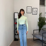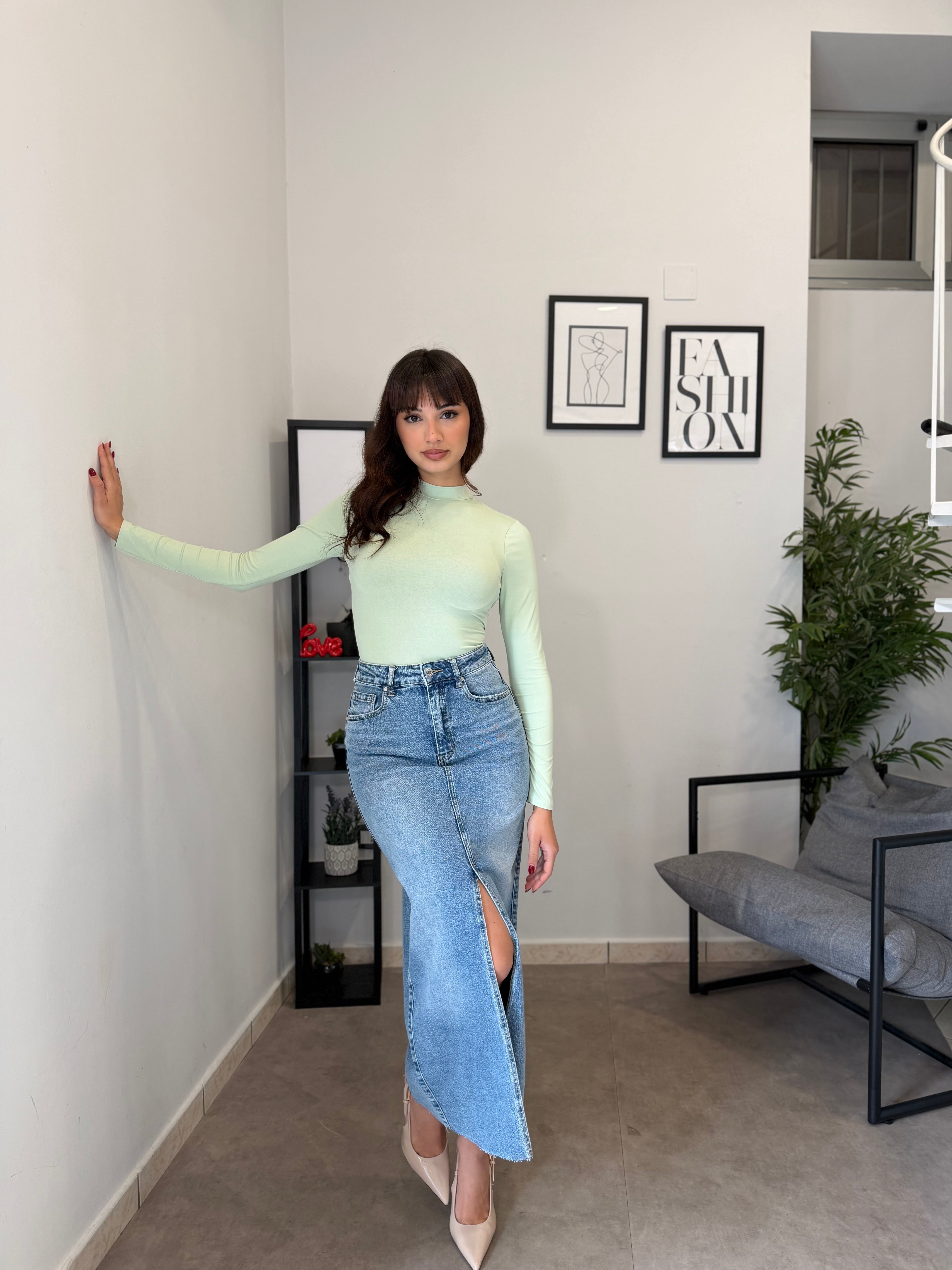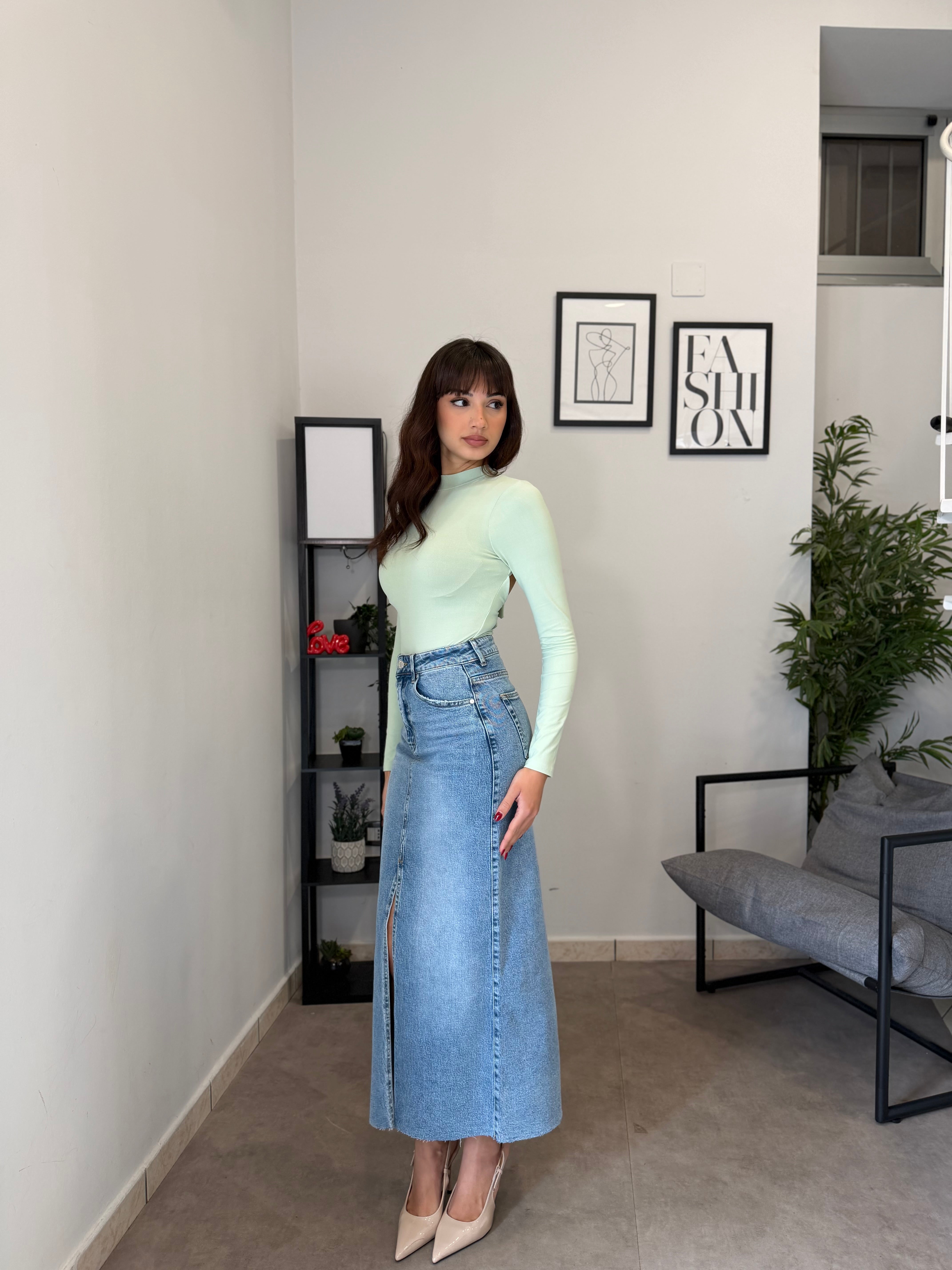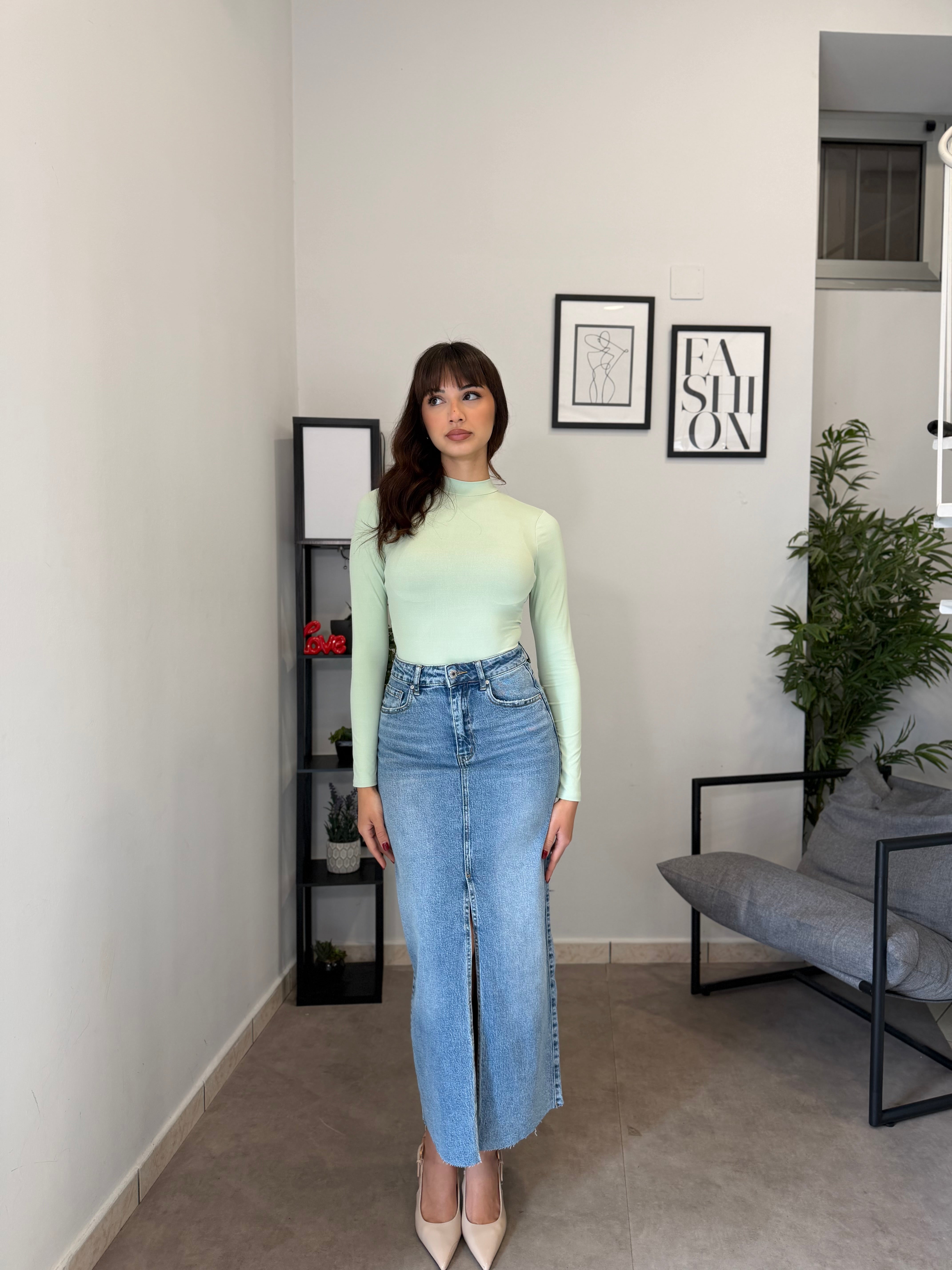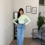 Gonna lunga in denim con spacco frontale, vita alta e poco elastica. Marta indossa tg XS