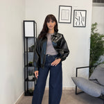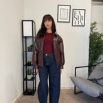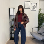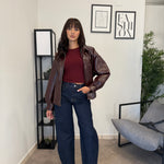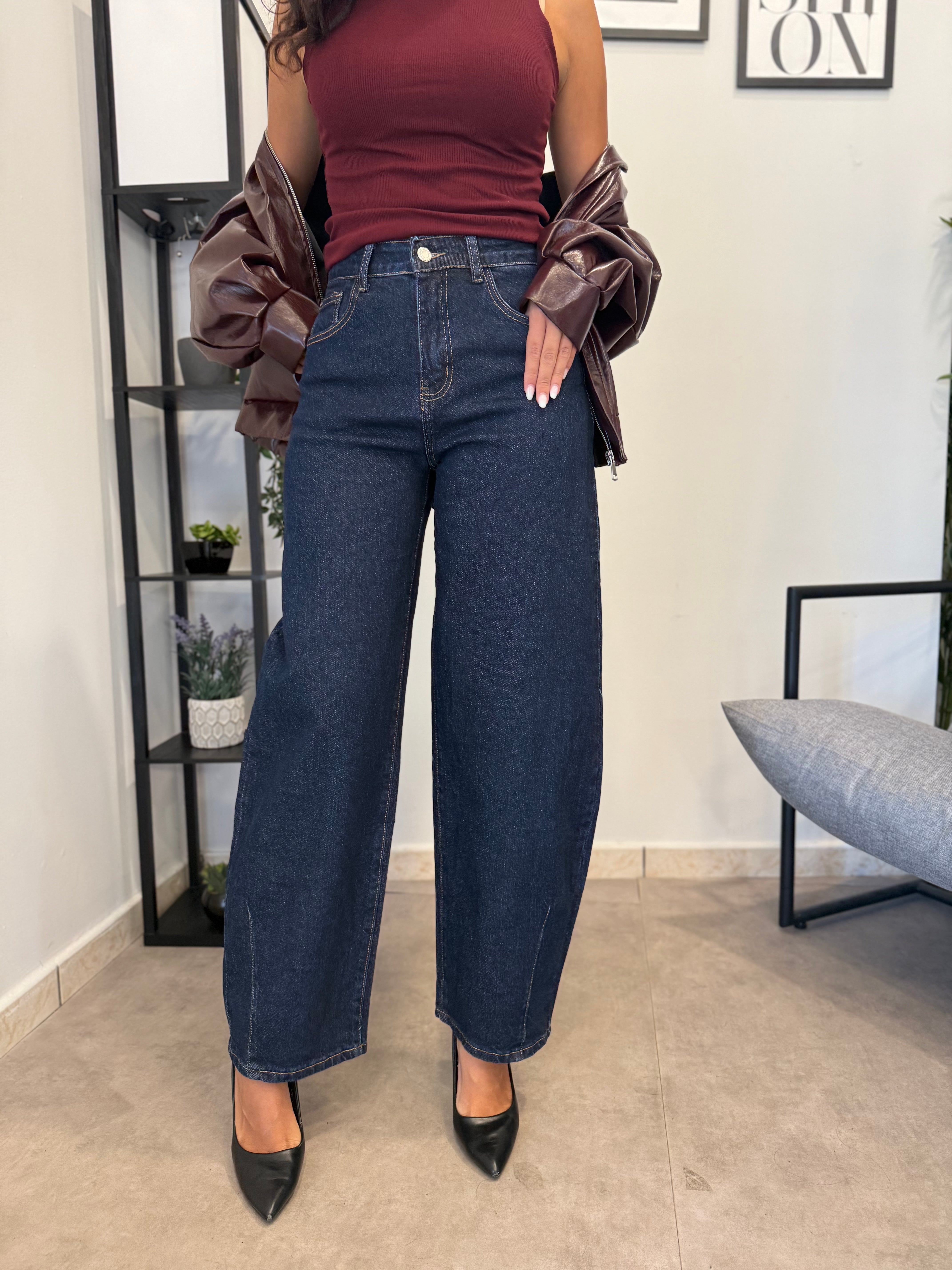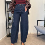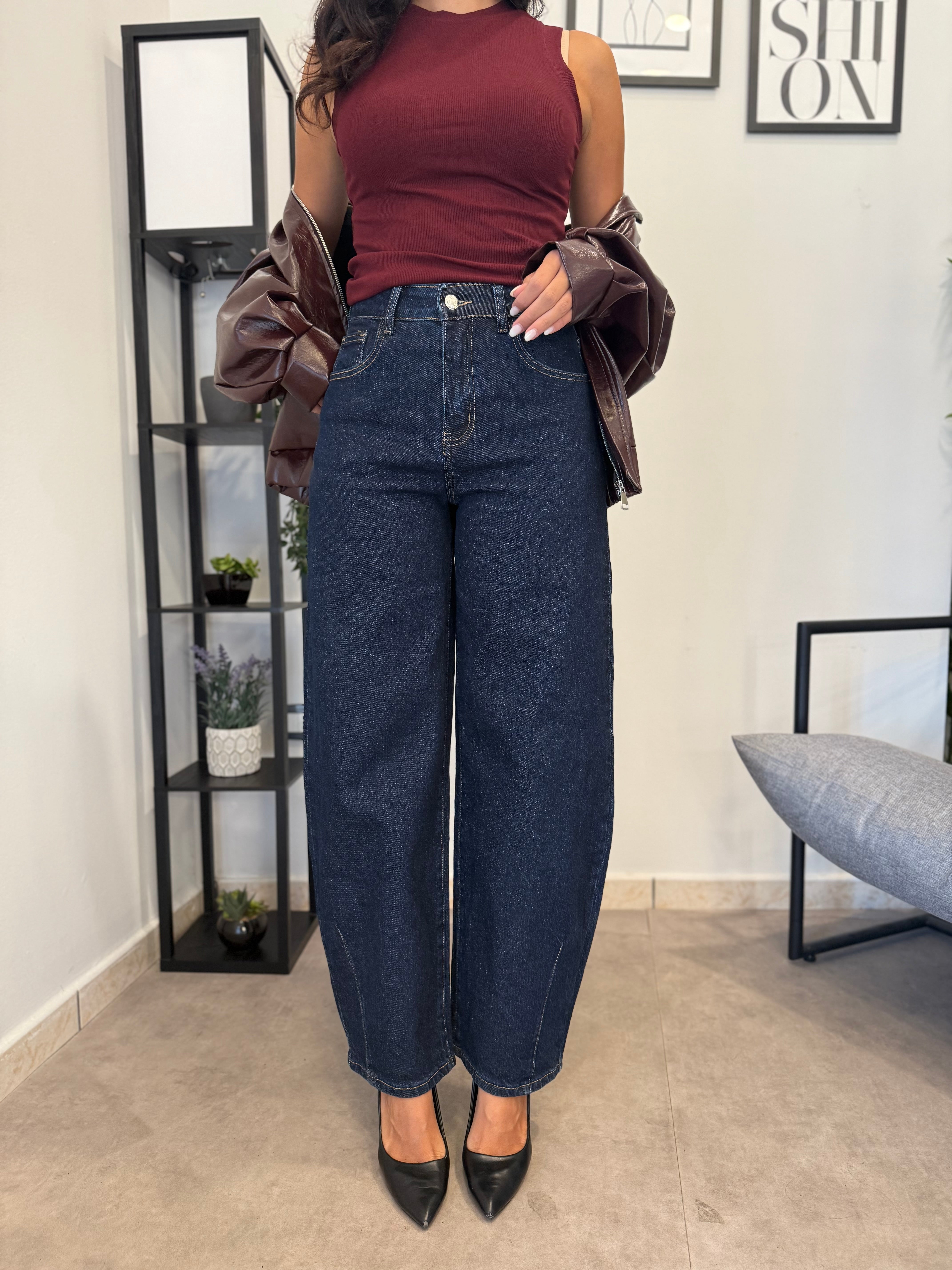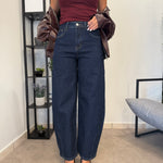 Jeans vita alta lavaggio scuro. Vita molto alta, tessuto poco elastico. Marta indossa tg XS