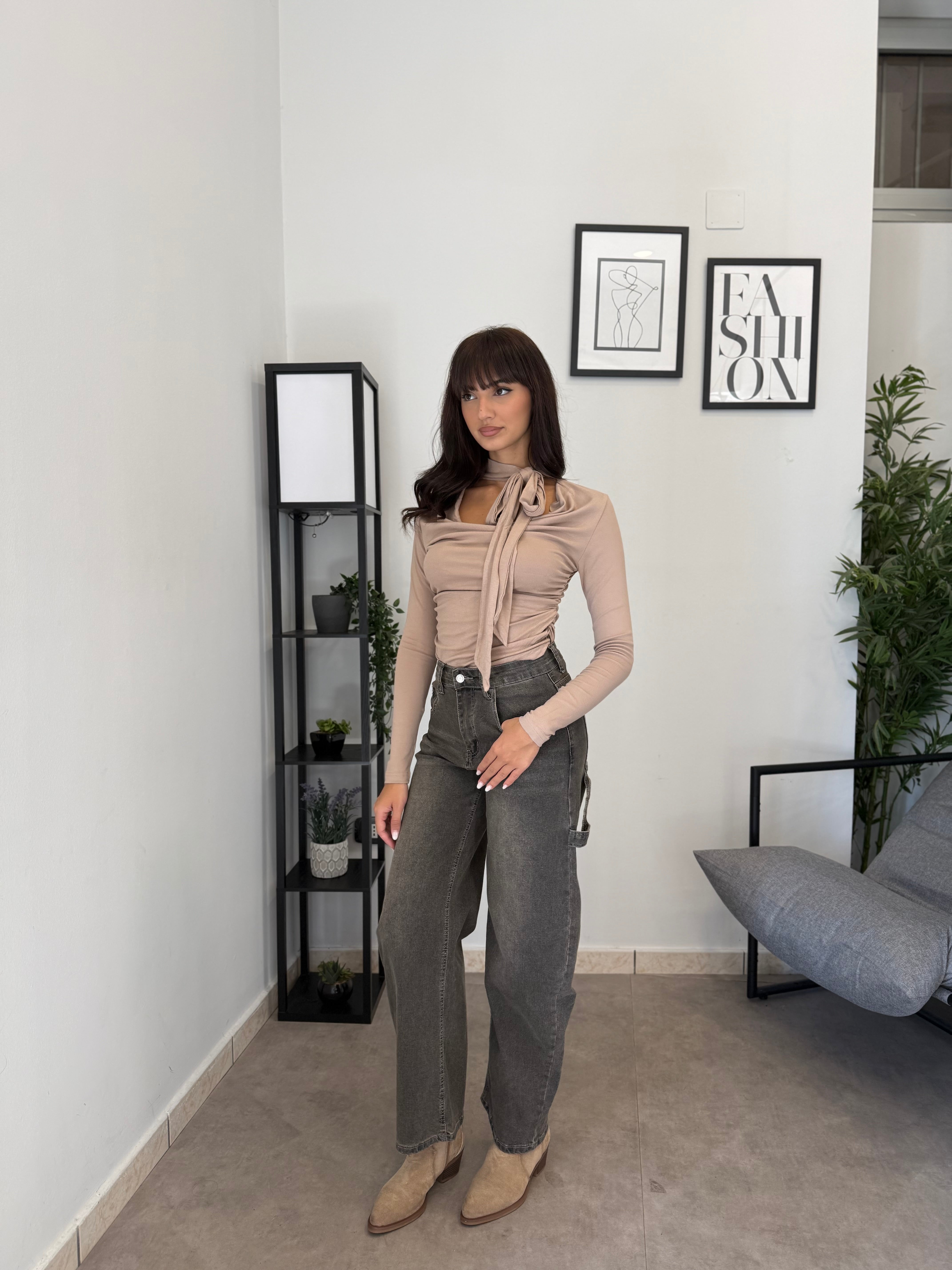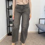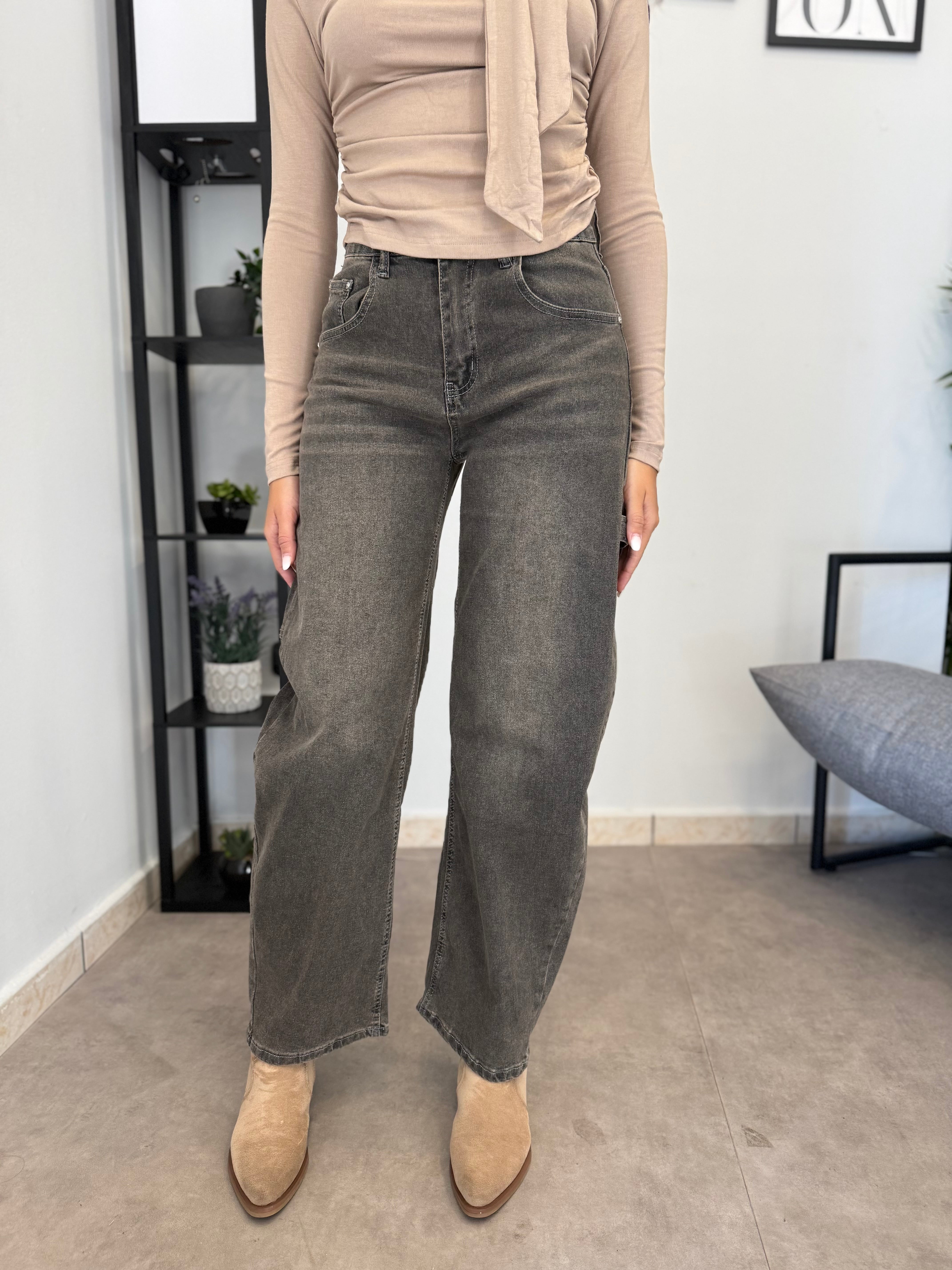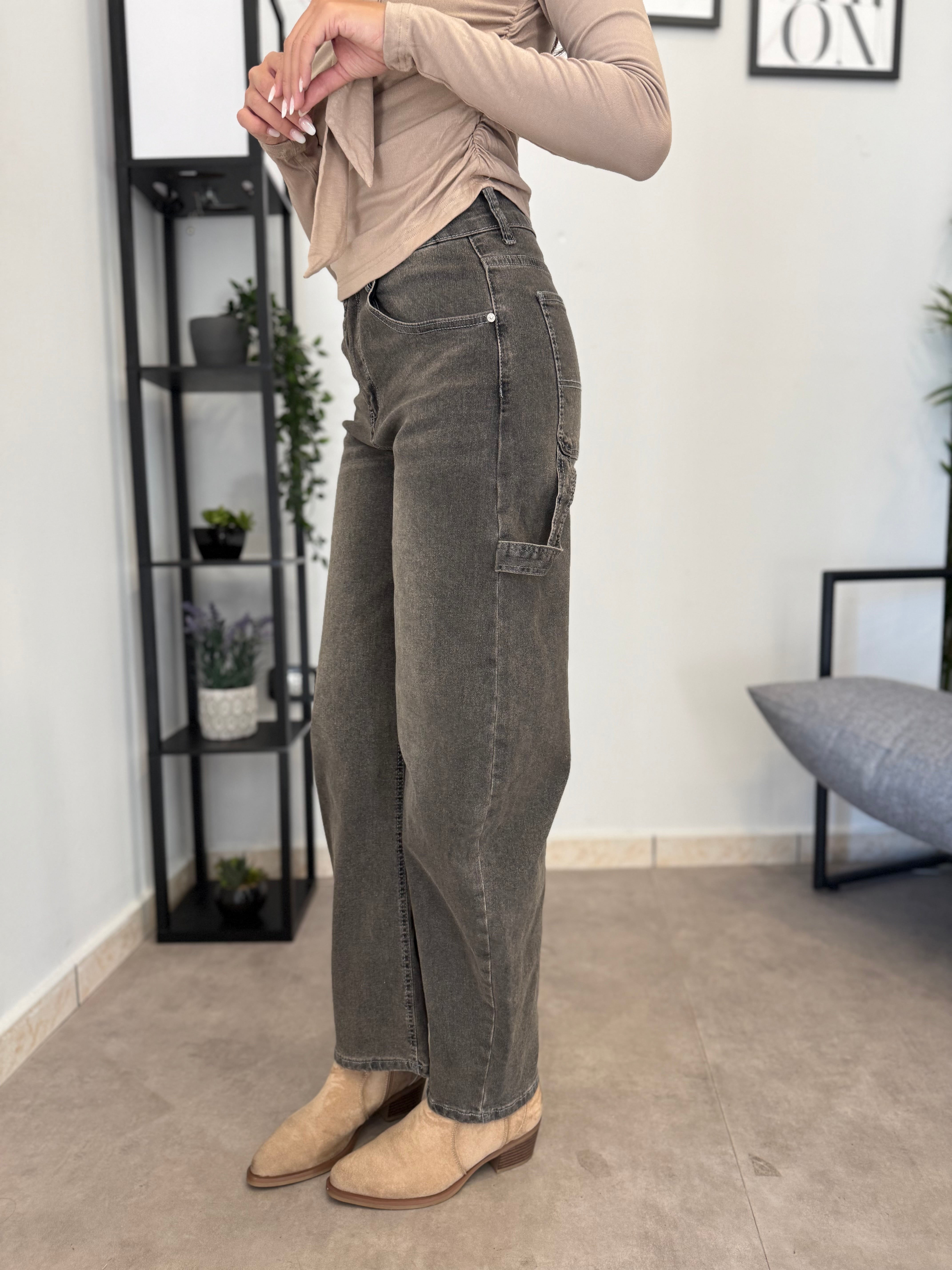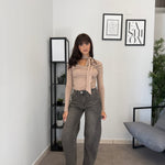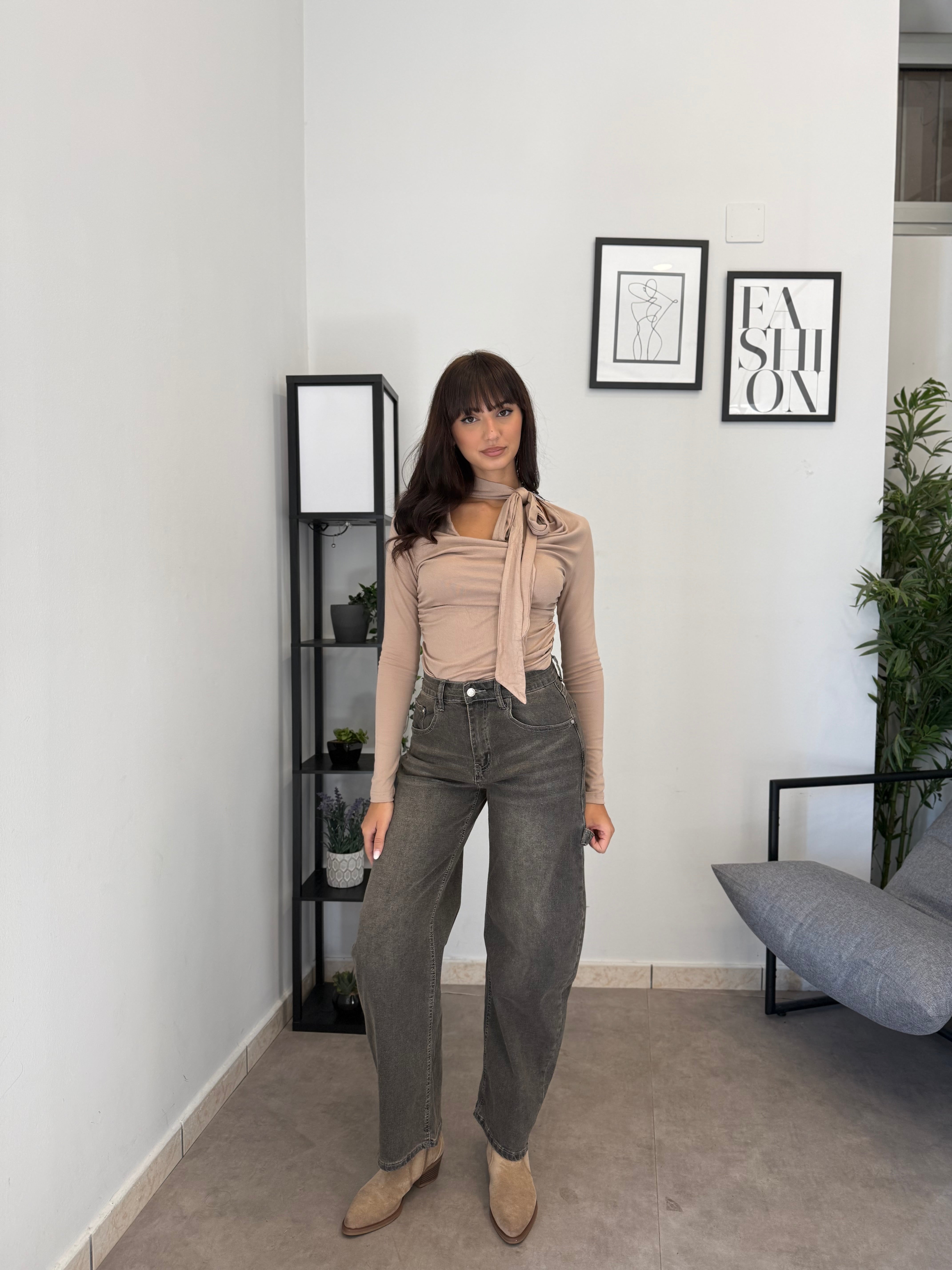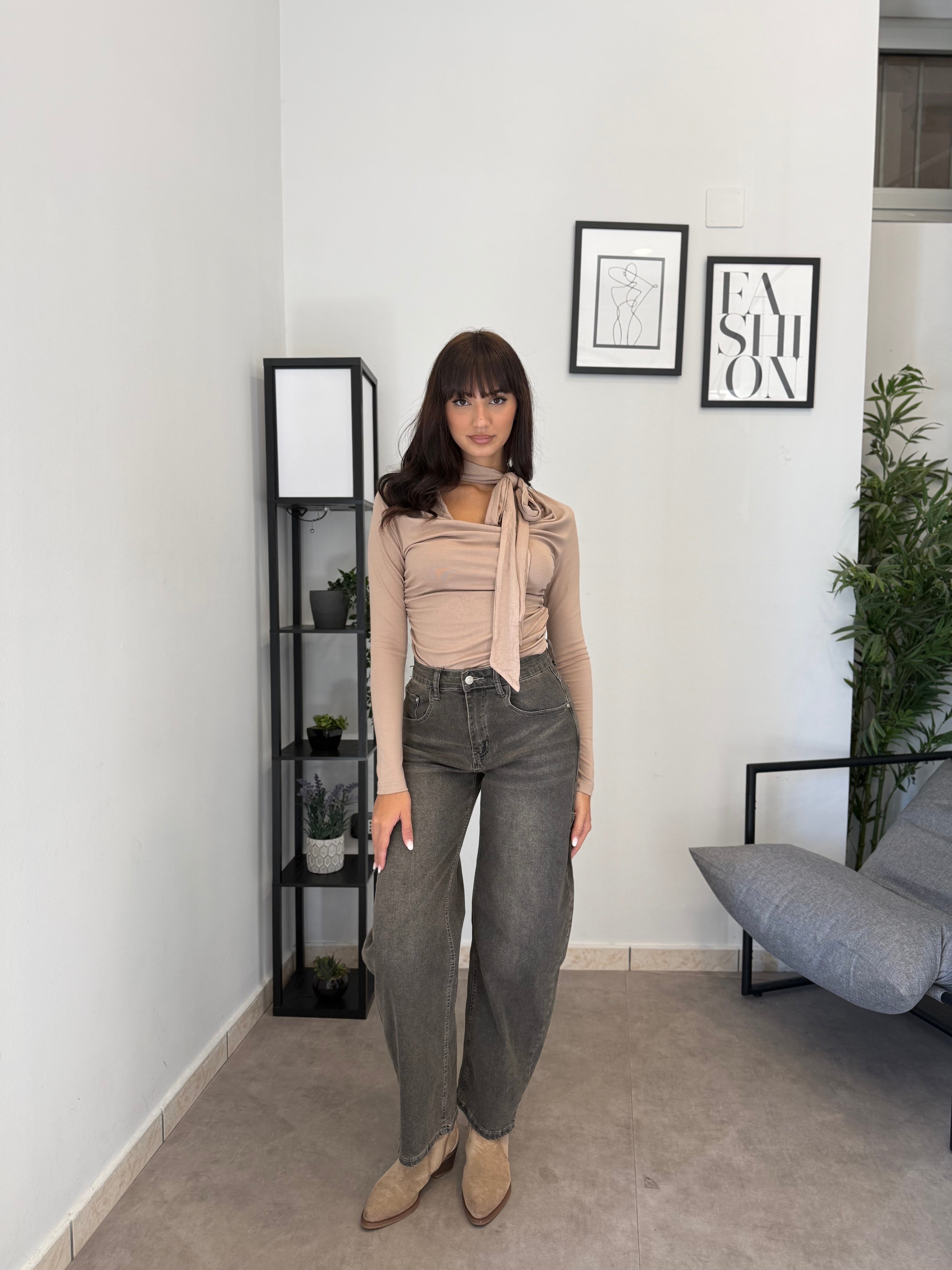 Jeans sabbiato sui toni del marrone, vita alta. Tessuto elastico