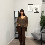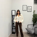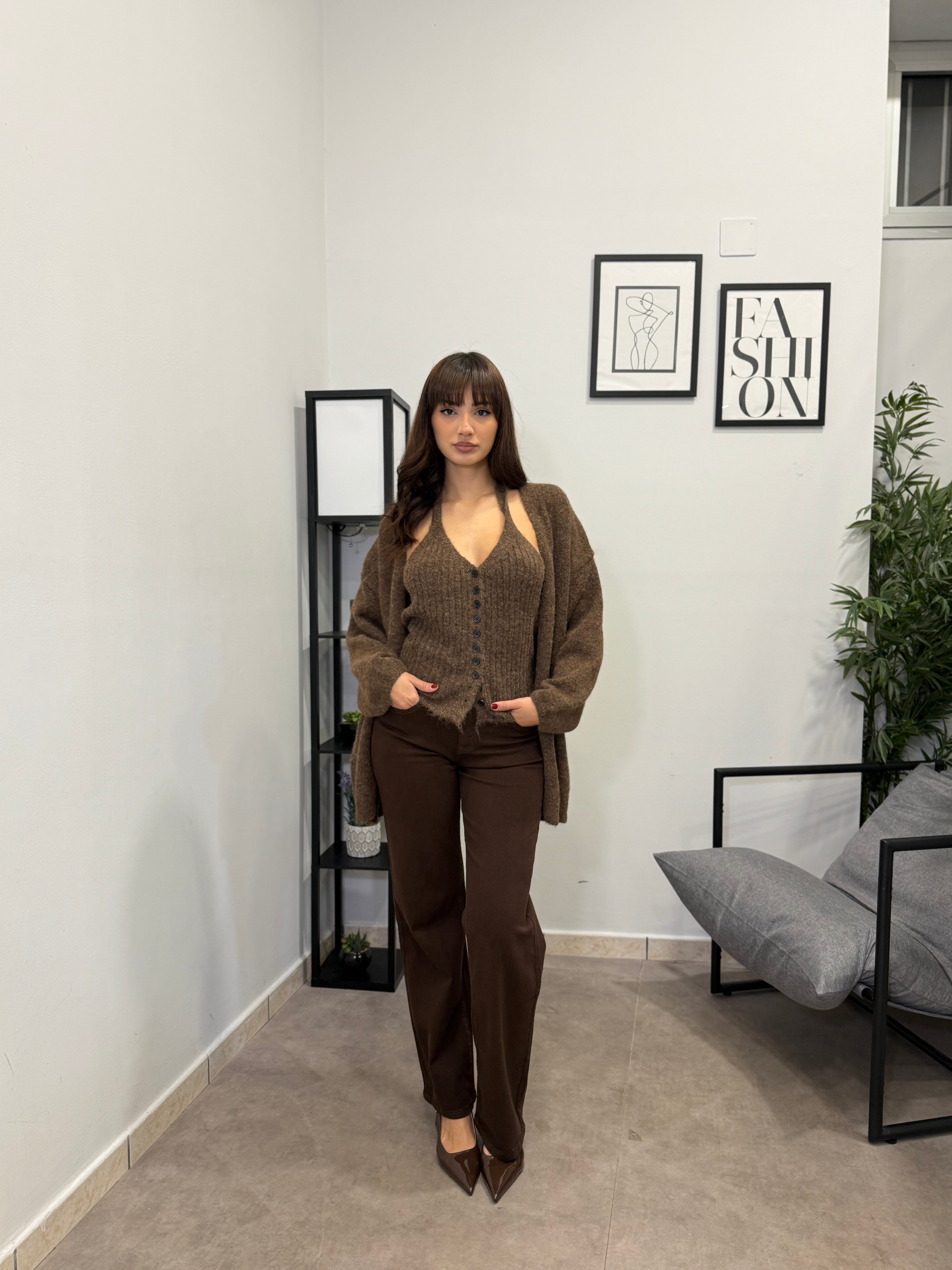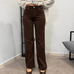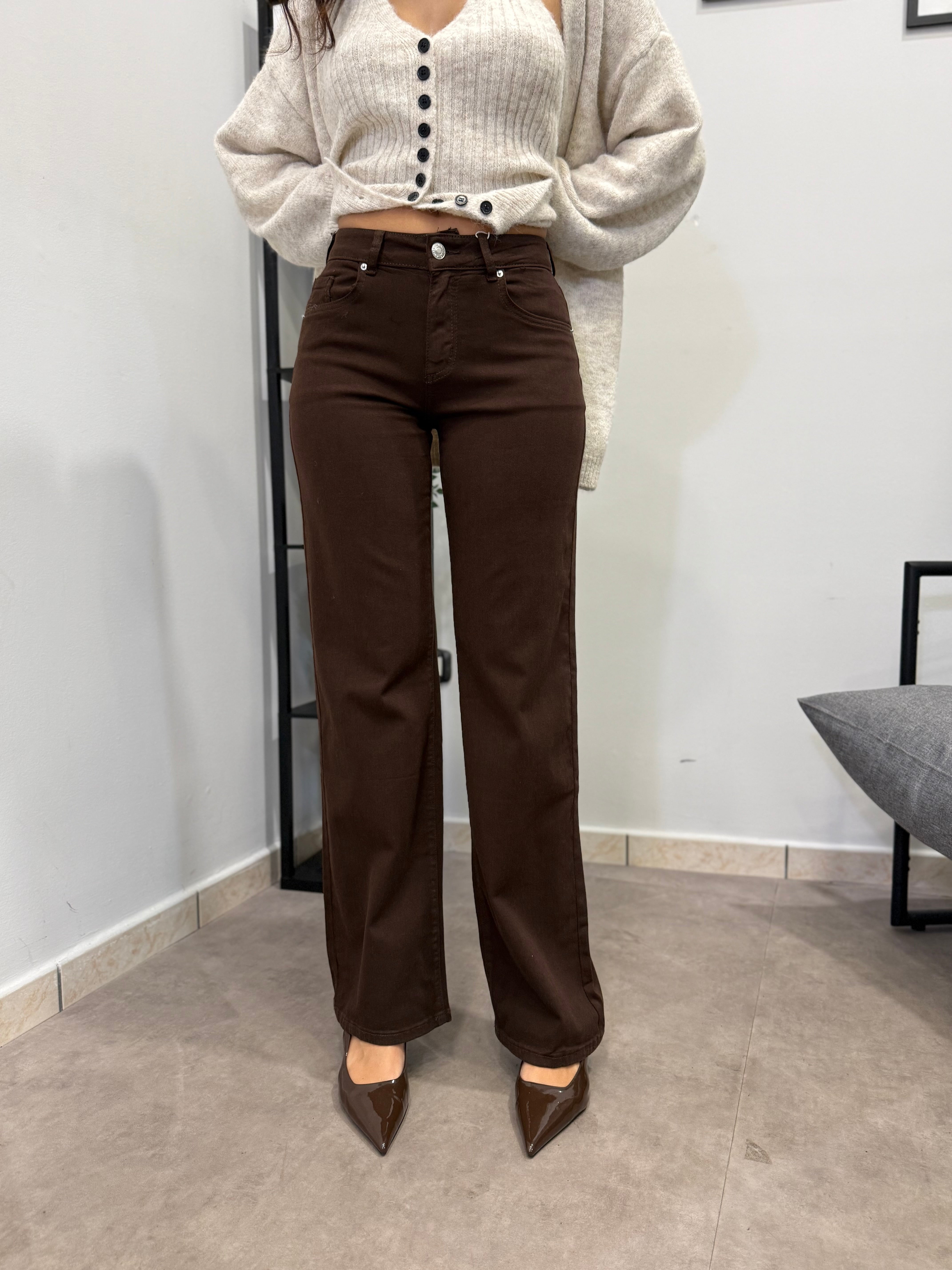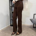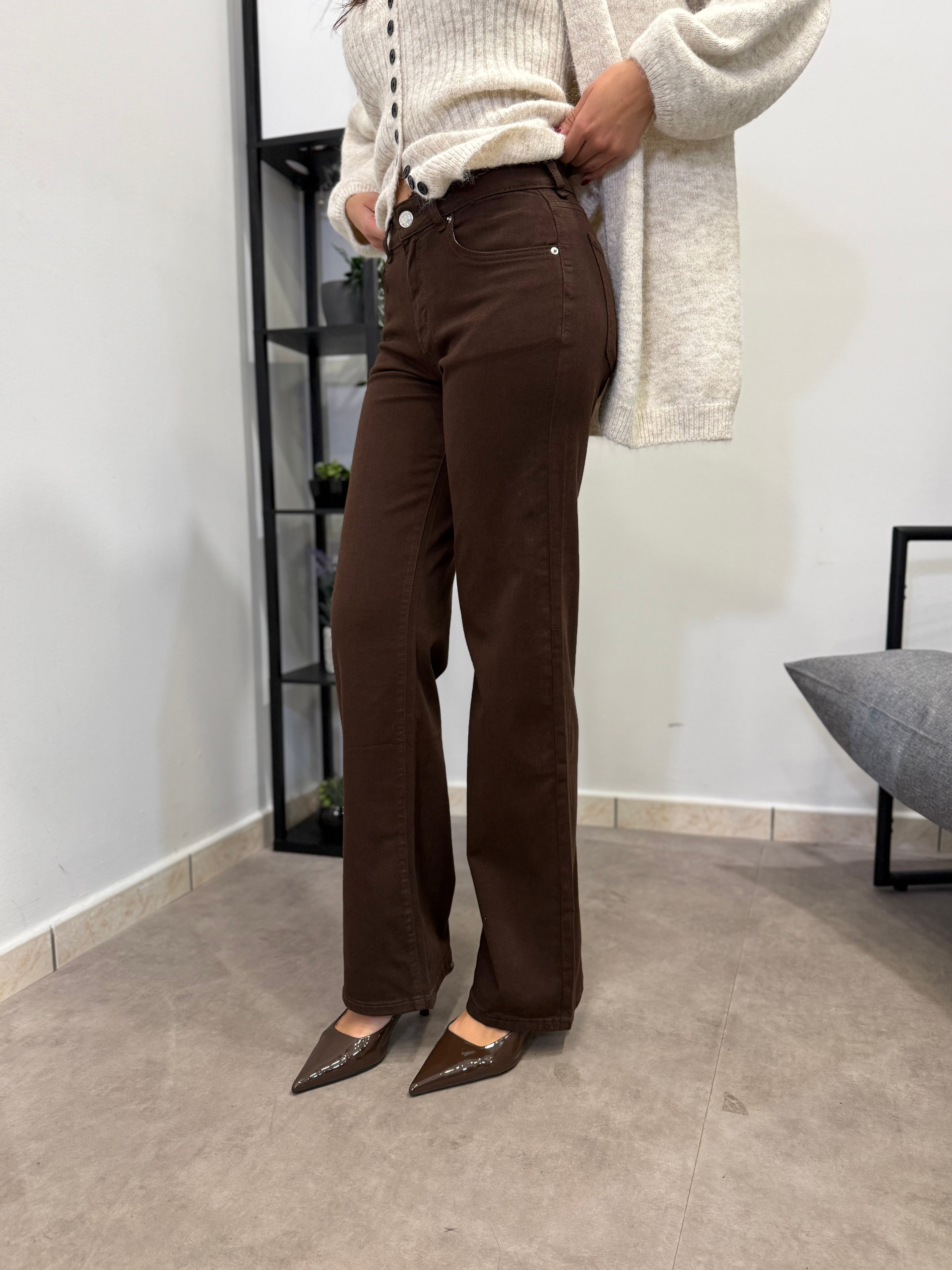 Jeans vita alta, lavaggio marrone. Tessuto elastico, Marta indossa tg XS/34eu