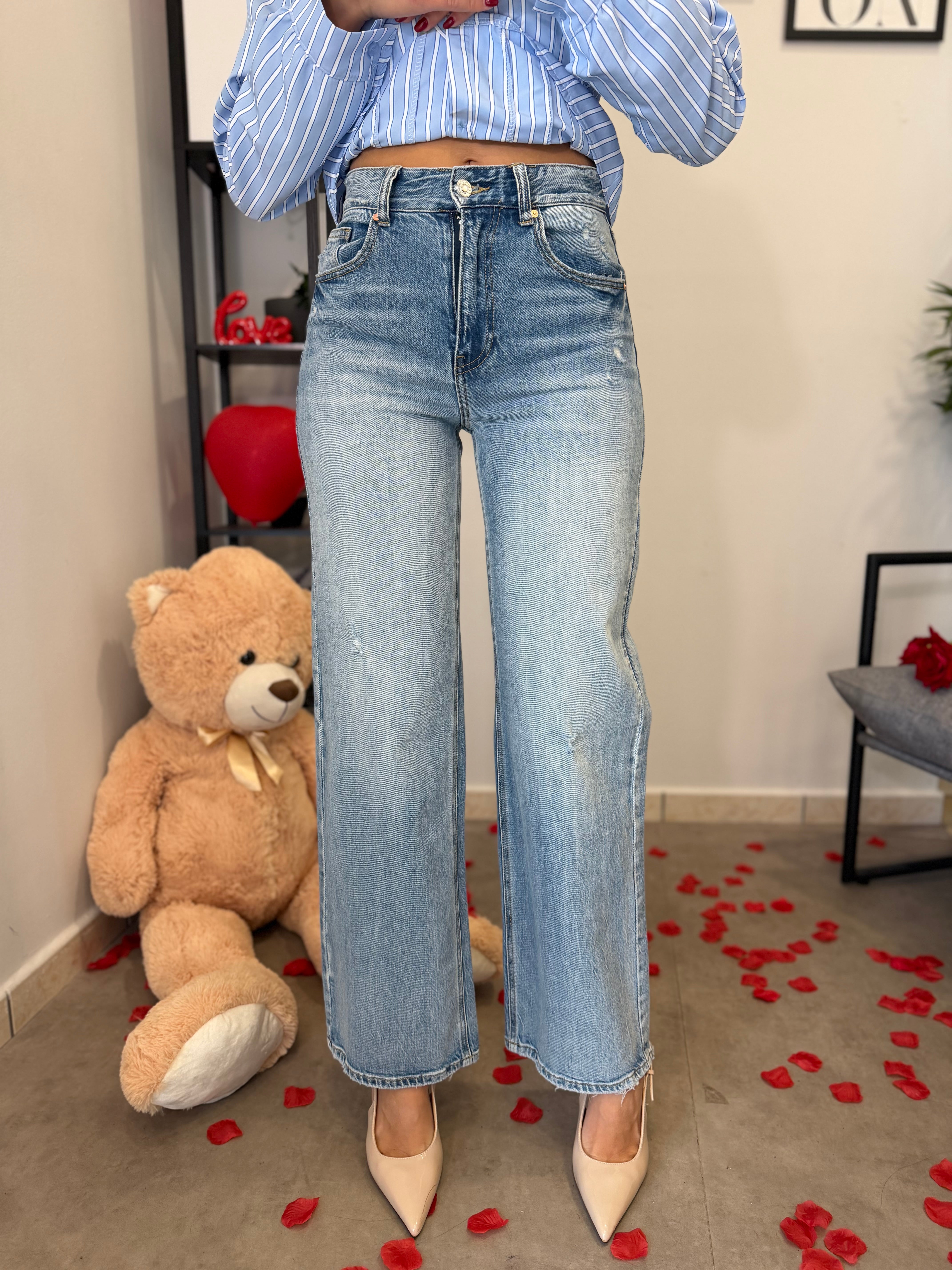 Jeans vita alta, lavaggio chiaro. Poco elastico, vestibilità regolare!