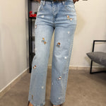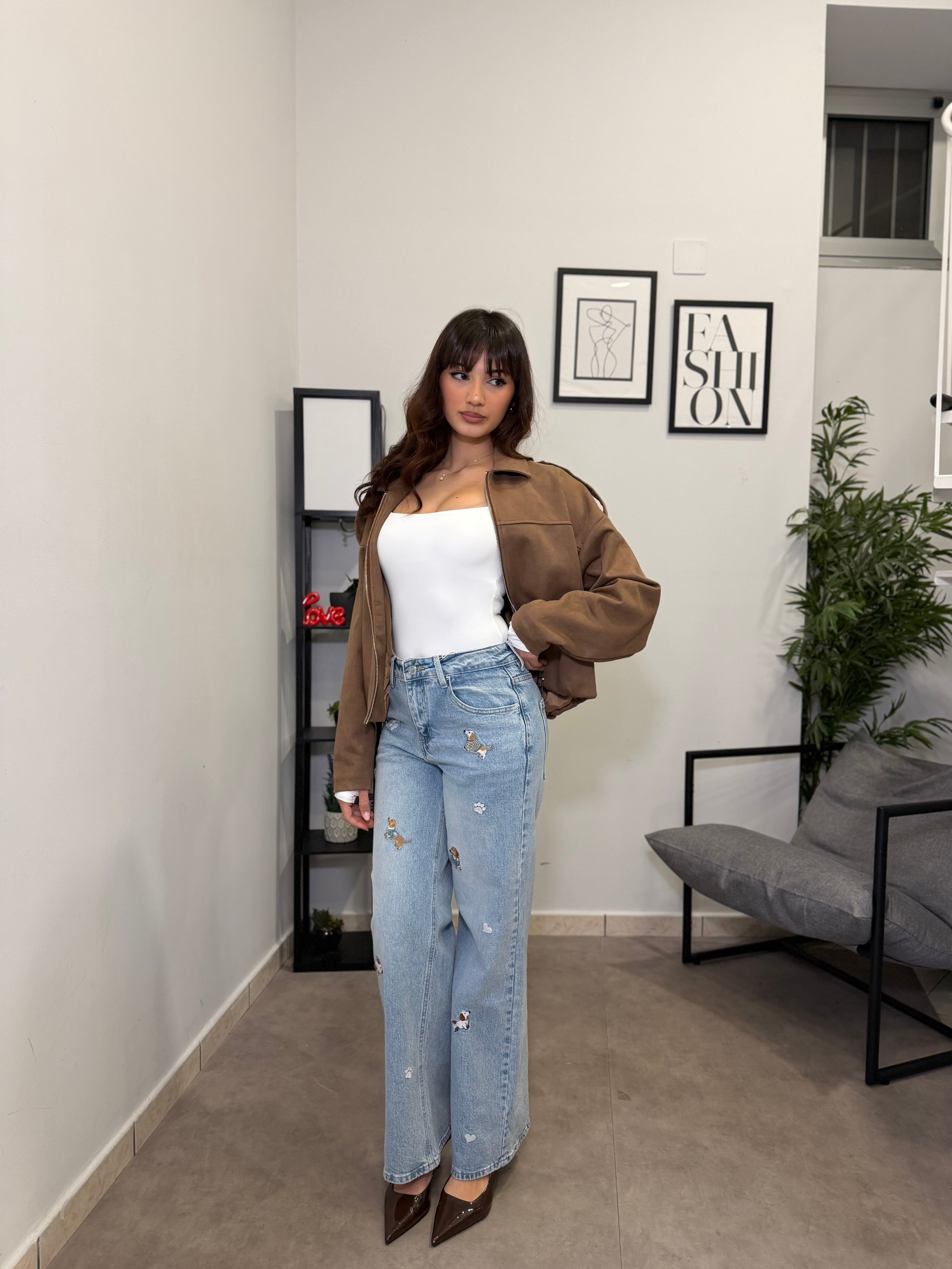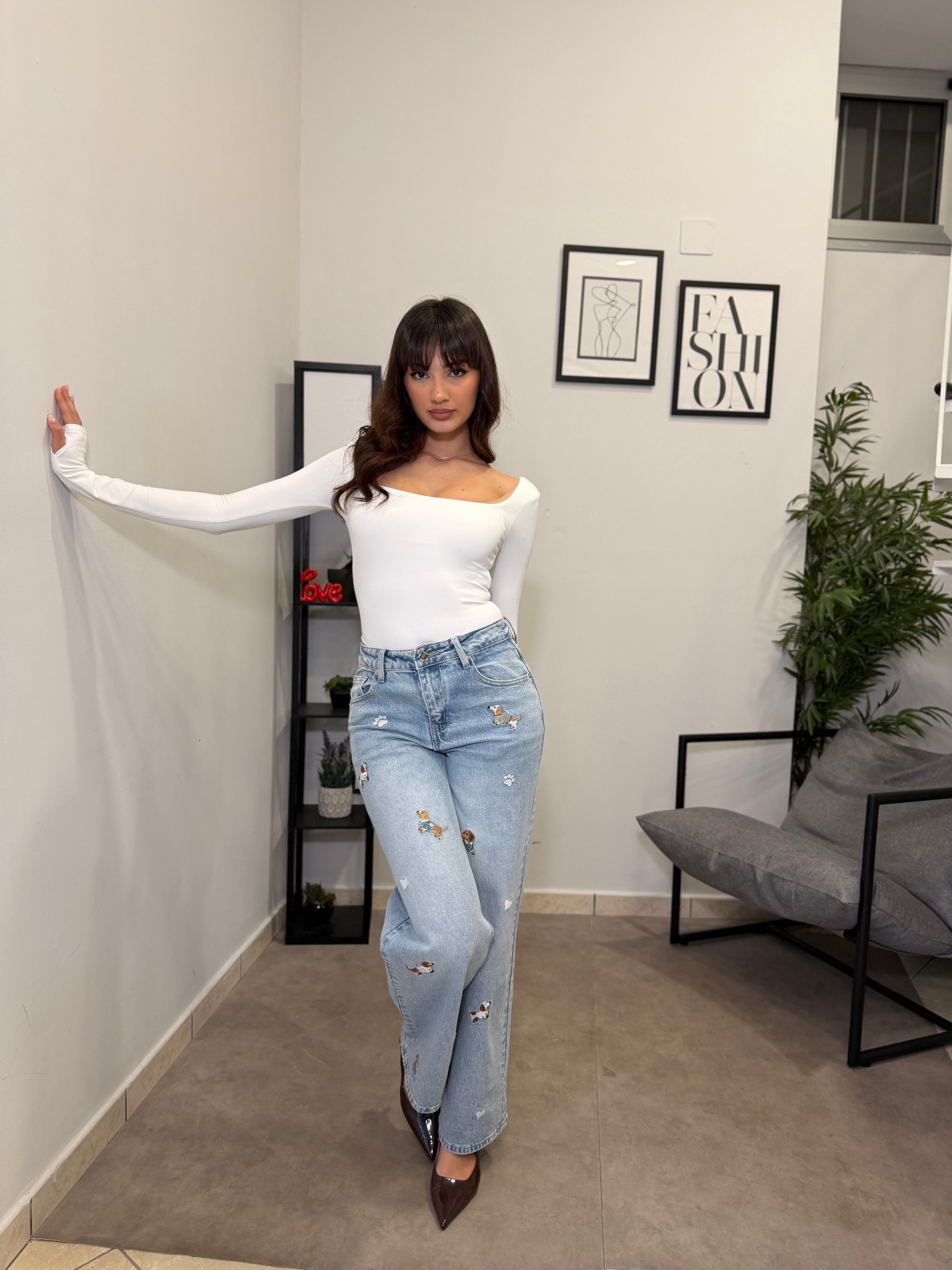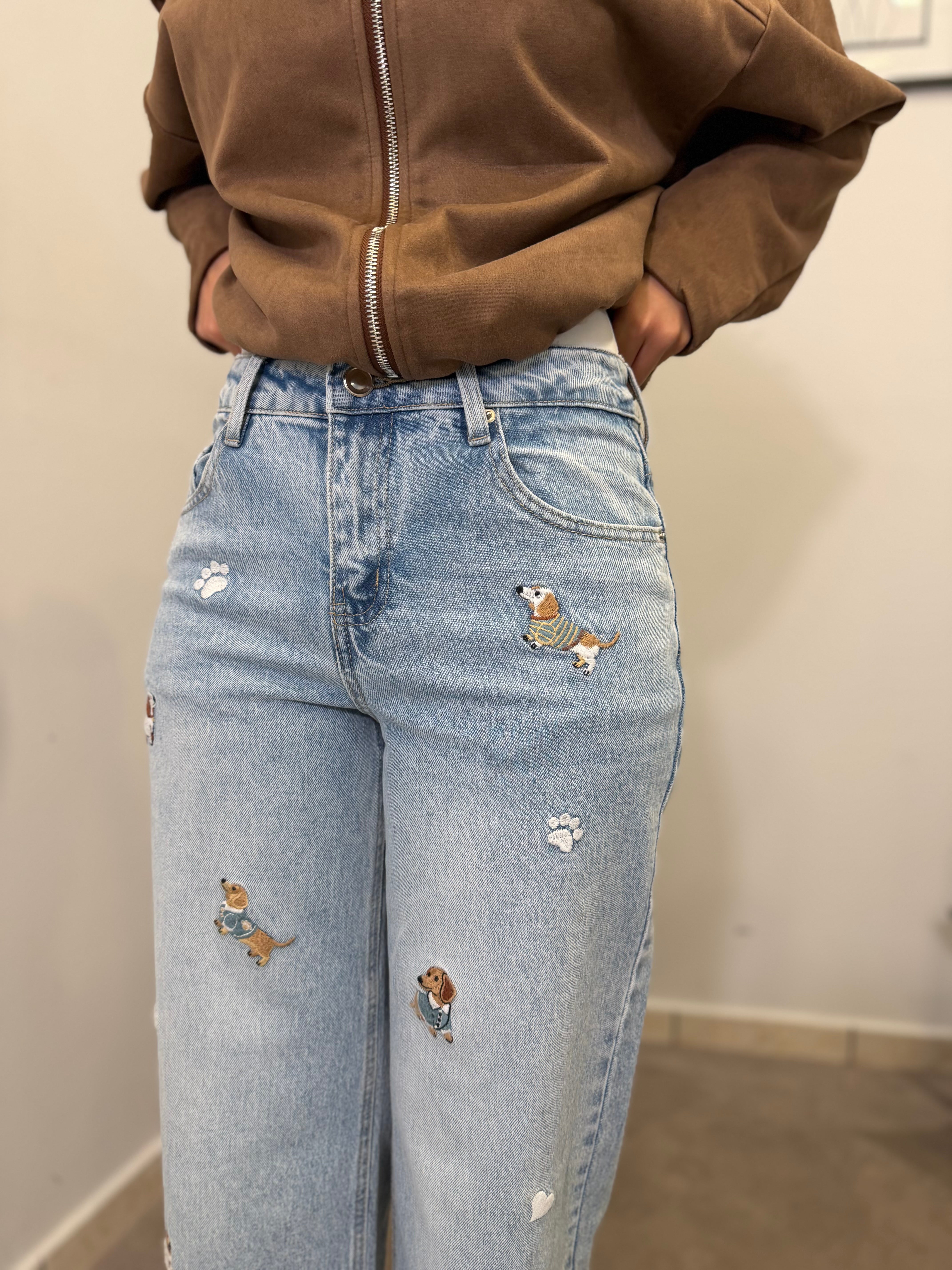Jeans Gamba dritta con ricamo applicato di bassotti. Tessuto fermo poco elastico, vita alta. Marta indossa tg S