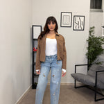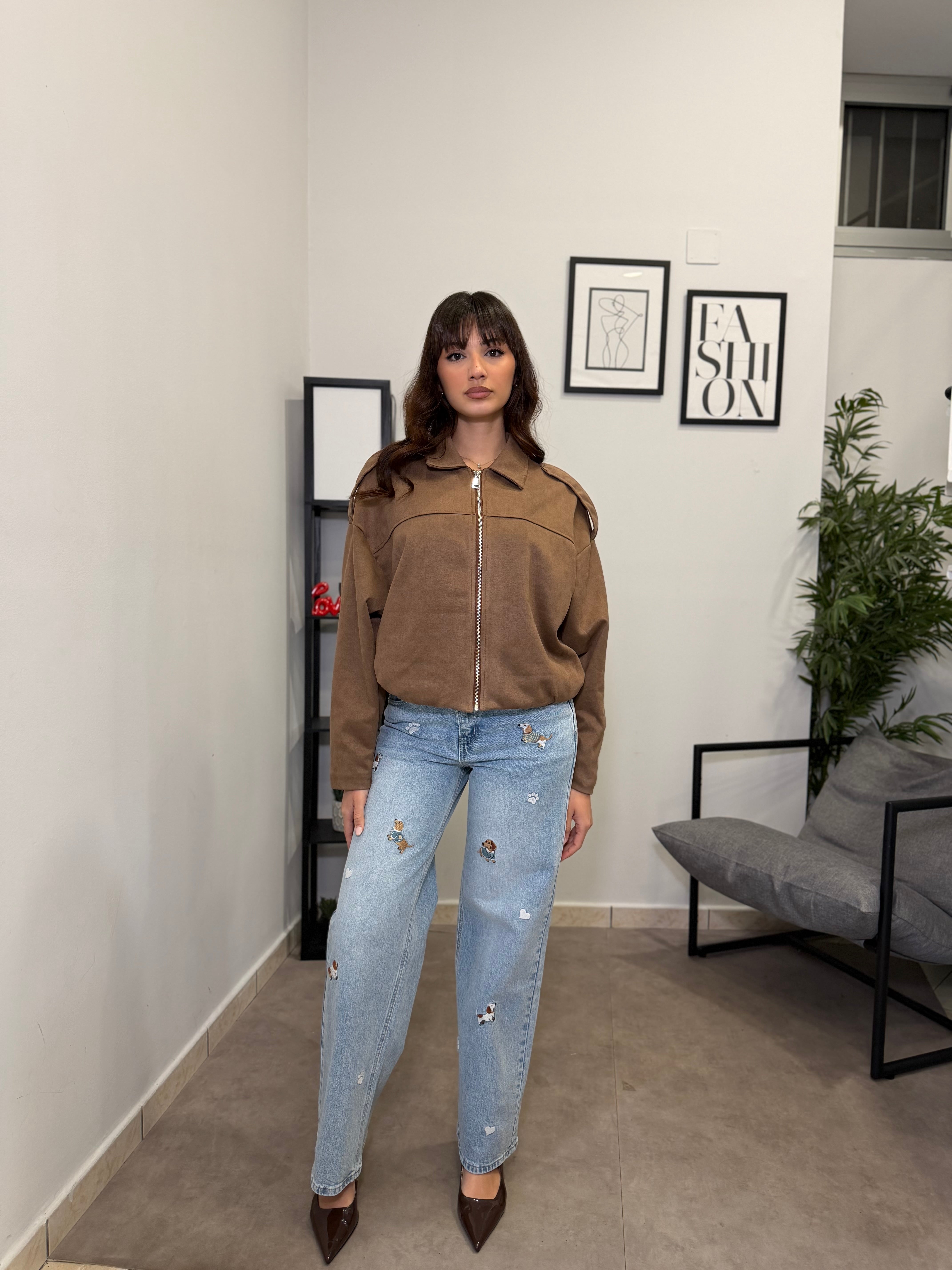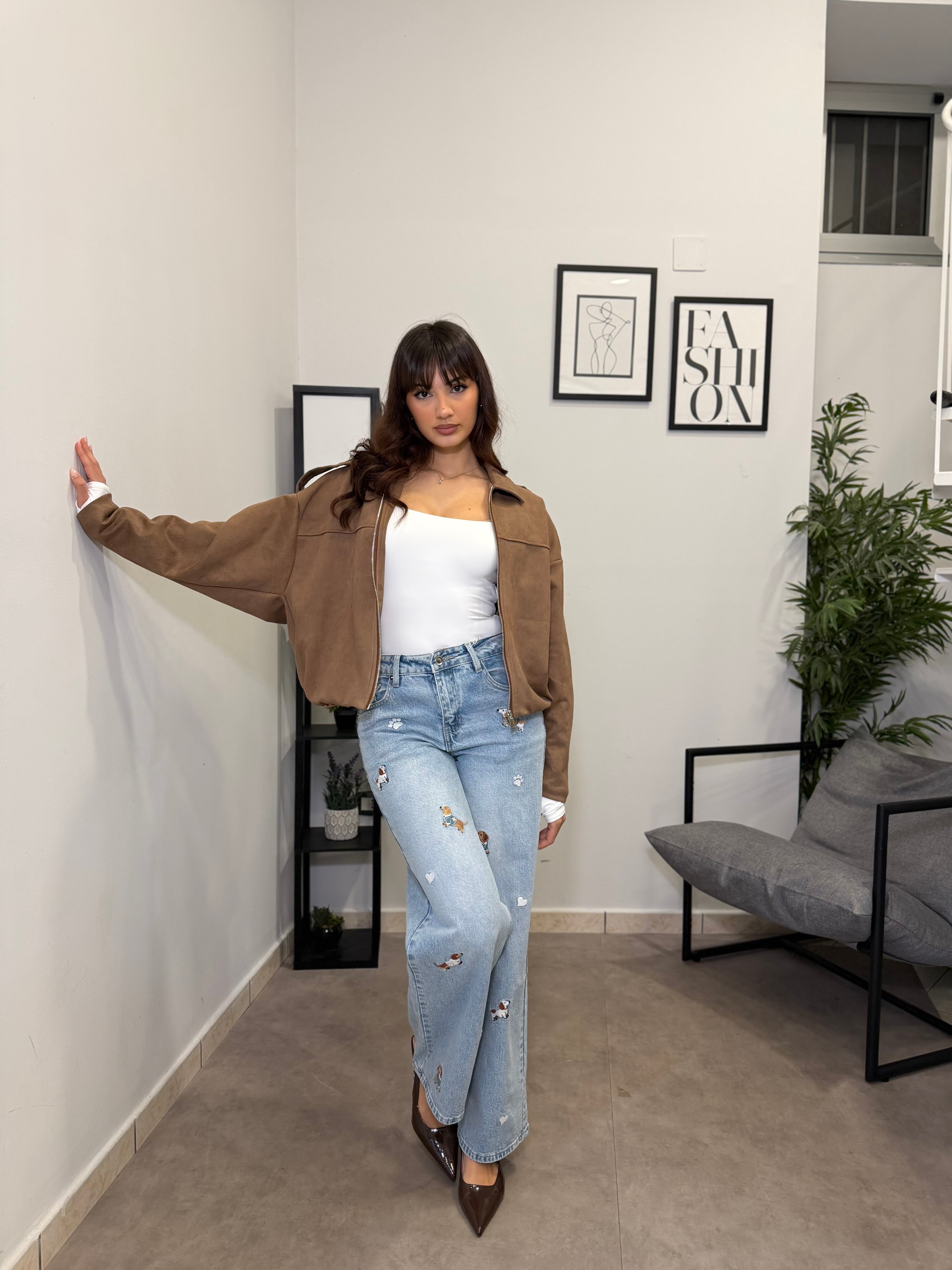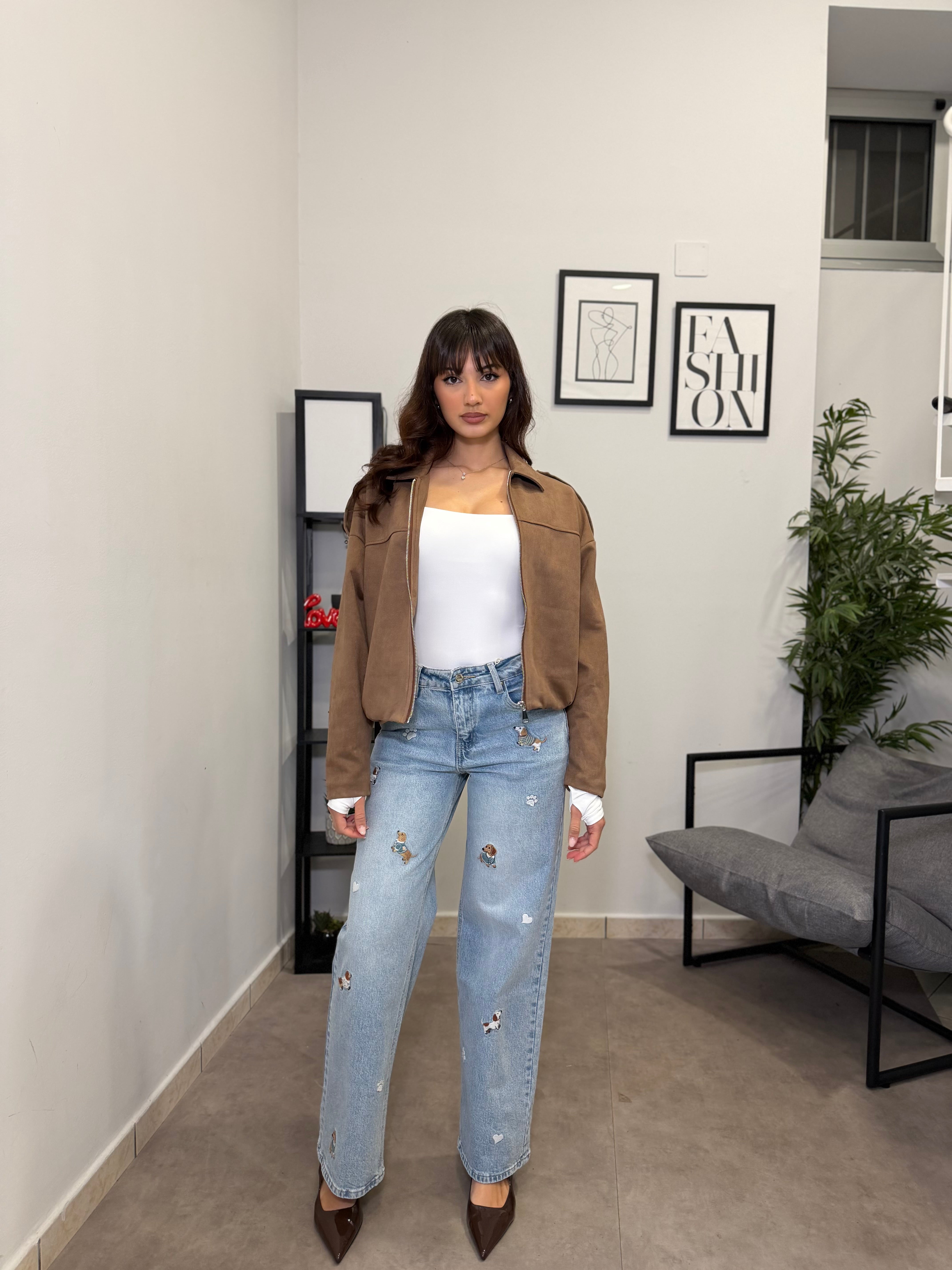 Jeans Gamba dritta con ricamo applicato di bassotti. Tessuto fermo poco elastico, vita alta. Marta indossa tg S