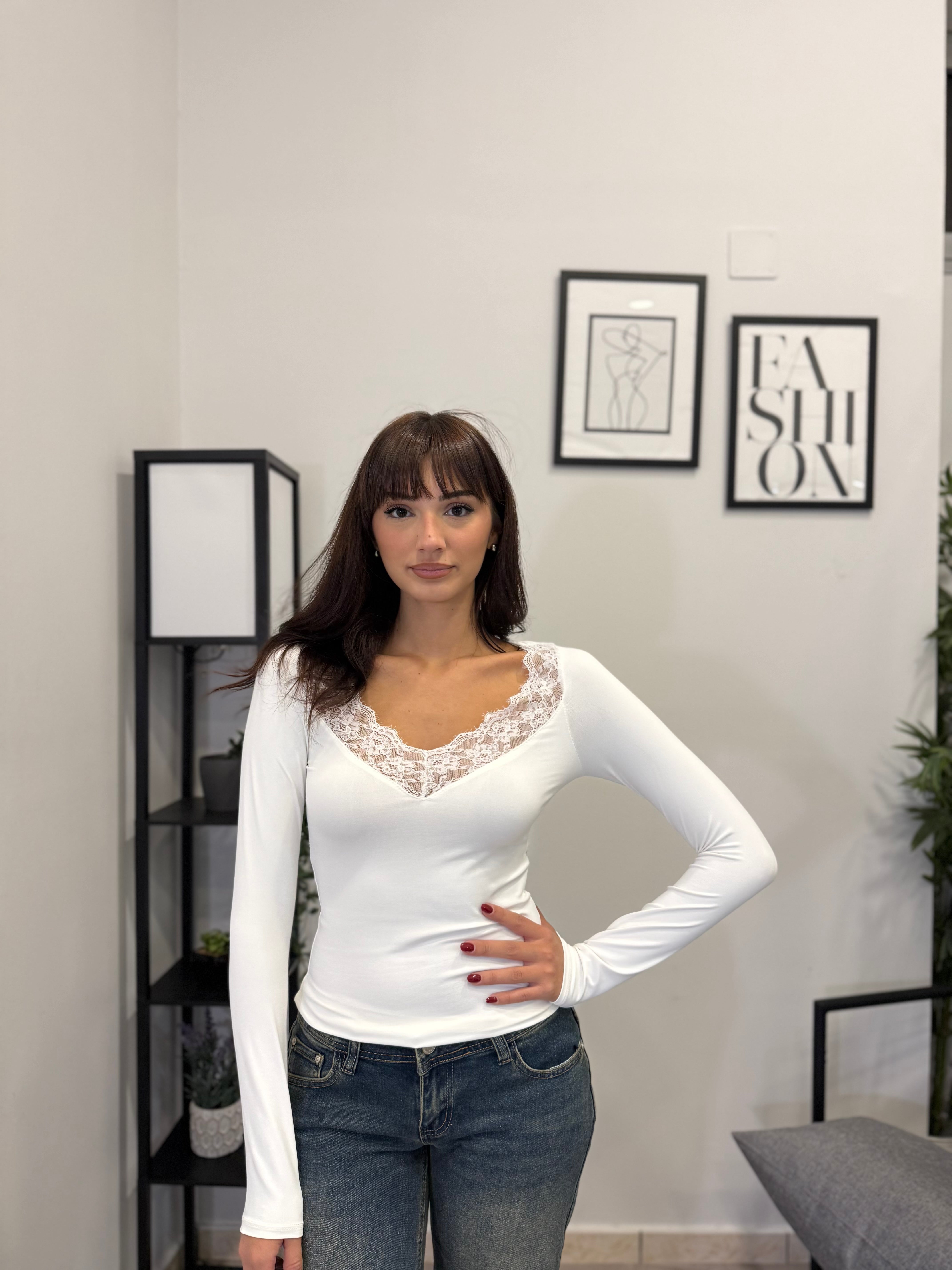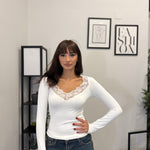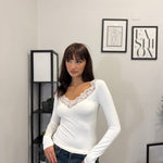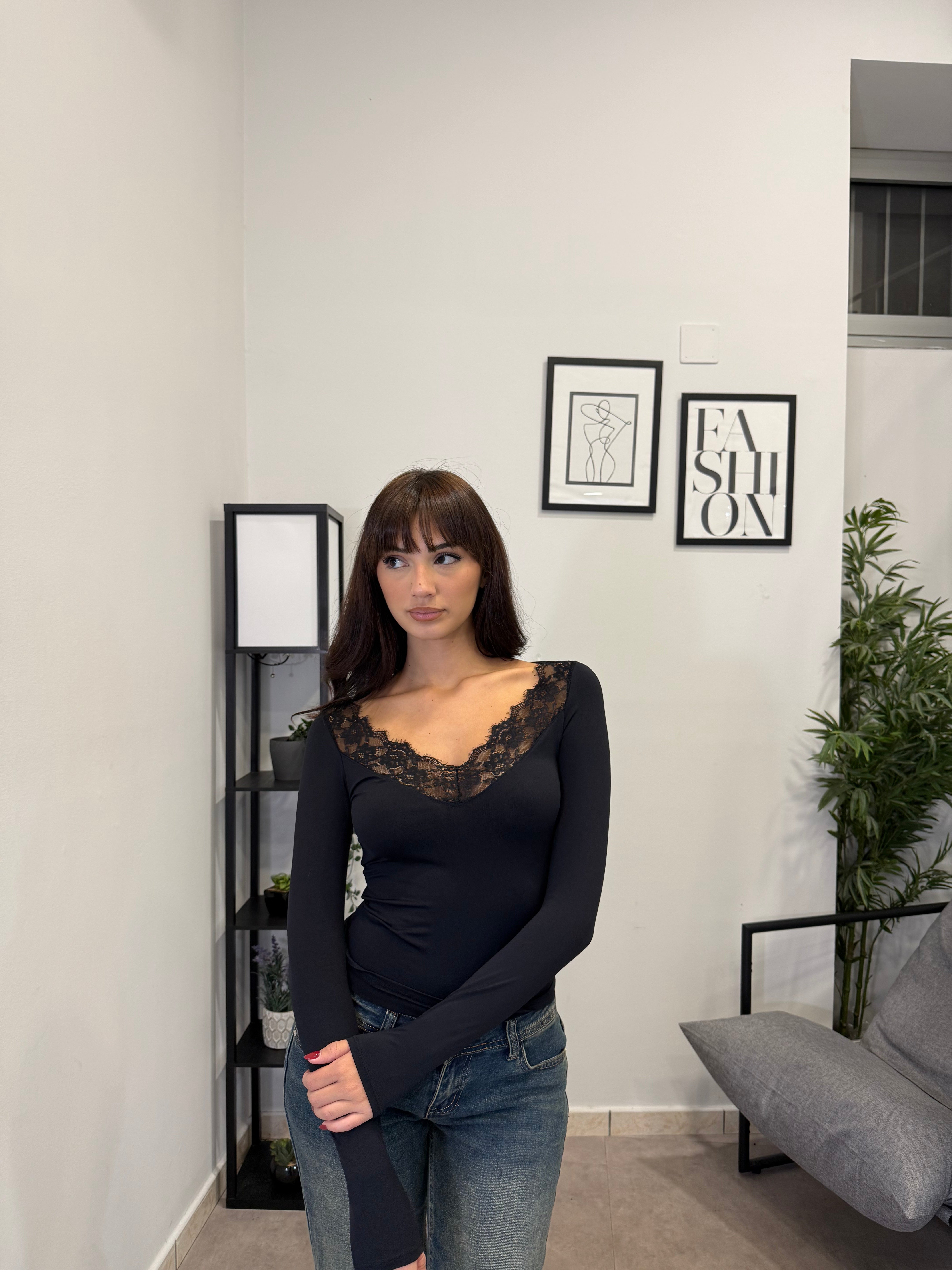 Maglia in licra con applicazioni in pizzo. Tessuto elasticizzato. Veste bene dalla S alla L