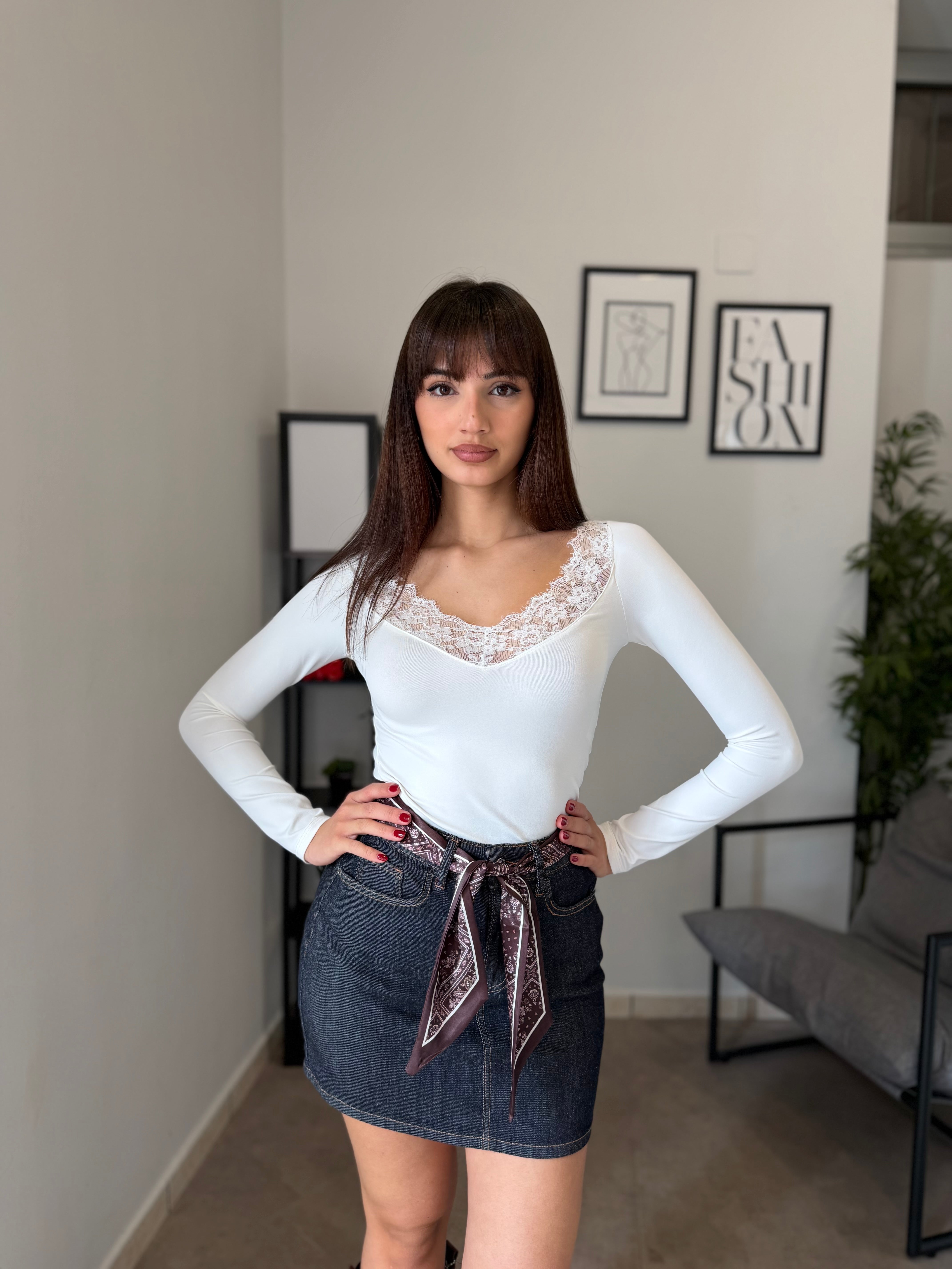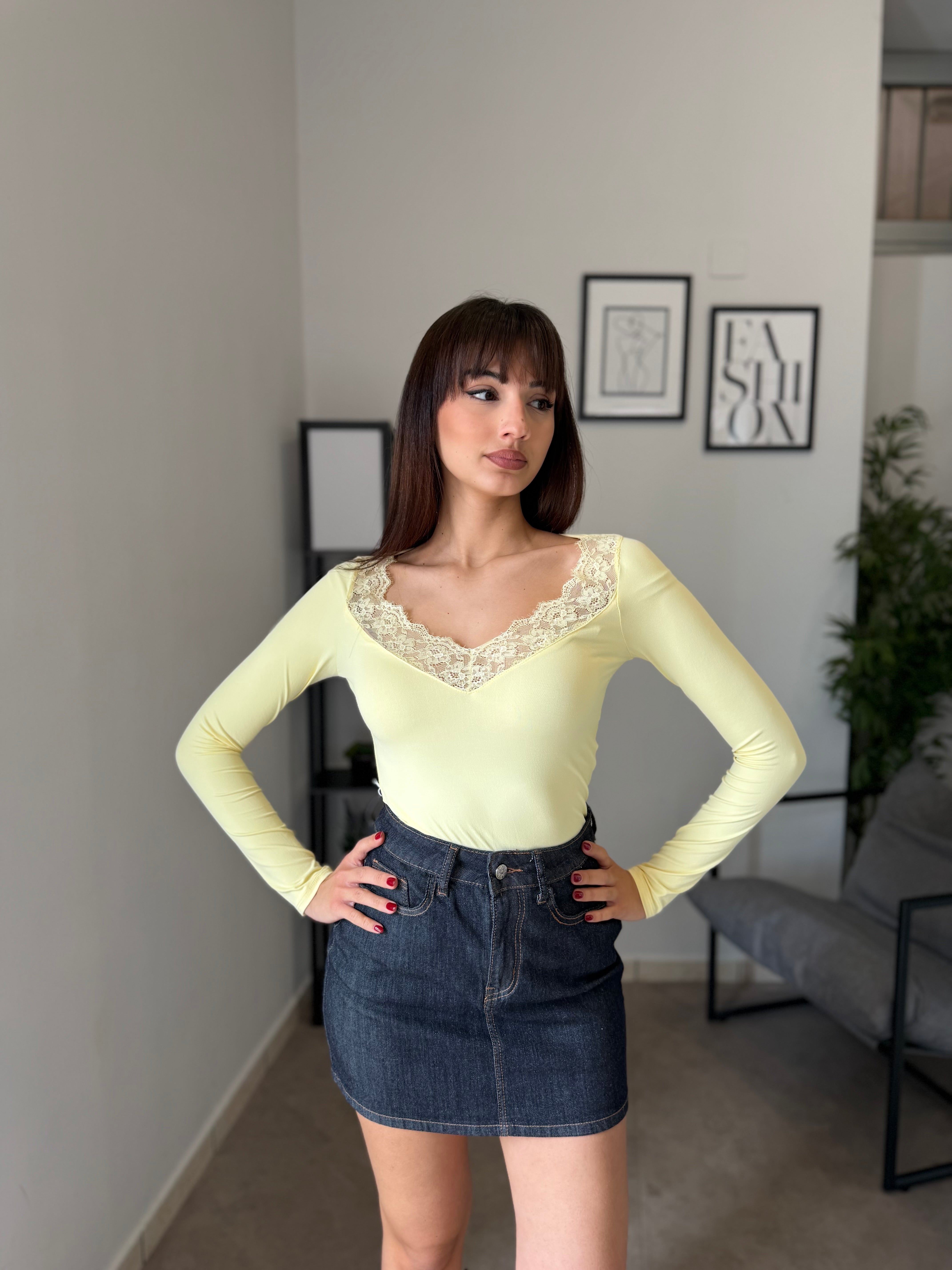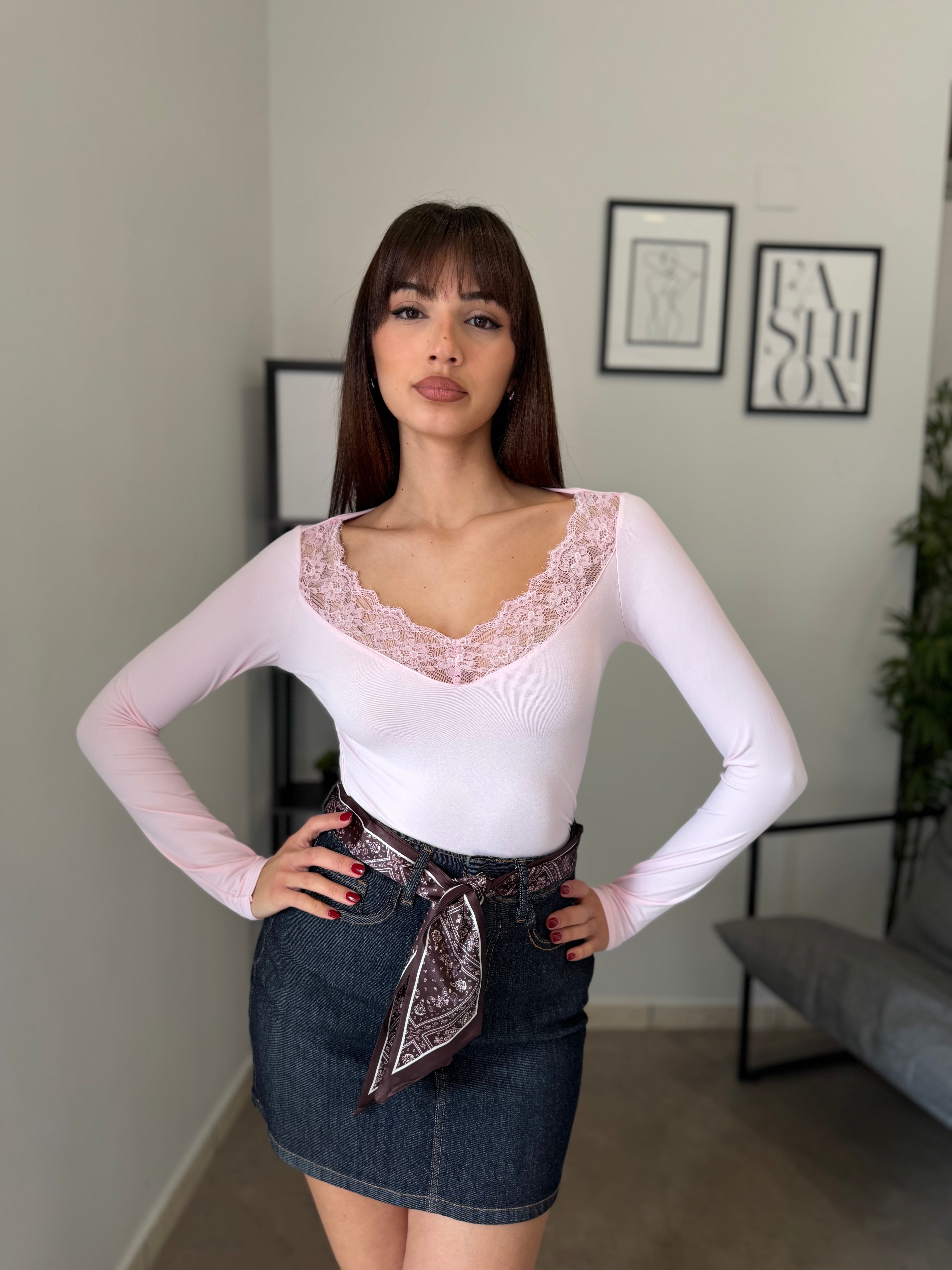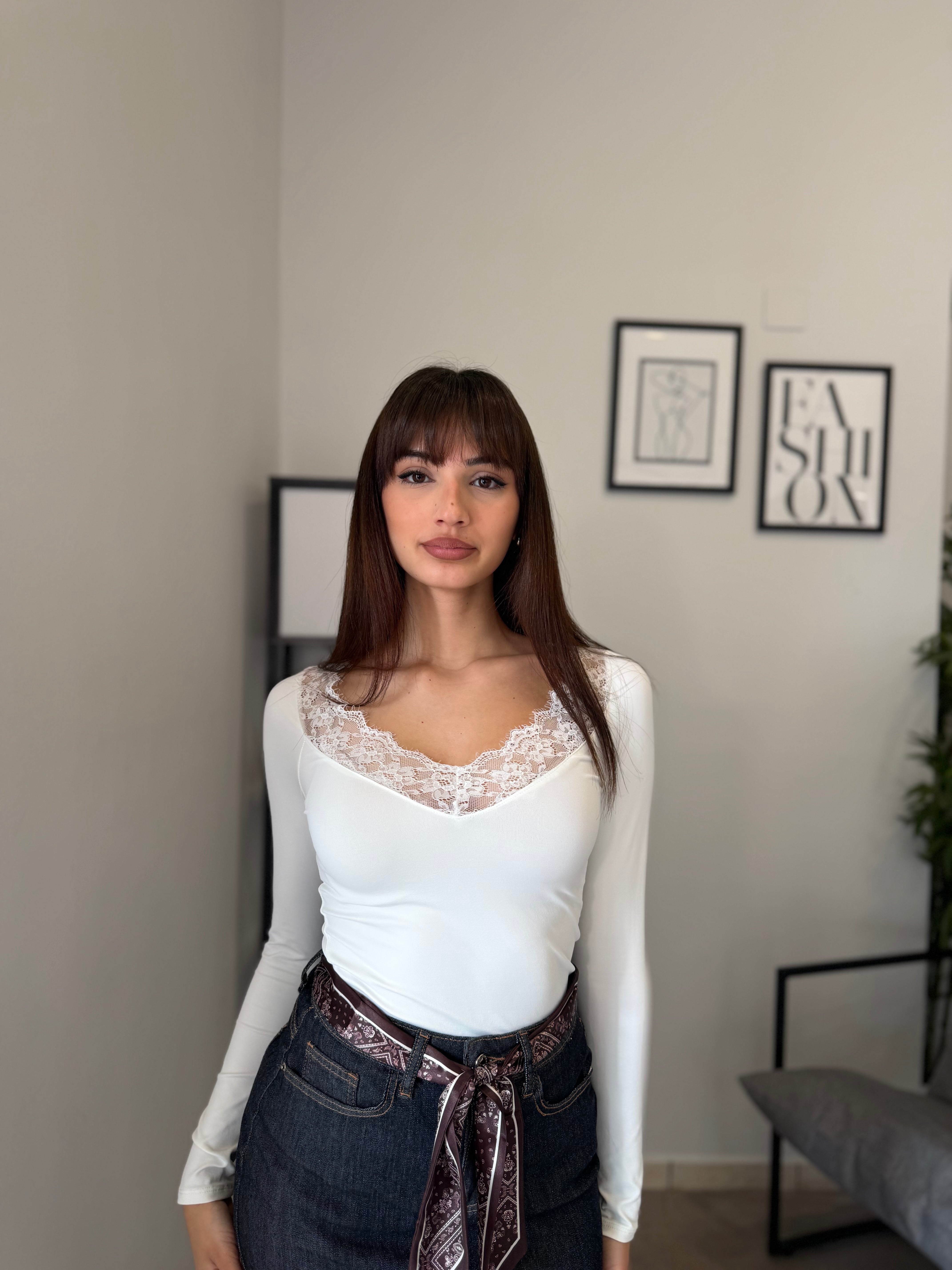 Maglia in licra con pizzo applicato sullo scollo! Veste bene dalla XS alla L