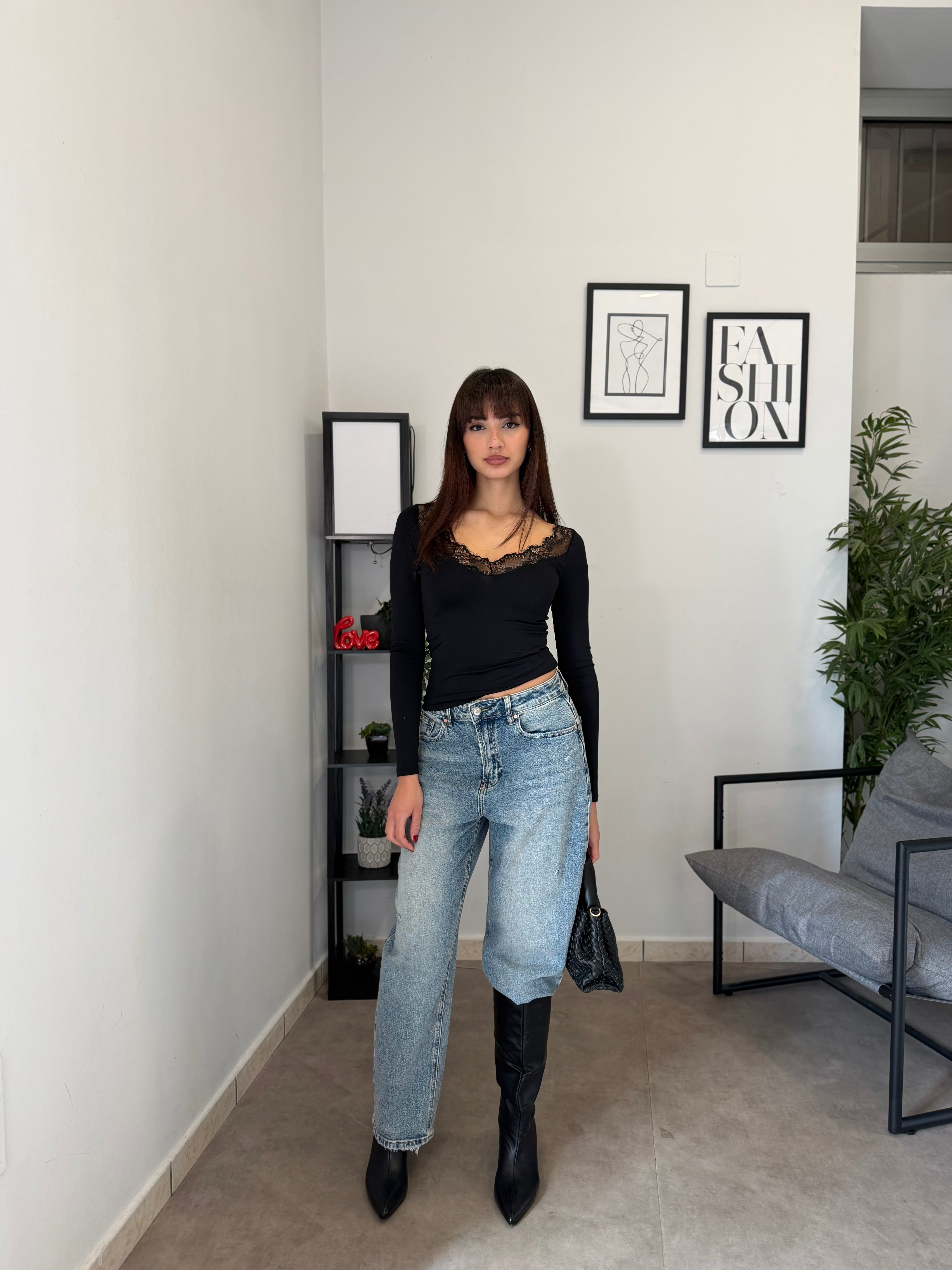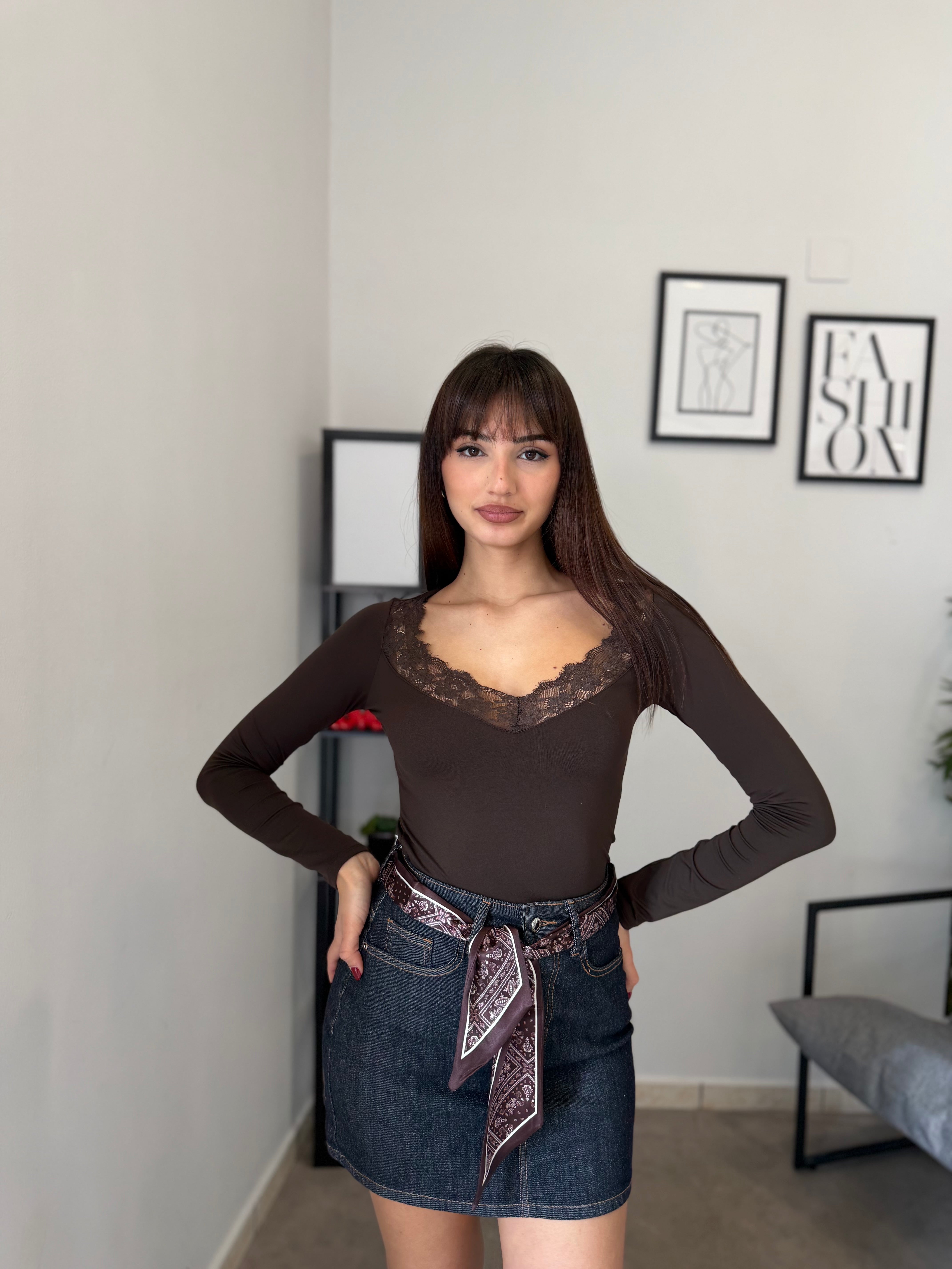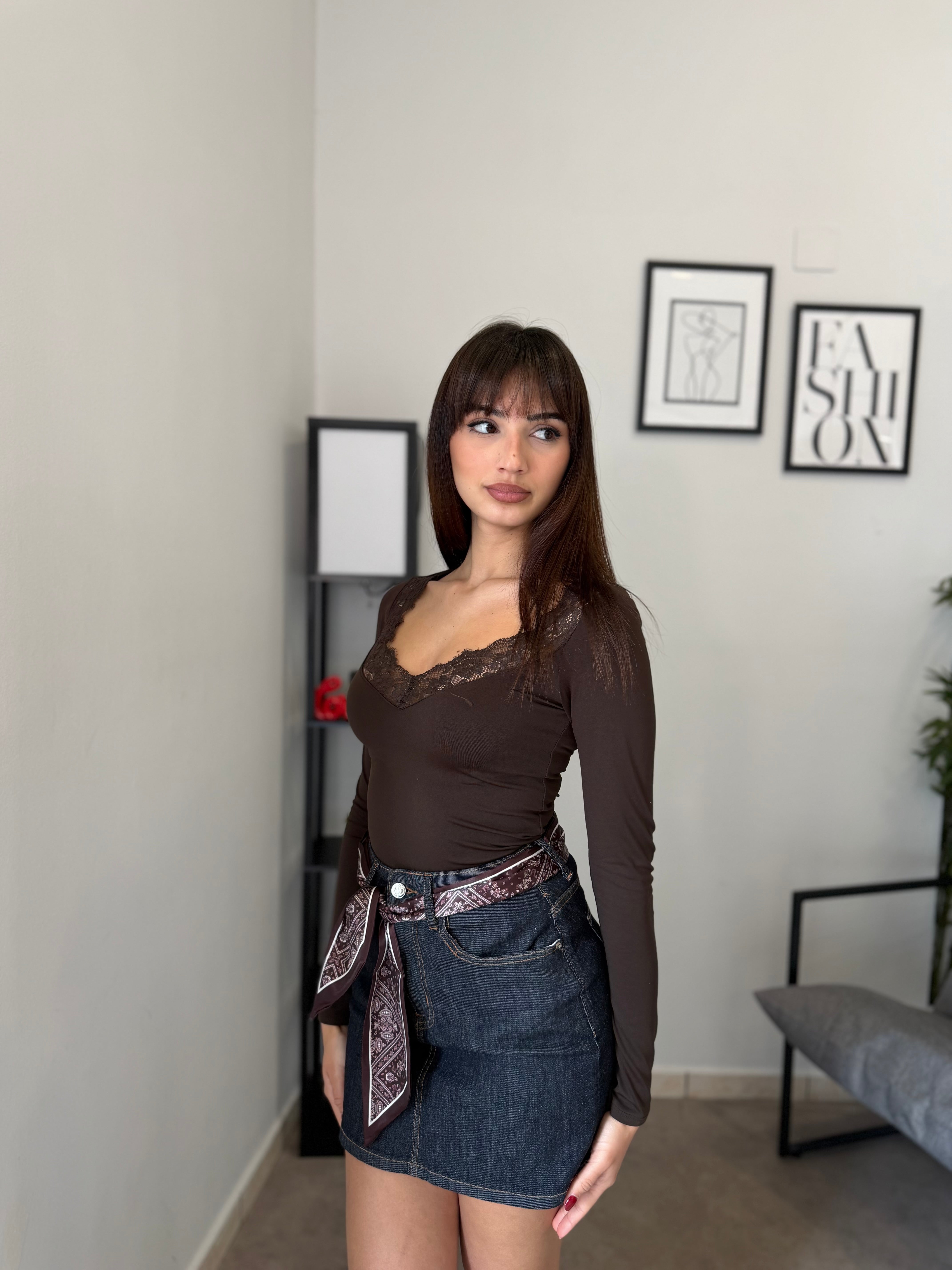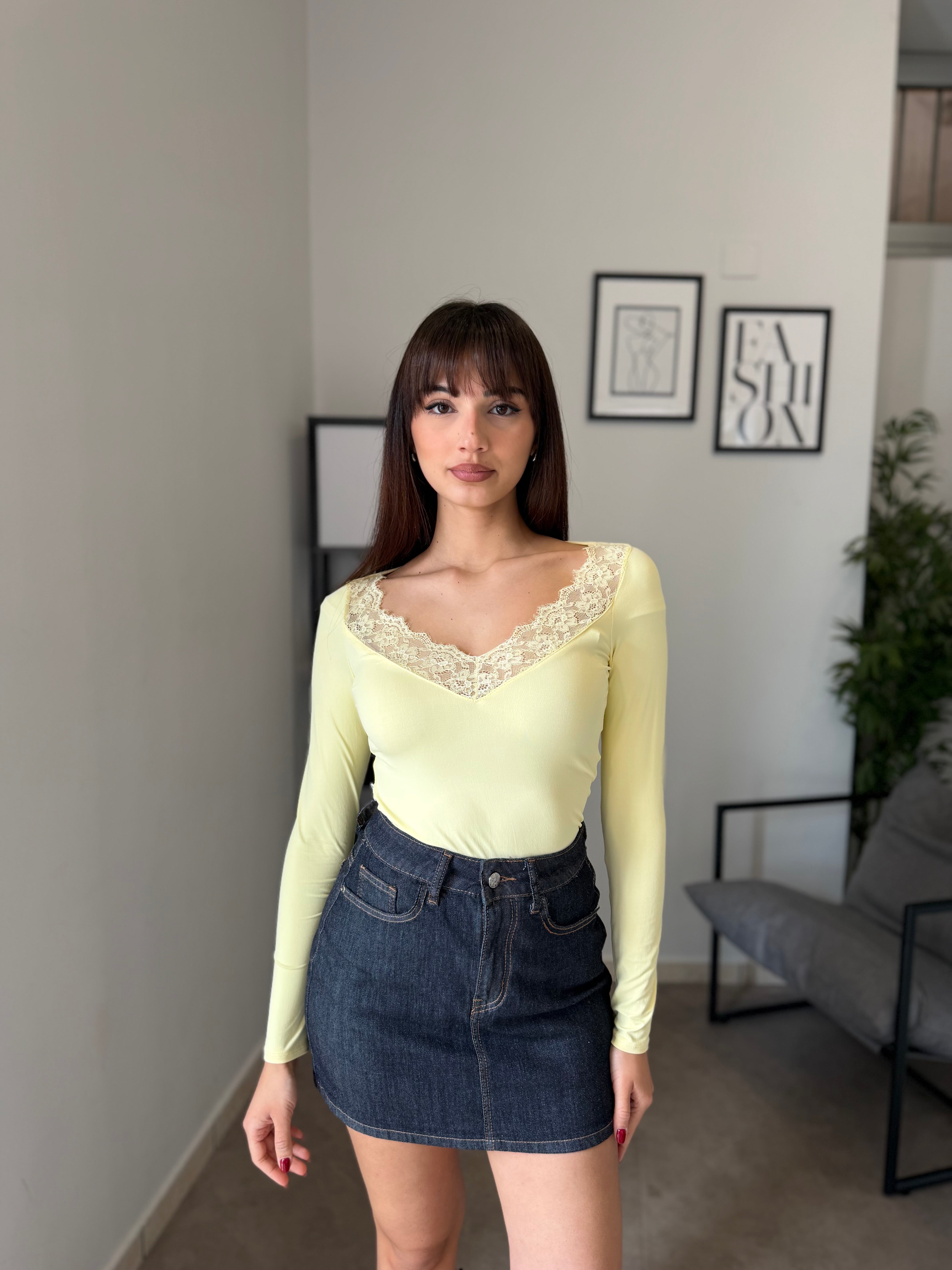 Maglia in licra con pizzo applicato sullo scollo! Veste bene dalla XS alla L