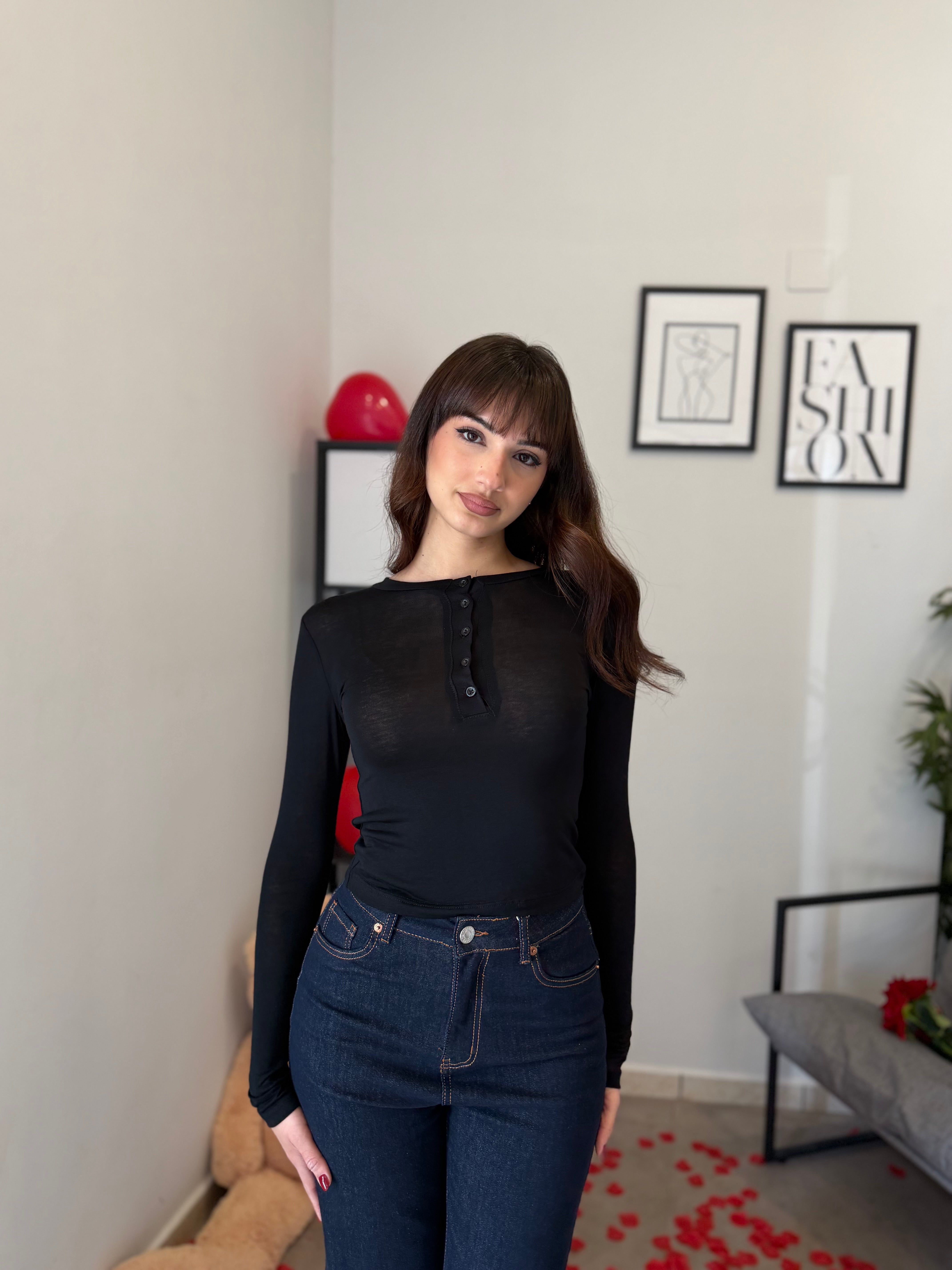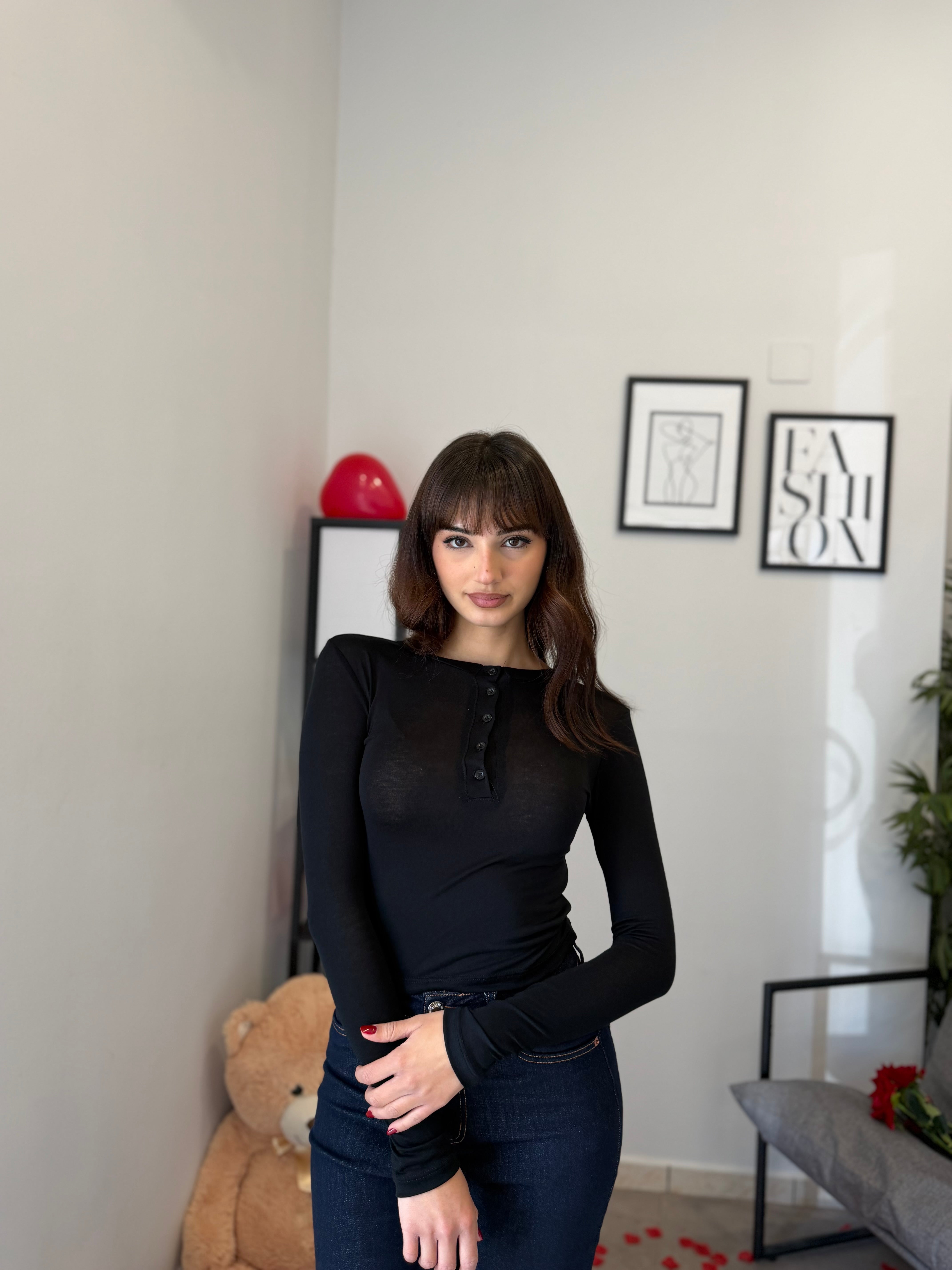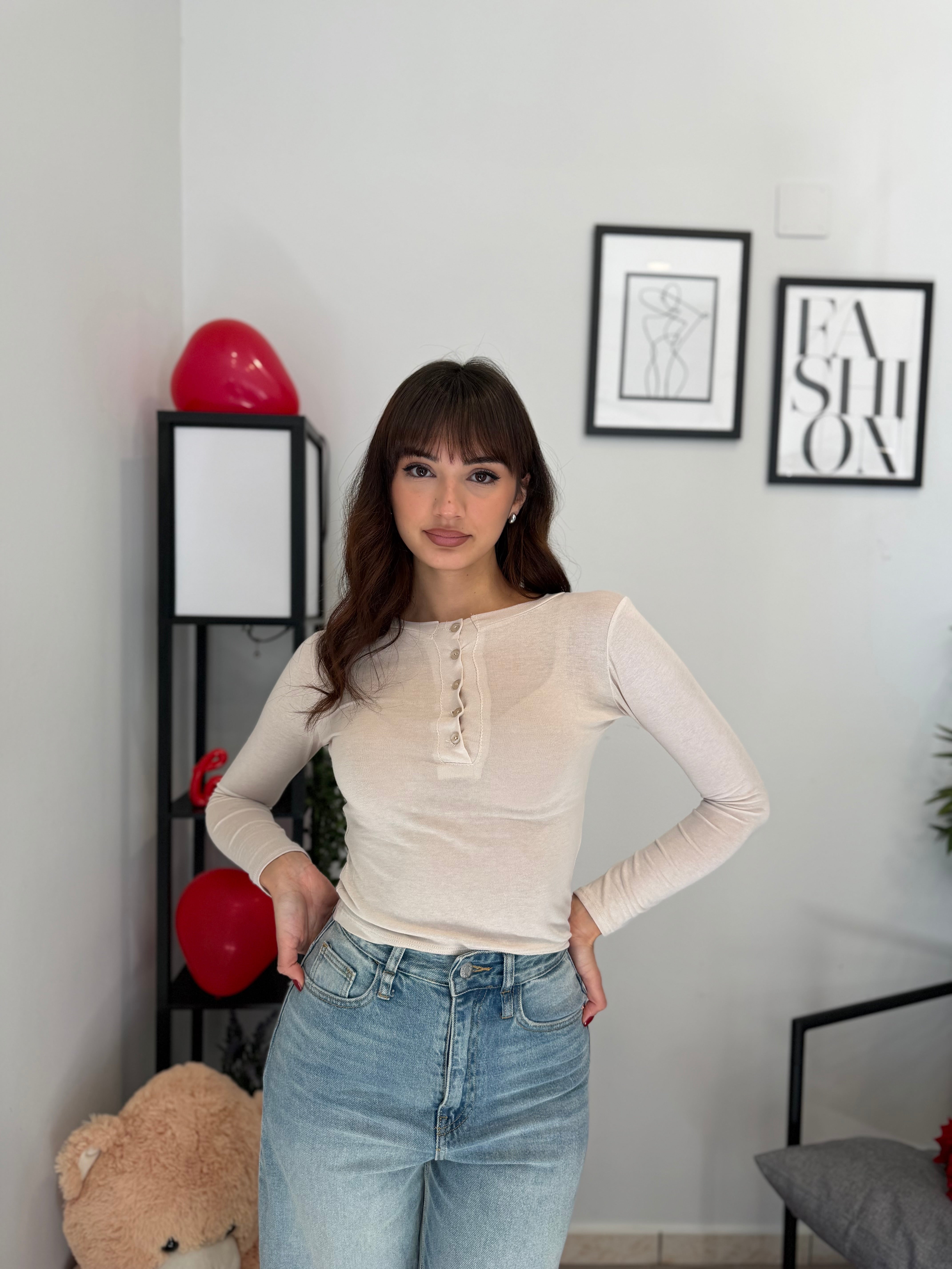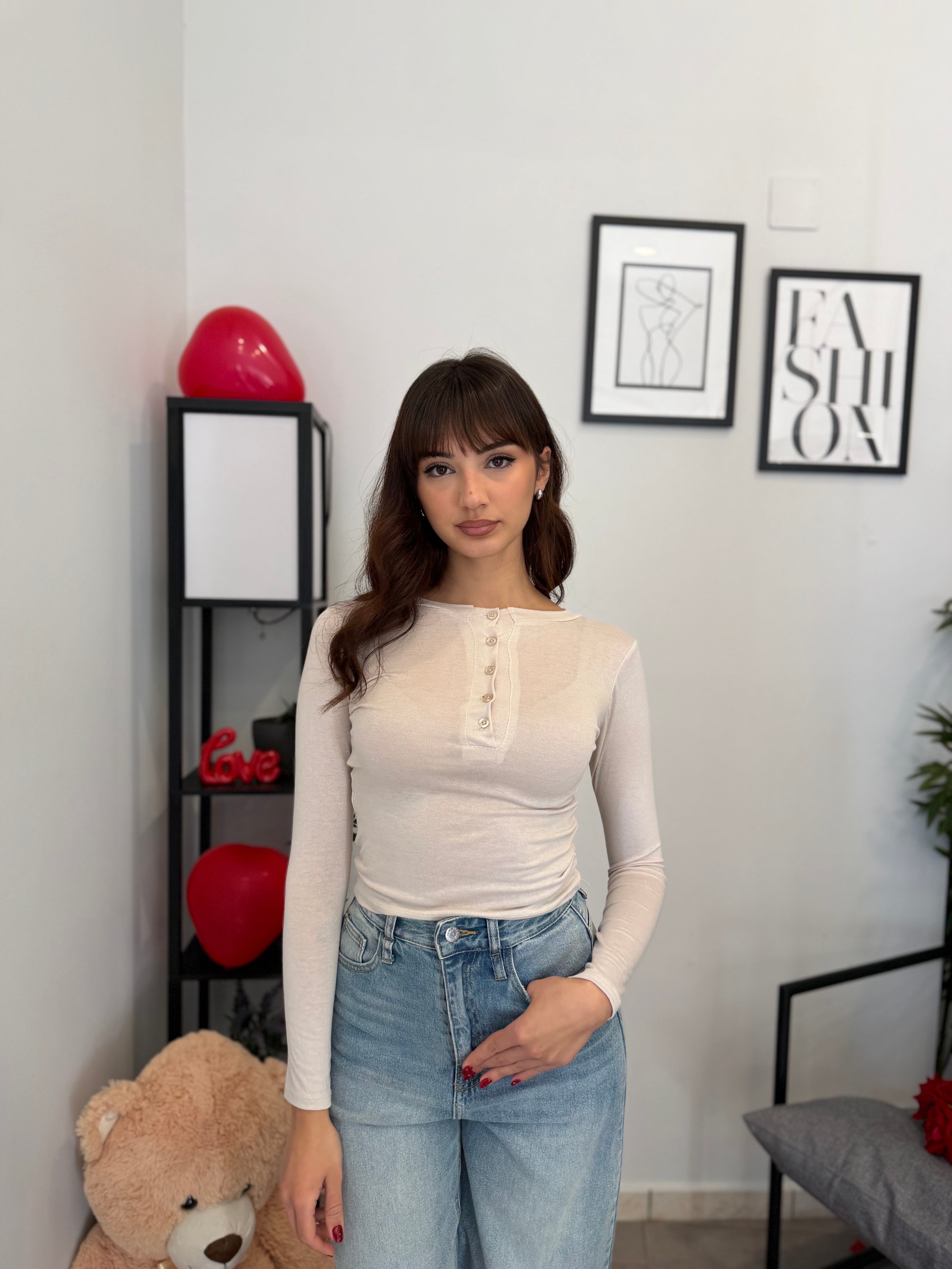 Maglia crop girocollo con bottoncini, tessuto effetto cashmere velato. Veste bene dalla XS alla M/L