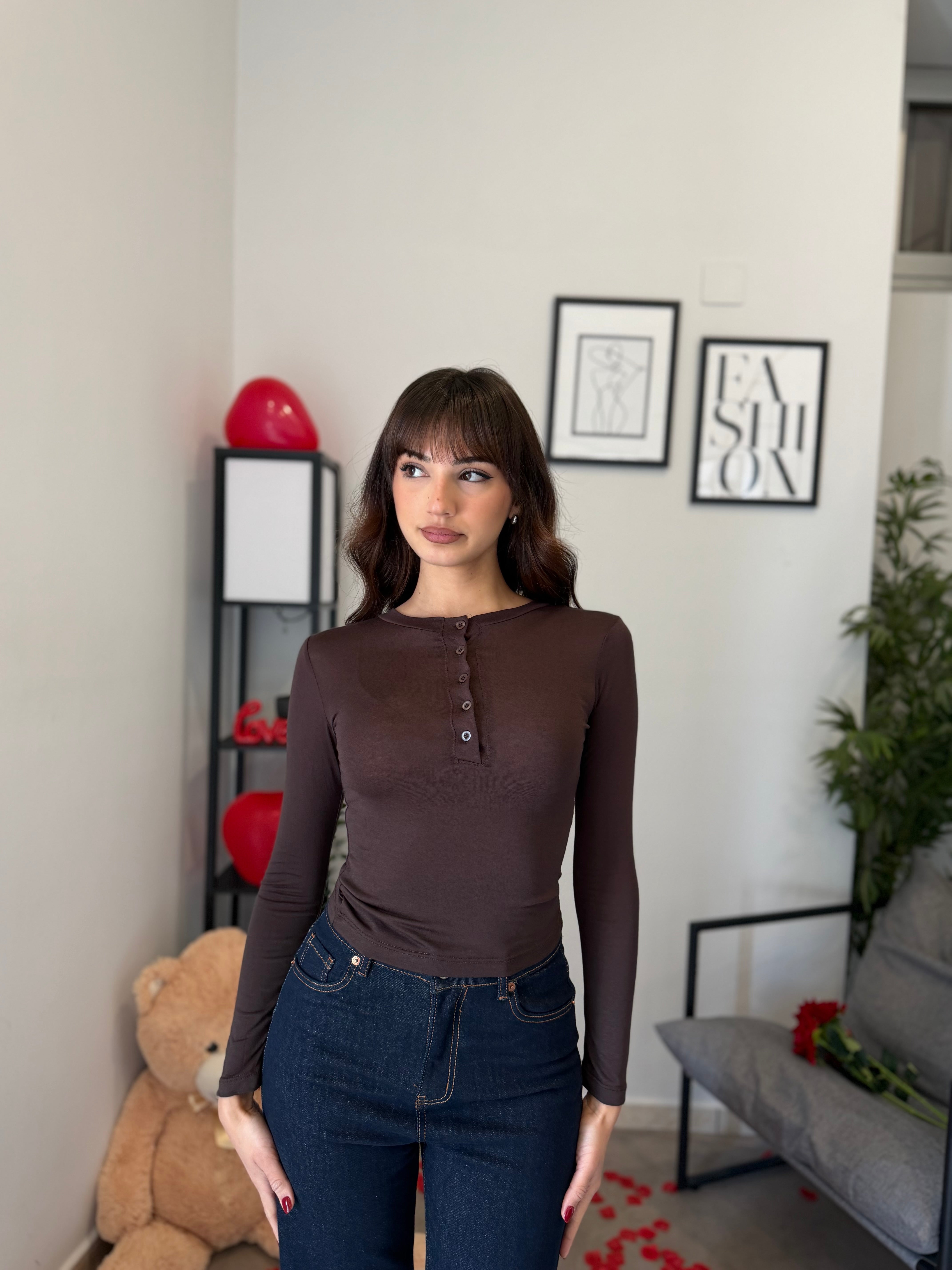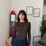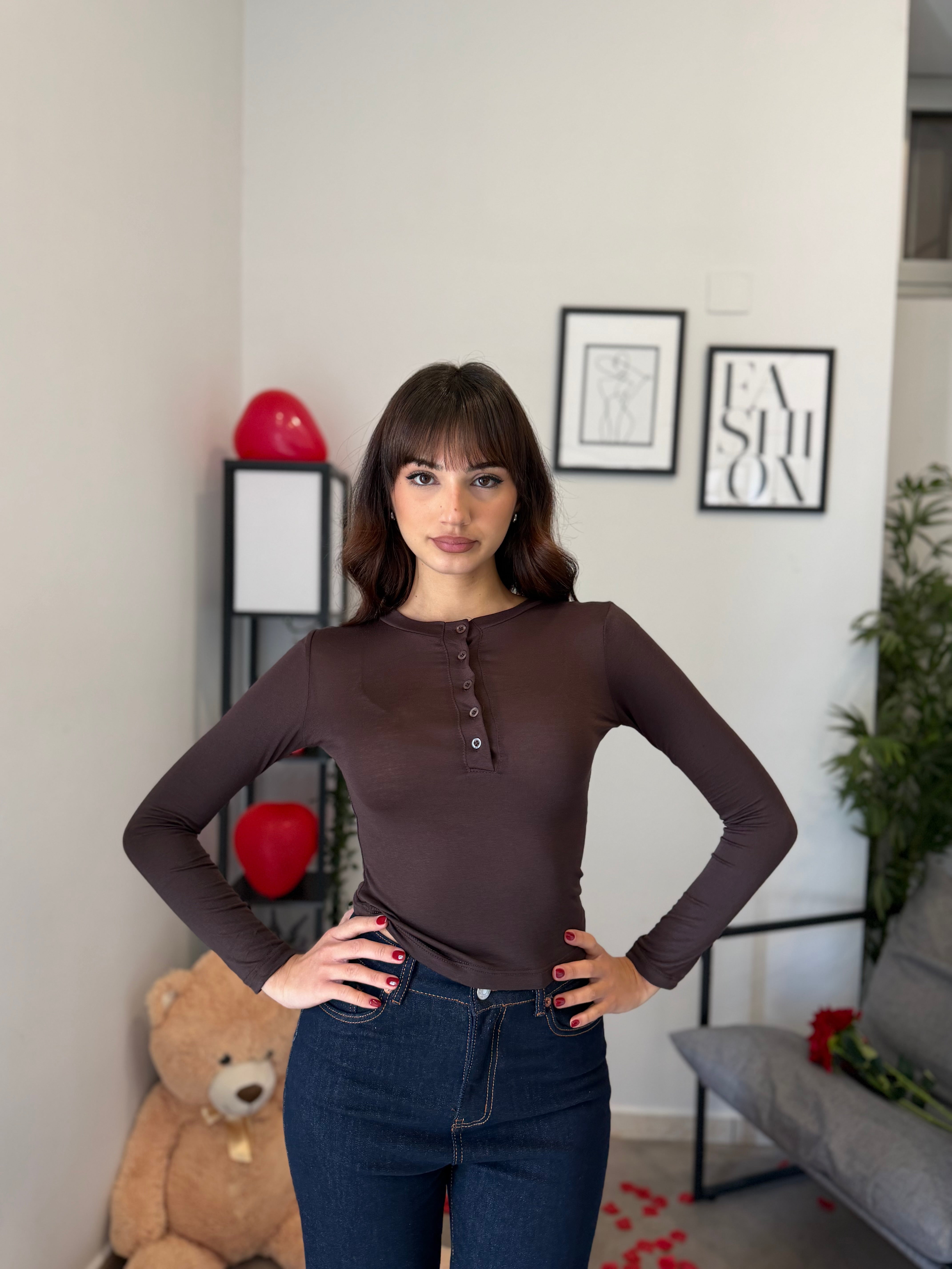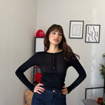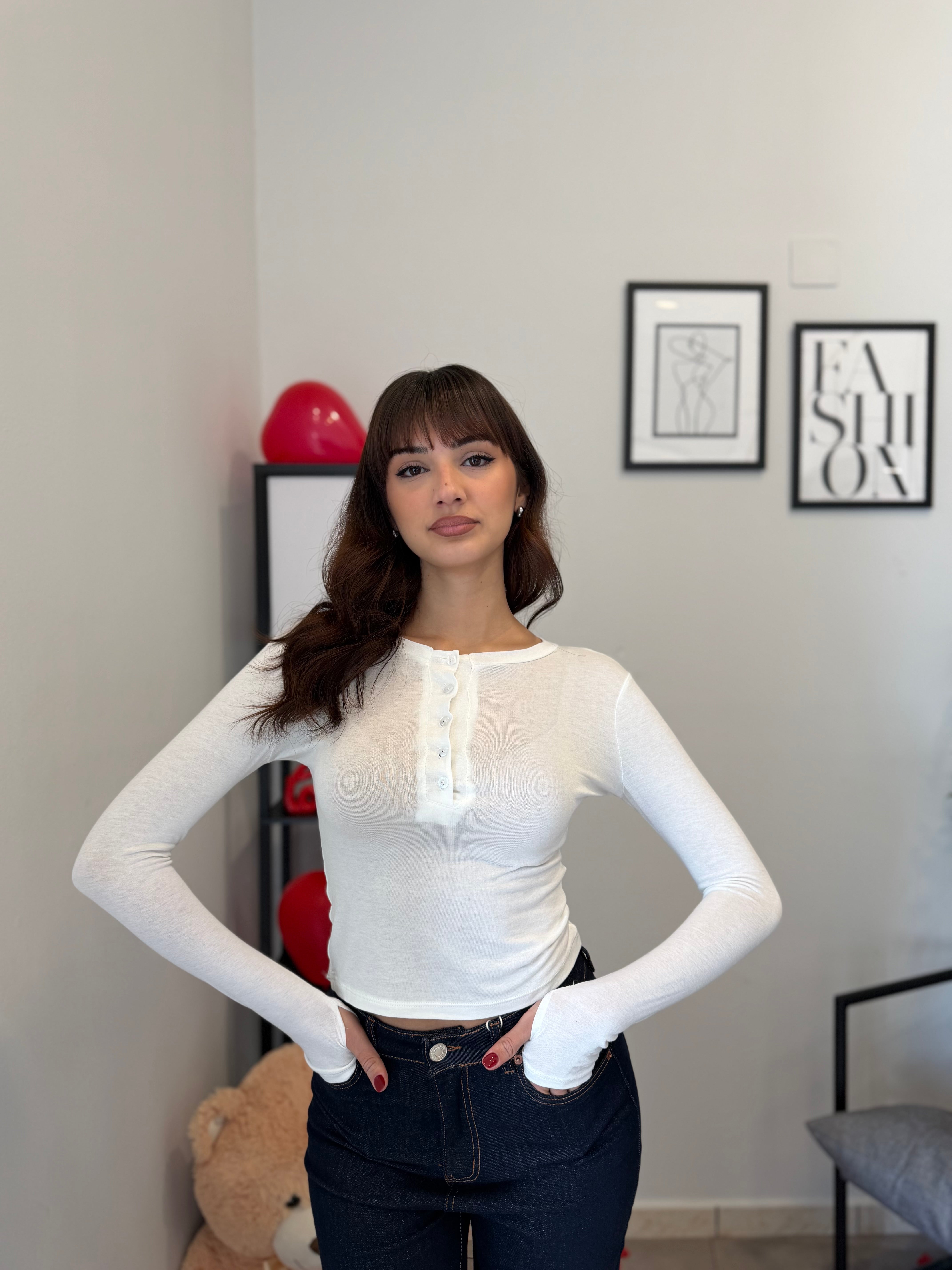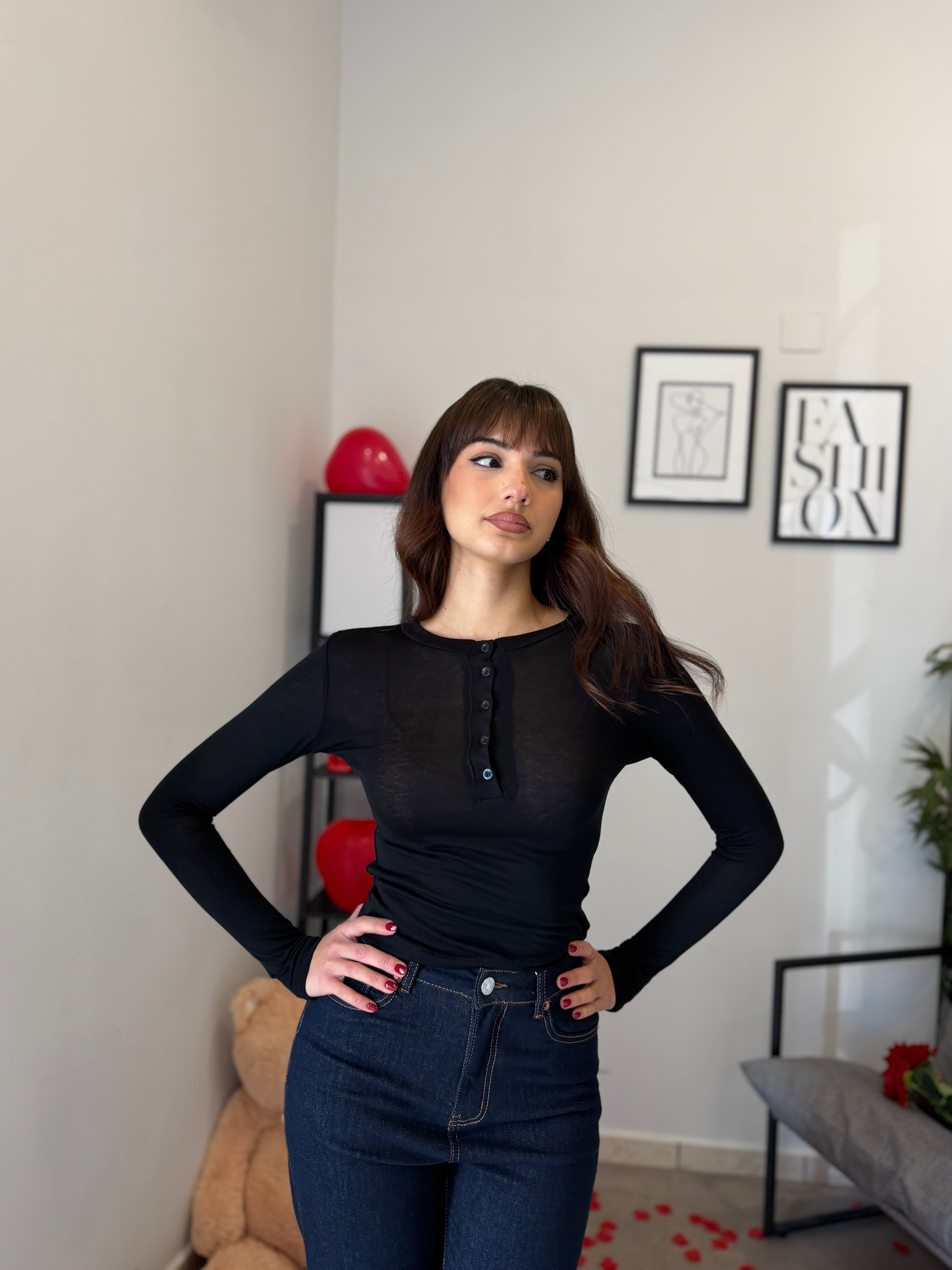 Maglia crop girocollo con bottoncini, tessuto effetto cashmere velato. Veste bene dalla XS alla M/L