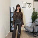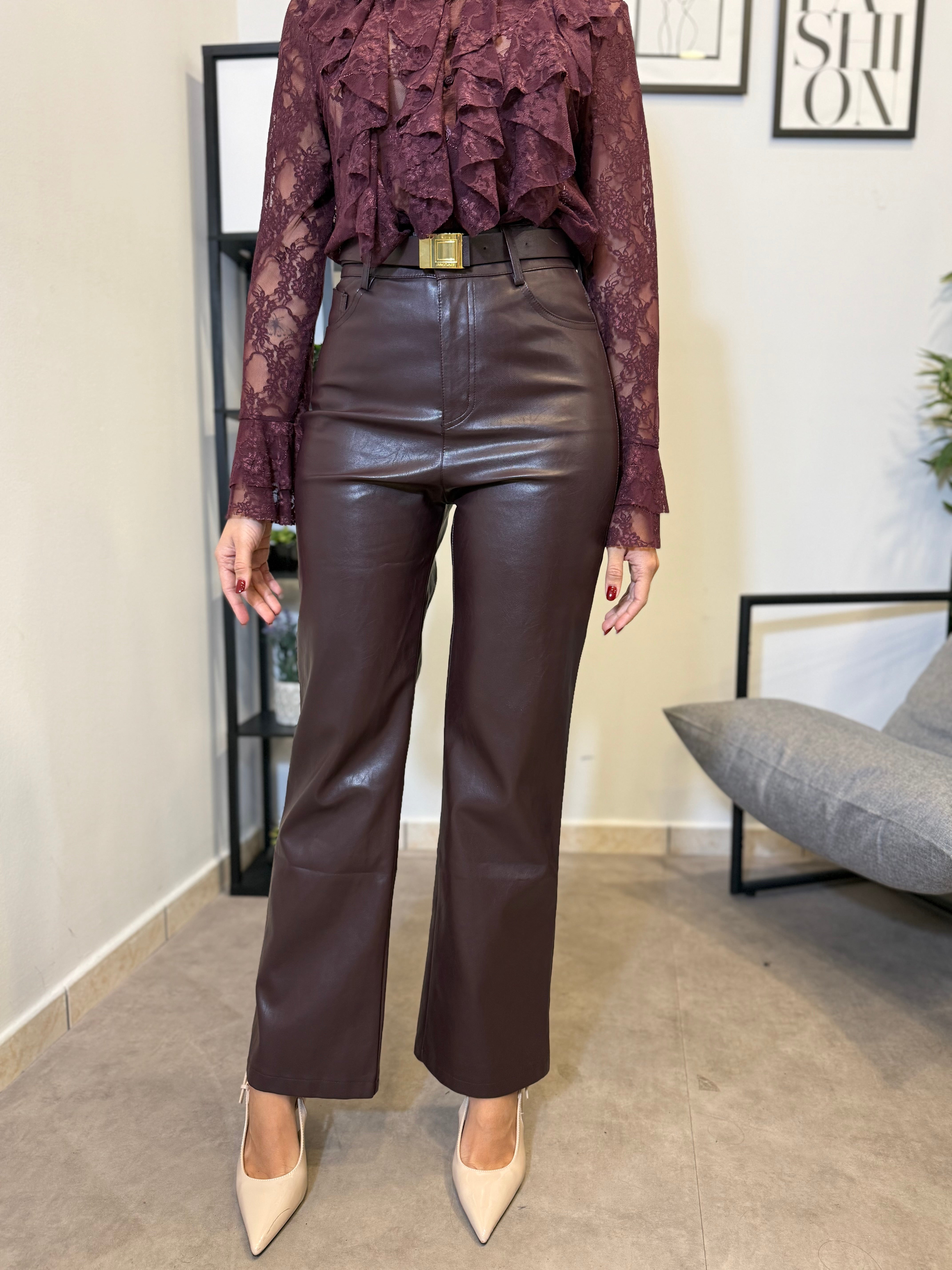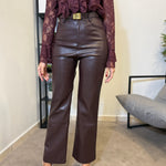 Pantalone wide leg in ecopelle con cintura incorporata. Vita alta e tessuto caldo internamente. Marta indossa tg S.