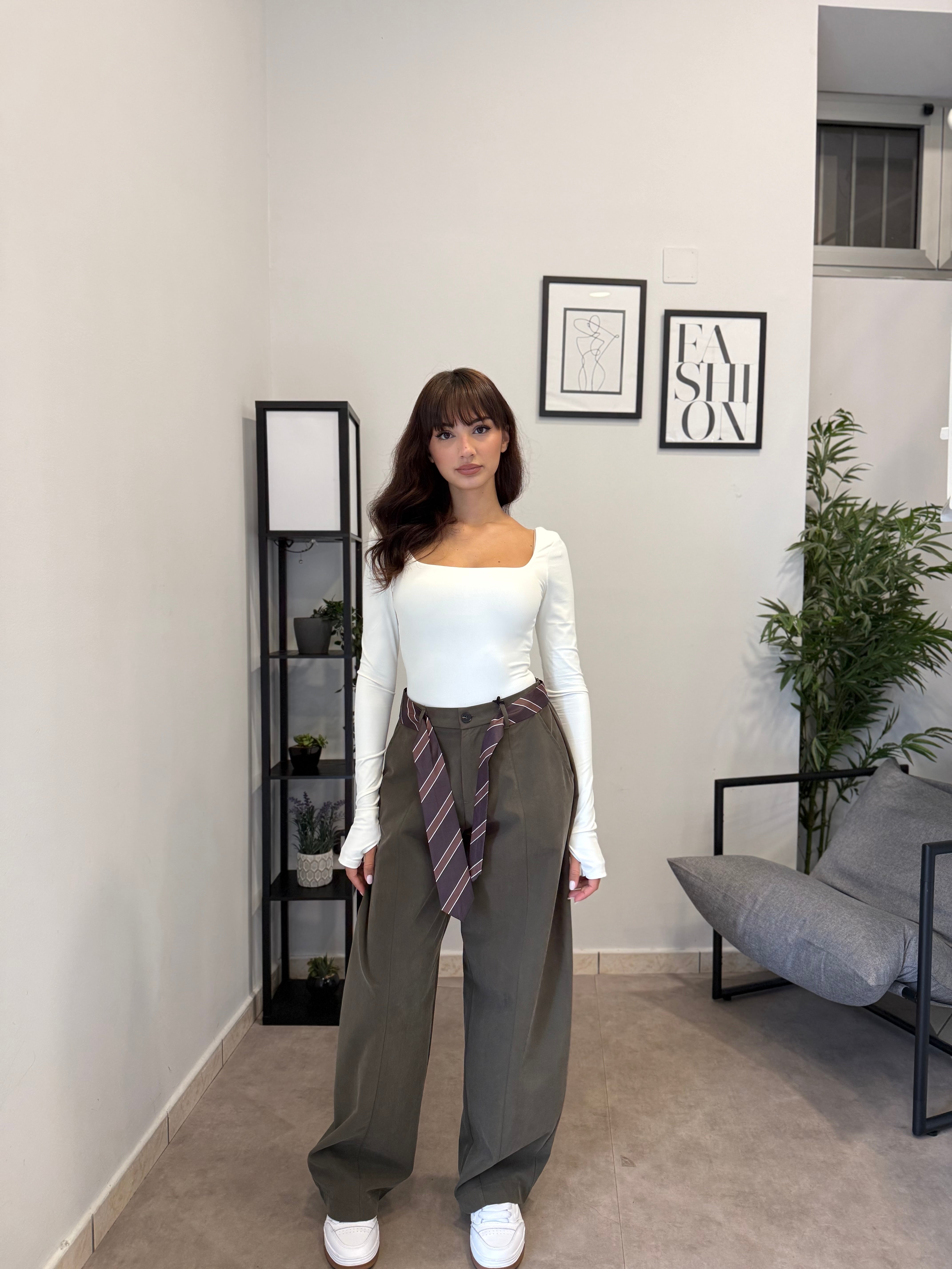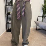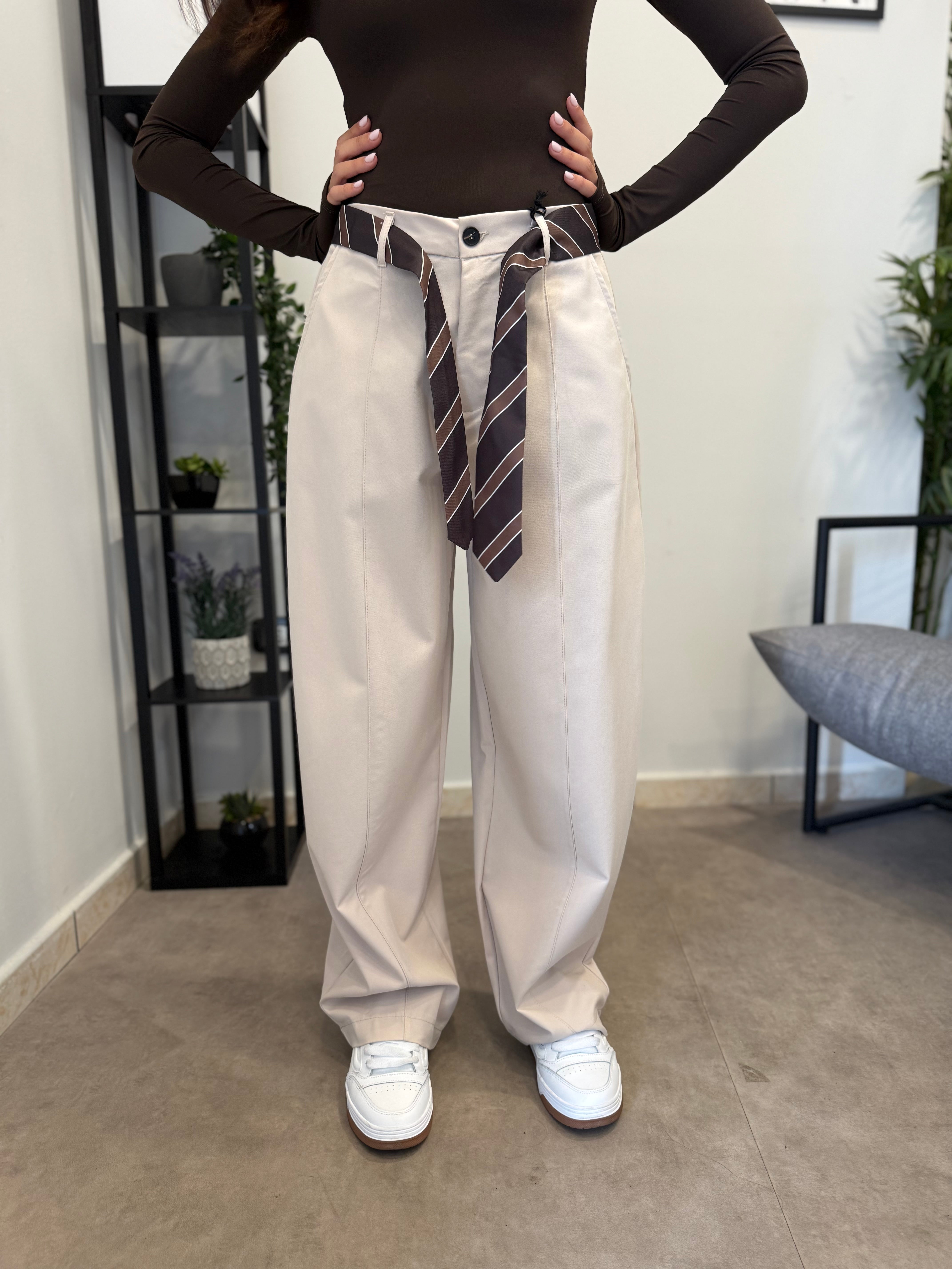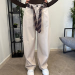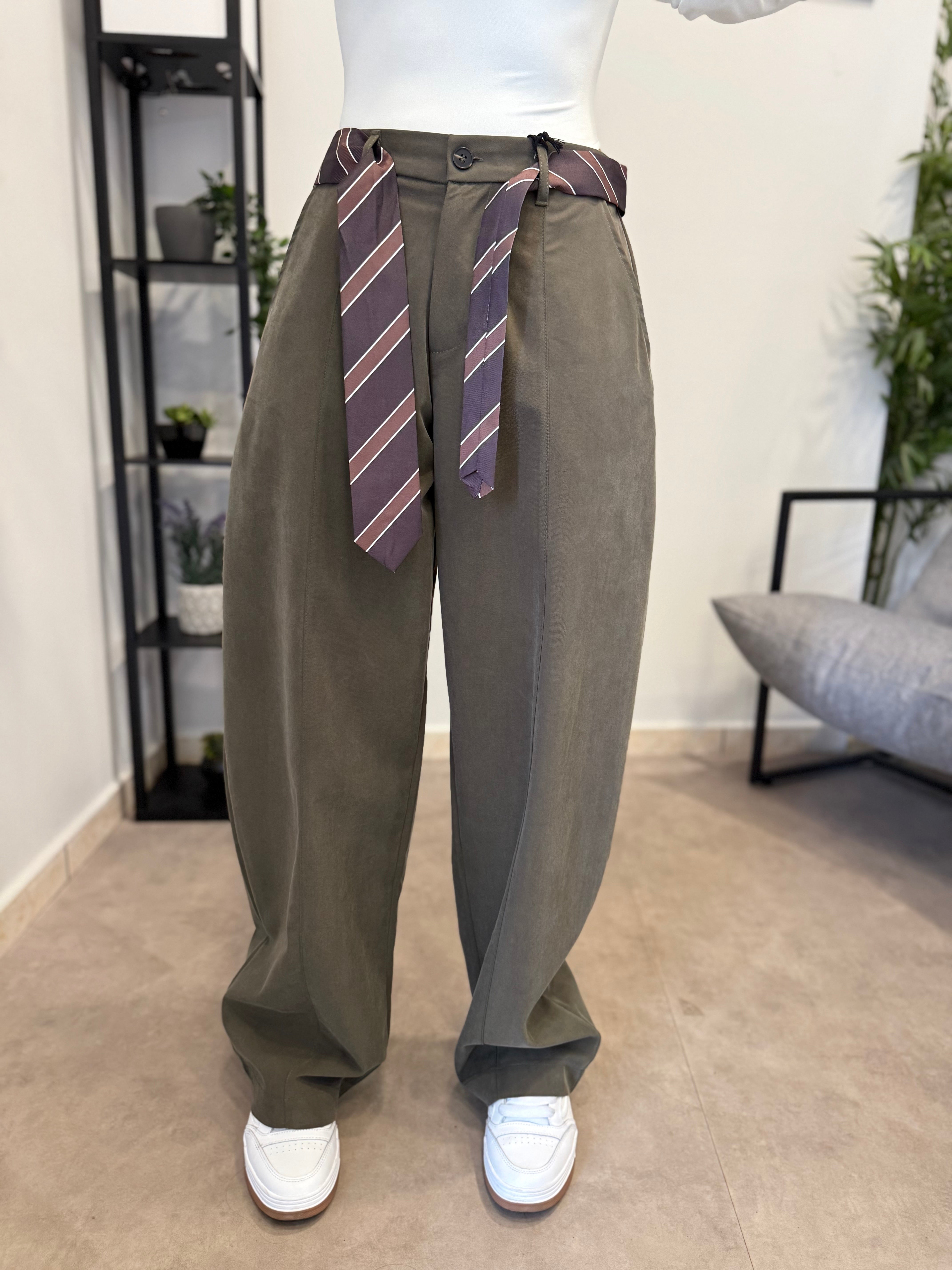 Pantalone in caldo contone con gamba larga e molla in vita. La cravatta è inclusa. Veste bene dalla S alla L