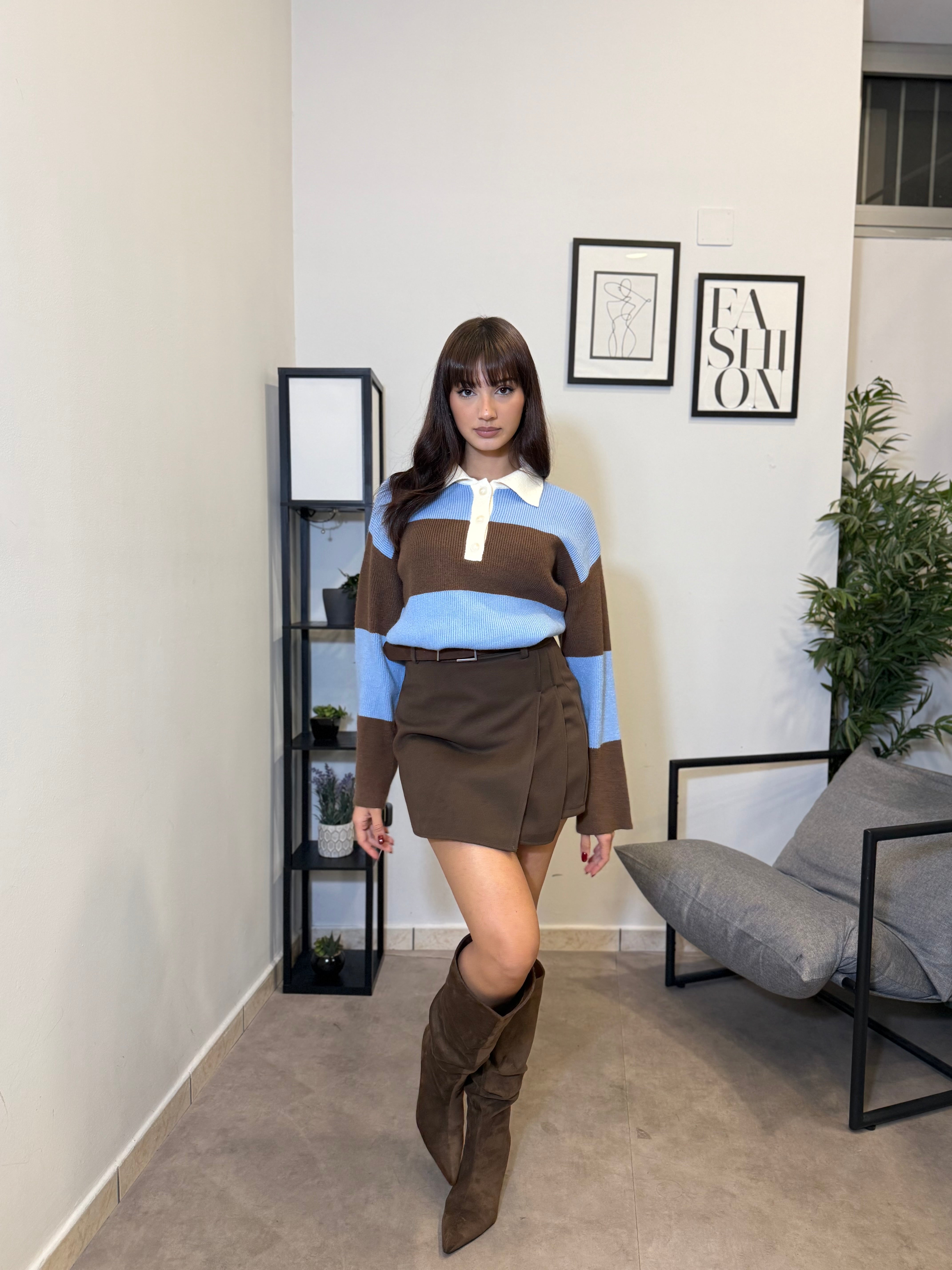 Pull a strisce con colletto polo panna. Manica leggermente ampia e tessuto caldo.