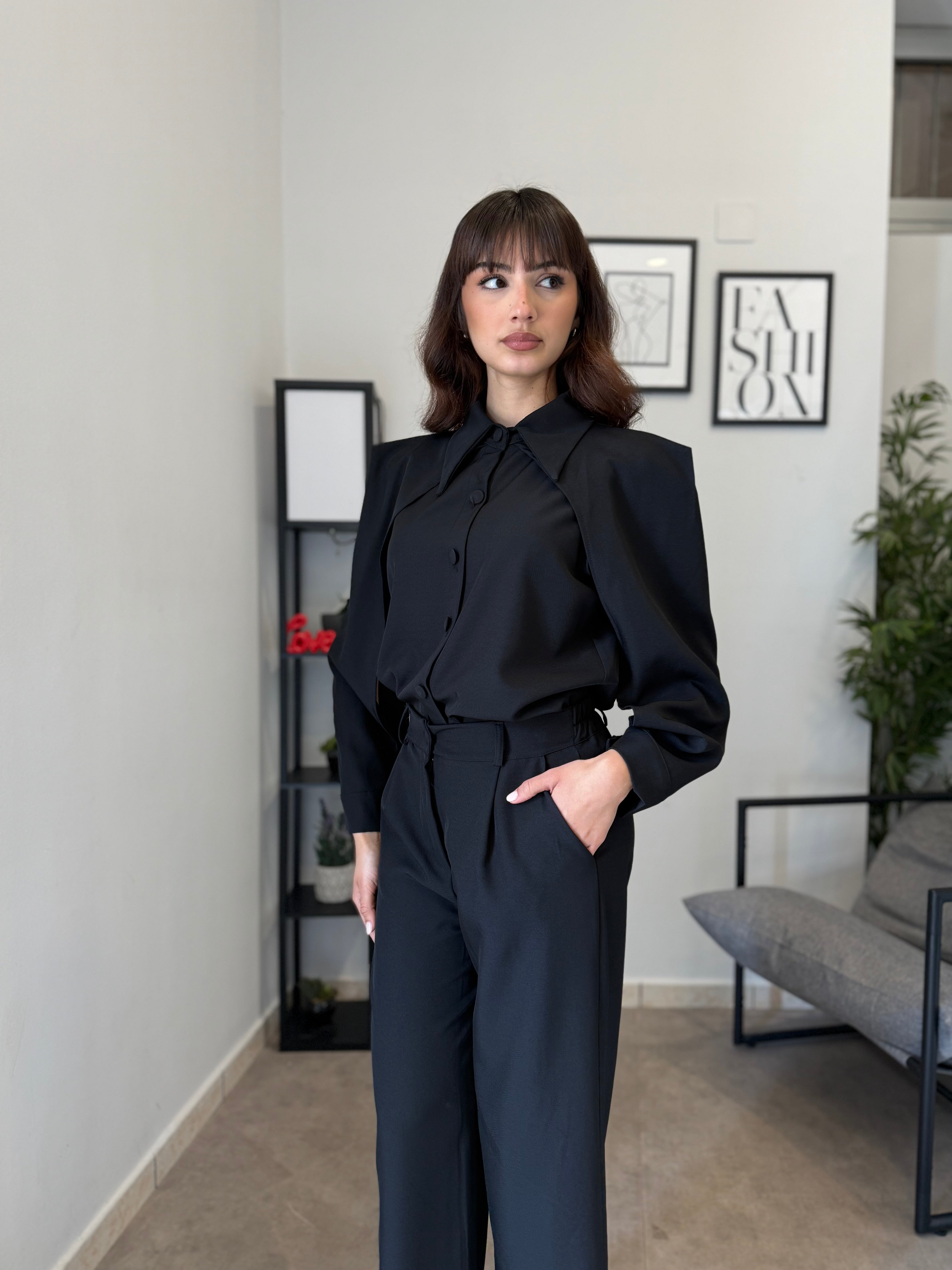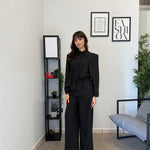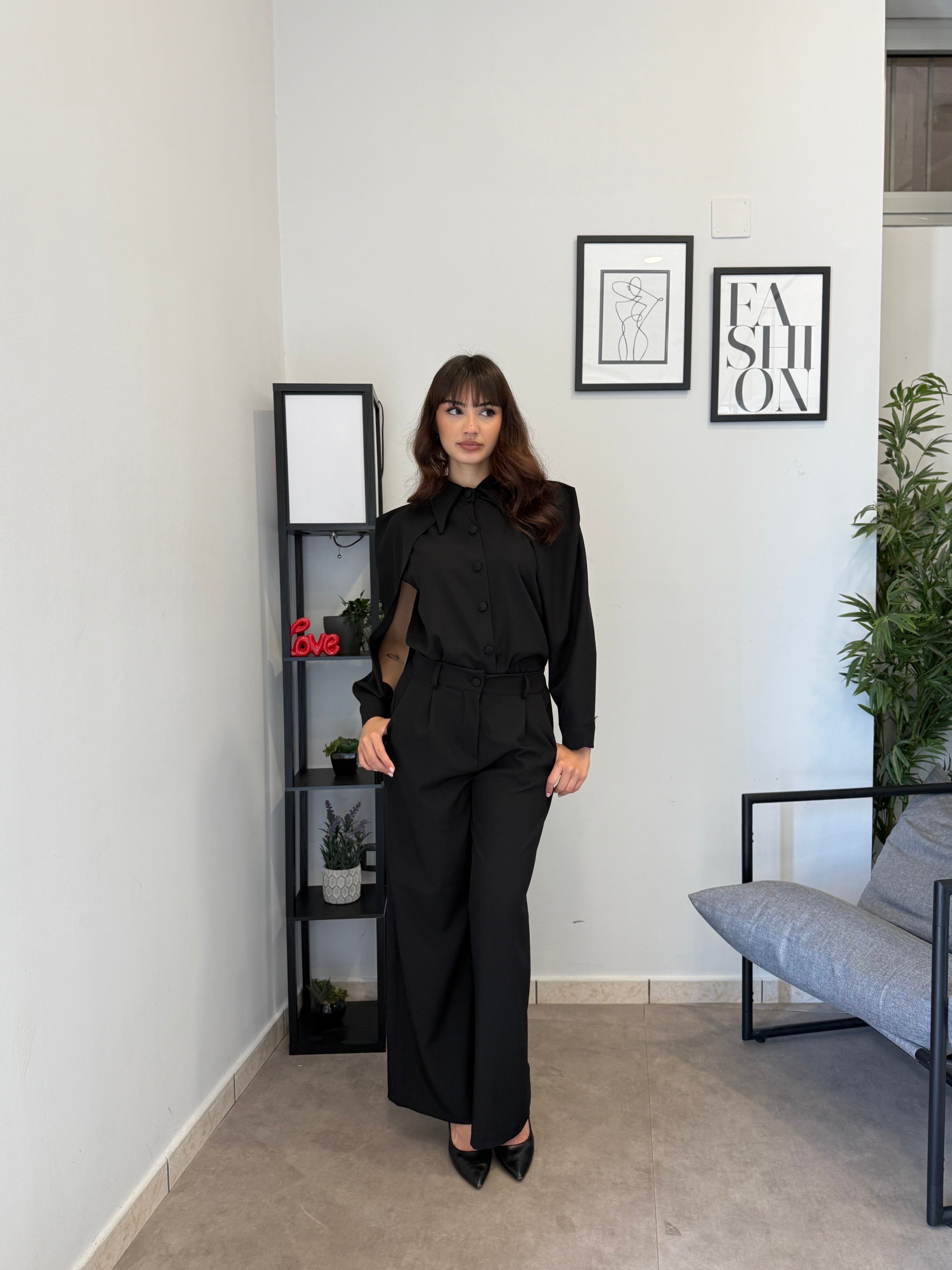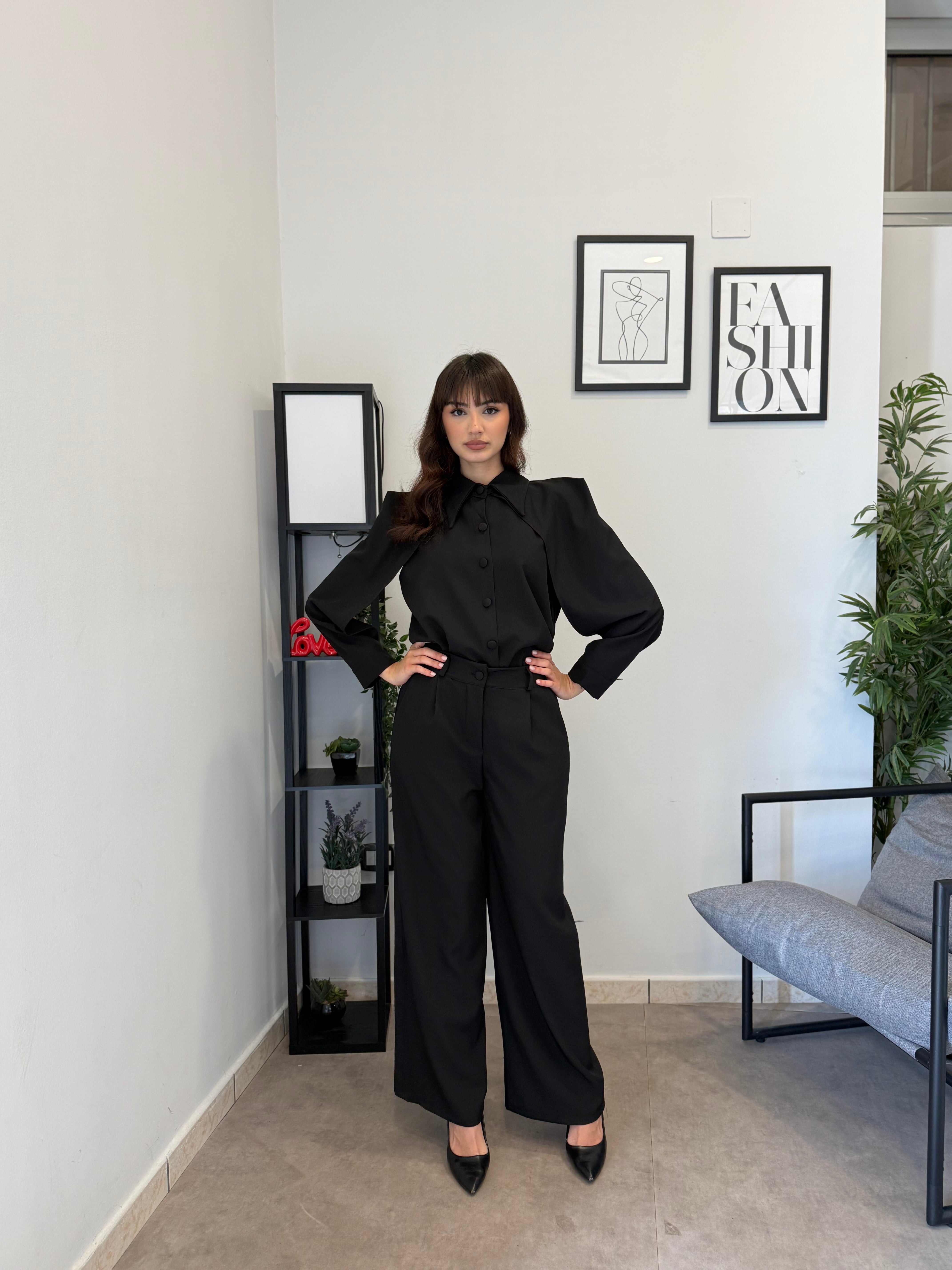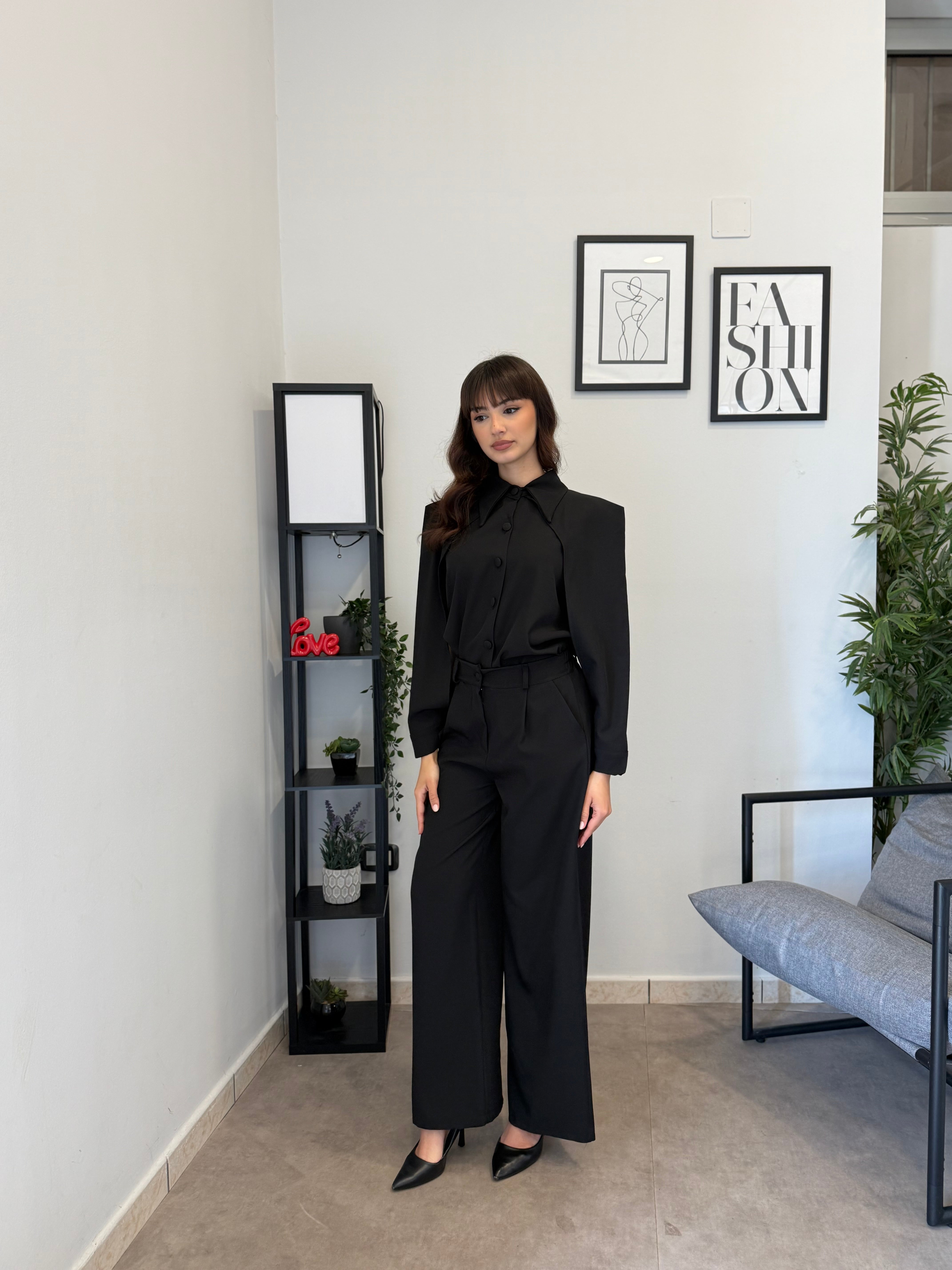 Completo in poliviscosa con pantalone palazzo e camicia. La camicia ha le maniche aperte ed il pantalone presenta la molla in vita. Veste bene dalla S alla L
