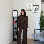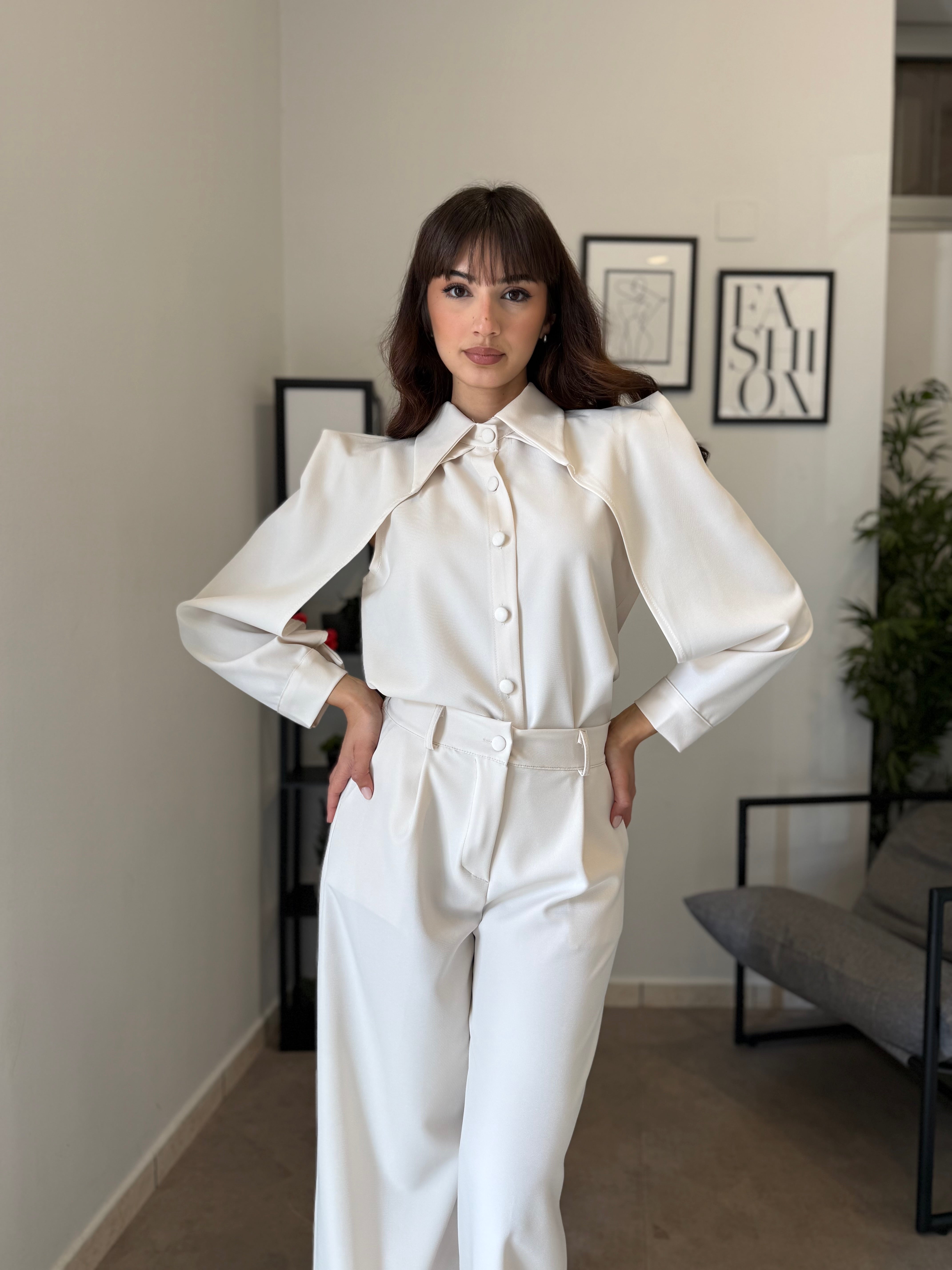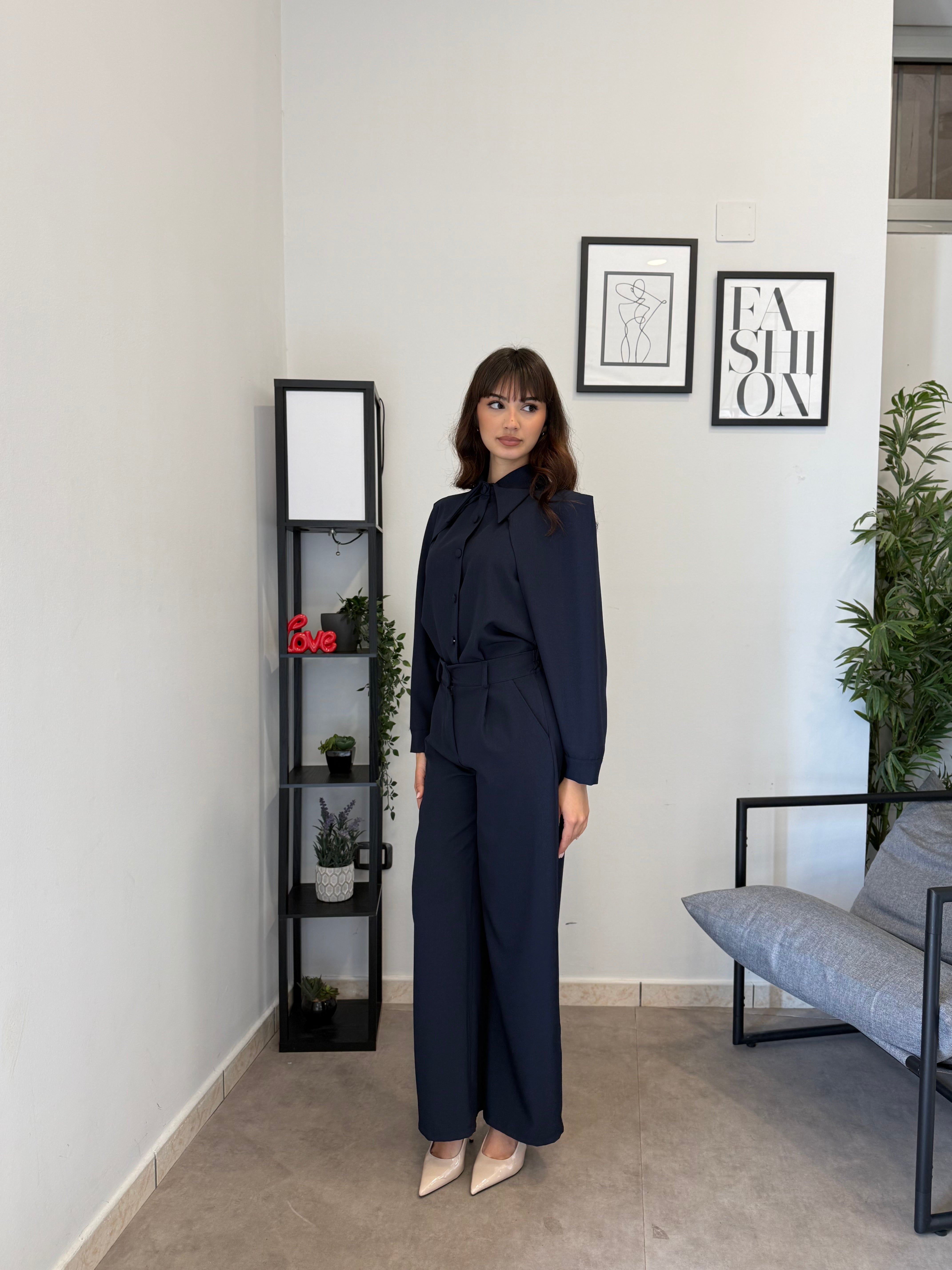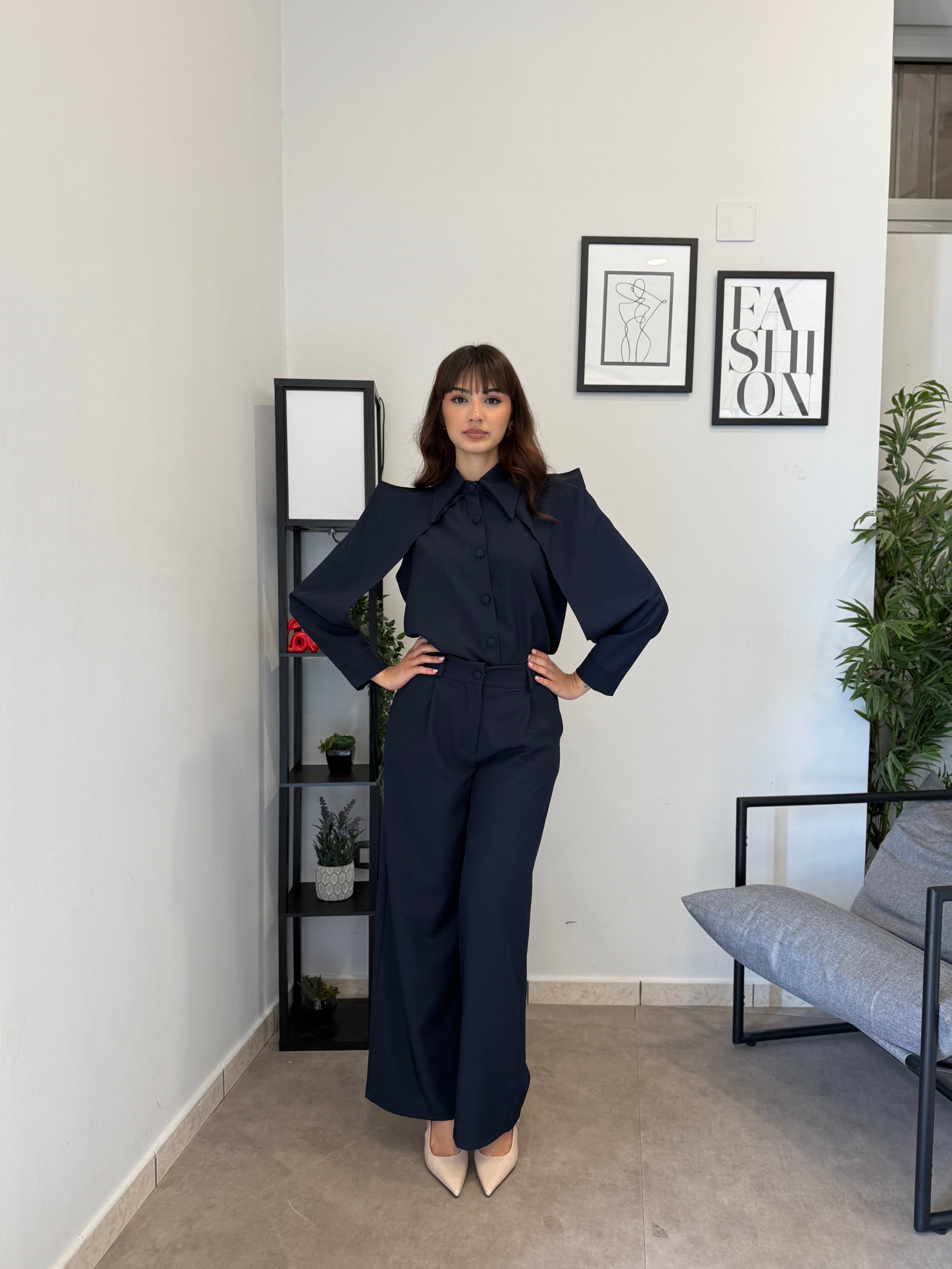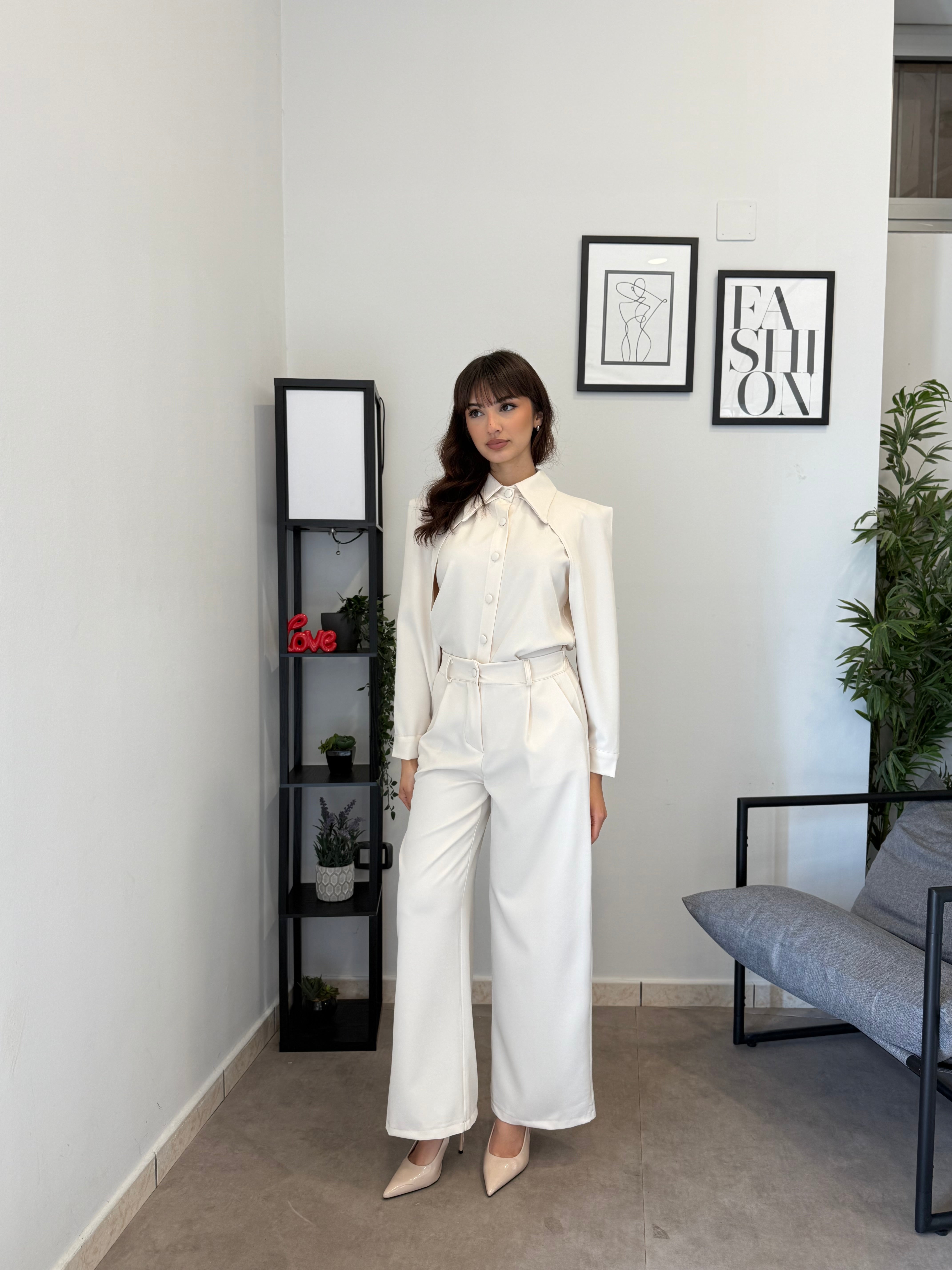 Completo in poliviscosa con pantalone palazzo e camicia. La camicia ha le maniche aperte ed il pantalone presenta la molla in vita. Veste bene dalla S alla L