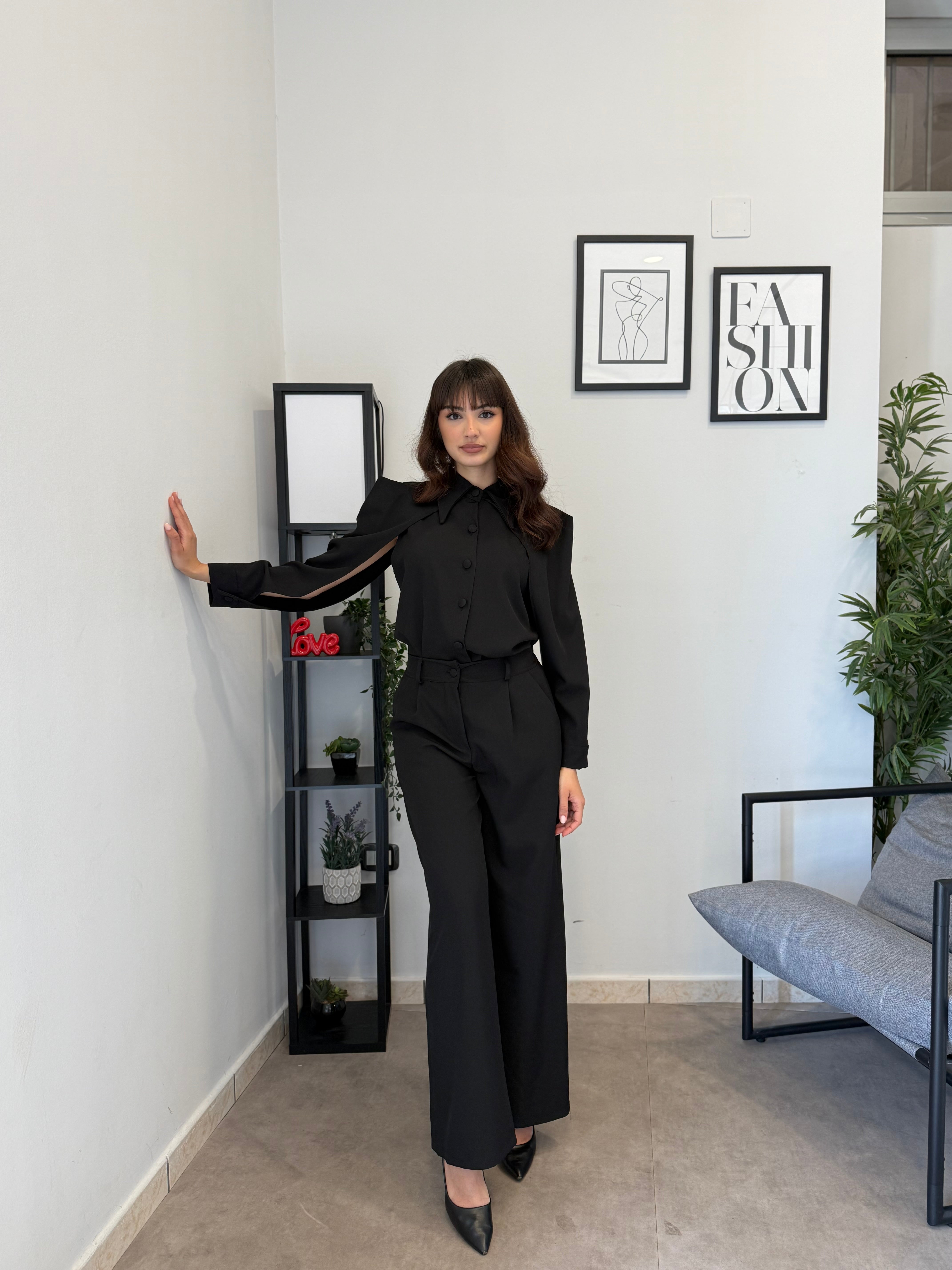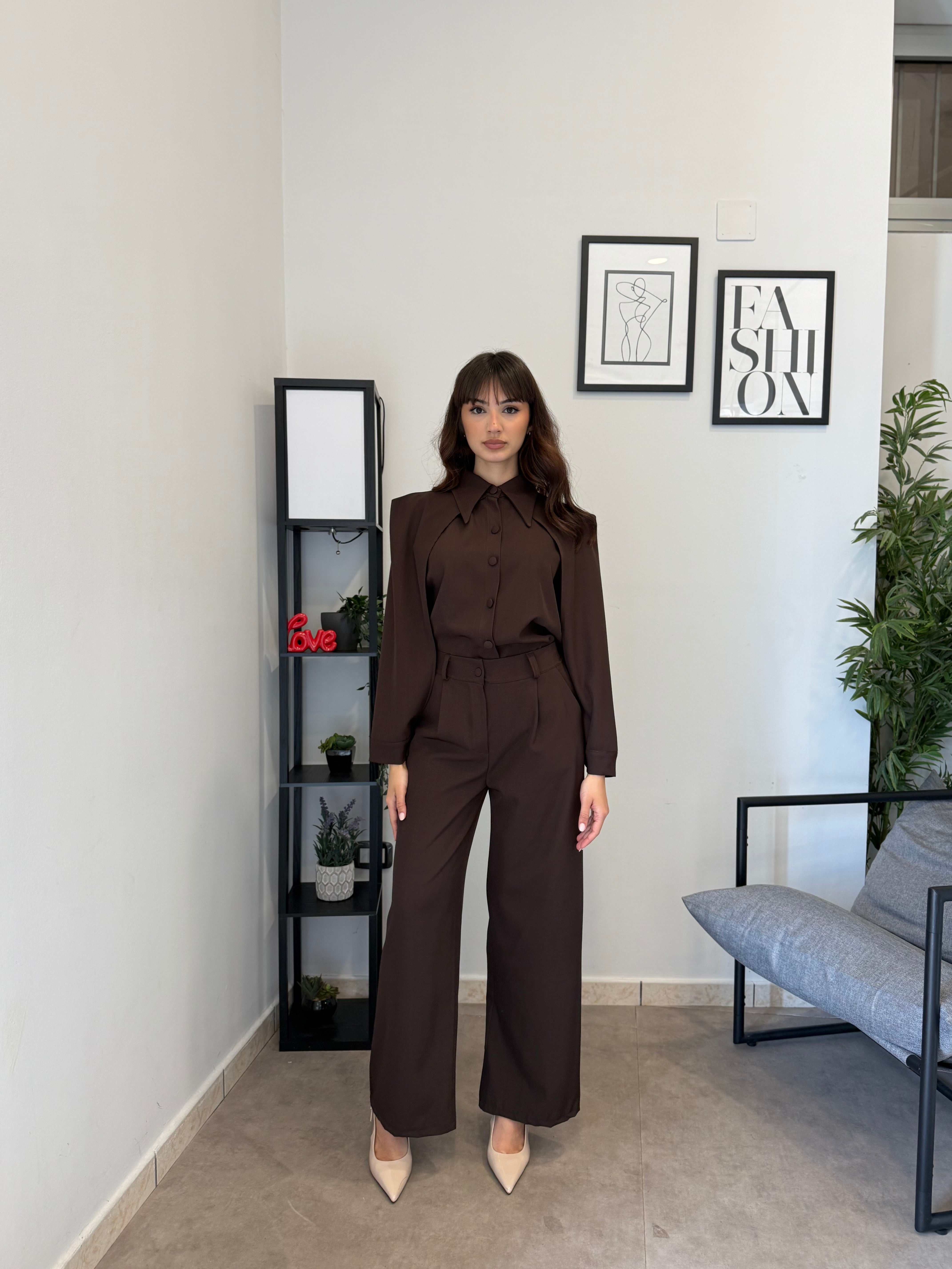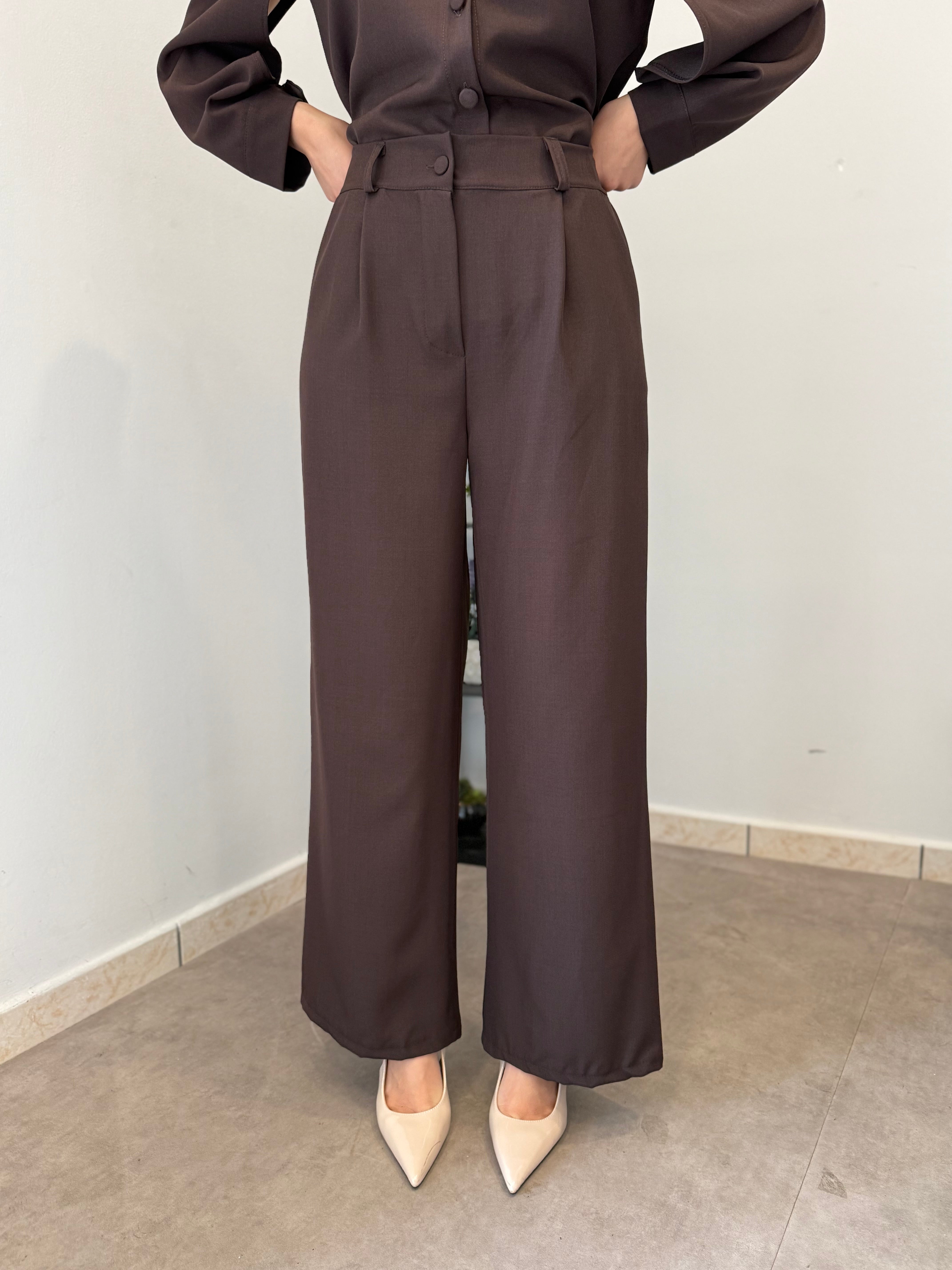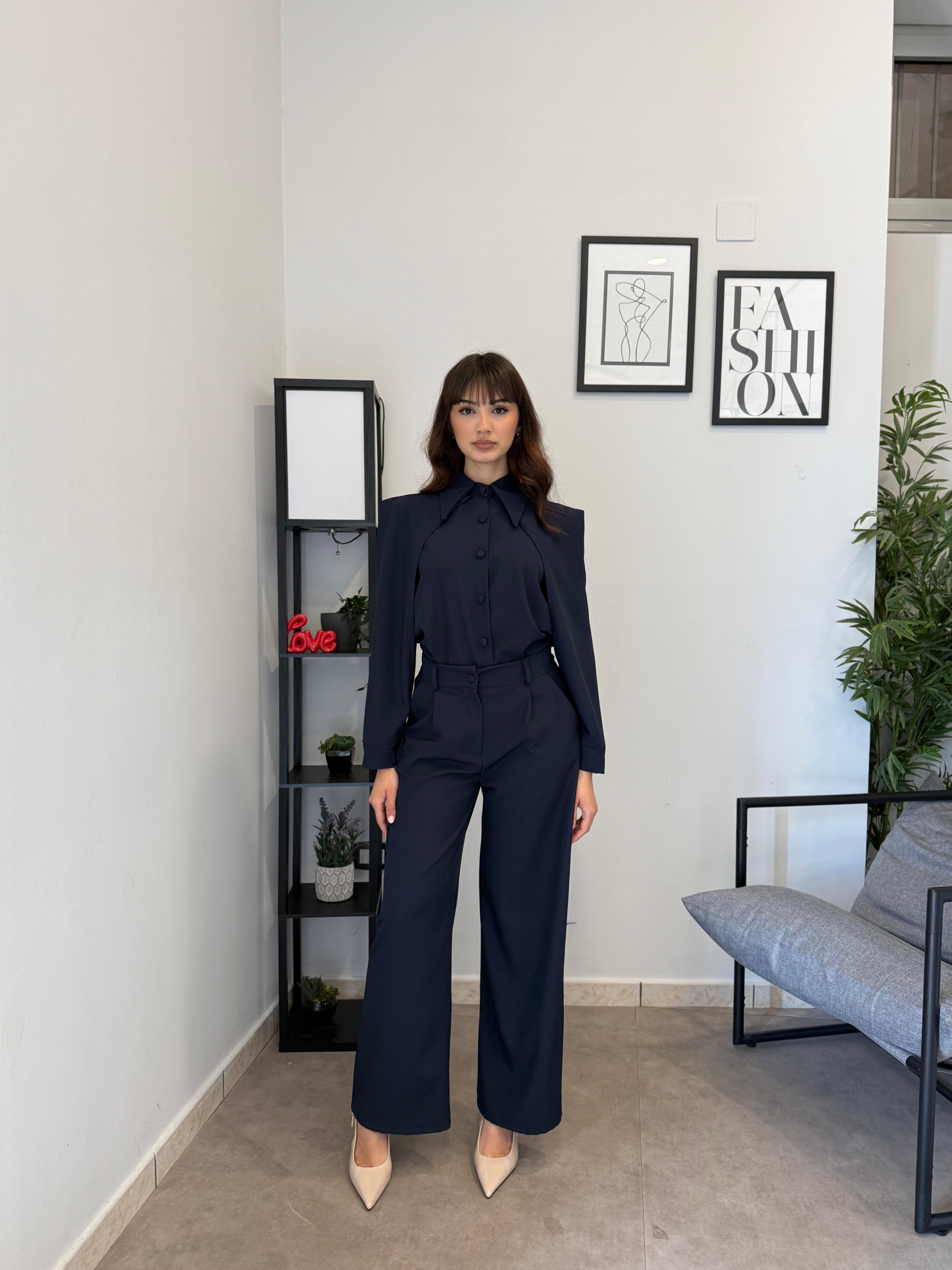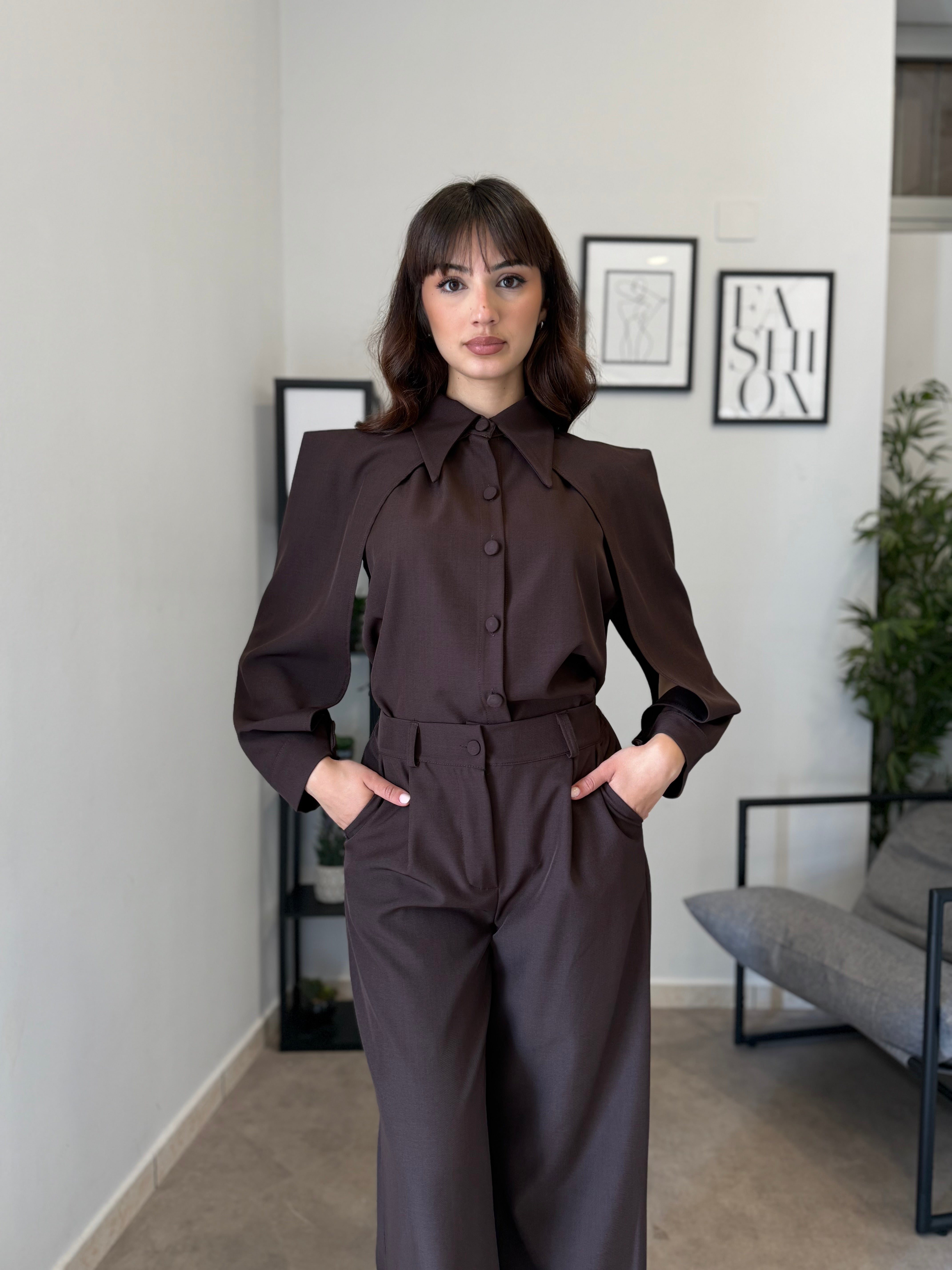 Completo in poliviscosa con pantalone palazzo e camicia. La camicia ha le maniche aperte ed il pantalone presenta la molla in vita. Veste bene dalla S alla L