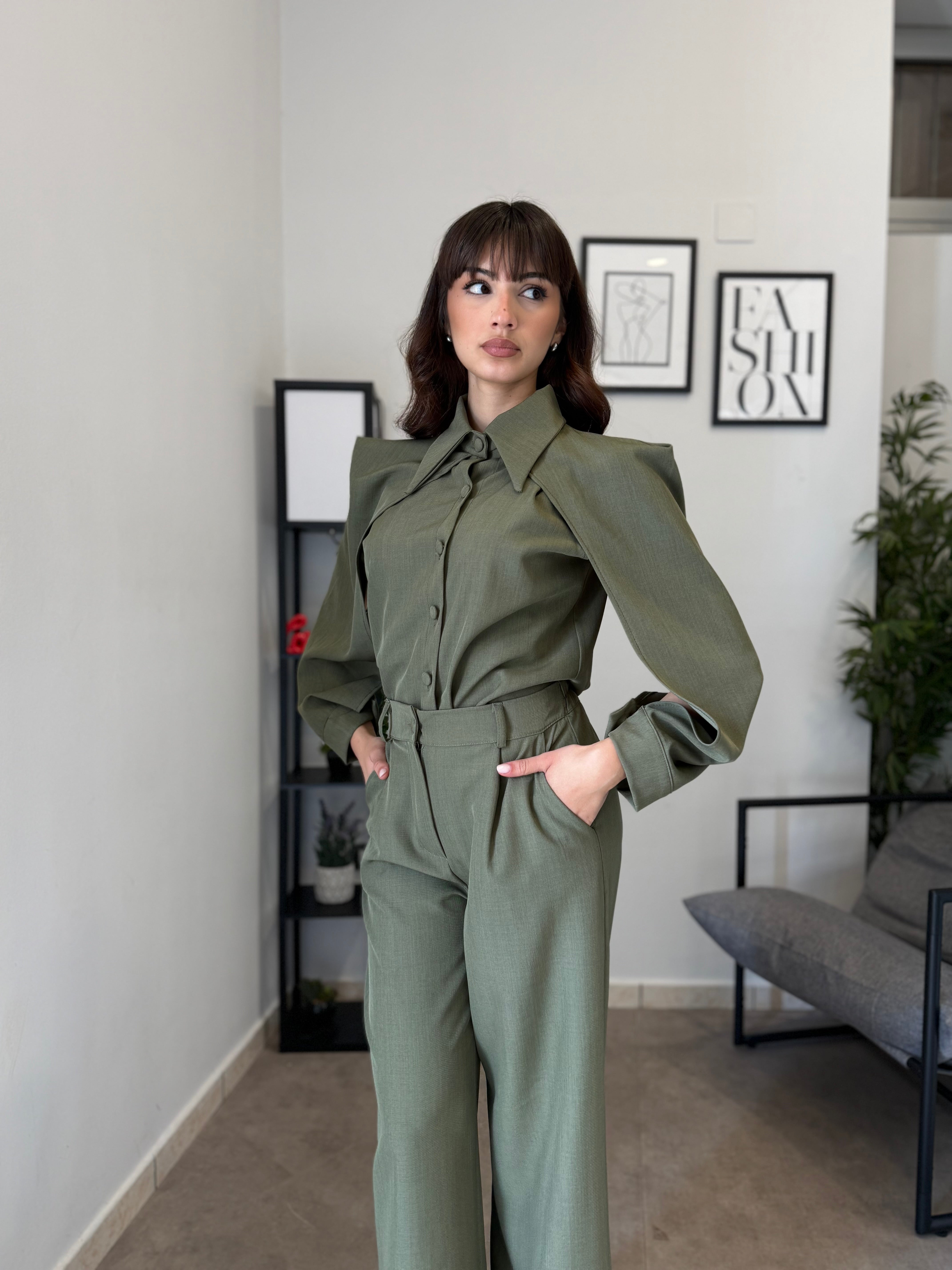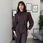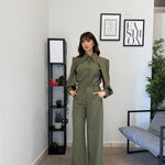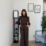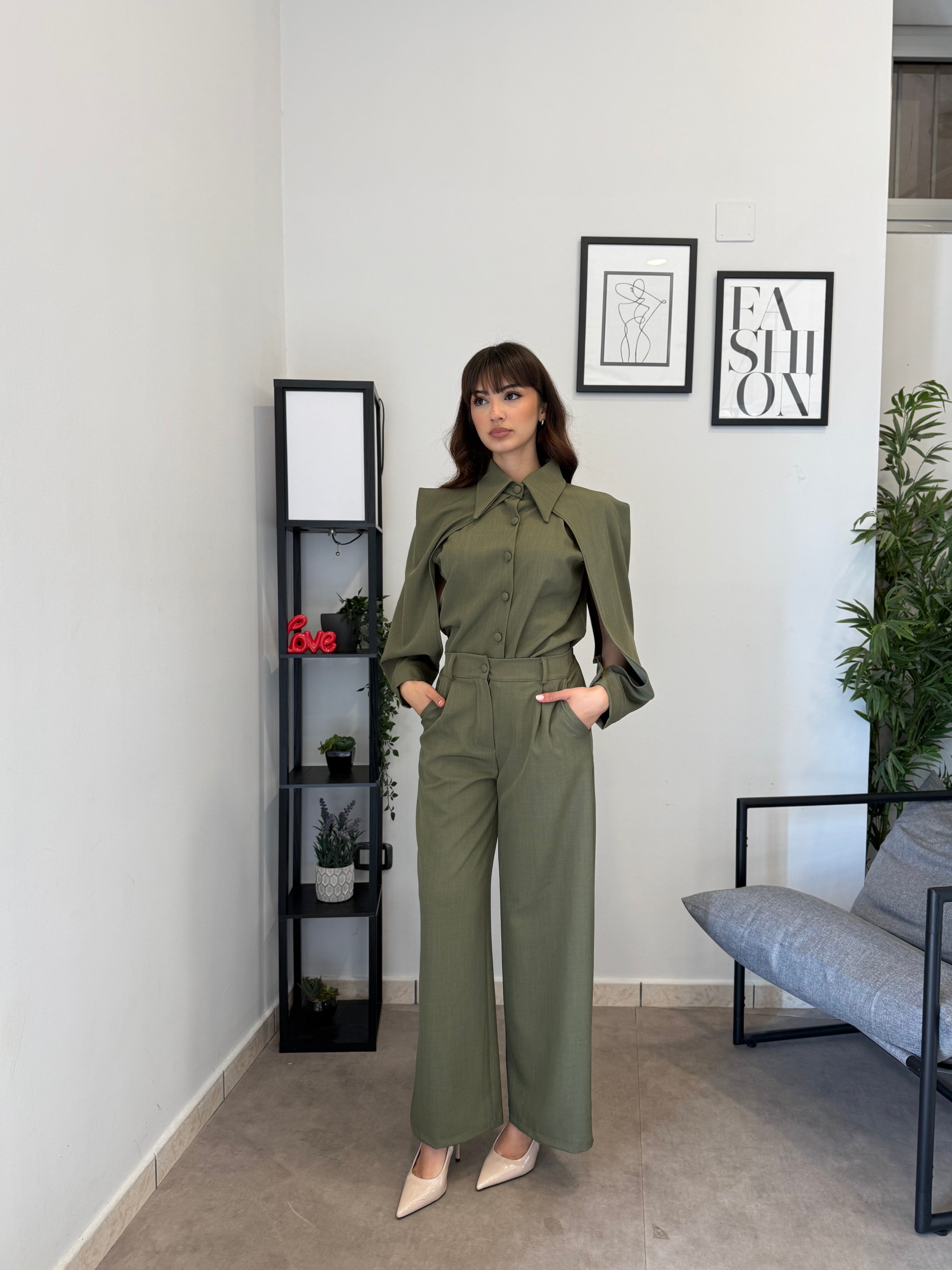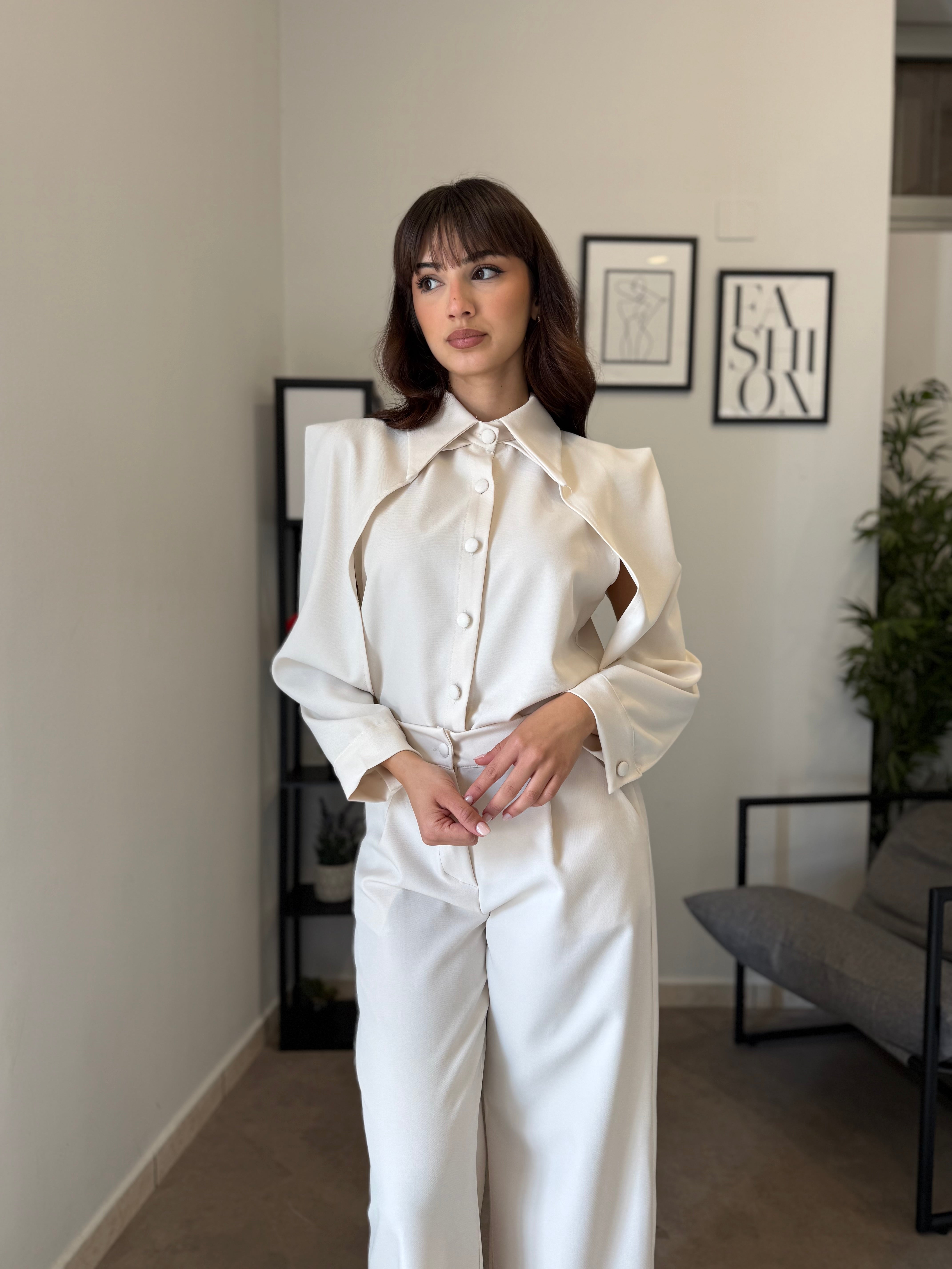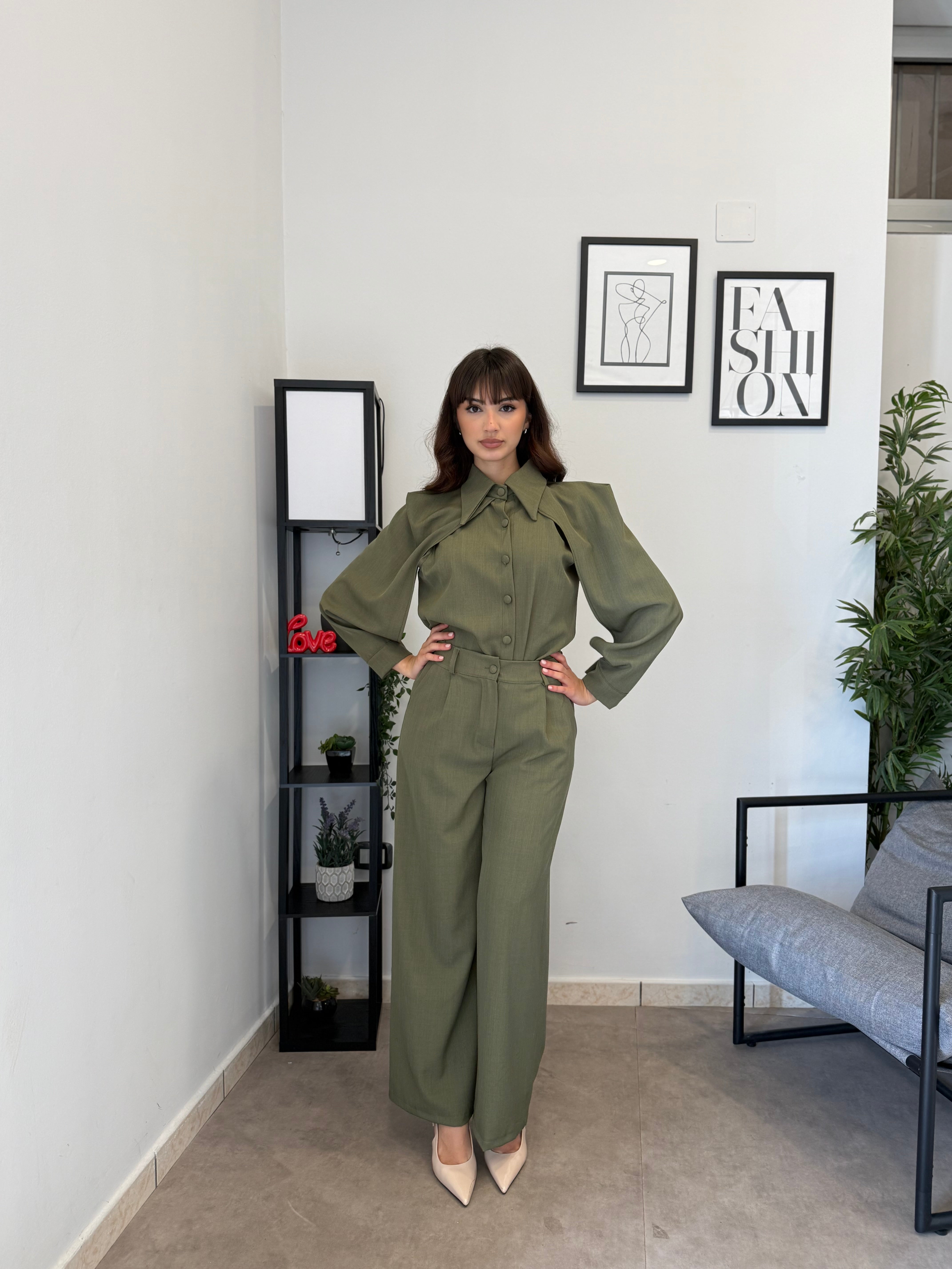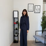 Completo in poliviscosa con pantalone palazzo e camicia. La camicia ha le maniche aperte ed il pantalone presenta la molla in vita. Veste bene dalla S alla L