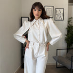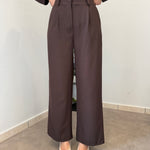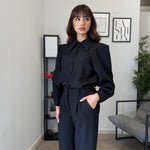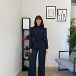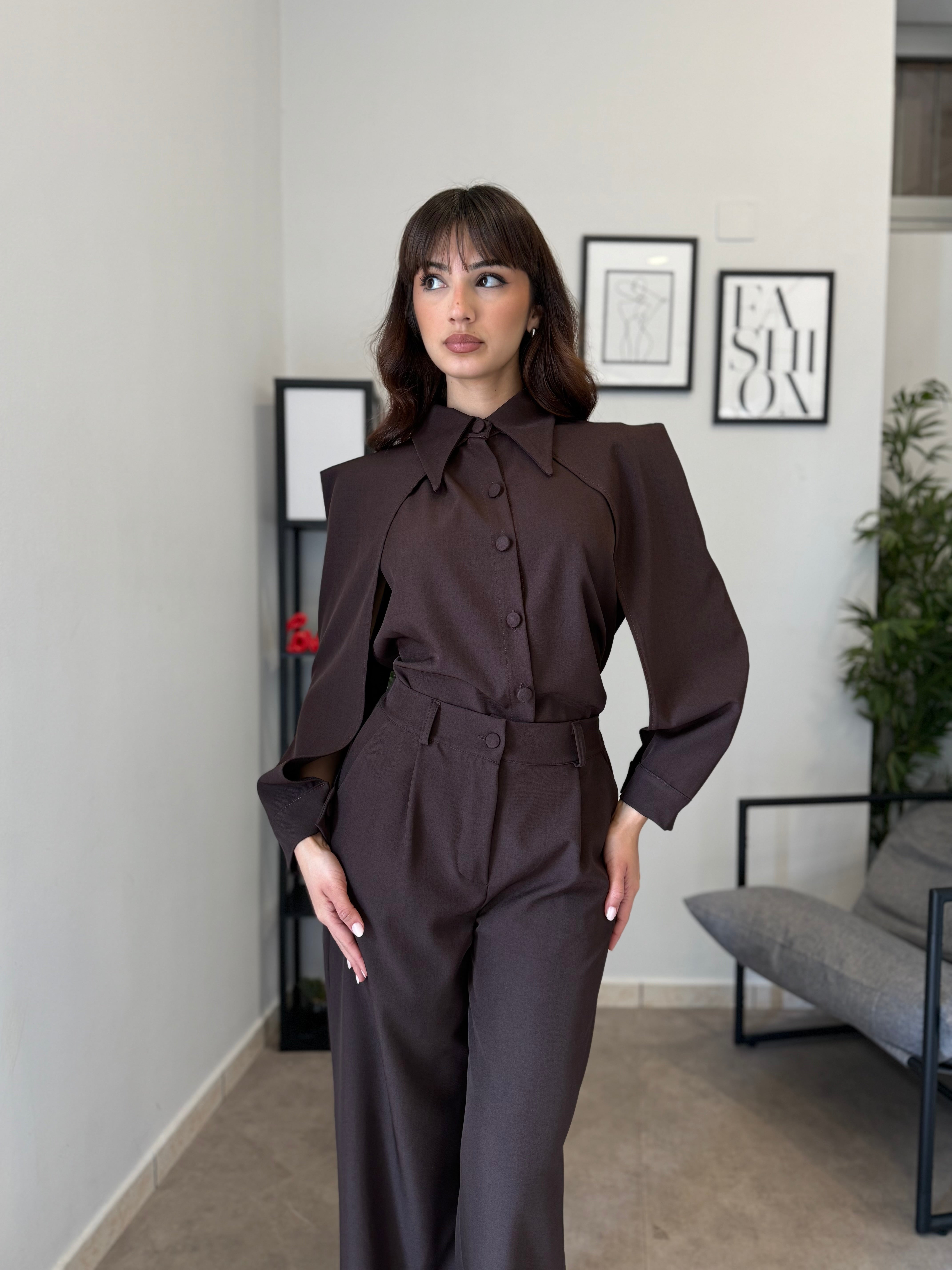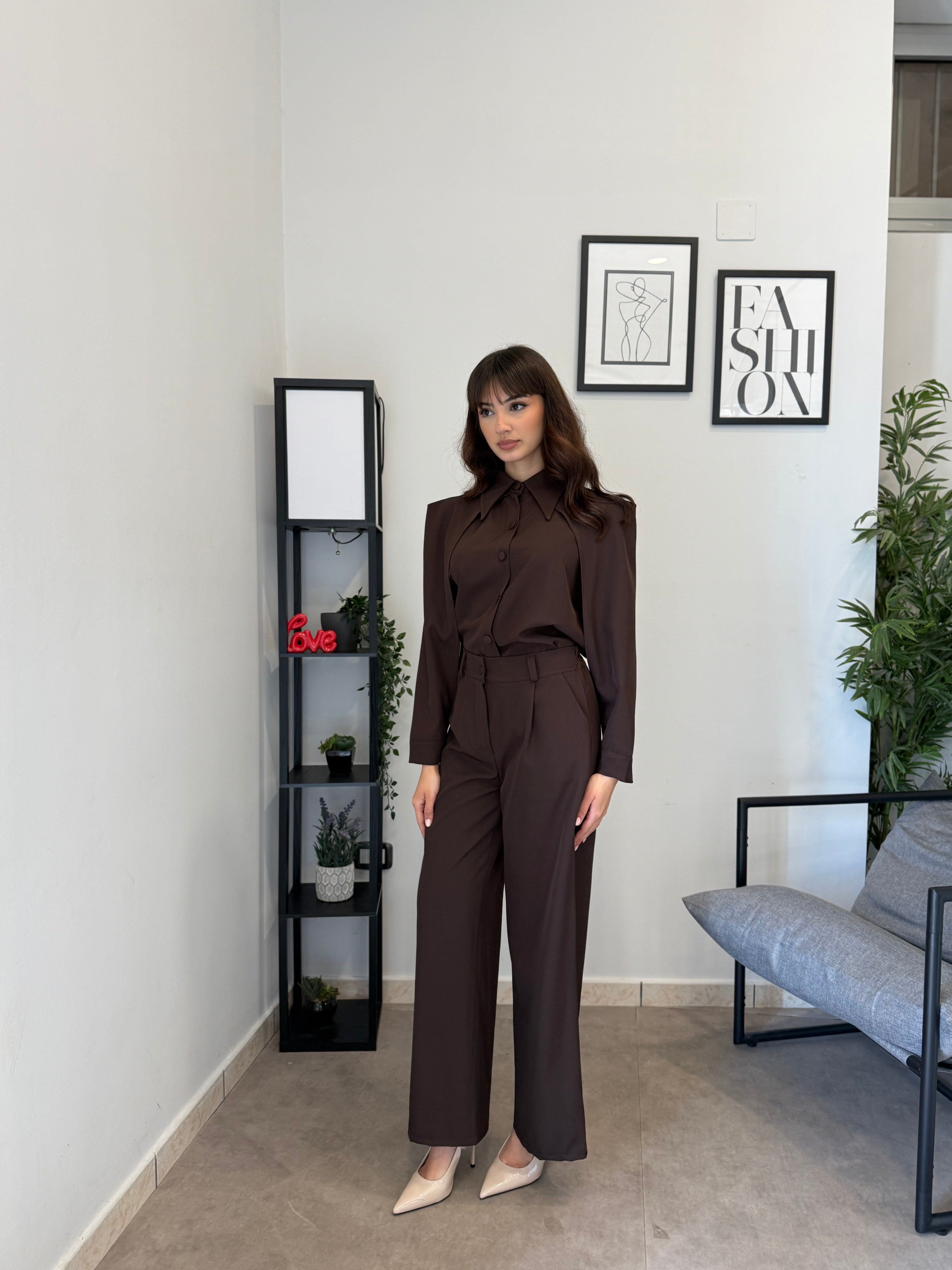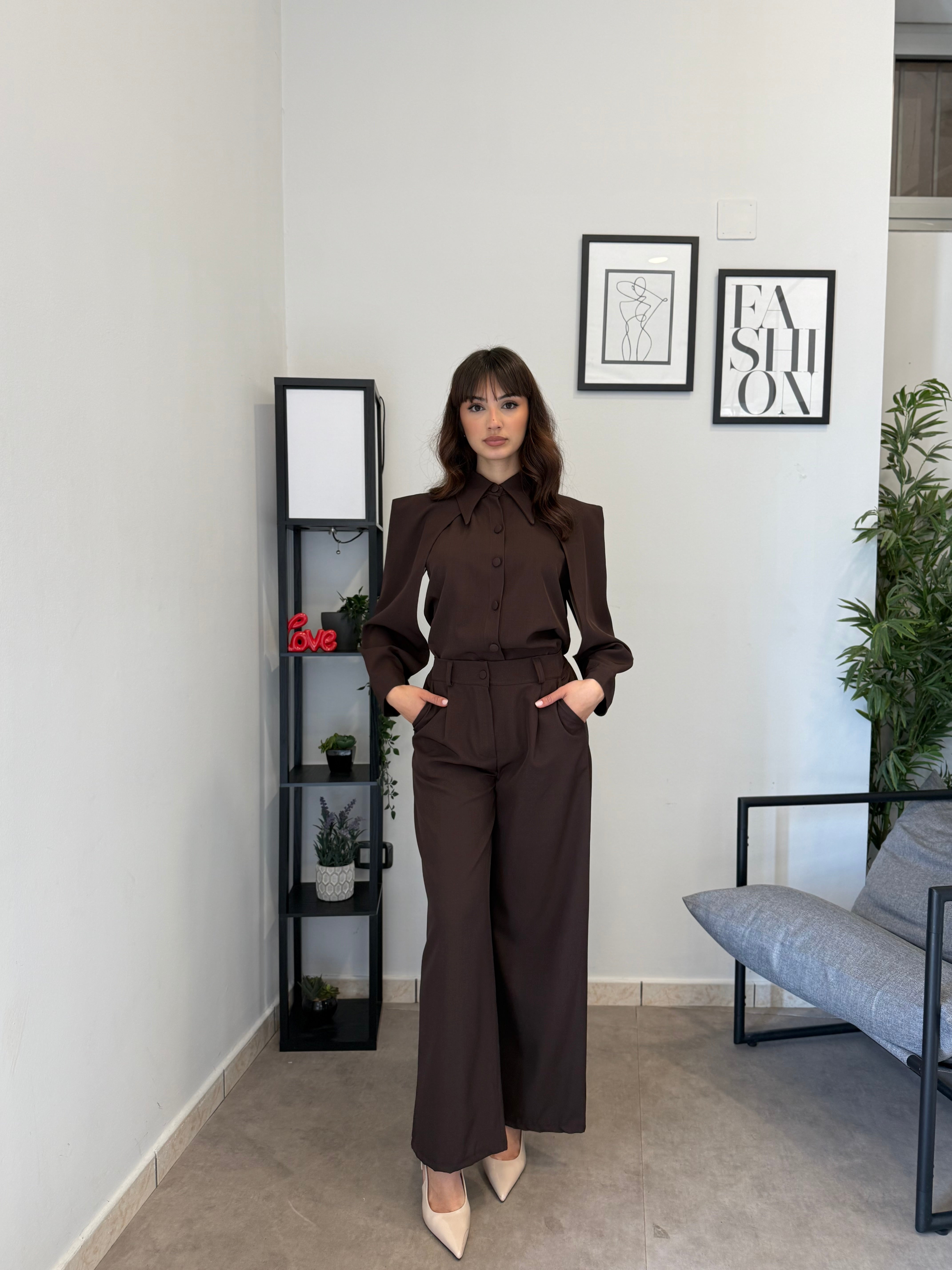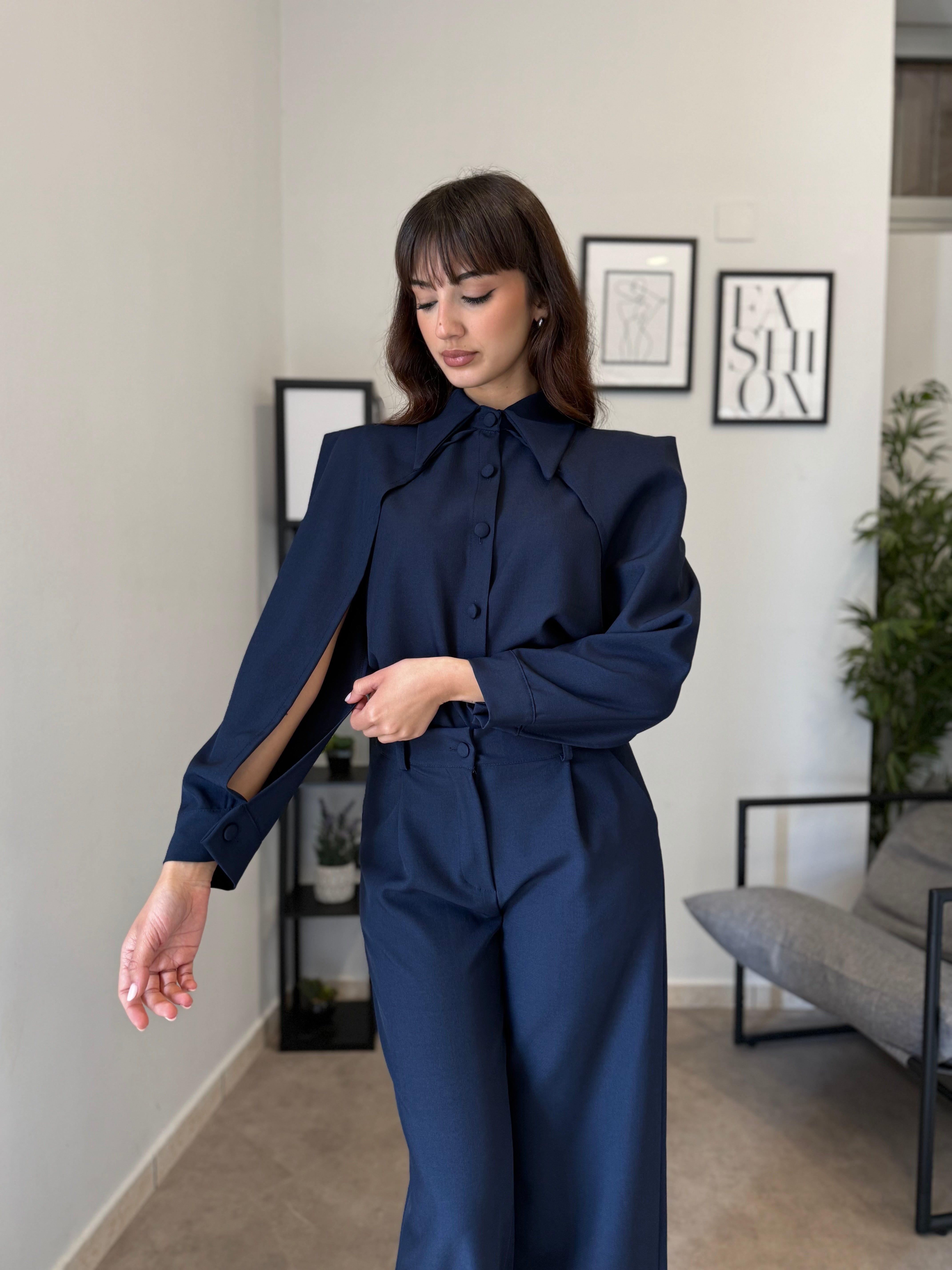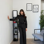 Completo in poliviscosa con pantalone palazzo e camicia. La camicia ha le maniche aperte ed il pantalone presenta la molla in vita. Veste bene dalla S alla L