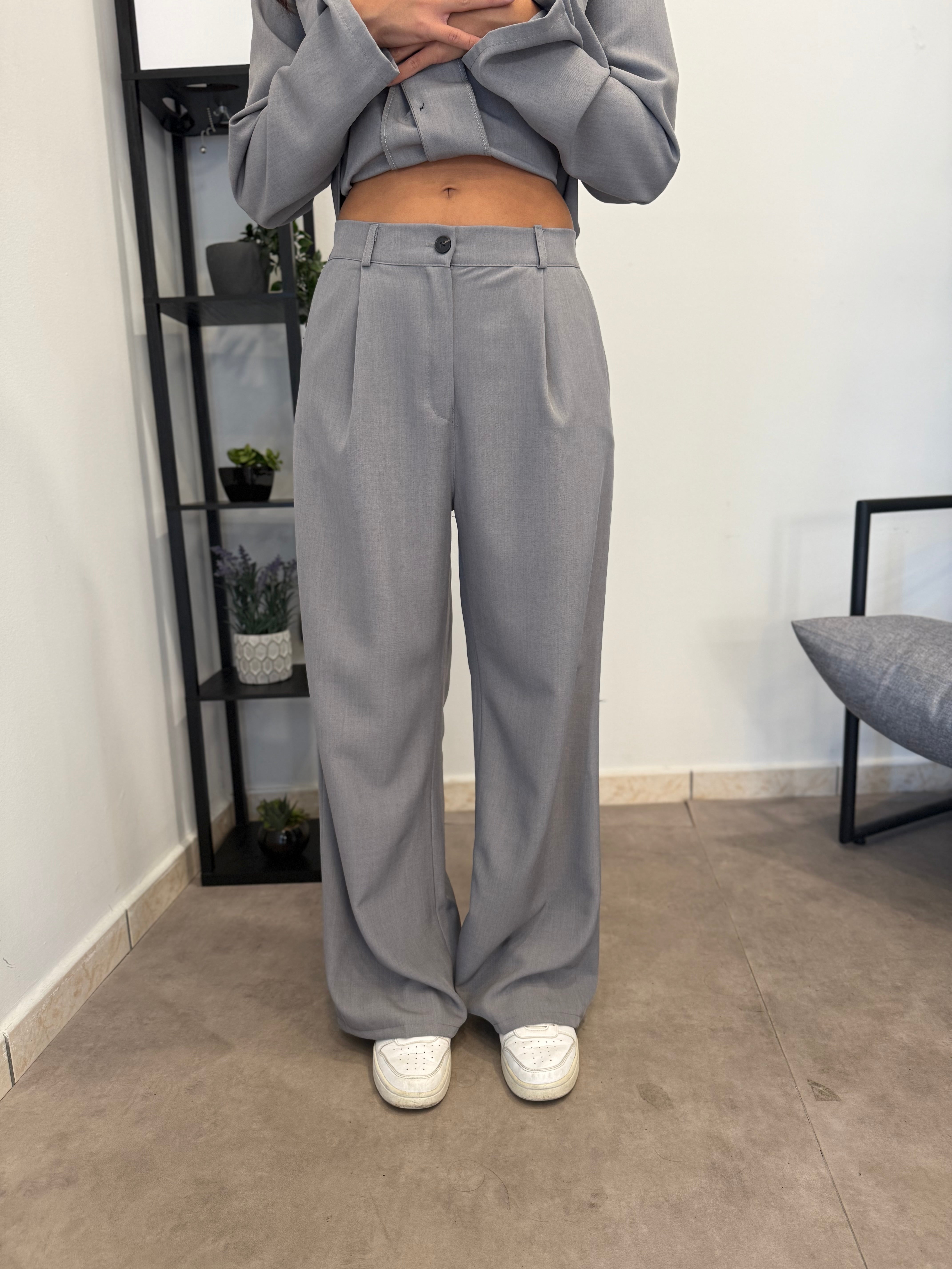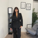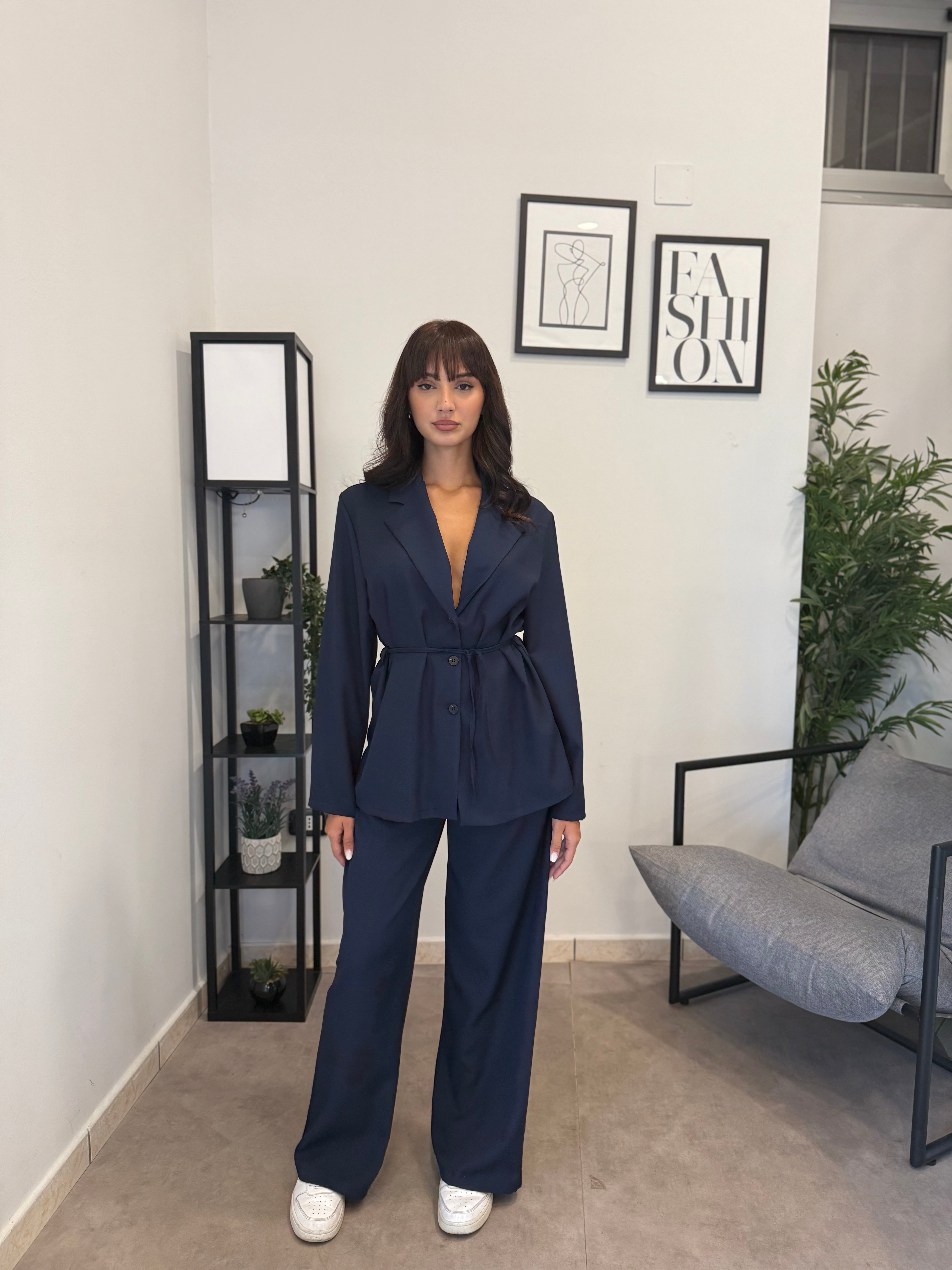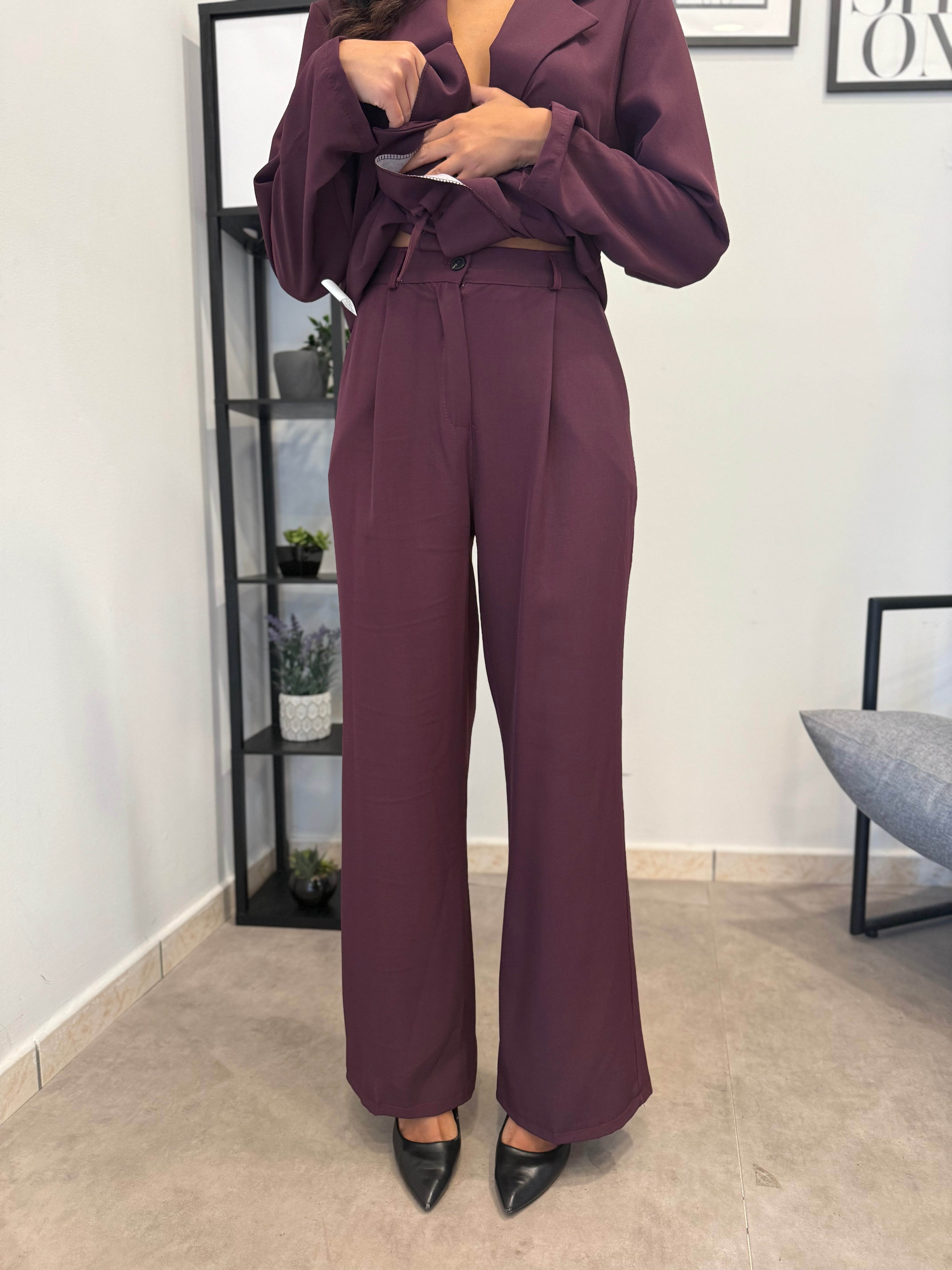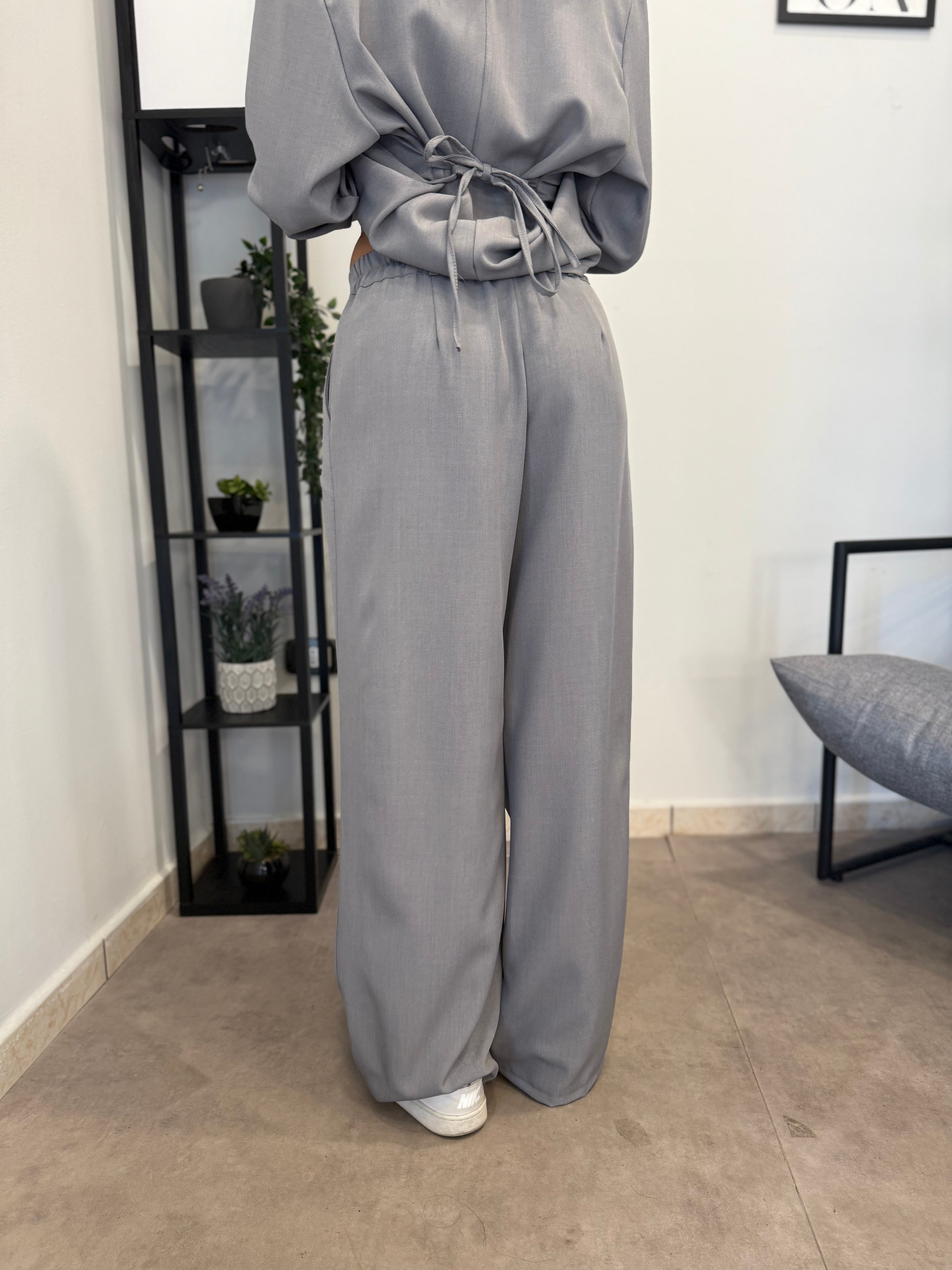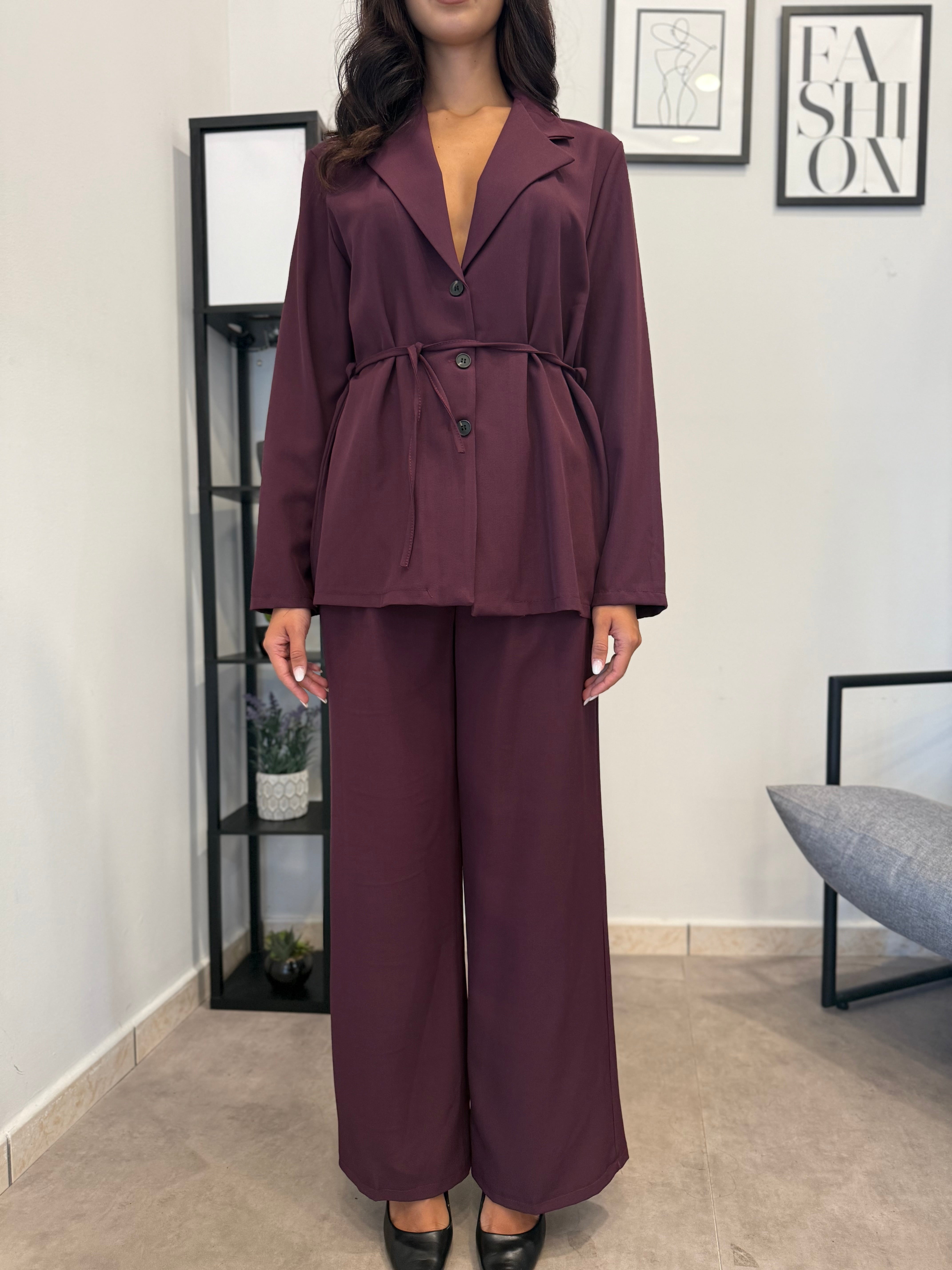Tailleur sfoderato con giacca lunga e pantalone palazzo, ha un cinturino in vita. Puoi indossarlo in diversi modi, sia con tacco che con scarpa sportiva. Veste bene dalla S alla L